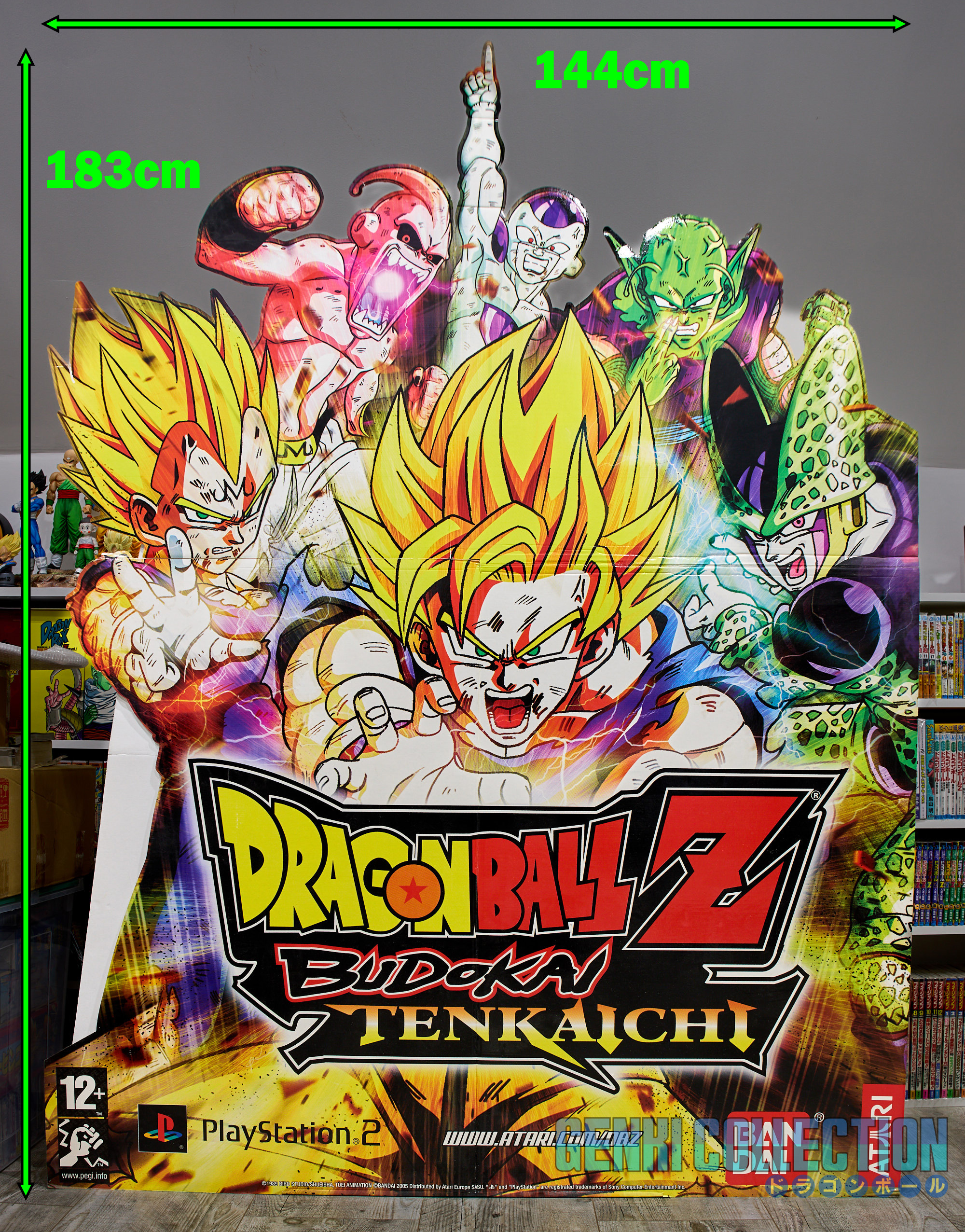 Splendid very large promotional standee or POP display (183cm high by 144cm wide) created for the promotion of the Dragon Ball Z Budokai Tenkaichi game. Generally in good condition, note mainly a small crease on Frieza's arm. A wooden board mounting system has been crafted on the back to hang it against a wall.