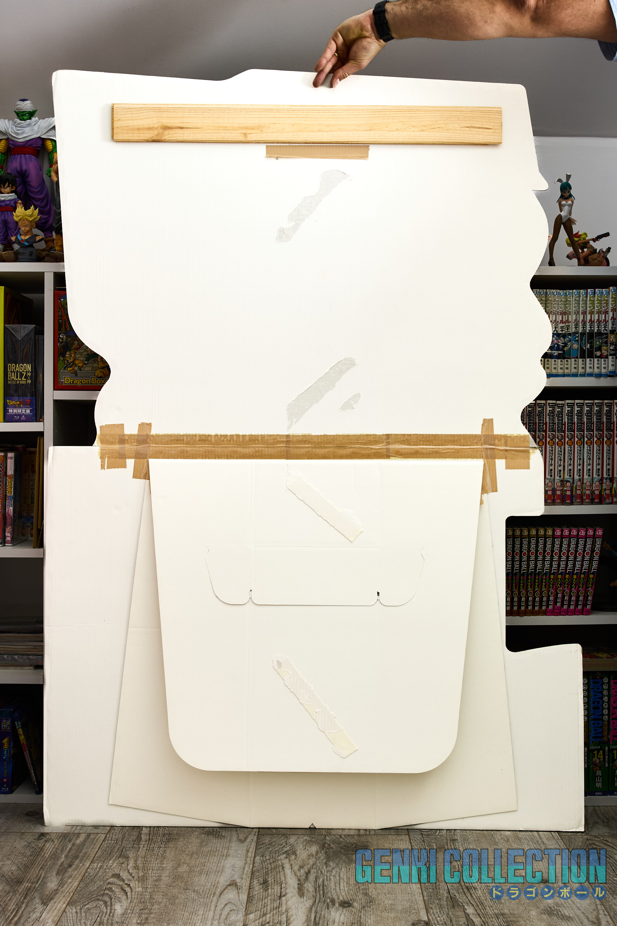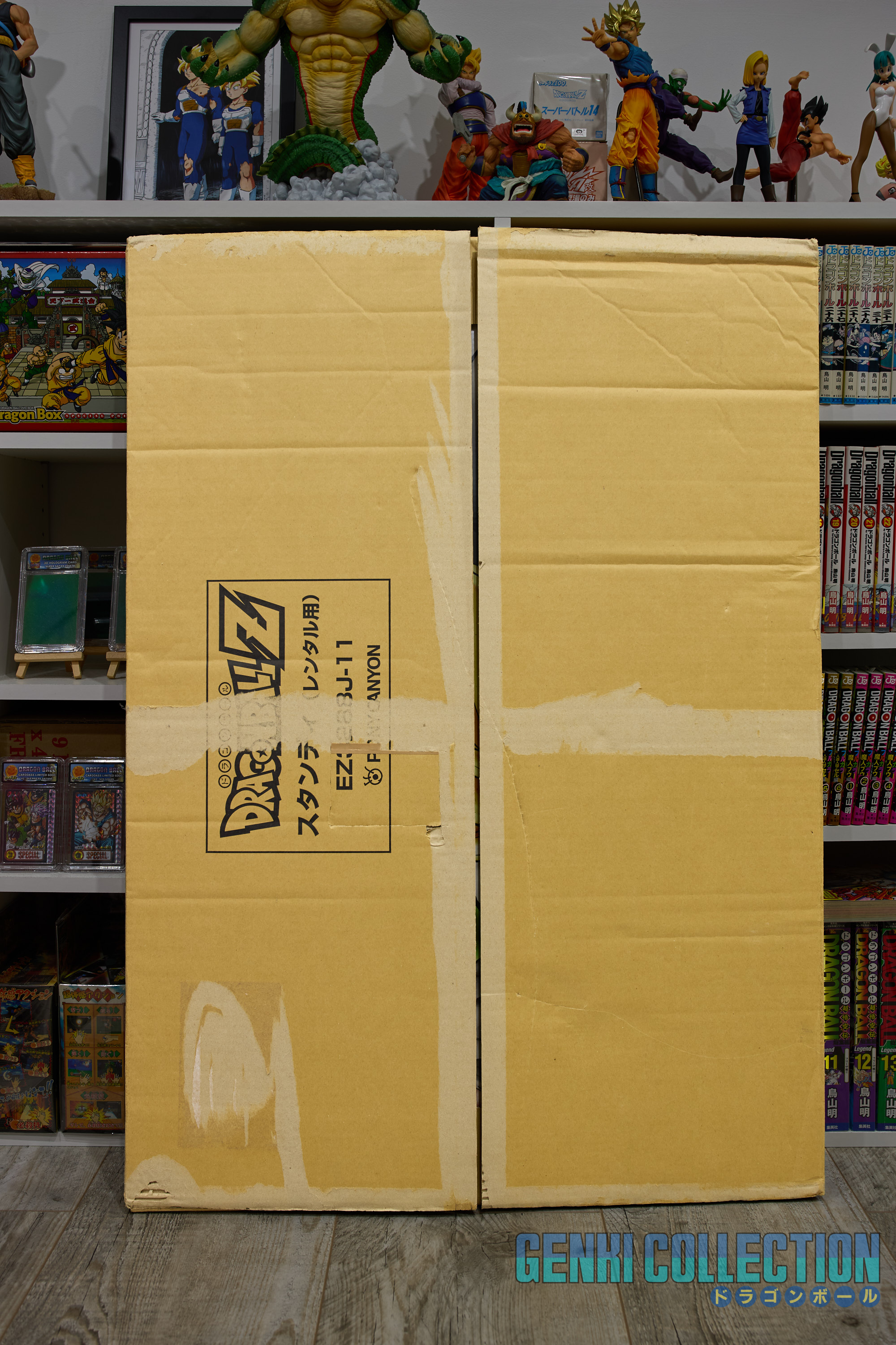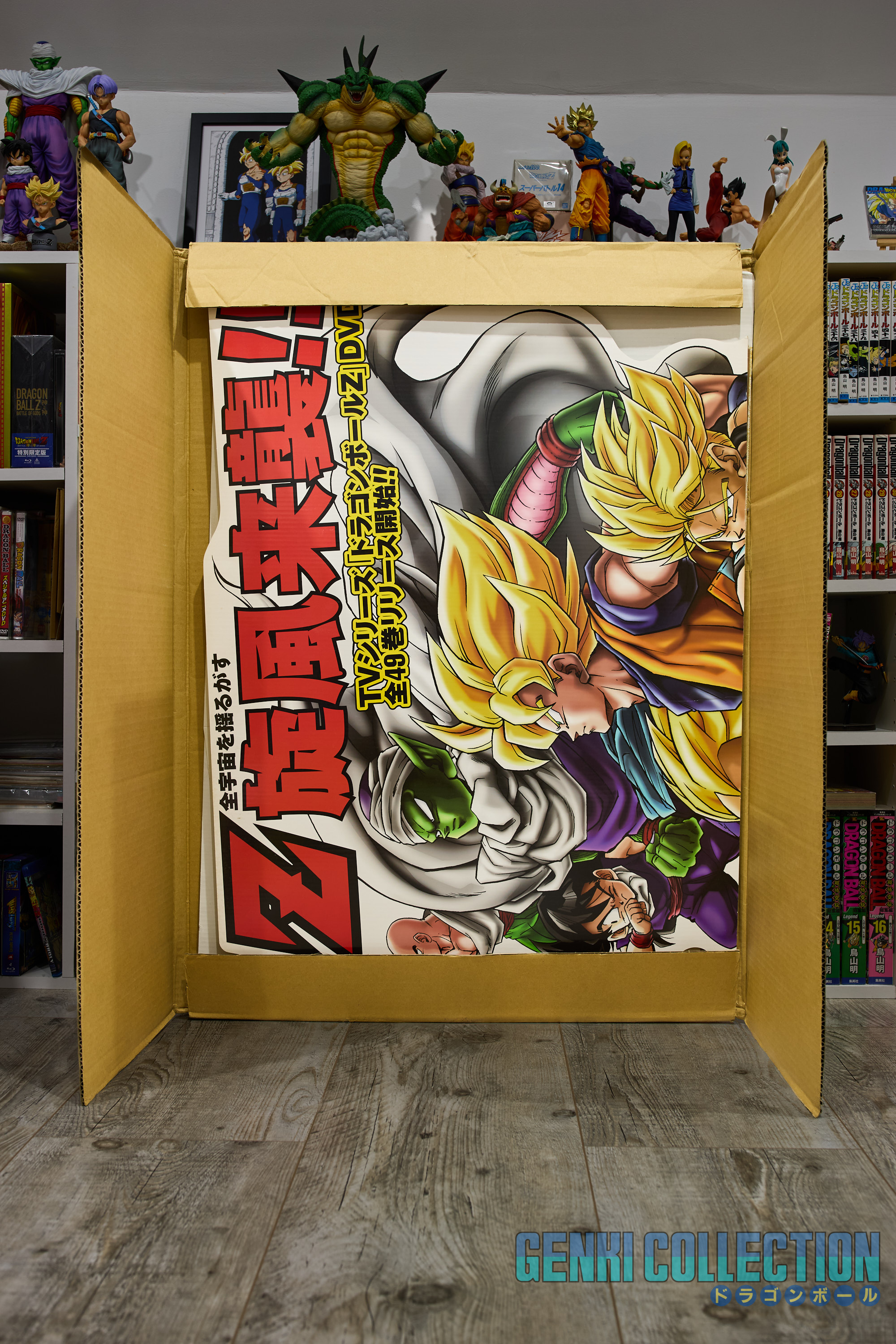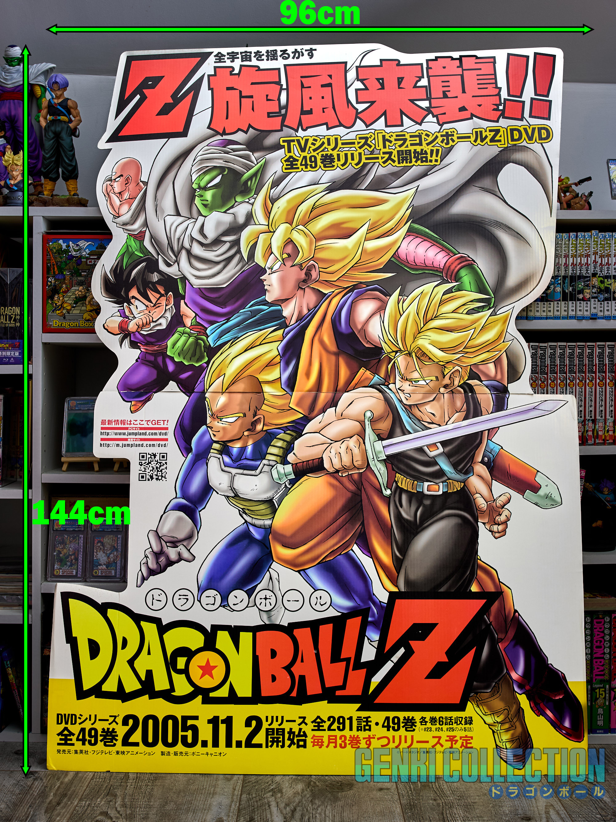Splendid Japanese promotional standee or POP display (144cm high by 96cm wide) created by Pony Canyon for the release of individual Dragon Ball Z DVDs in Japan. Very good condition, provided in its original cardboard box. A wooden board mounting system has been crafted on the back to hang it against a wall.