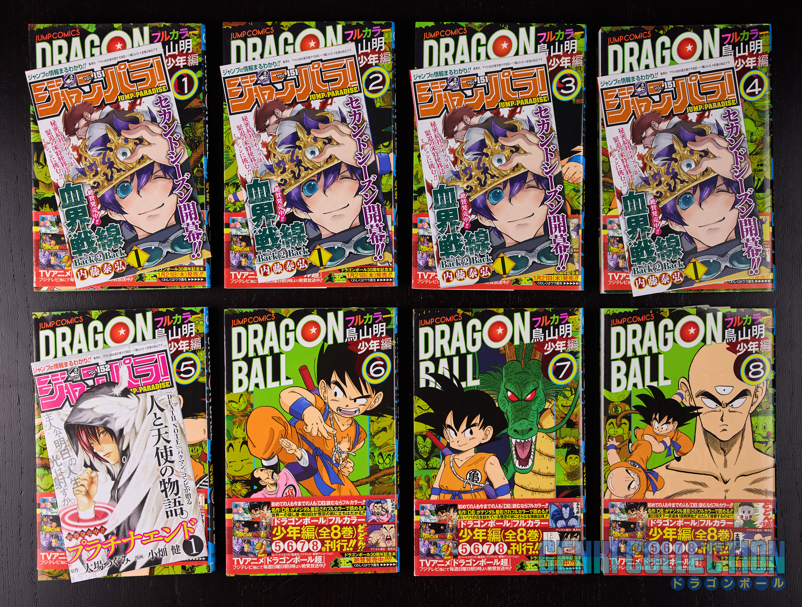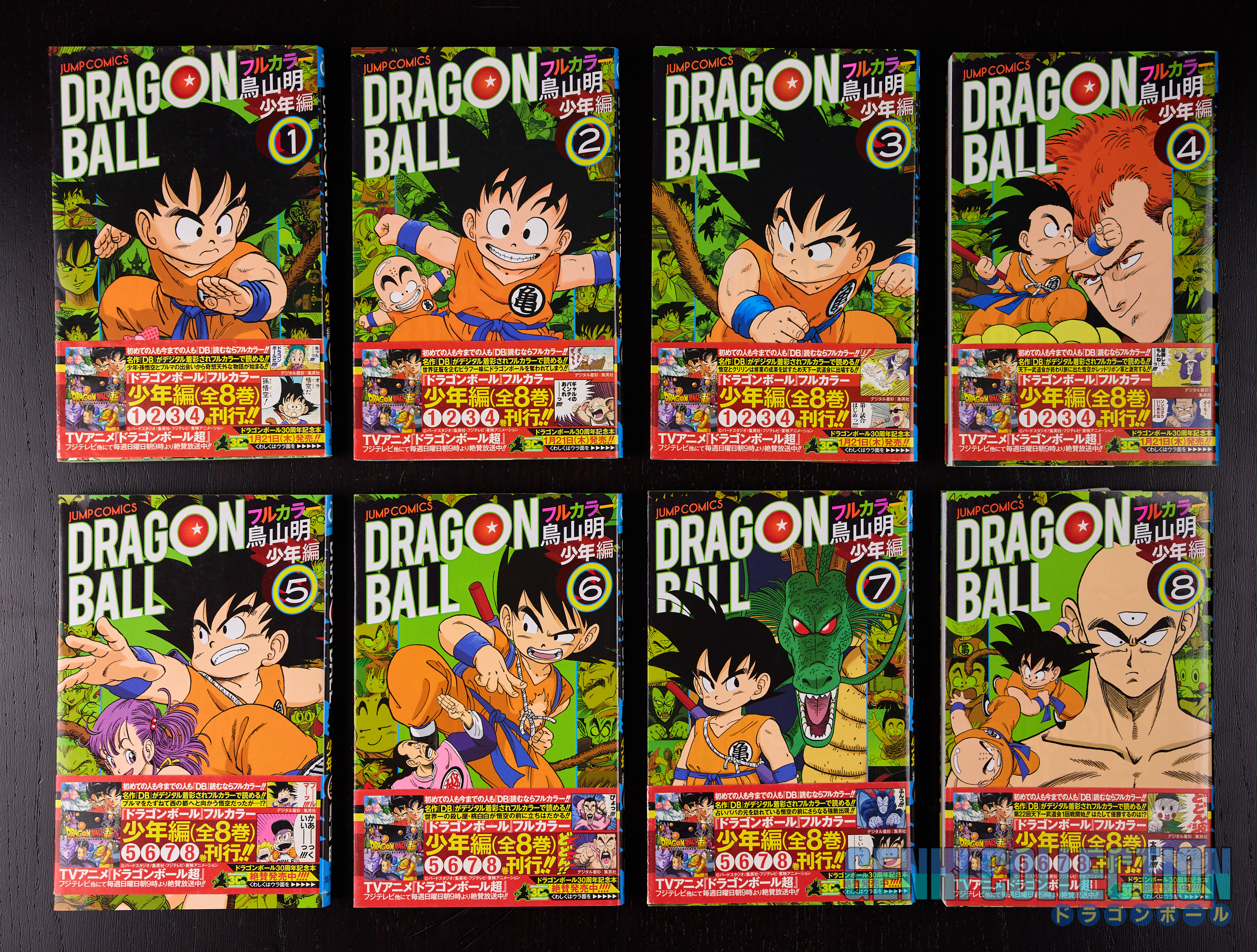 Complete set of the 32 Japanese Dragon Ball volumes in the Full Color version, 1st edition (except for volumes 4 and 5 of the Frieza arc which are second editions). All volumes have their obi and some also include an advertising flyer. The series is in very good overall condition.The Full Color edition takes the original edition but is entirely colorized. A beautiful way to rediscover the series. The numbering is not continuous; it is divided by Arcs (Goku's Childhood 8 vols, Piccolo Daimao 4 vols, Saiyans 3 vols, Frieza 5 vols, Androids 6 vols, Majin Buu 6 vols).