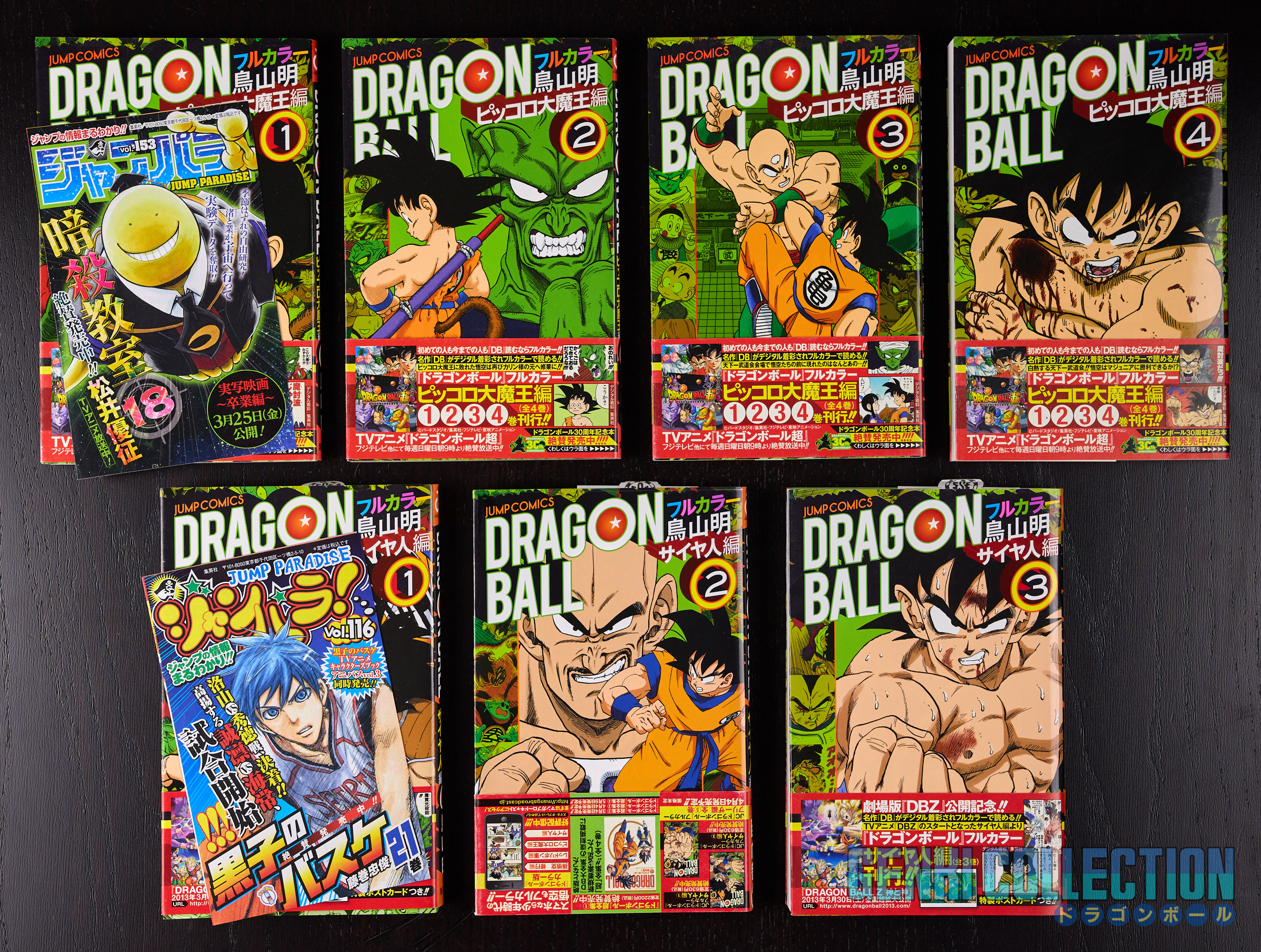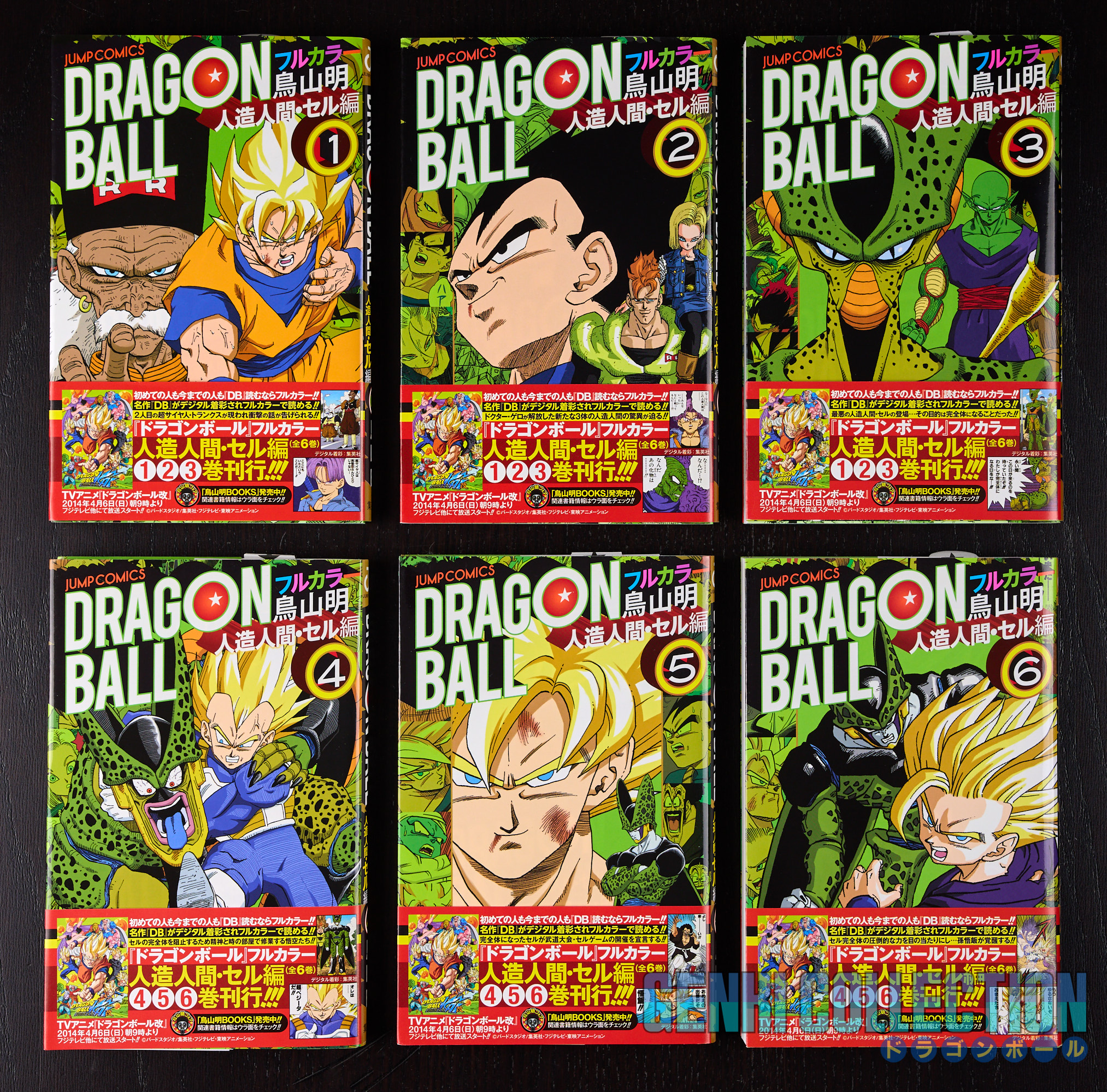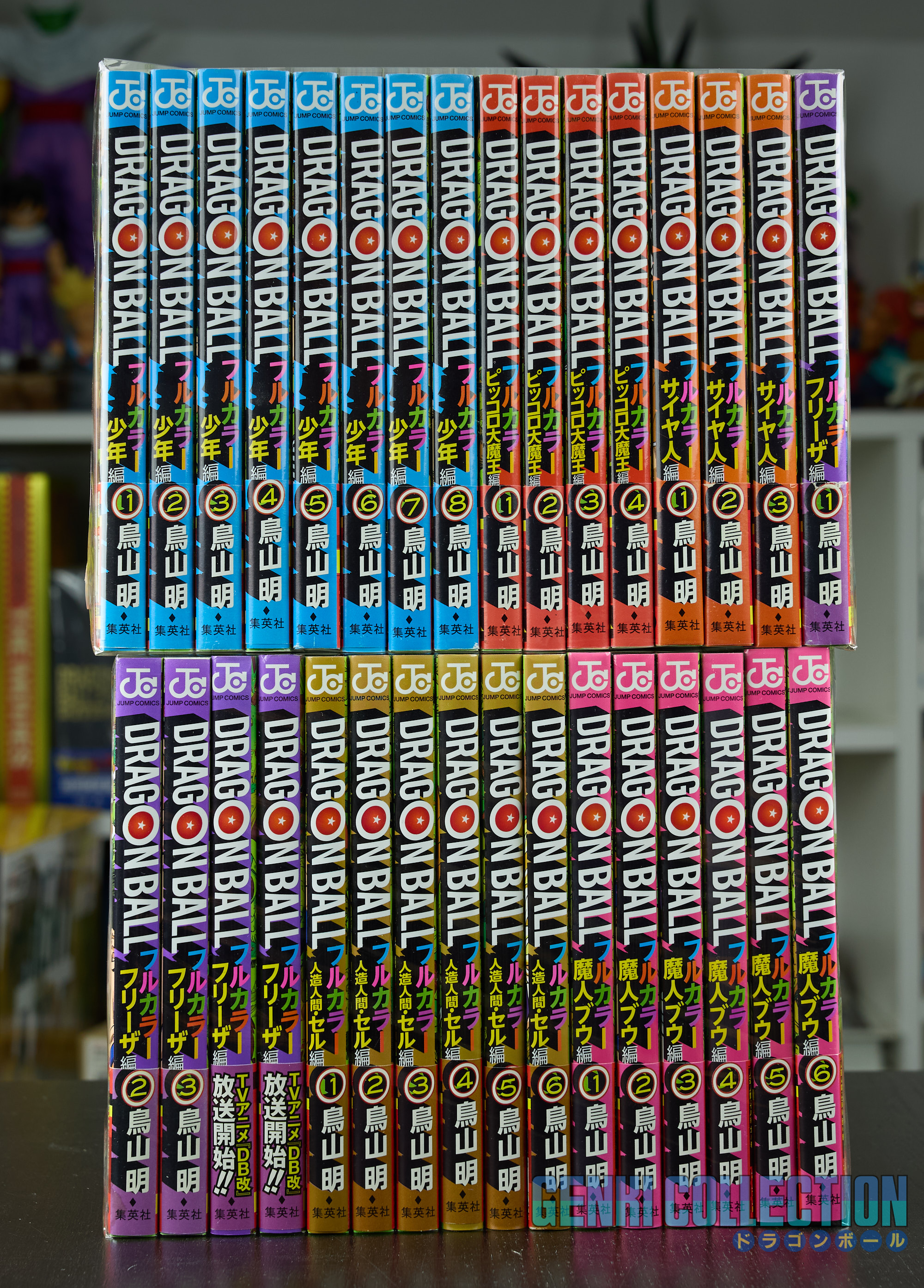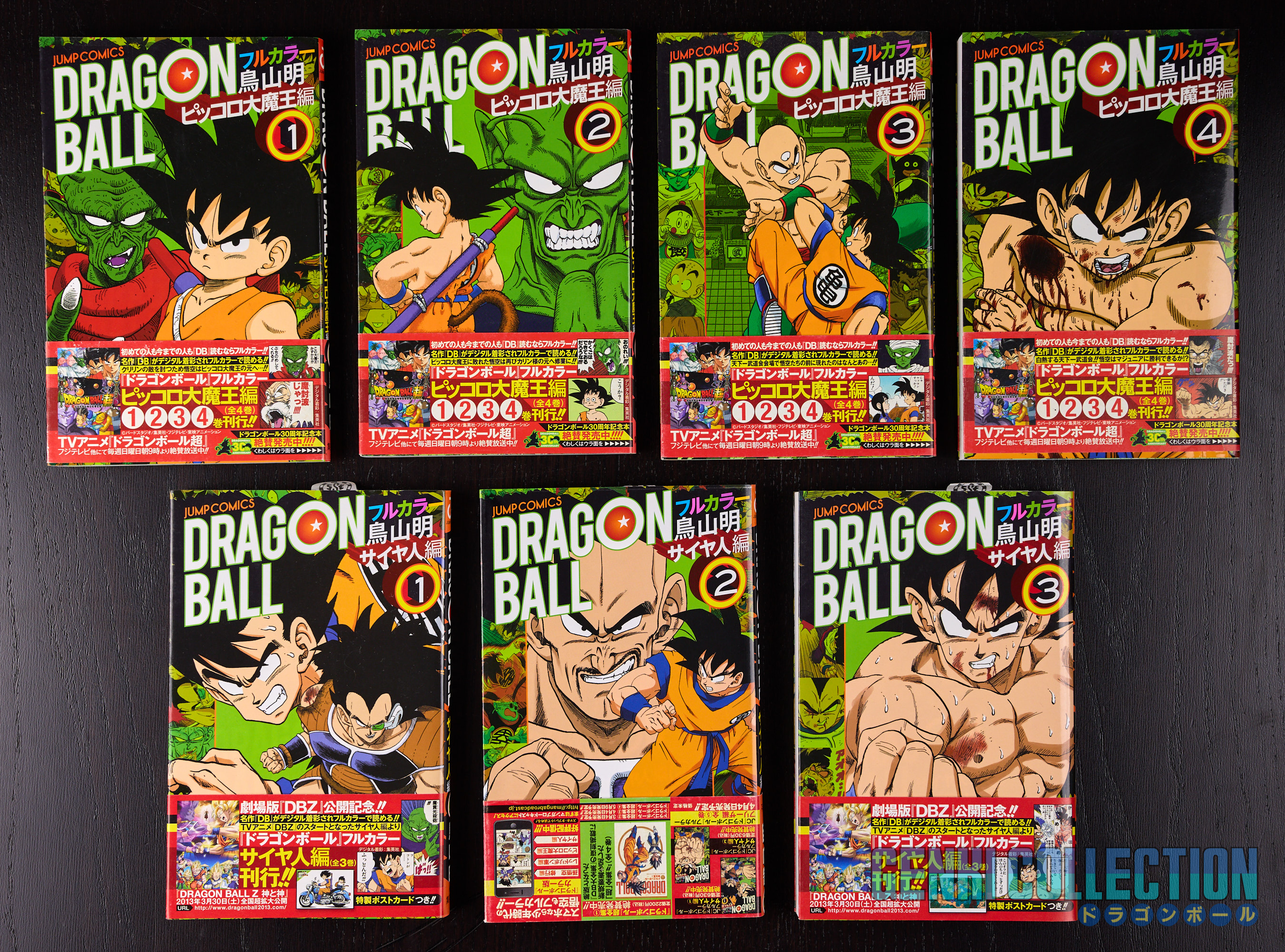 Intégrale des 32 tomes japonais Dragon Ball en version Full Color 1ère édition excepté les volumes 4 et 5 de la saga Freeza en seconde édition). Tous les tomes possèdent leur obi et pour certains un flyer publicitaire est également présent. Série en très bon état général. L'édition Full Color reprend l'édition originale, mais entièrement colorisée. Une belle manière de redécouvrir la série. La numérotation n'est pas continue, elle est proposée par Arcs (Enfance de Gokû 8 tomes, Piccolo Daimaô 4 tomes, Saiyans 3 tomes, Freeza 5 tomes, Cyborgs 6 tomes, Majin Boo 6 tomes.)