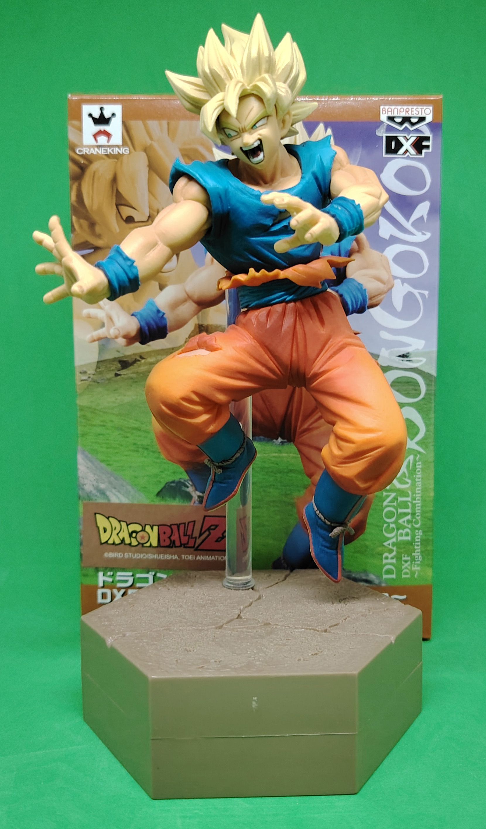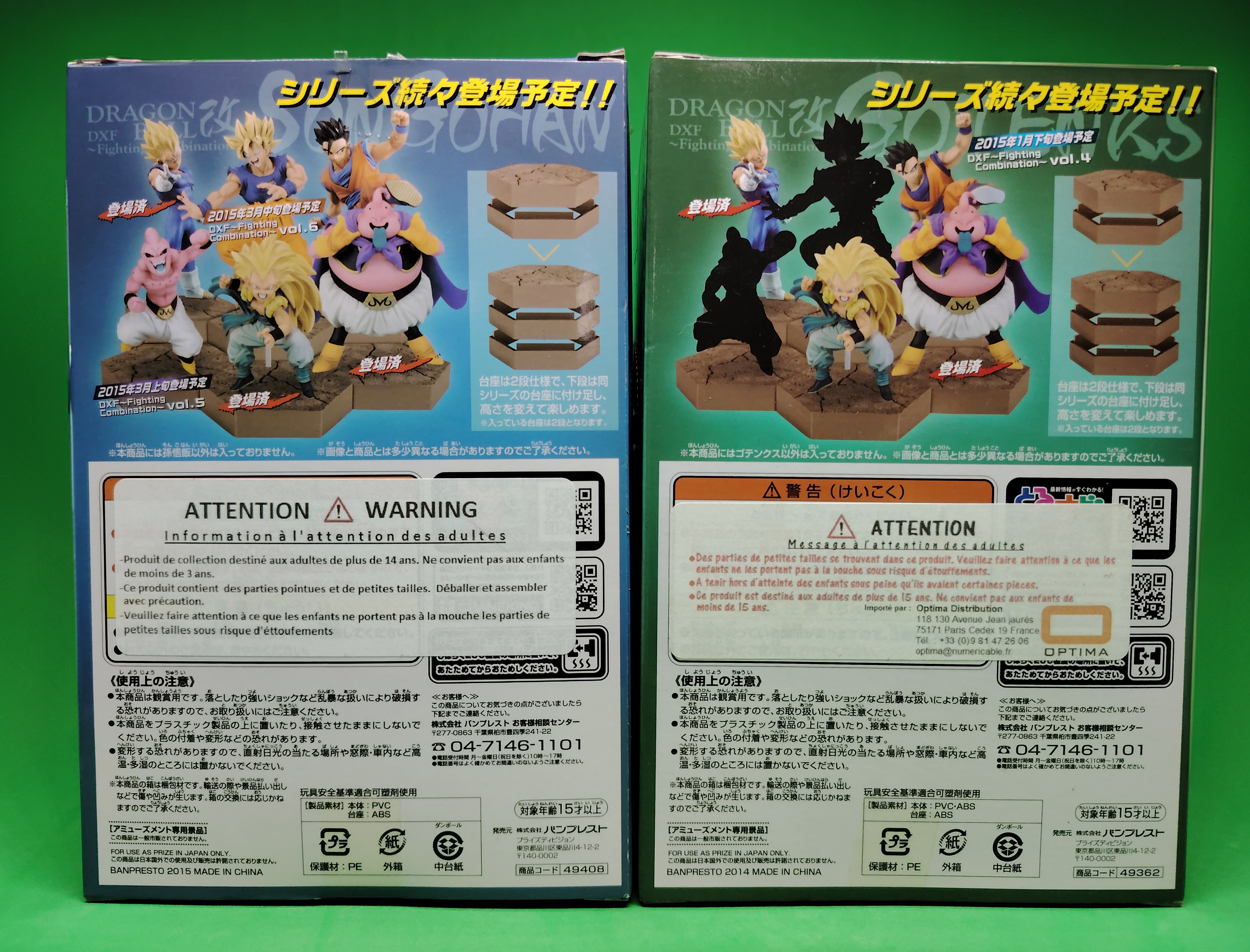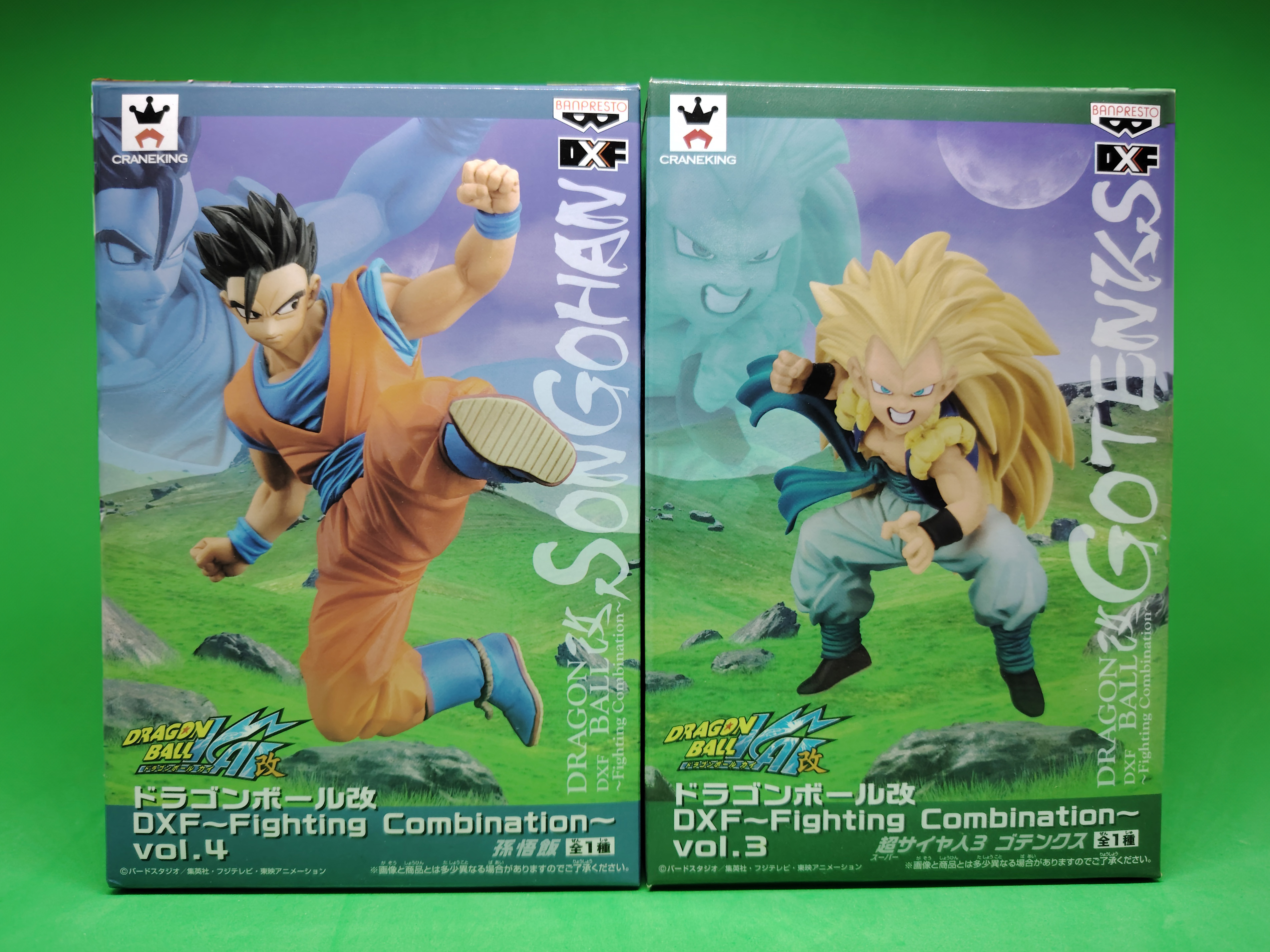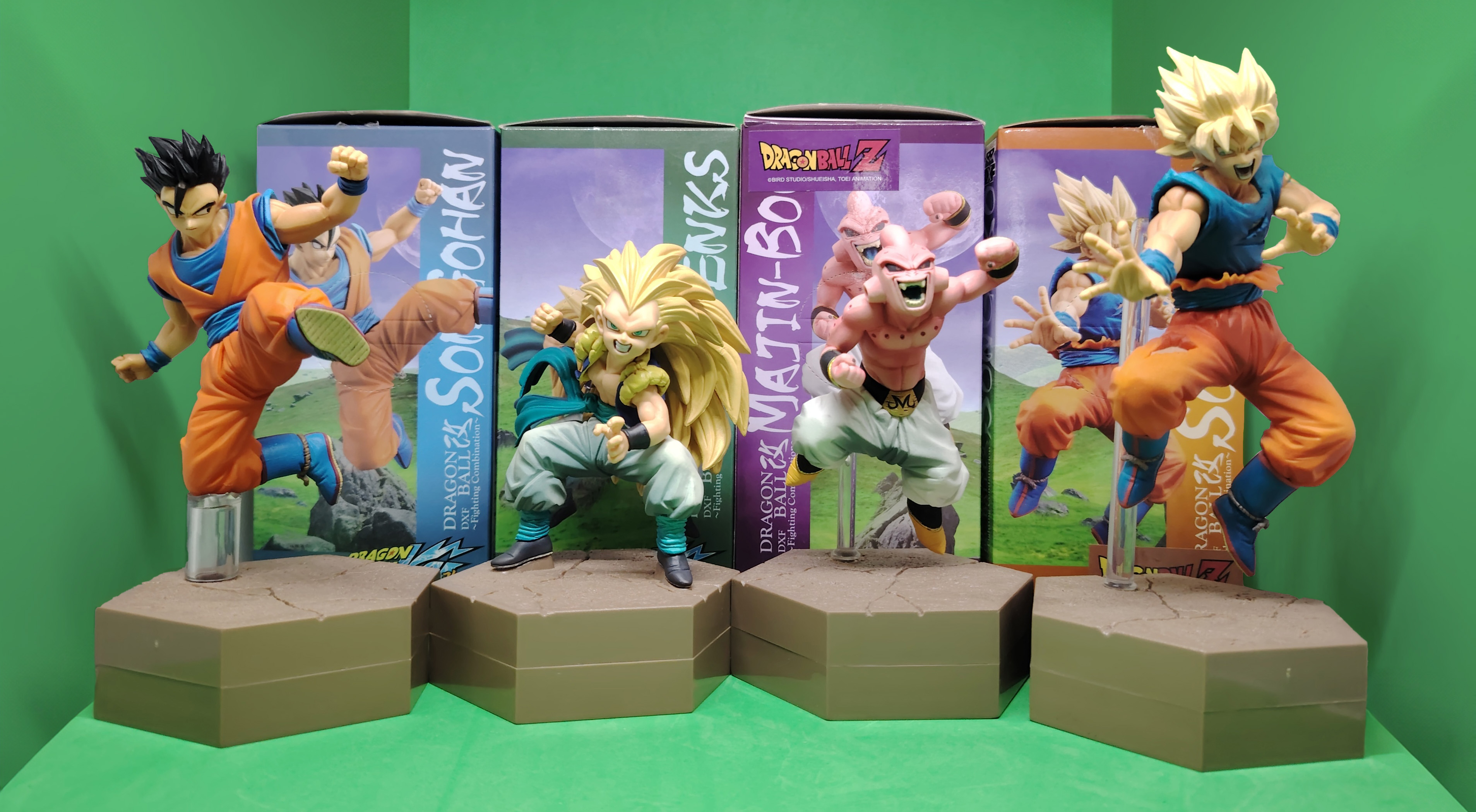 lot de 4 figurines avec boites DRAGON BALL Z DXF FIGHTING COBINATION volumes 3, 4, 5 et 6, sorties en 2014 représentant les personnages de GOKU SUPER SAIYAN, KID BUU, GOTENKS SUPER SAIYAN 3 et GOHAN ULTIME. À noter qu'il manque la tige transparente pour la figurine Gotenks Super Saiyan 3 mais ne présente pas de souci pour étre exposé. Il manque egalement le sur-carton interieur et embalage interieur.