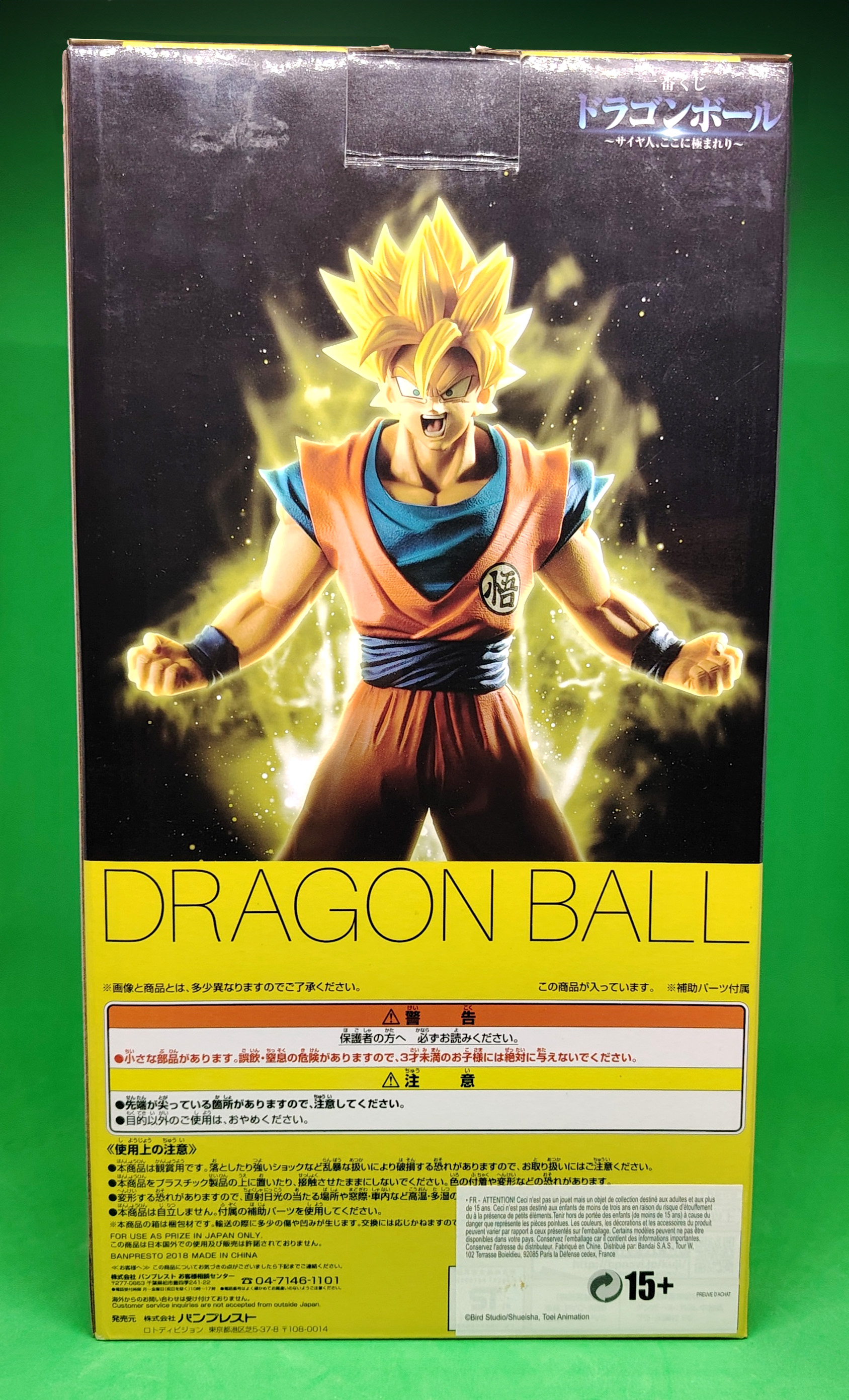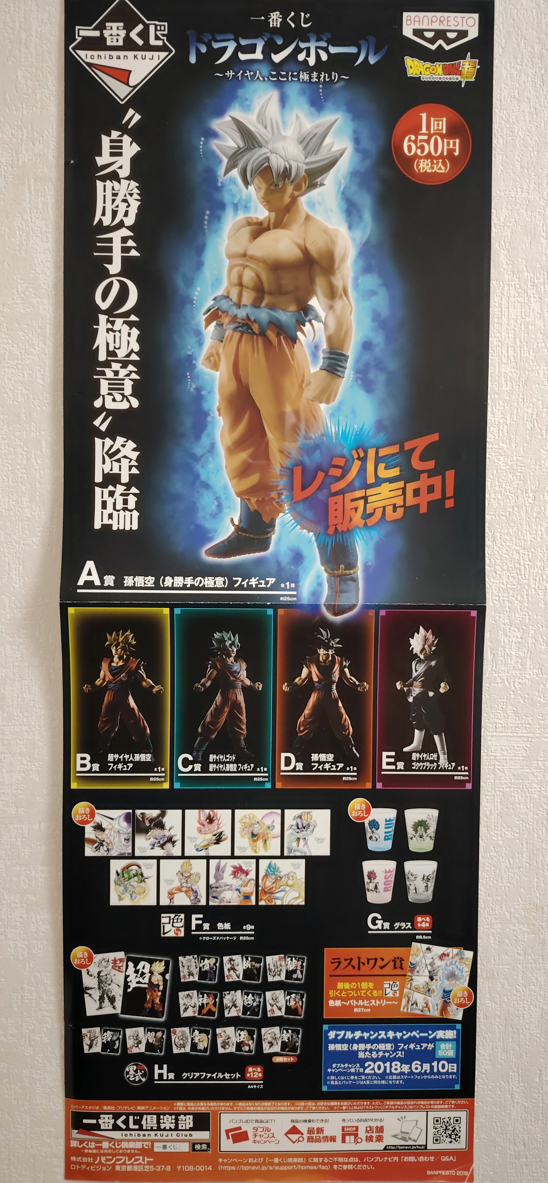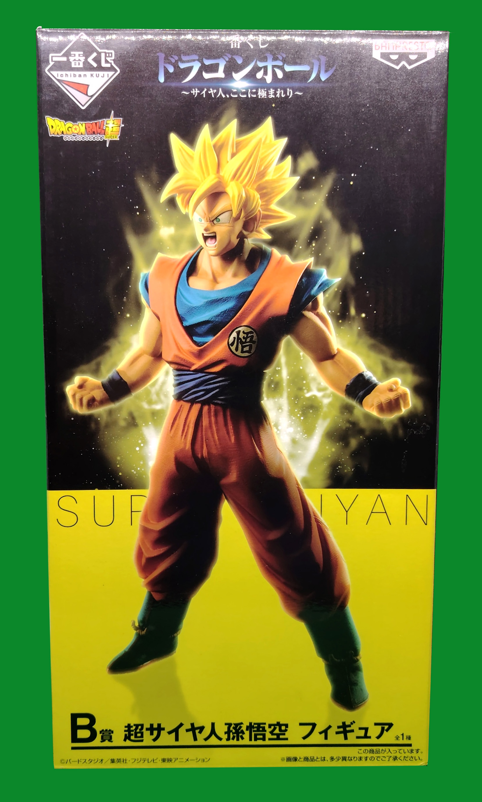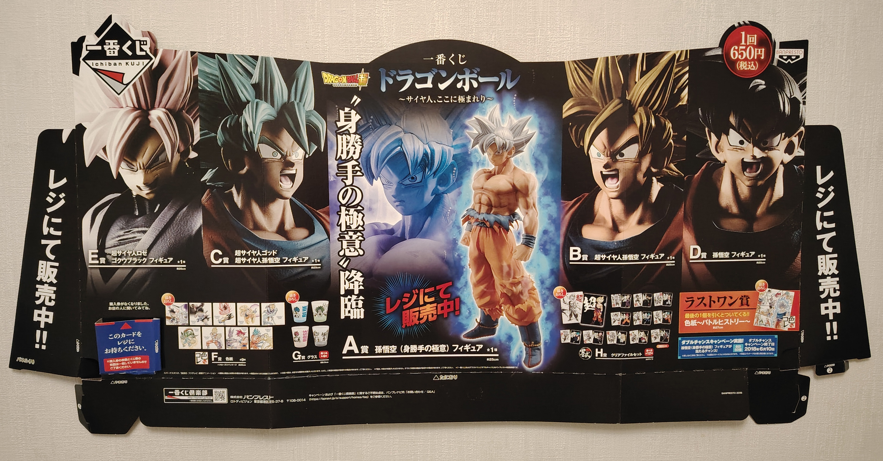 Gros lot ICHIBAN KUJI "La Limite des Saiyans" de 2018 comprenant 1 figurine en boite de Goku Super Saiyan (Lot B), 4 shikishis (Goku Oozaru, Trunks vs Freezer, Vegeta vs Cell, Goku vs Vegeta) (Lot F), 1 clear file de Gotenks Super Saiyan 3 (Lot H), 1 grand shikishi (bonus dernier ticket de la loterie), 1 affiche de la loterie et 1 présentoir de la loterie.