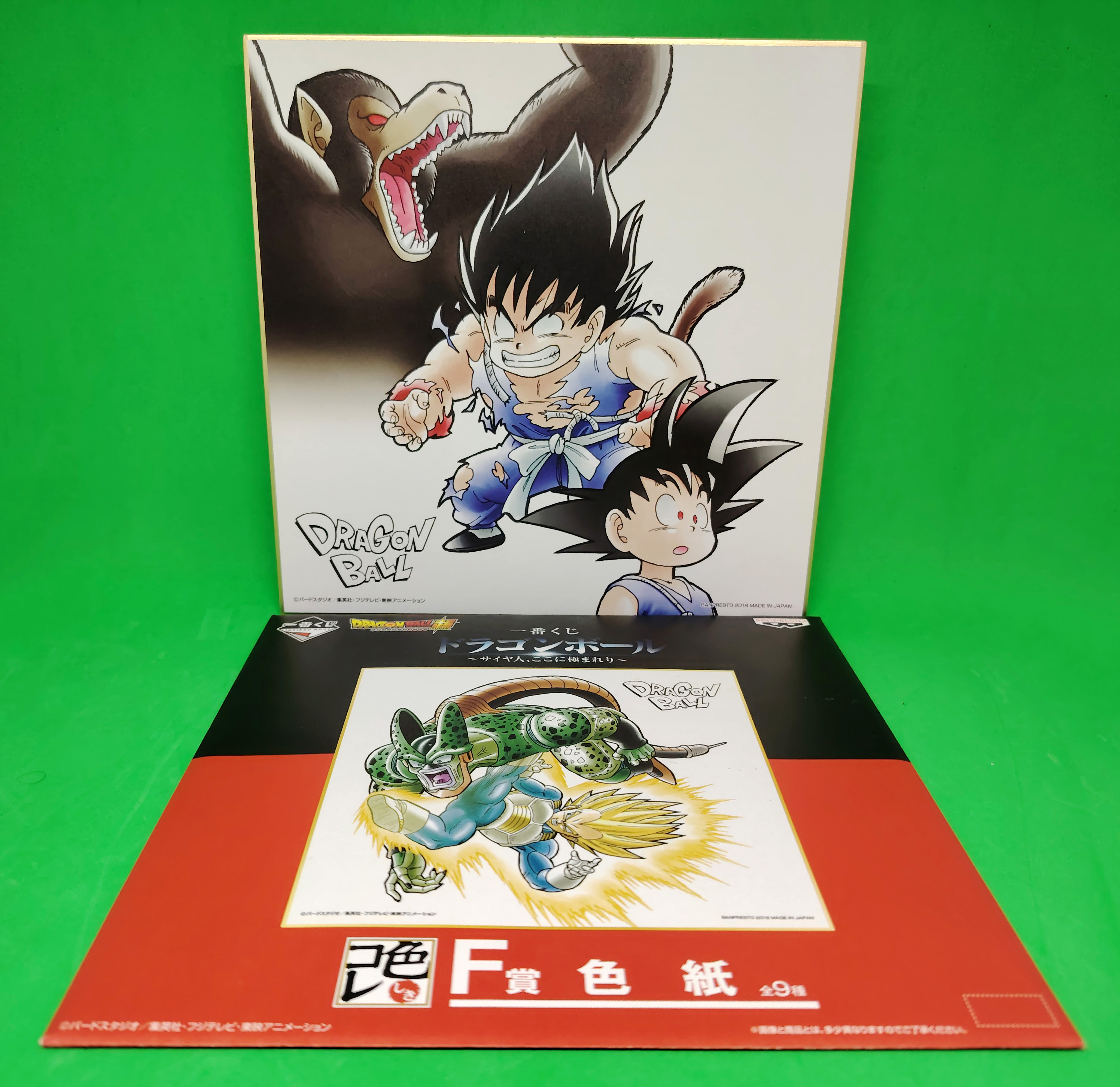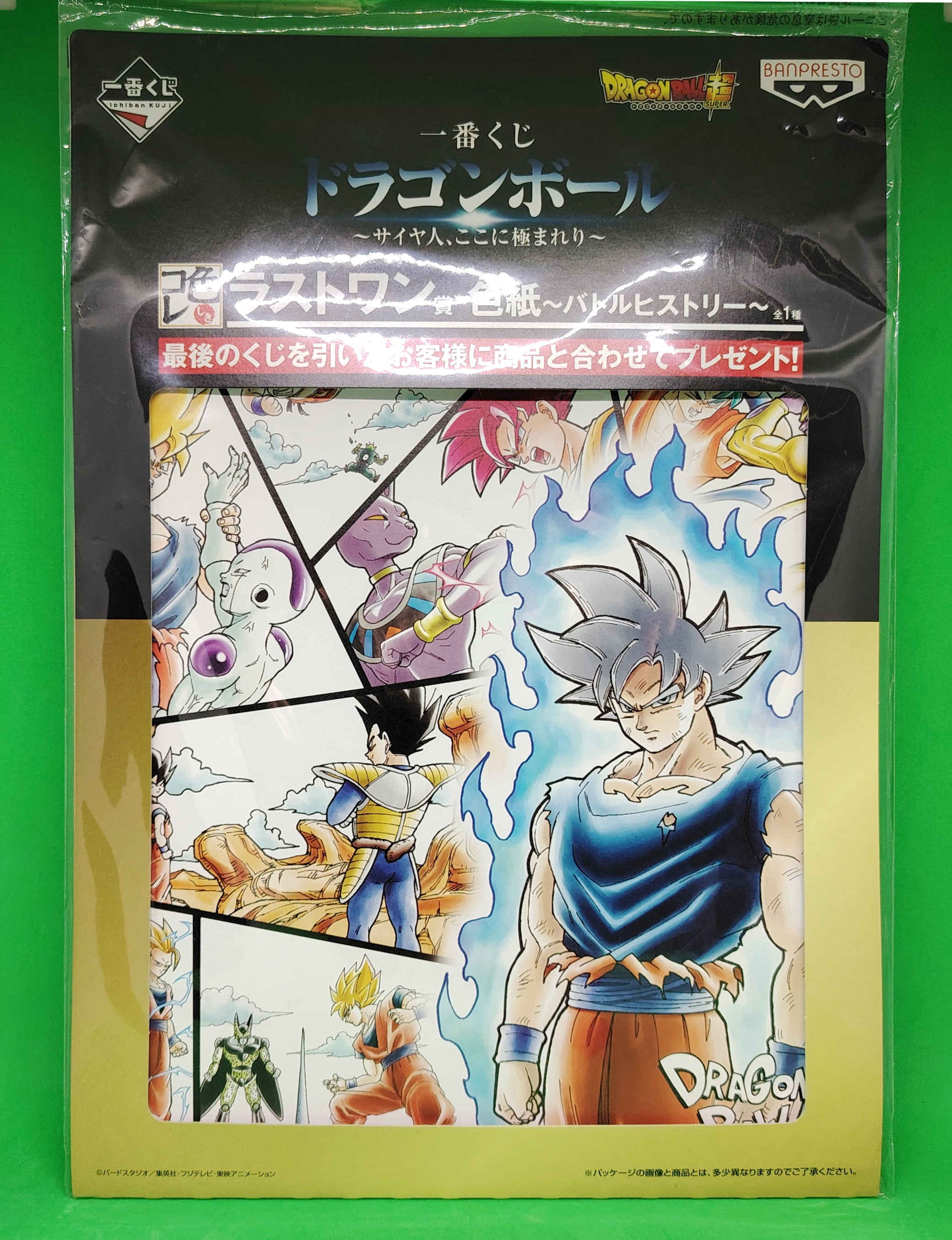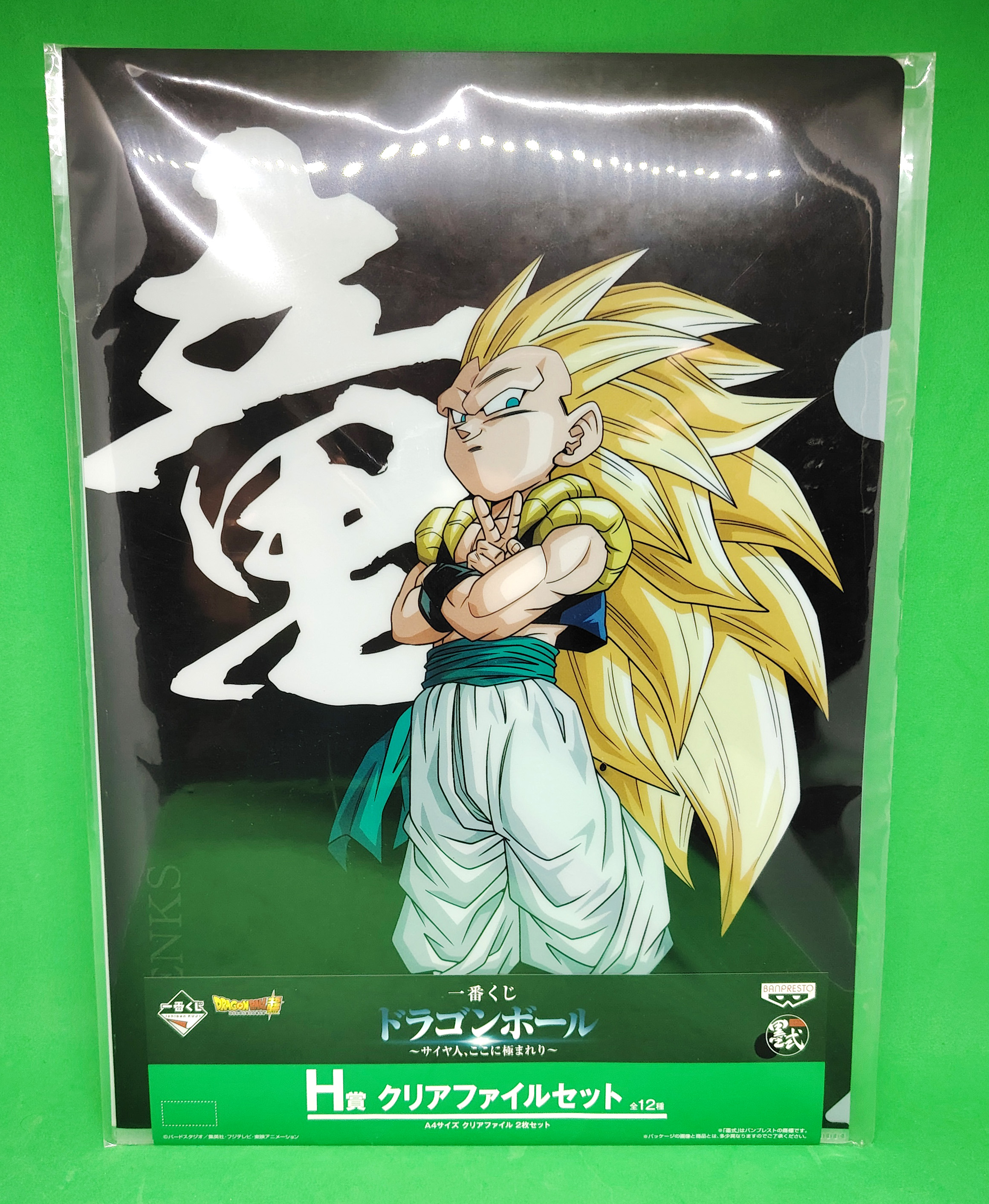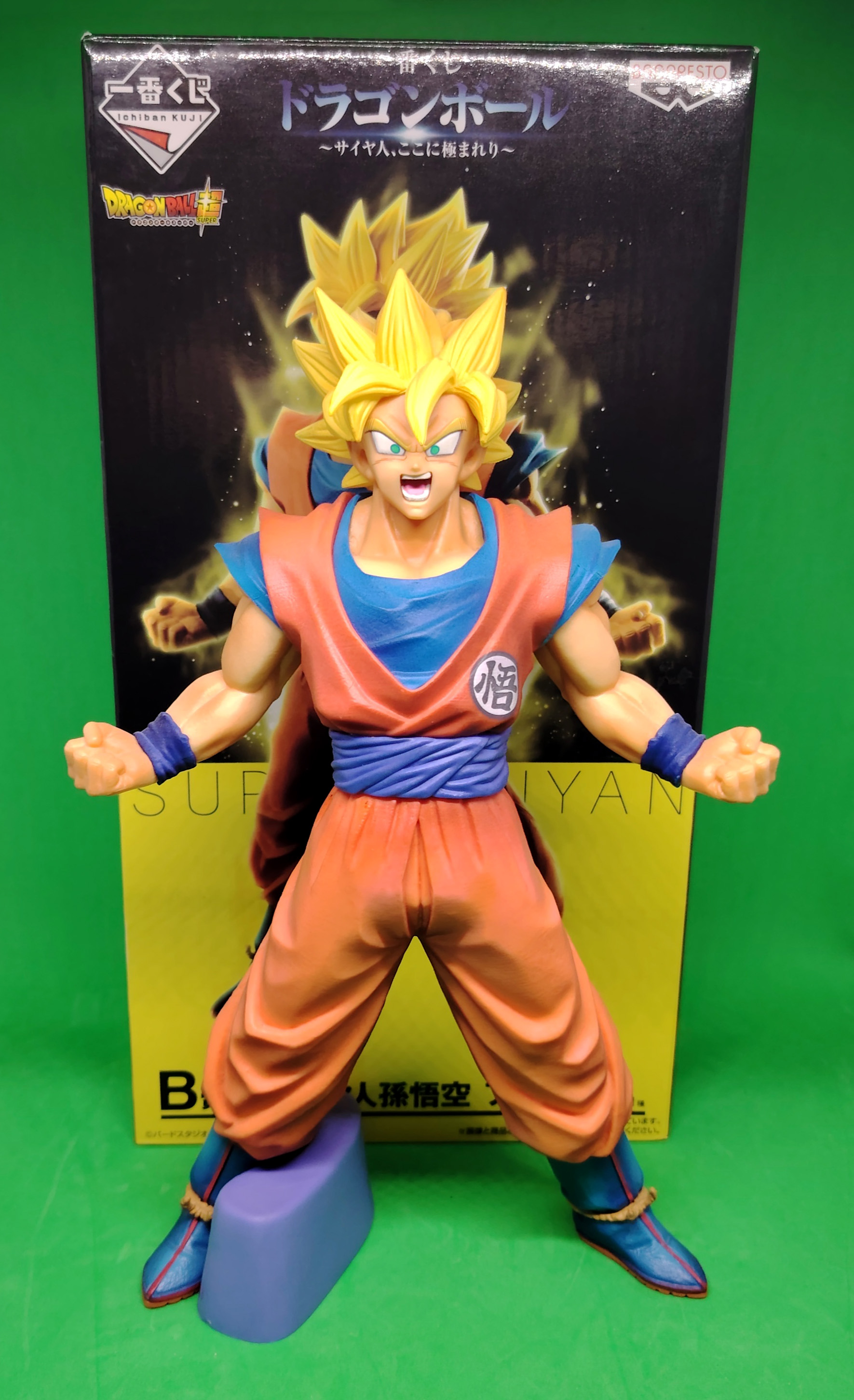 Gros lot ICHIBAN KUJI "La Limite des Saiyans" de 2018 comprenant 1 figurine en boite de Goku Super Saiyan (Lot B), 4 shikishis (Goku Oozaru, Trunks vs Freezer, Vegeta vs Cell, Goku vs Vegeta) (Lot F), 1 clear file de Gotenks Super Saiyan 3 (Lot H), 1 grand shikishi (bonus dernier ticket de la loterie), 1 affiche de la loterie et 1 présentoir de la loterie.