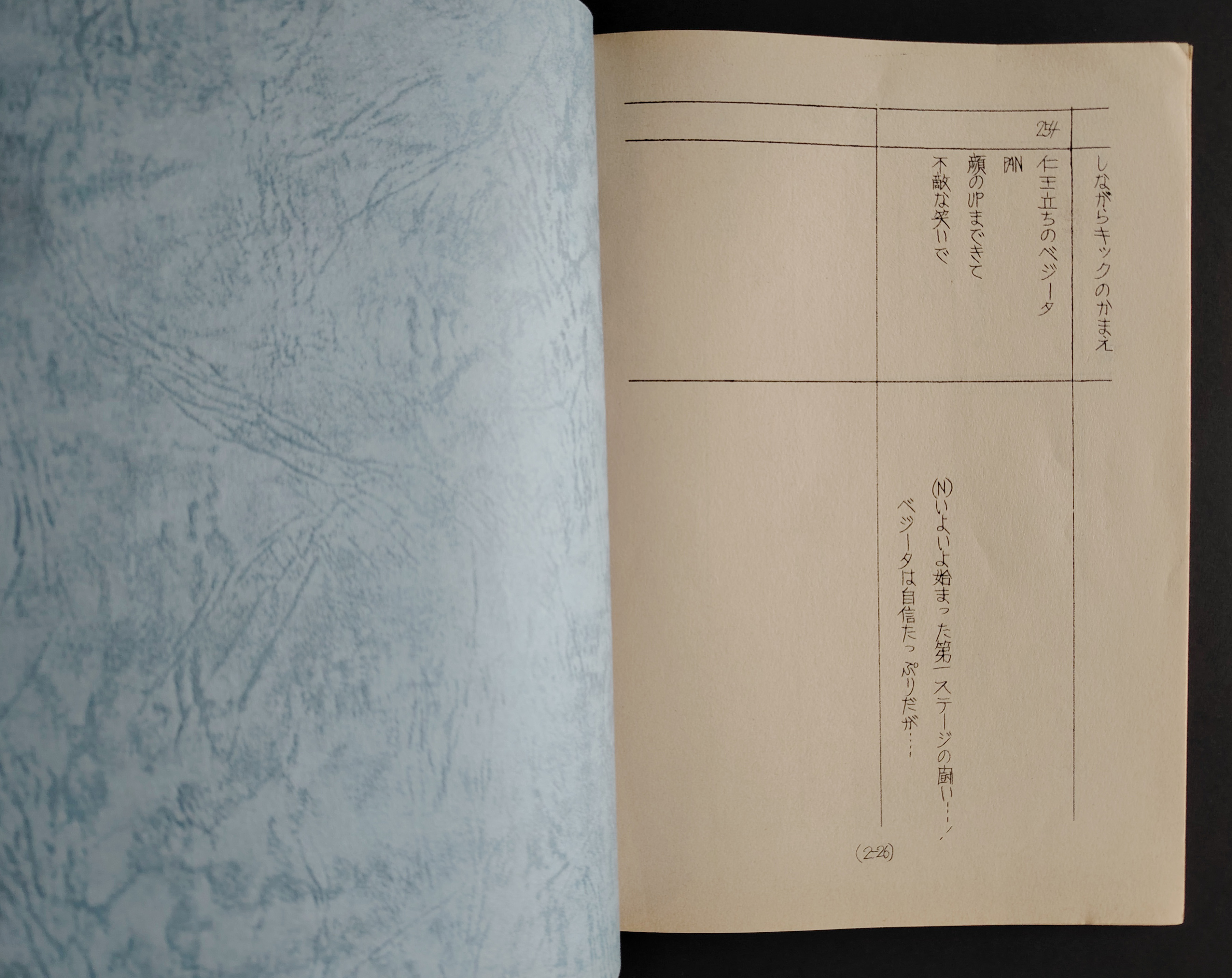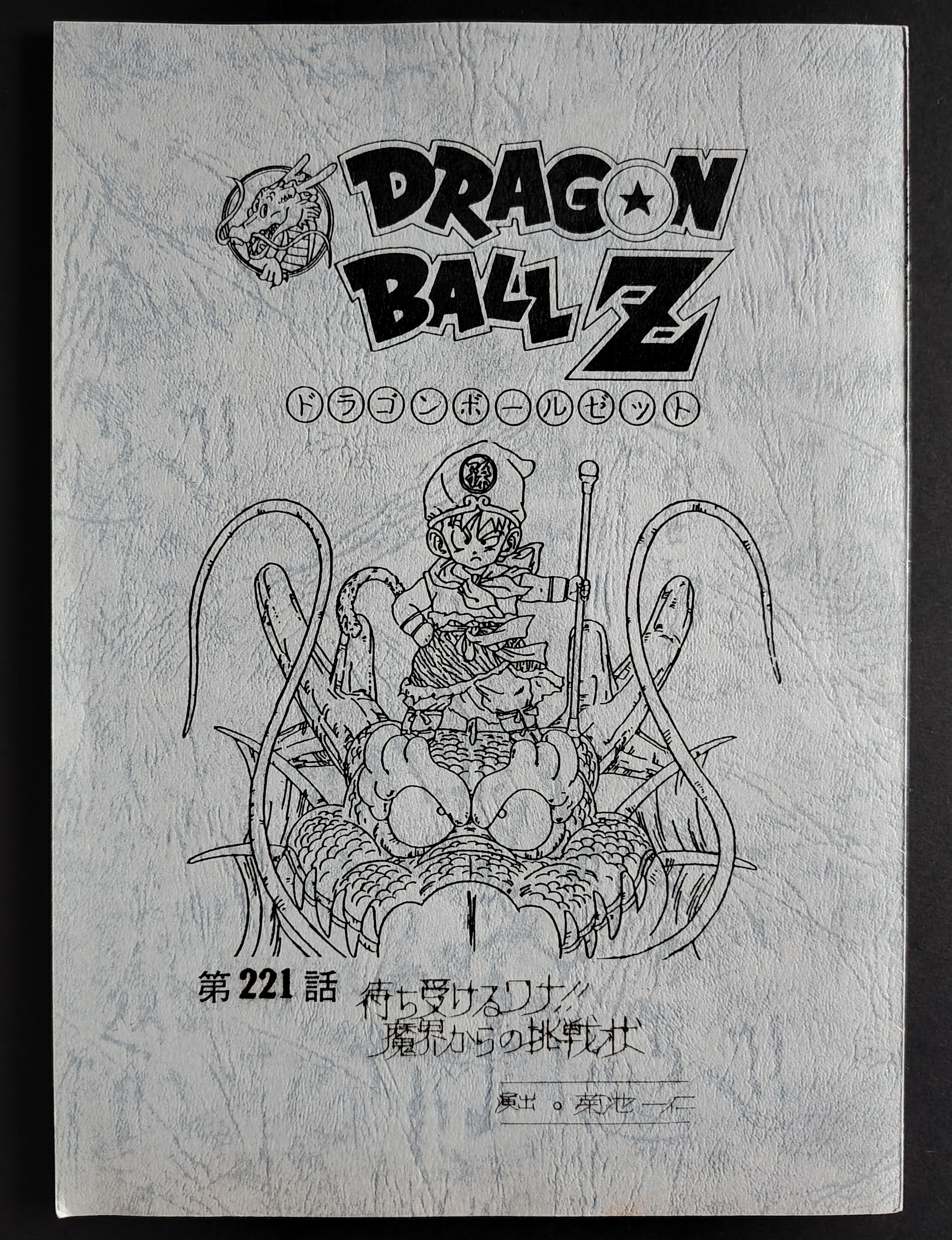 Script original utilisé par un seiyû (comédien de doublage japonais) lors de la réalisation de l'épisode 221 de DRAGON BALL Z en 1994. Titre de l'épisode : Le piège qui vous attend ! Un défi du royaume des démons 待ち受けるワナ!!魔界からの挑戦状 ! Réalisateur : Kazuhito Kikuchi.