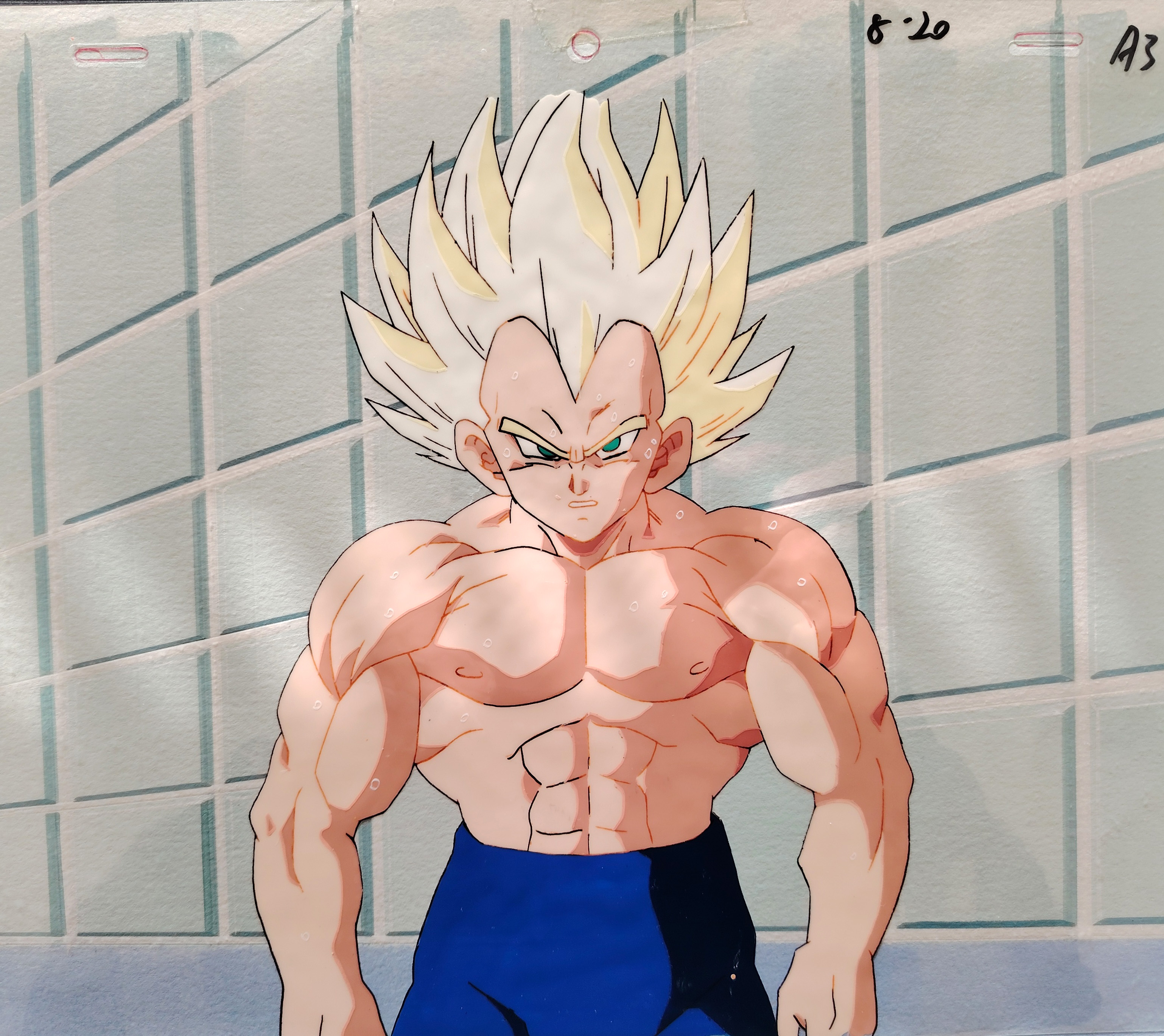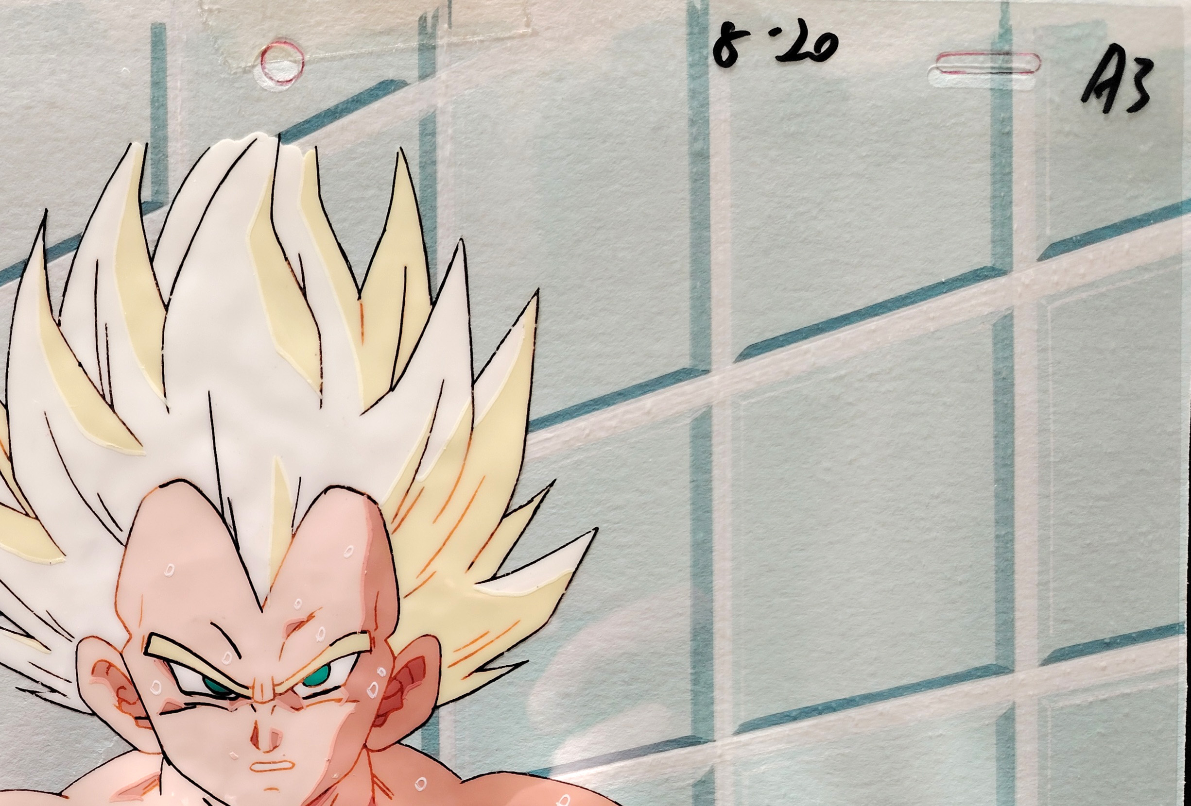 Cellulo original DRAGON BALL Z à l'encre et à la gouache collé a un décor original peint à la main, "non matching", représentant Vegeta Super Saiyan tiré de l'episode 207 "Ah, j'ai volé !! Videl apprend la danse de l'air", "あっ飛べた!!ビーデルの舞空術入門", produit en 1993 par la Toei Animation.