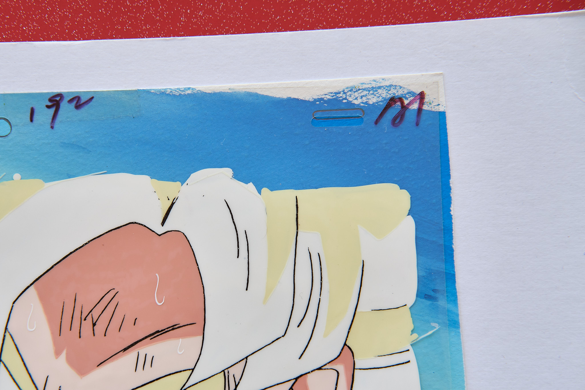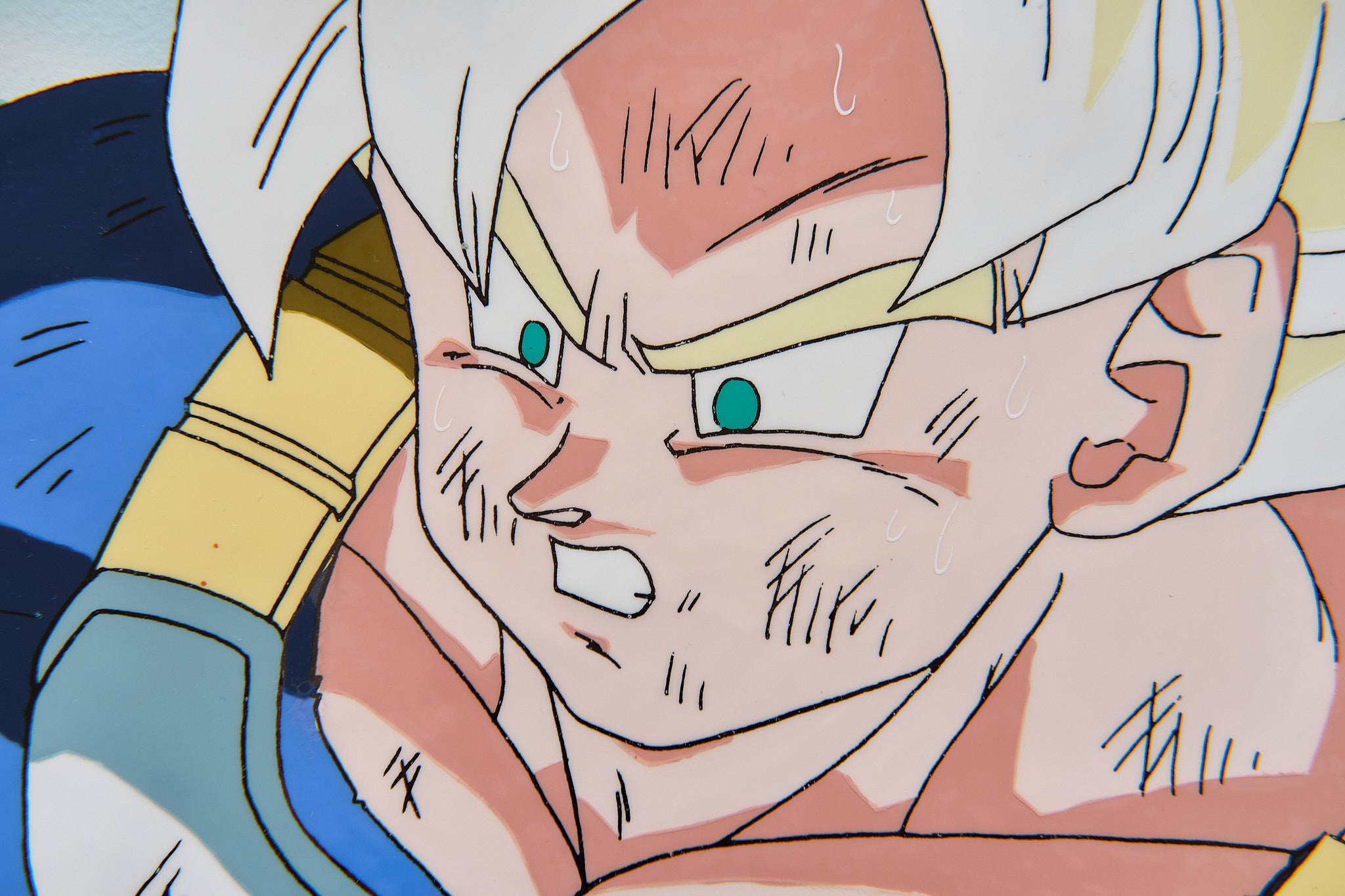 Cellulo clé (A1, premier de la séquence) original peint à la main à la peinture acrylique et utilisé dans la production de l'anime Dragon Ball Z, format standard (26,5x22,8cm) représentant Gokû en Super Saiyan portant son armure Saiyan, avec décor peint à la main (probablement le bon utilisé dans la séquence, mais celui-ci est collé au cellulo). Le douga, crayonné préparatoire dessiné à la mine de plomb est également présent. Cette séquence a été supposément réalisée pour l'épisode 187 de Dragon Ball Z, séquence clé A1 mais a priori non utilisé dans l'anime, la séquence commence à A2, visionnable à 15 minutes et 43 secondes.