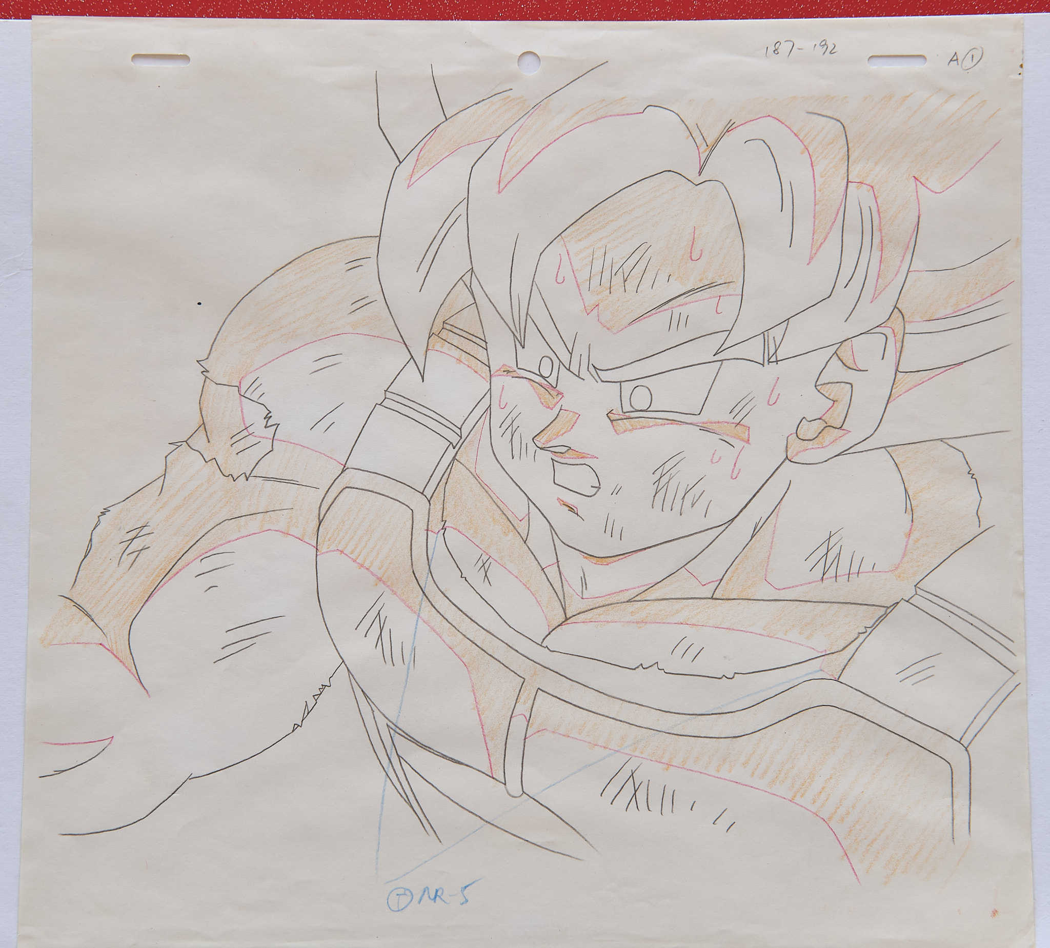Original hand-painted acrylic key animation cel (A1, first of the sequence) used in the production of the Dragon Ball Z anime, standard size (26.5x22.8cm), depicting Super Saiyan Goku wearing his Saiyan armor, with a hand-painted background (probably the matching one used in the sequence, but it is stuck to the cel). The douga, a preparatory graphite pencil sketch, is also included. This sequence was supposedly created for episode 187 of Dragon Ball Z, key sequence A1 but seemingly unused in the anime; the broadcast sequence starts at A2, visible at 15 minutes and 43 seconds.