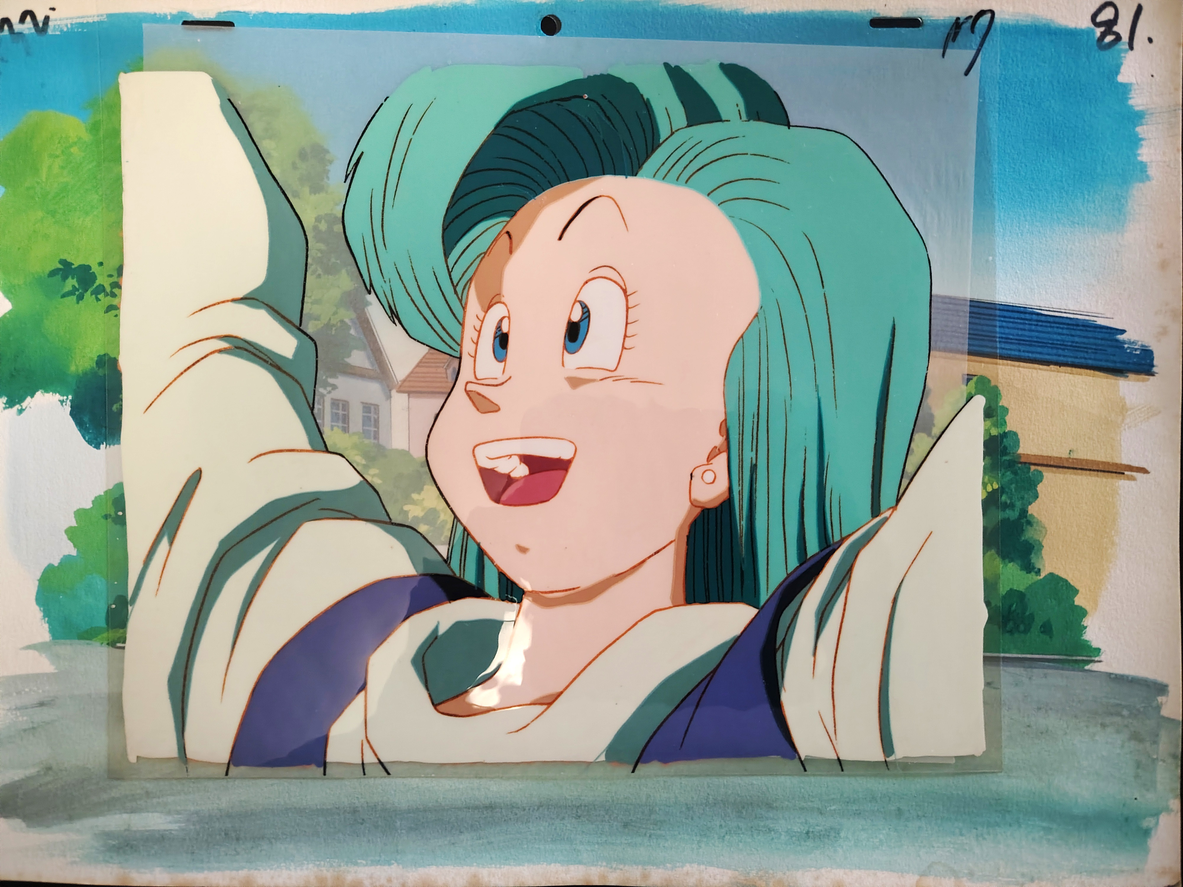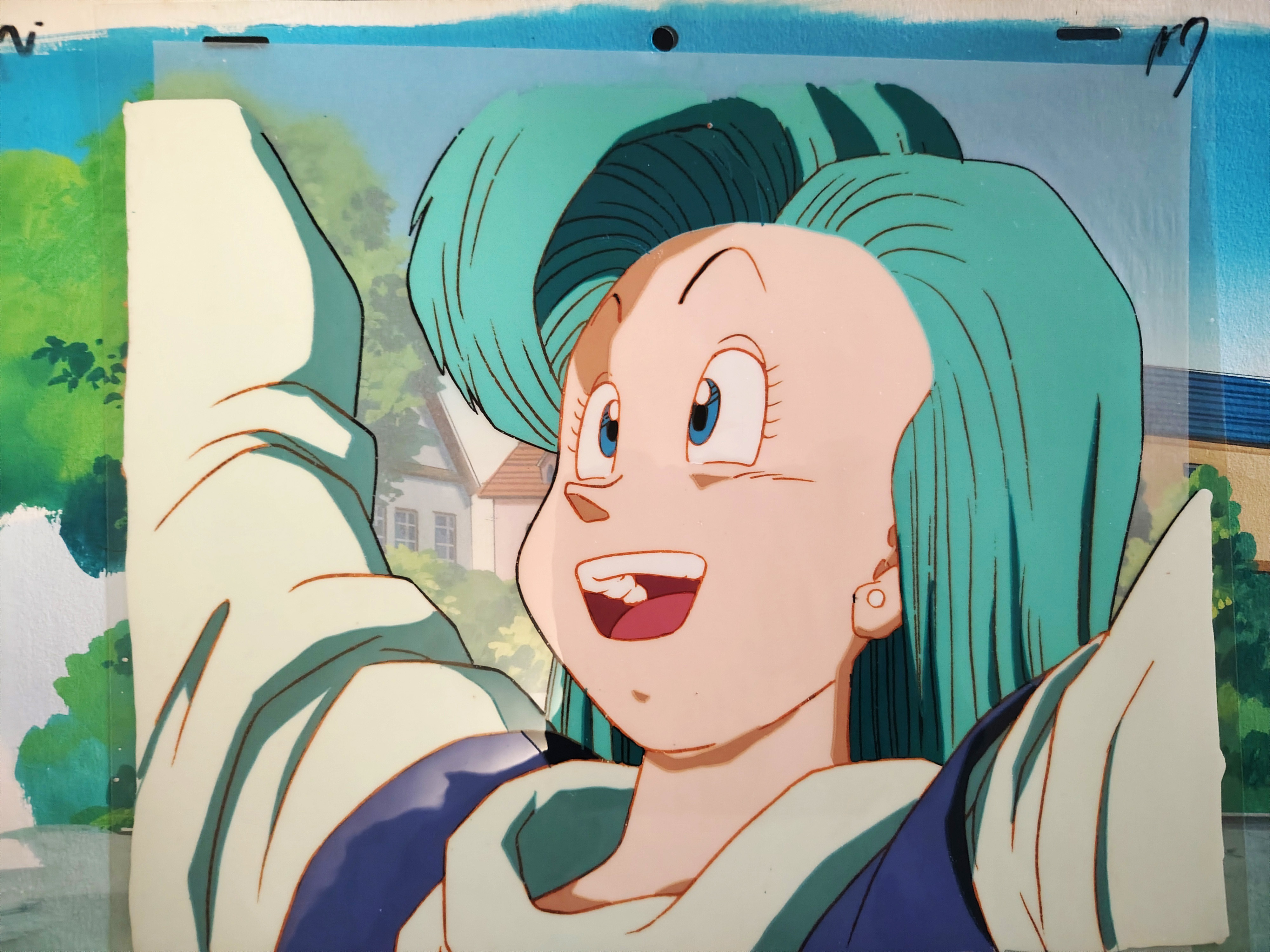 Cellulo original DRAGON BALL Z à l'encre et à la gouache avec décor gouaché "non Matching" et non collé représentant Bulma et provenant de l'épisode 107 : "Son Goku est en vie ! Les guerriers Z sont tous ressuscités !!", " 生きていた孫悟空 Z戦士が全員復活だ!!", produit par Toei Animation en 1991.