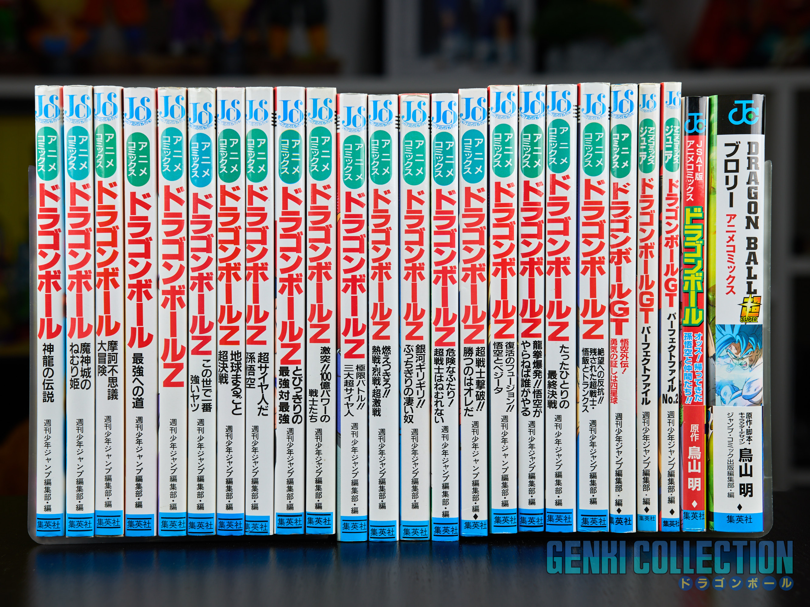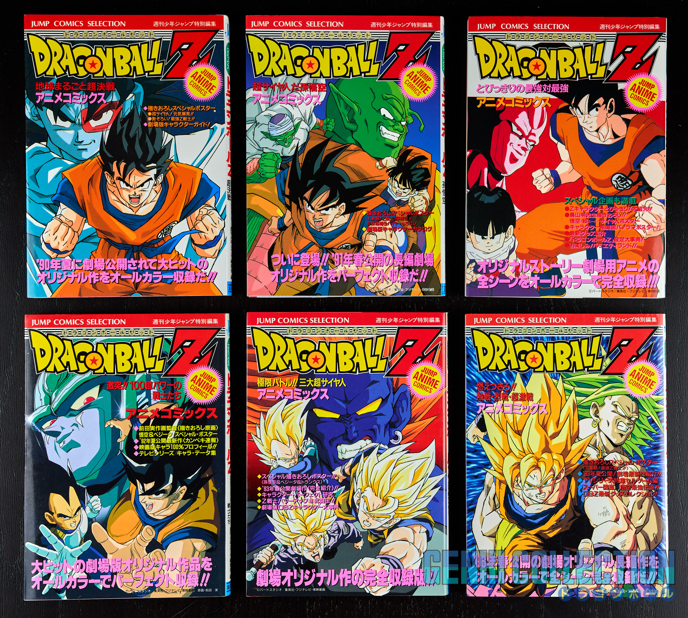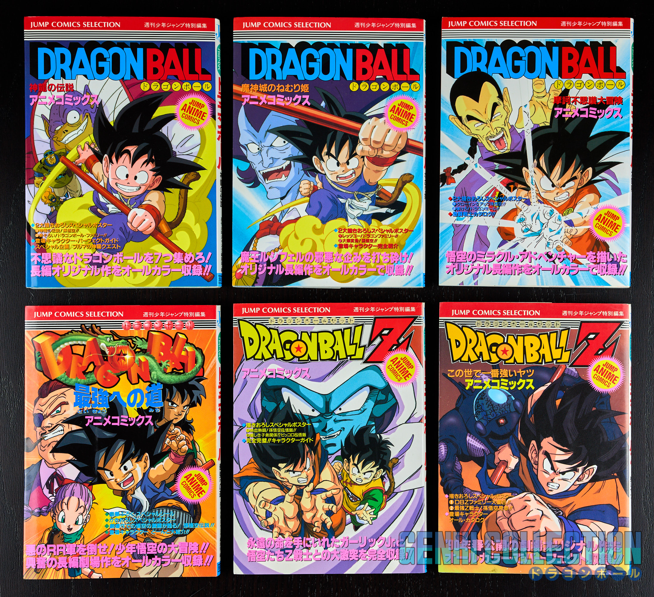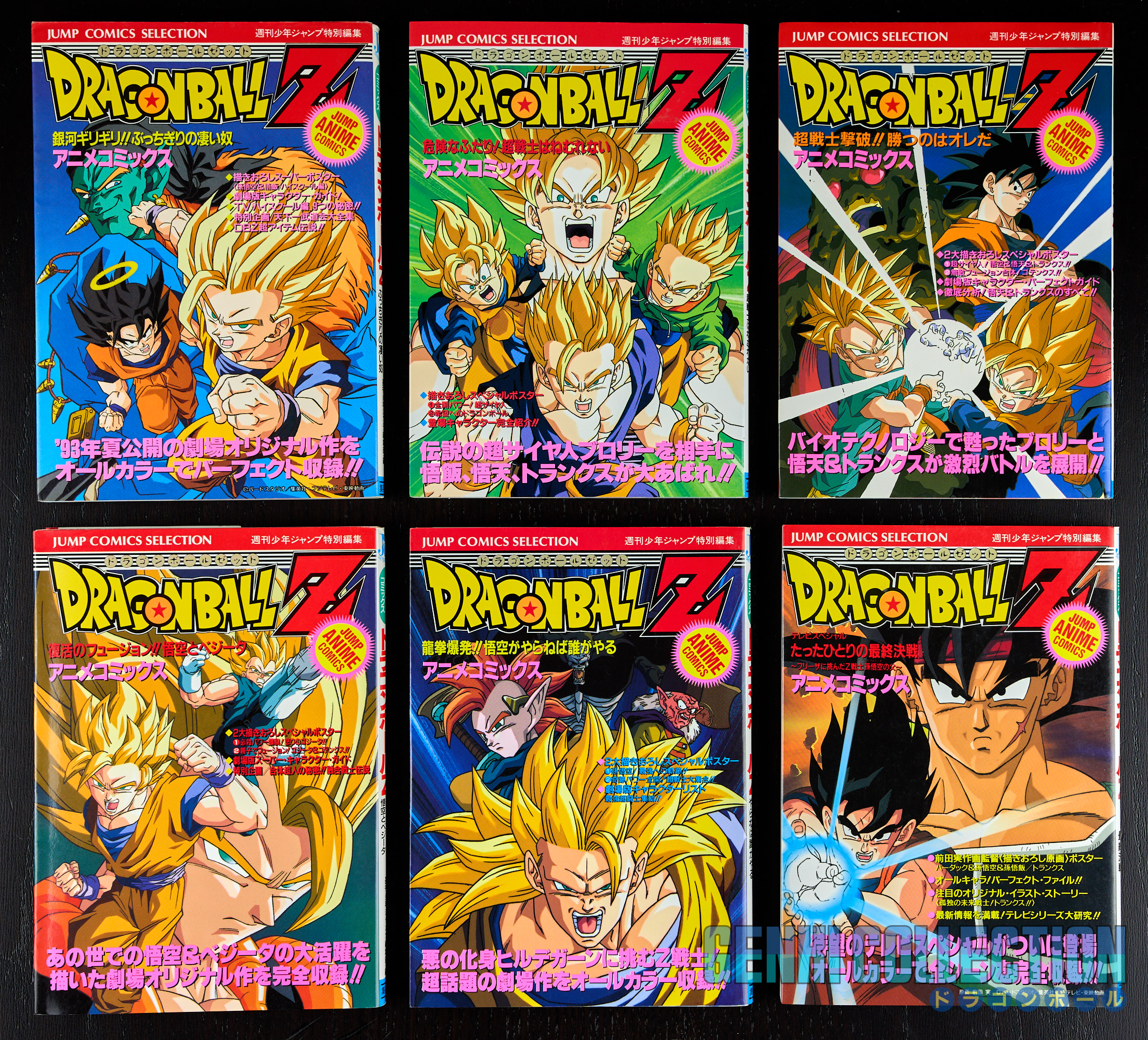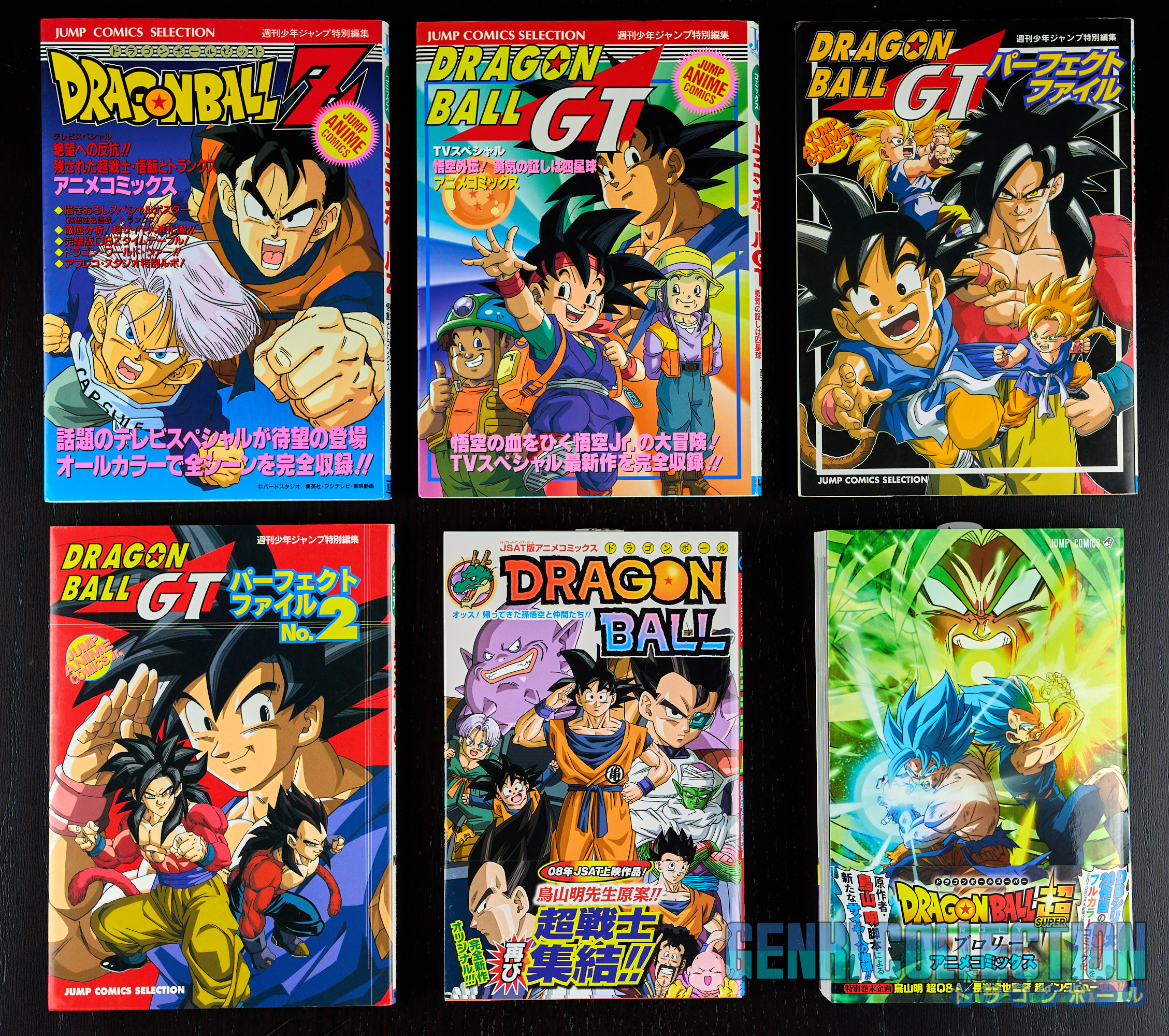 Set of 24 Japanese Jump Anime Comics volumes covering the 4 Dragon Ball movies, the 13 Dragon Ball Z movies, the 2 Dragon Ball Z TV specials, the Dragon Ball GT TV special, the 2 Dragon Ball GT Perfect Files, the Dragon Ball OVA (JSAT), and one Dragon Ball Super movie (Broly). The majority of the volumes are 1st editions, except for Z movies 3 (2nd edition), 5 (6th edition), 6 (3rd edition), 11 (2nd edition), Z TV SP 1 (2nd edition), and DBS Broly (2nd edition). Most of the volumes are in excellent condition with two or three in slightly lesser condition. The JSAT and DBS Broly volumes both have their Obi. All "Jump Comics Selection" volumes of the Dragon Ball and Dragon Ball Z movies contain their attached double-sided triptych posters, and the 3 JCS of Dragon Ball GT and the 4th Dragon Ball movie have their sticker sheets. All volumes are protected in cellophane.