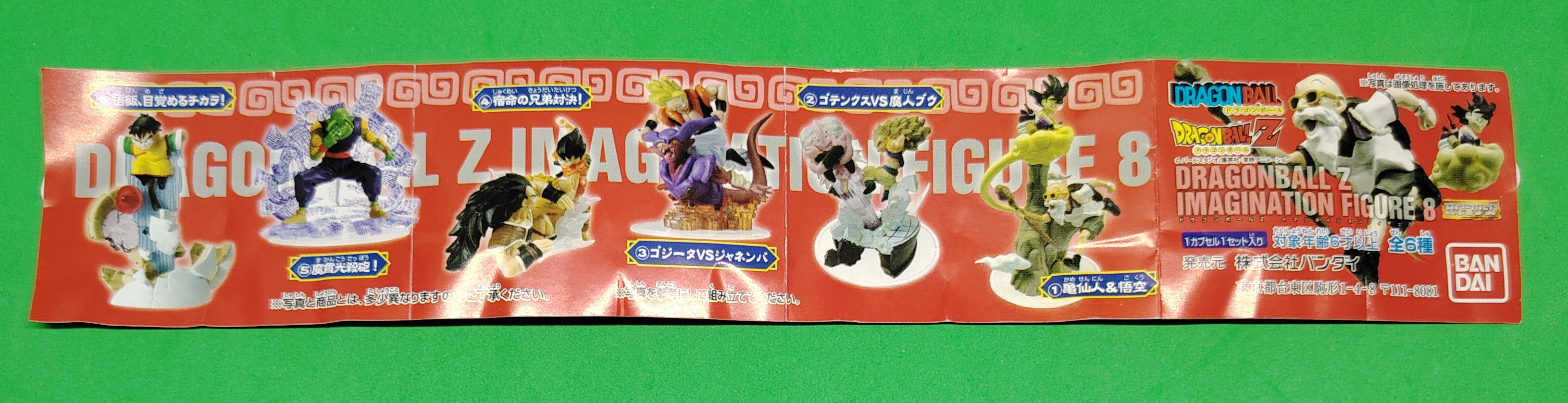 lot de 4 gashapons Dragon Ball Z Imagination Figure partie 8 sortie en 2006 par Bandai et représentant les personnages de Raditz vs Goku , Gohan , Piccolo , Gogeta Vs Janemba ; fourni avec le dépliant de la série.