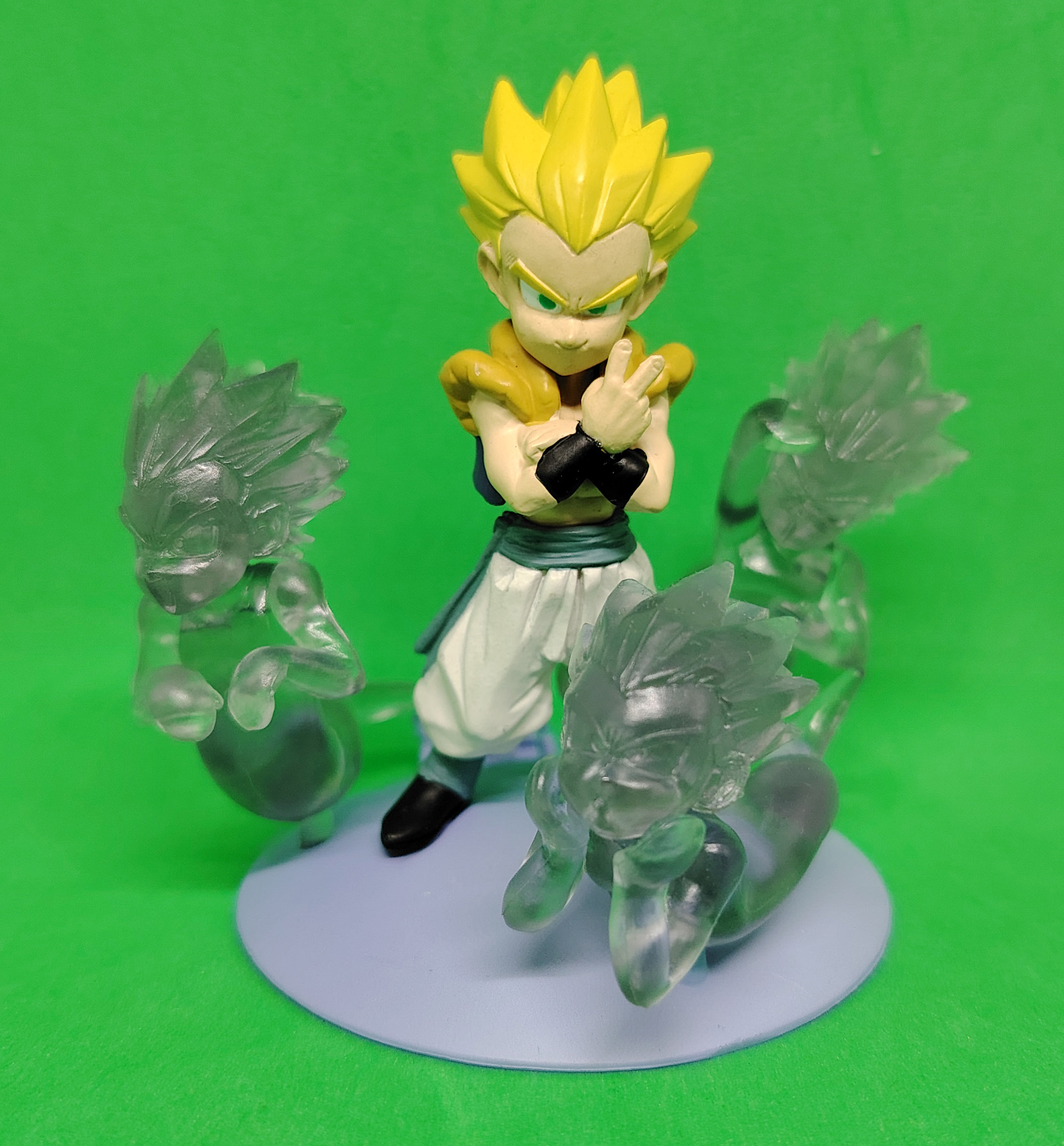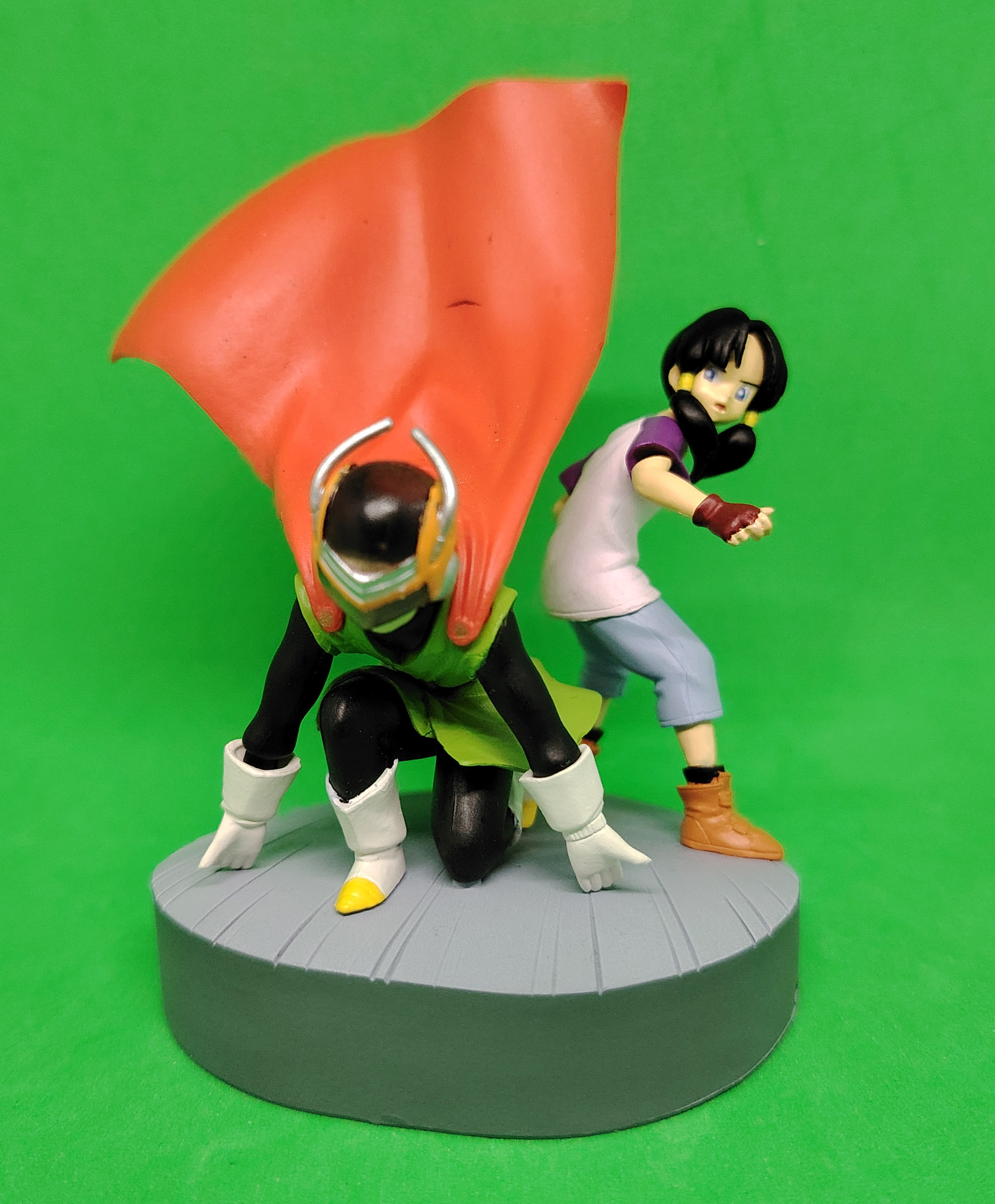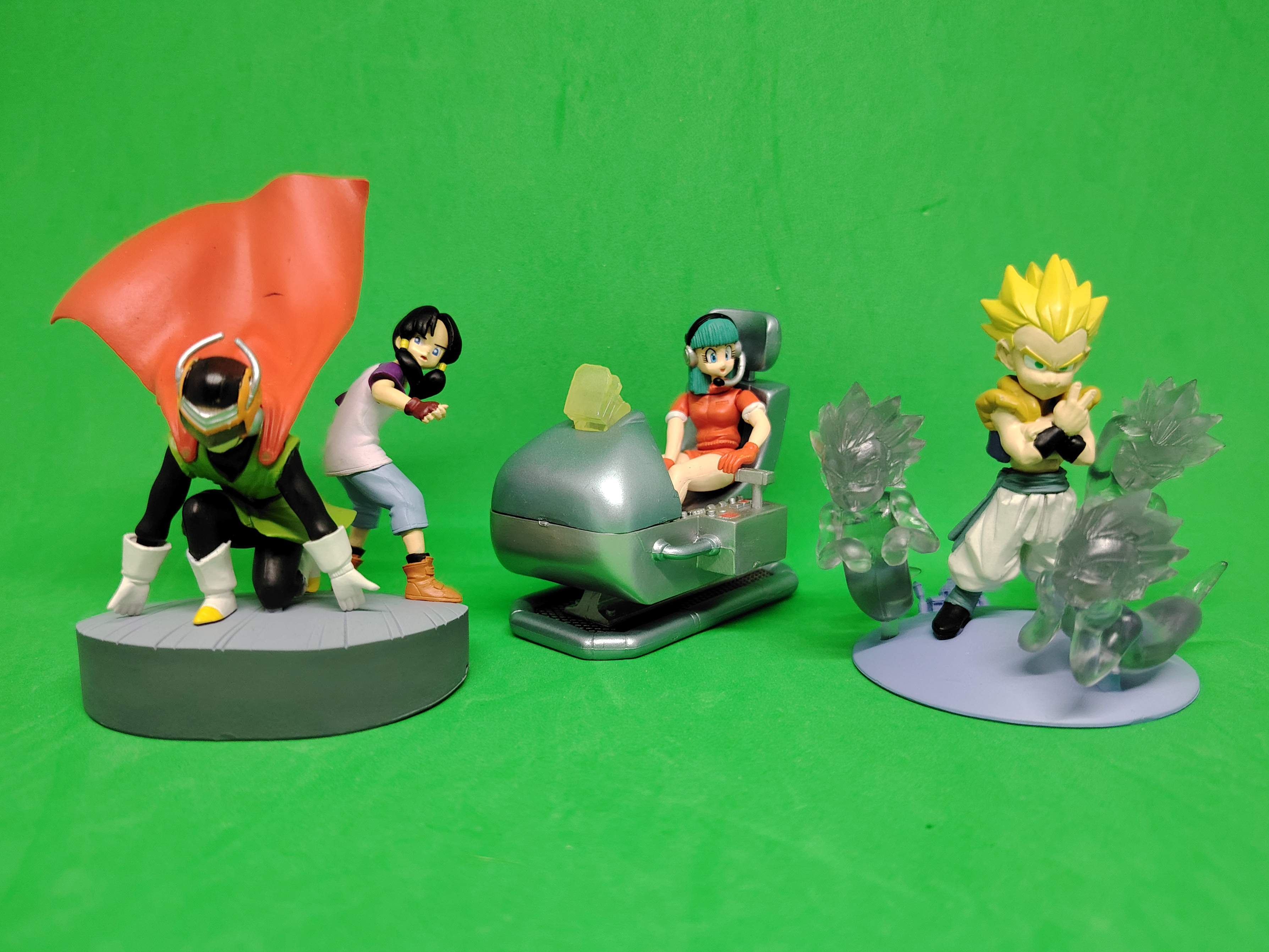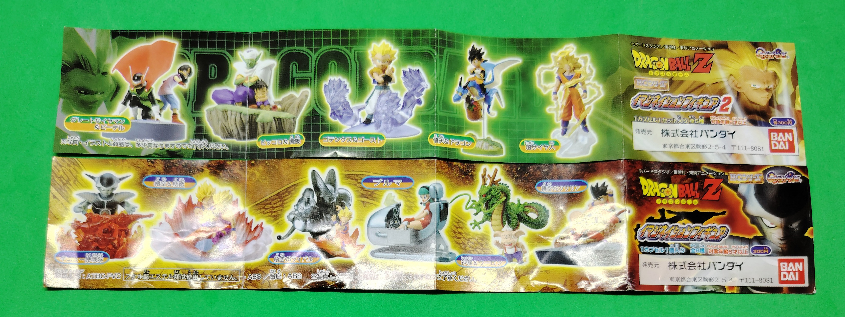 lot de 3 gashapons Dragon Ball Z Imagination Figure par Bandai, partie 1 Bulma (2003), partie 2 Great Saiyaman et Videl, Gotenks Super Saiyan Super Ghost Kamikaze Attack (2004) et 2 dépliants des parties 1 et 2.