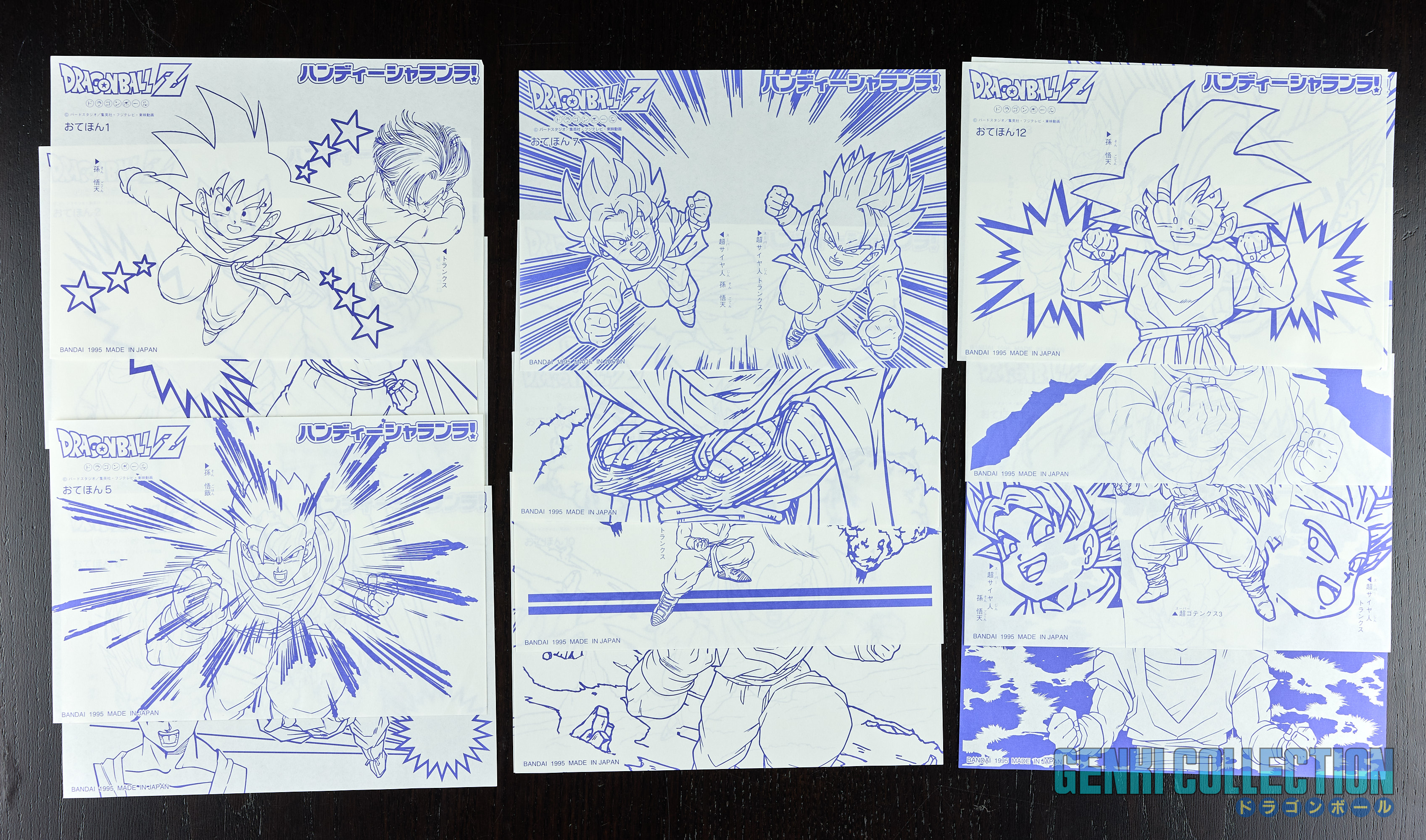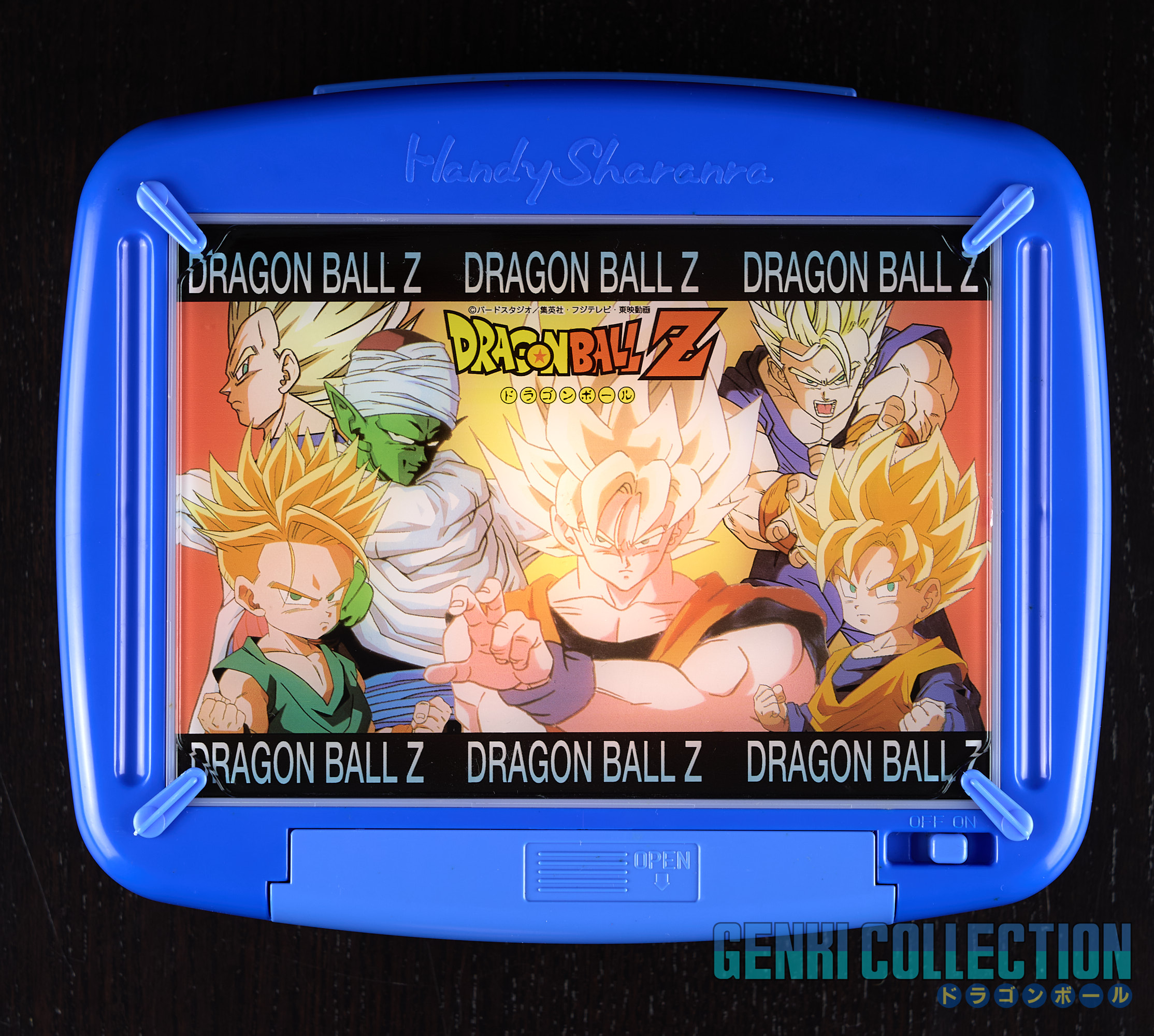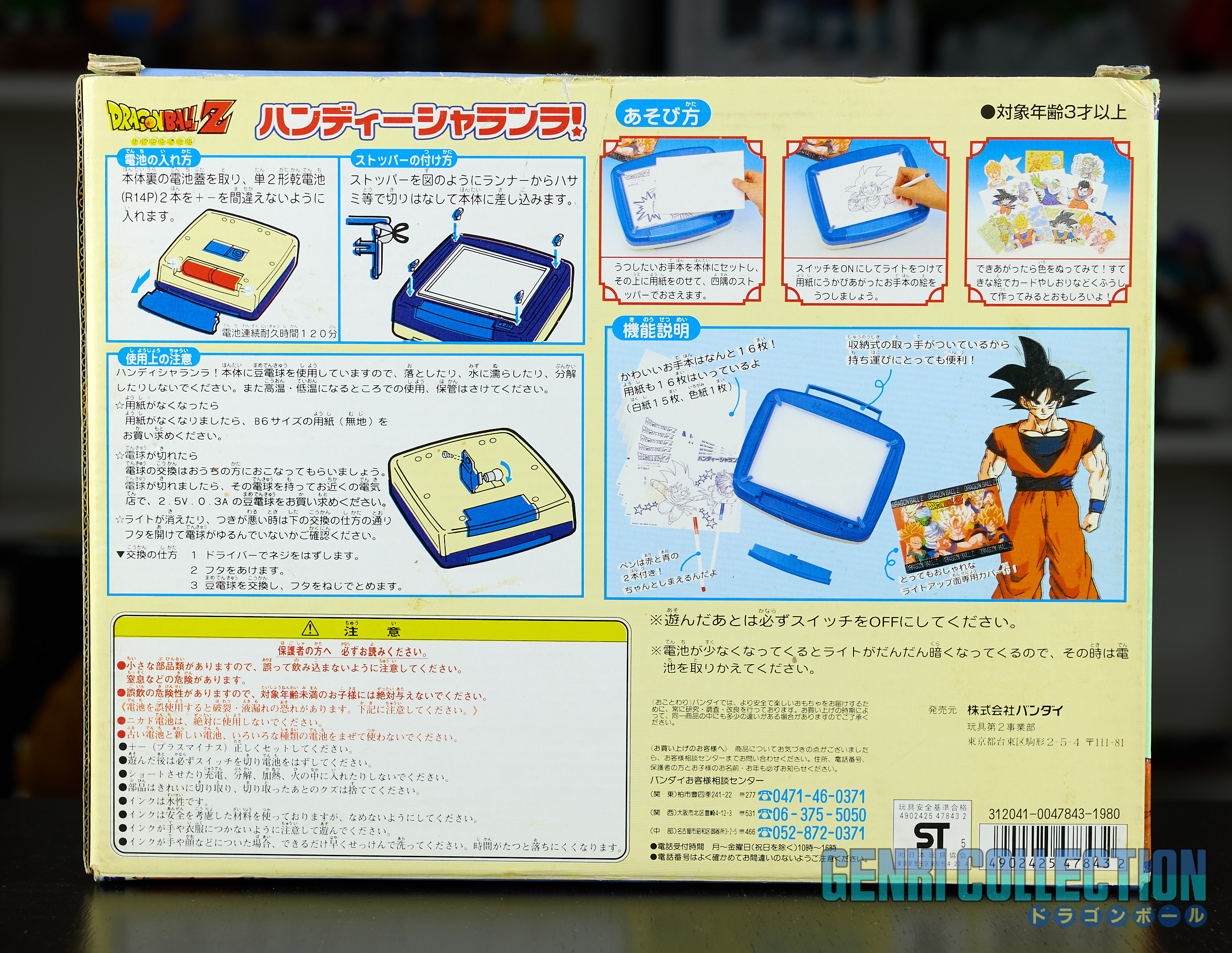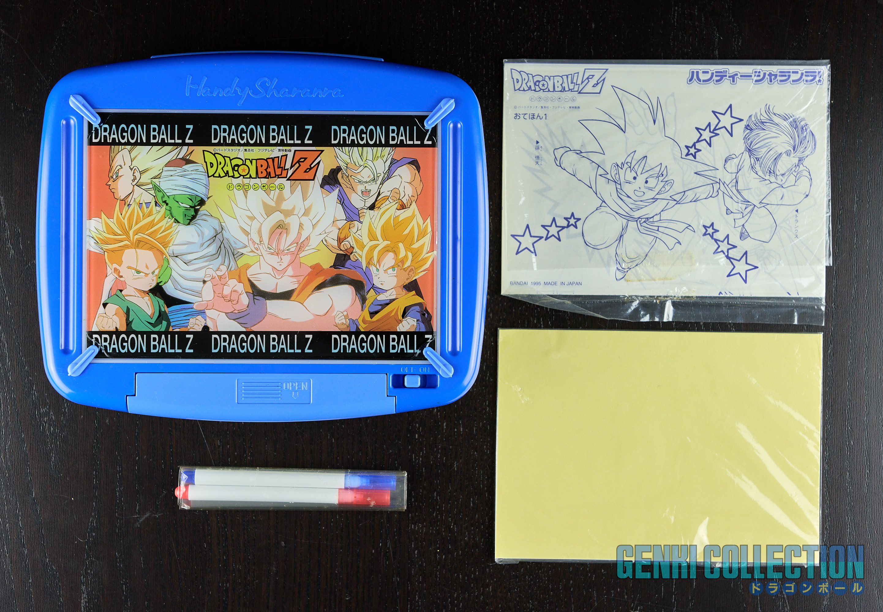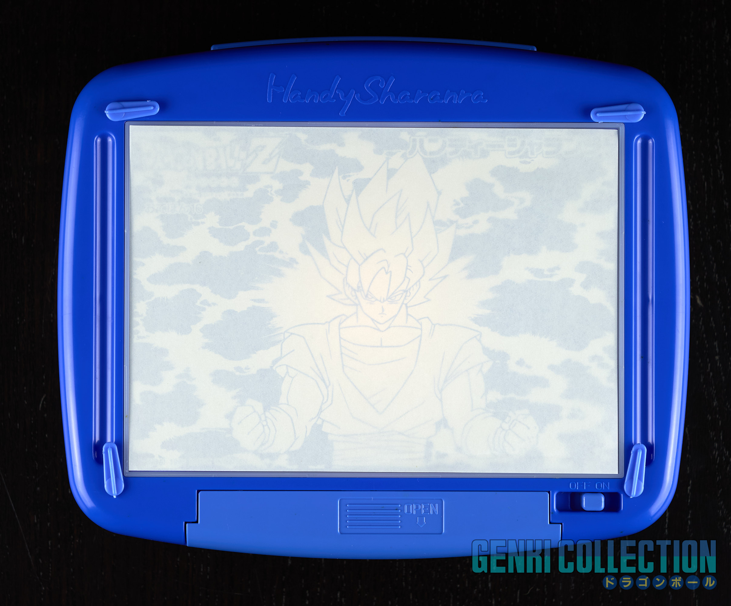 Kit à dessiner Dragon Ball Z Handy Sharanra qui se compose d'une boîte à dessin lumineuse (fonctionnelle avec 2 piles LR14), de 2 feutres (rouge et bleu) et d'un set de 16 planches à reproduire sur feuilles vierges par transparence avec la boîte à dessin. Très bon état général et complet. Bandai 1996