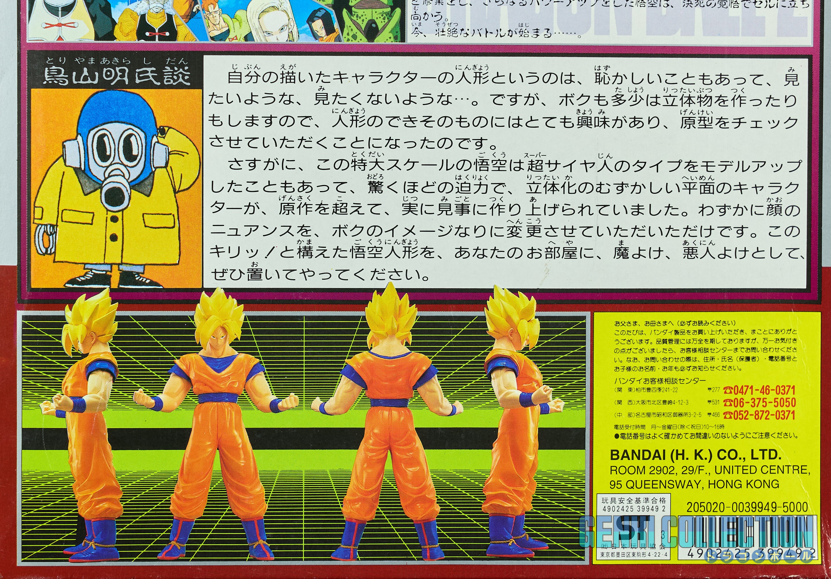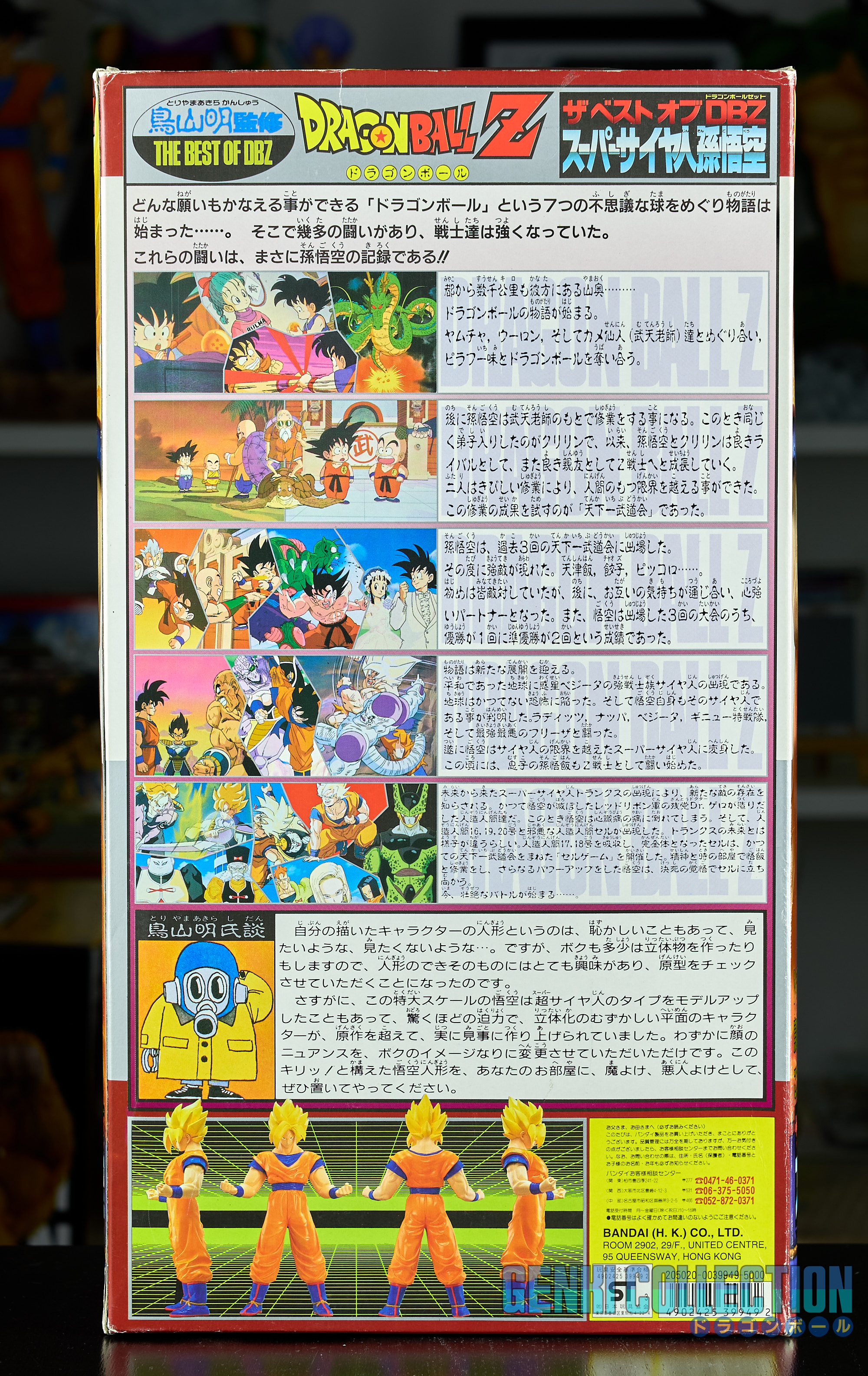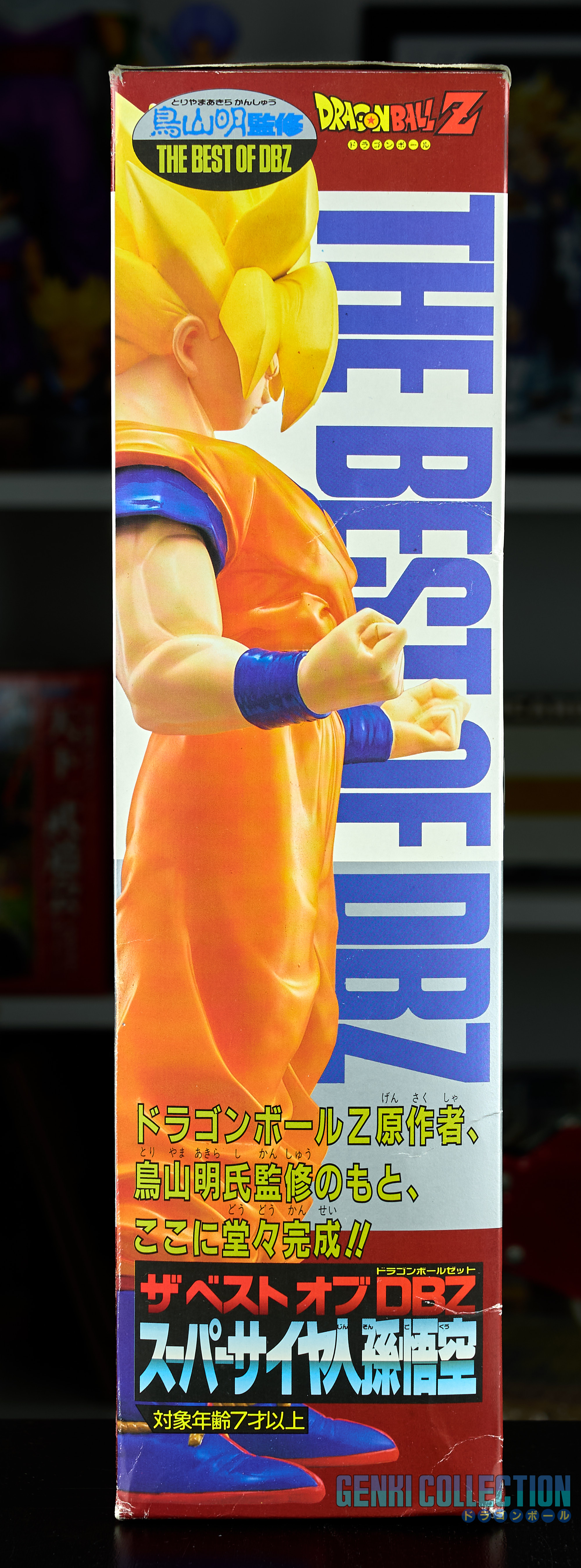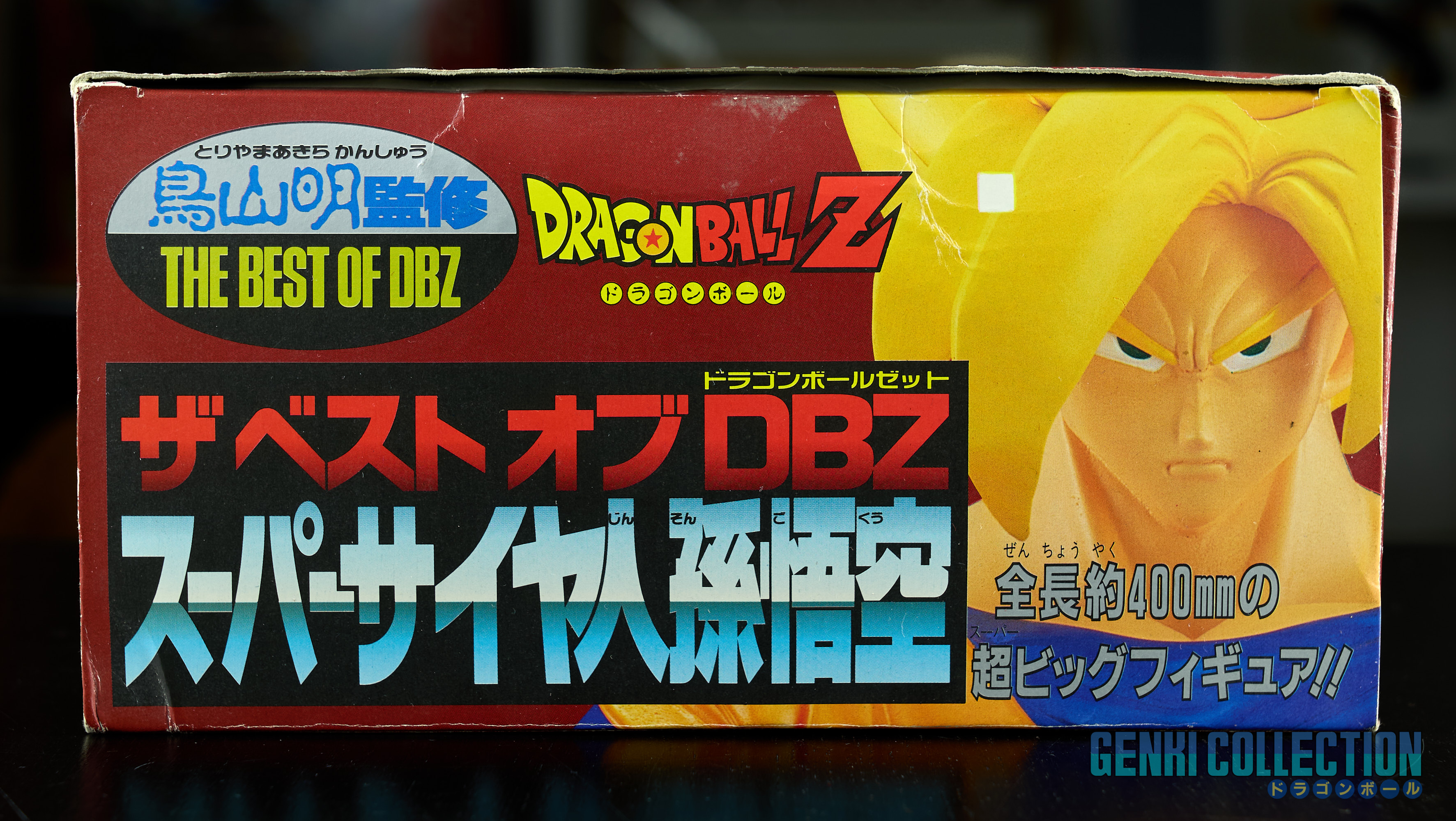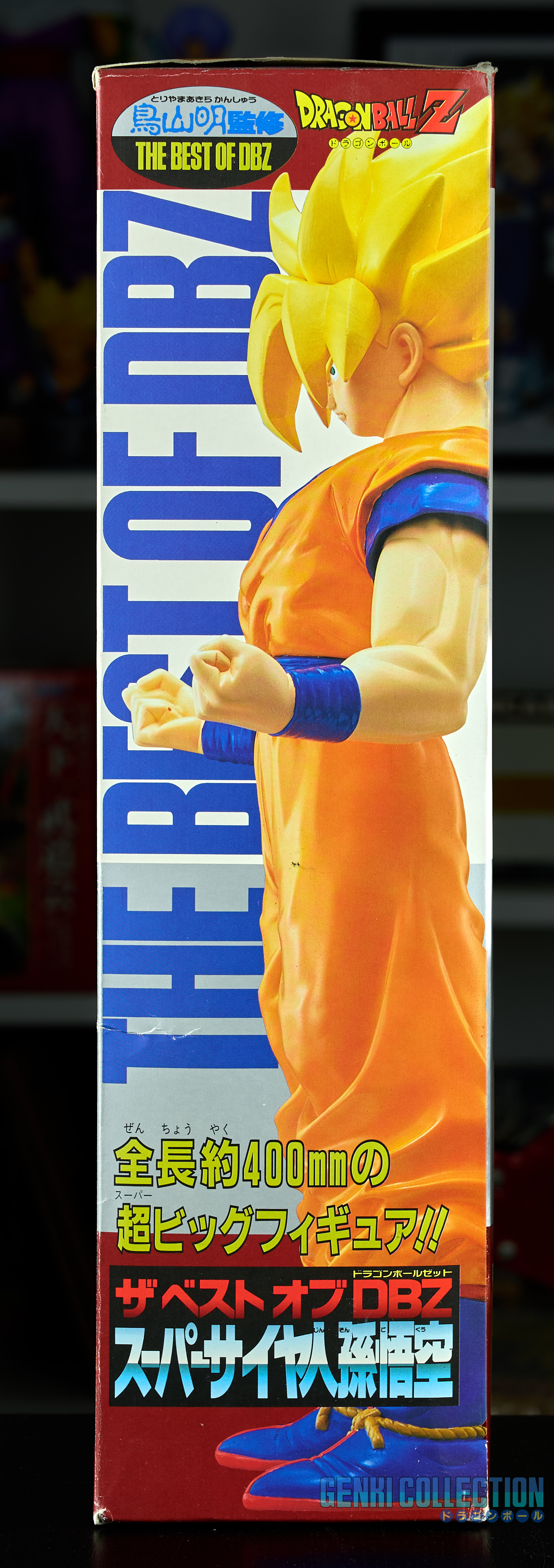 Exceptional Super Saiyan Son Goku figure, The Best Of Dragon Ball Z, 40 cm tall, released in 1994 by Bandai, in its original box. A rare and hard-to-find figure in box. Good overall condition; the box shows some flaws (slight dent on the front and wear on the corners). On the back is a comment from Akira Toriyama stating how much he appreciated the sculpting of this model.