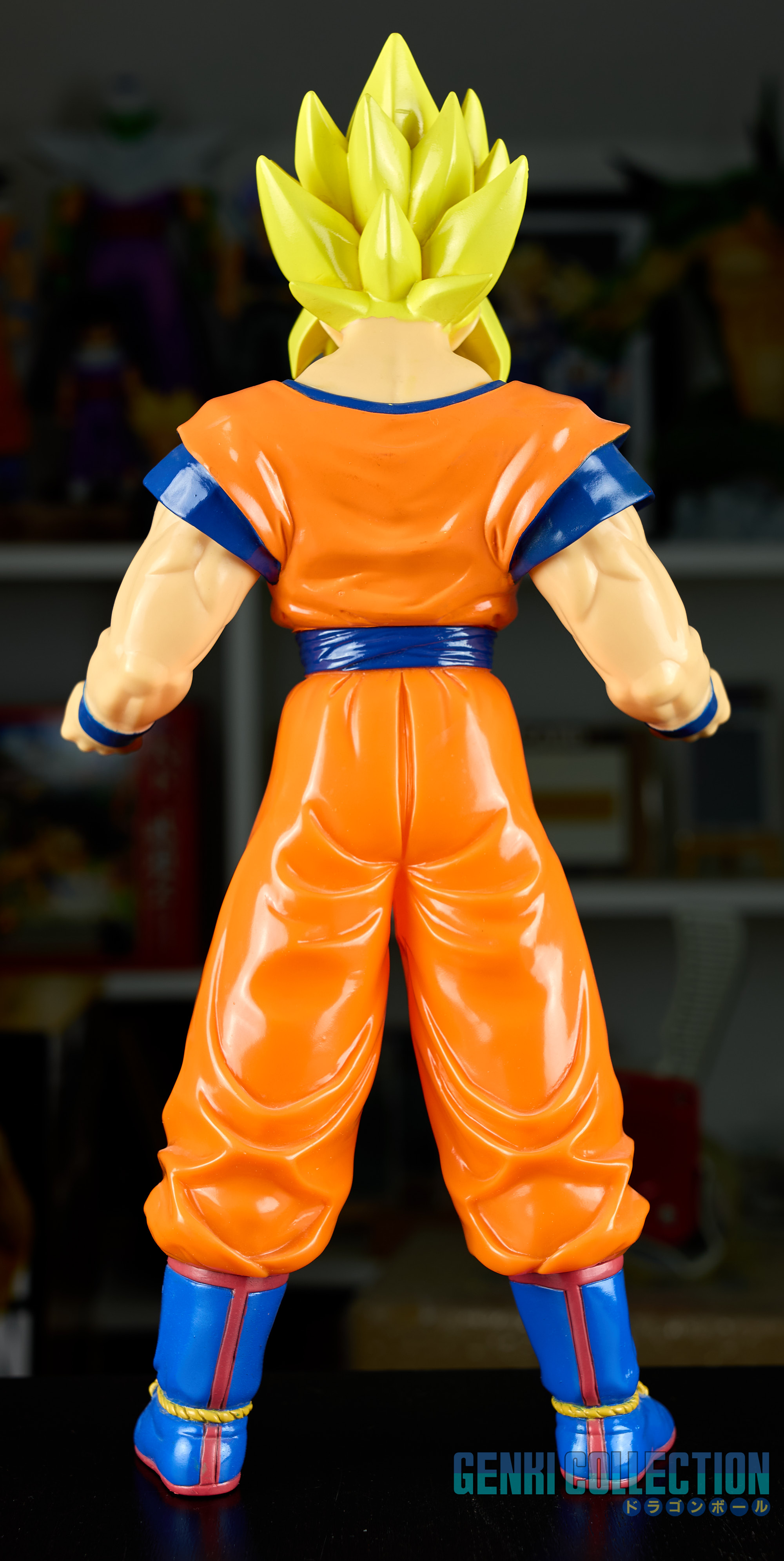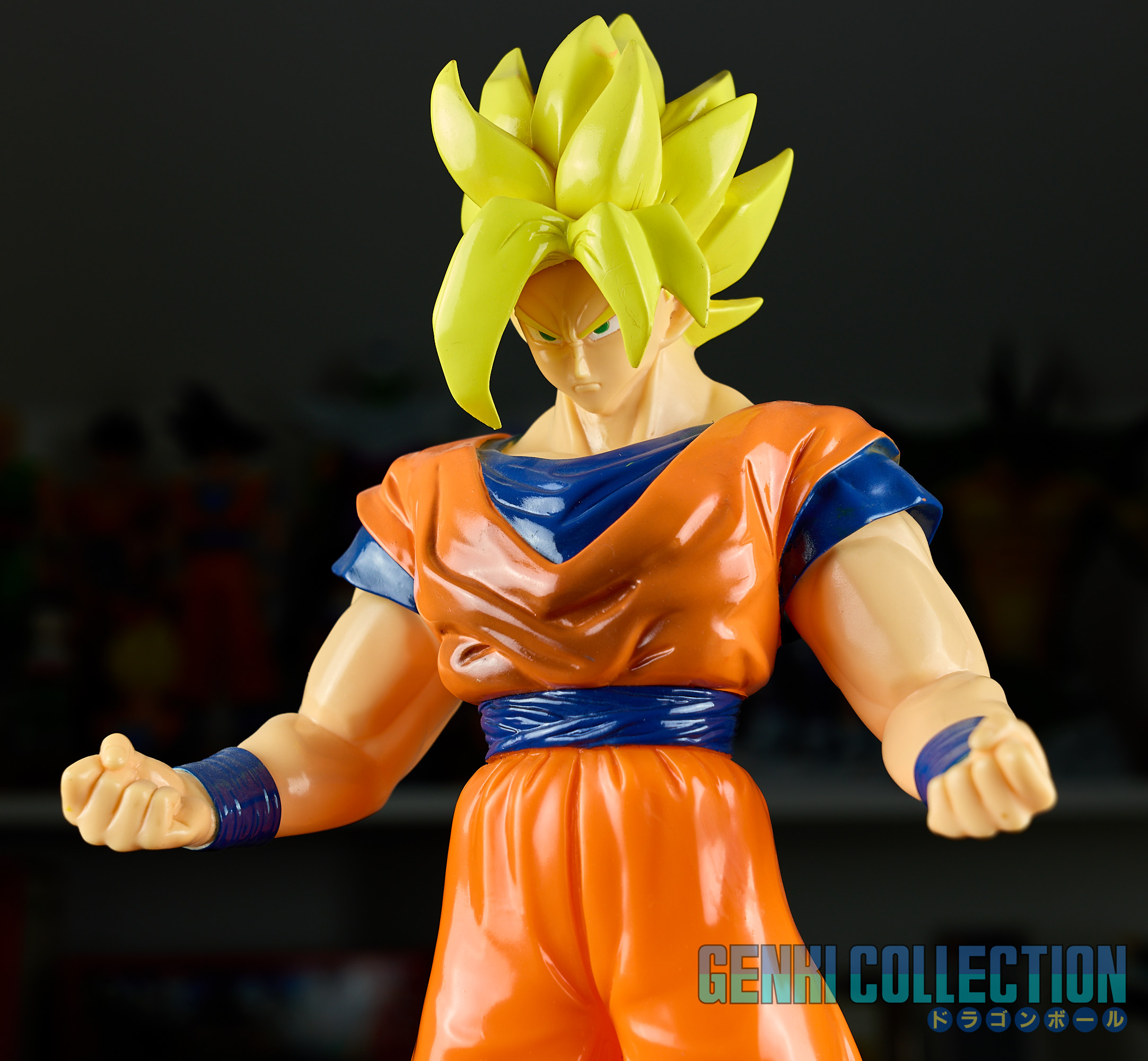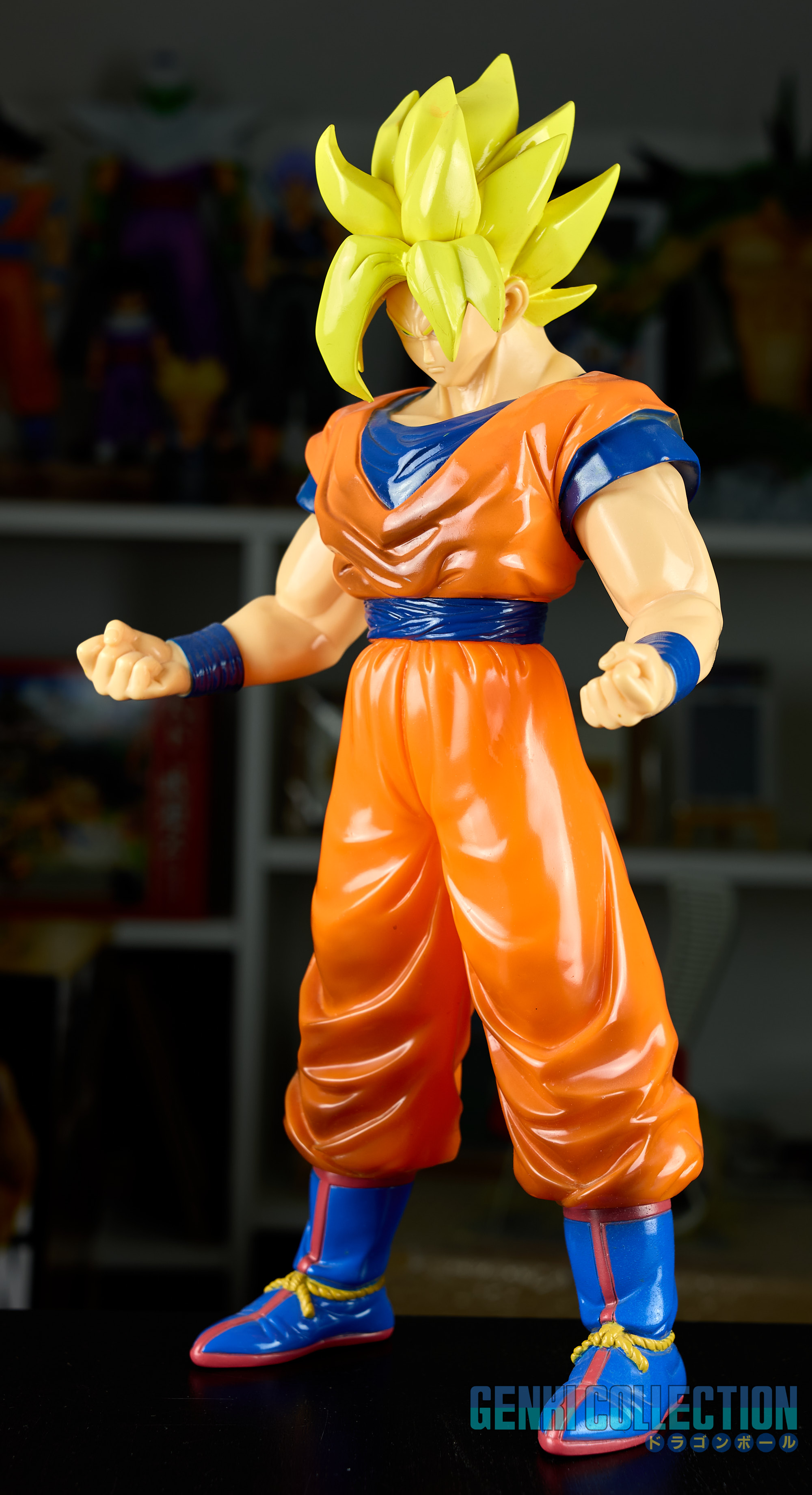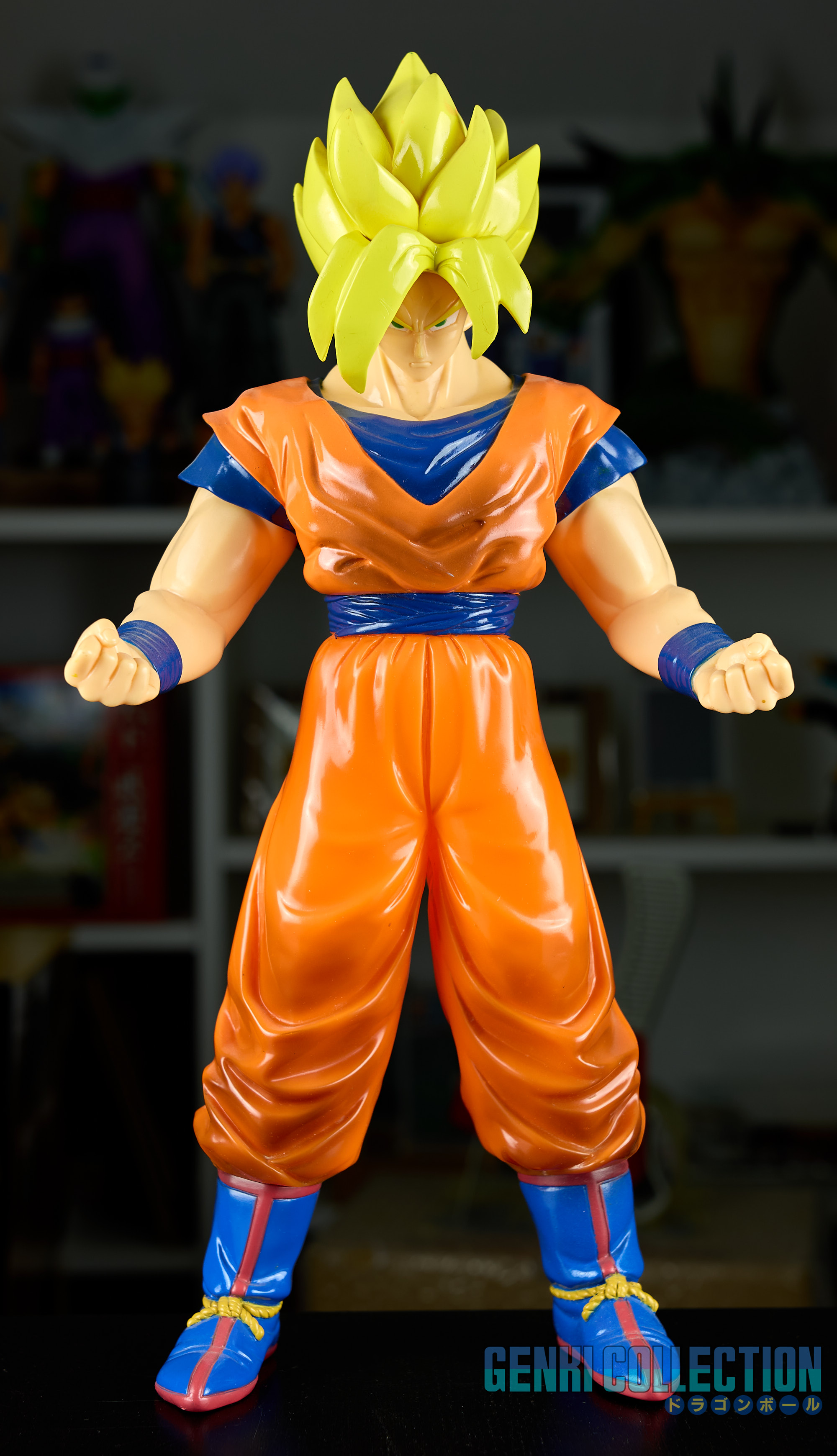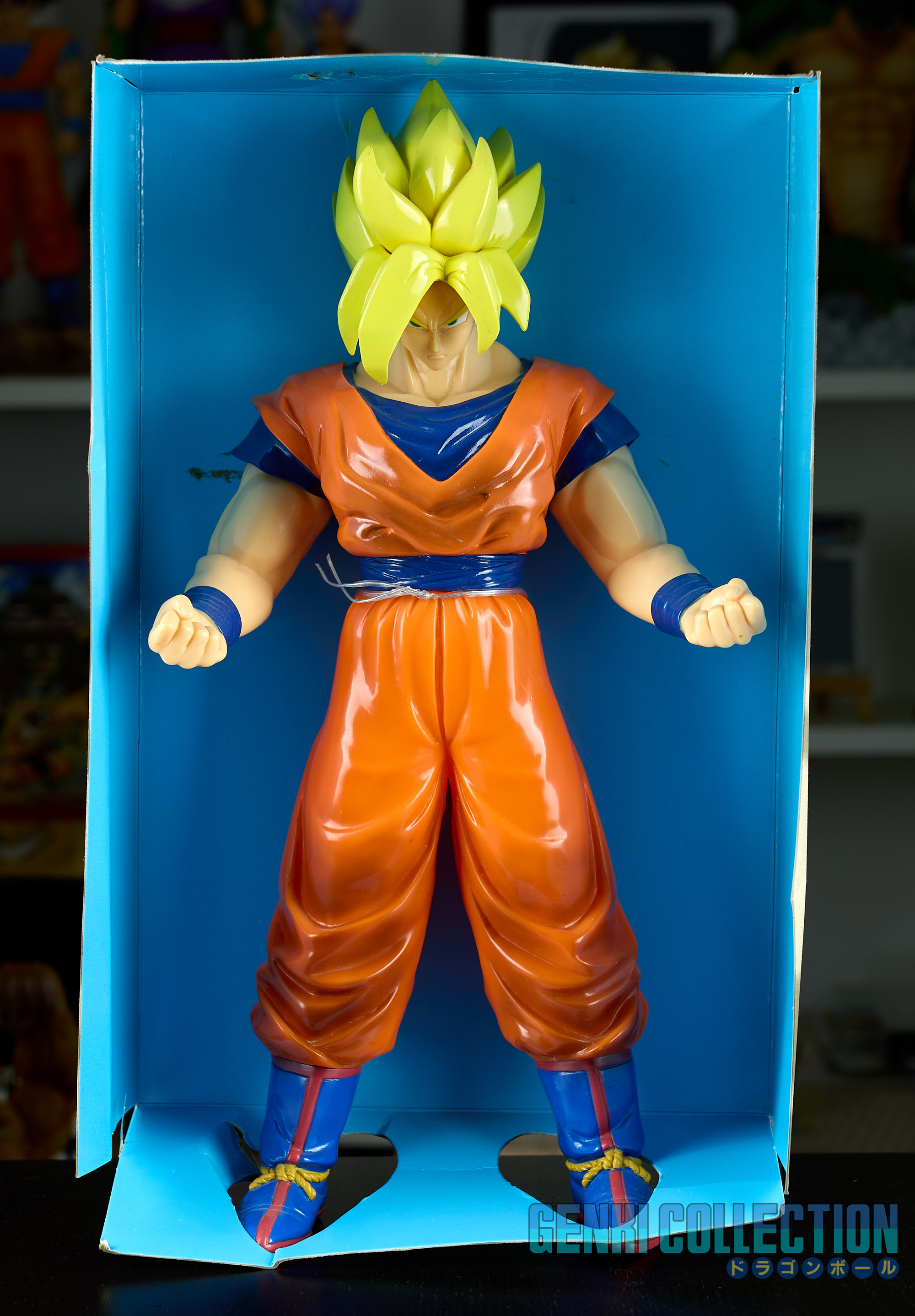 Figurine exceptionnelle de Son Goku Super Saiyan, The Best Of Dragon Ball Z, d'une hauteur de 40 cm, éditée en 1994 par Bandai, dans sa boîte d'origine. Figurine rare et difficile à trouver en boîte. Bon état général, la boîte présente quelques défauts (léger enfoncement de la face et usure sur les coins). Au dos se trouve un commentaire d'Akira Toriyama précisant qu'il a énormément apprécié la modélisation de ce modèle.