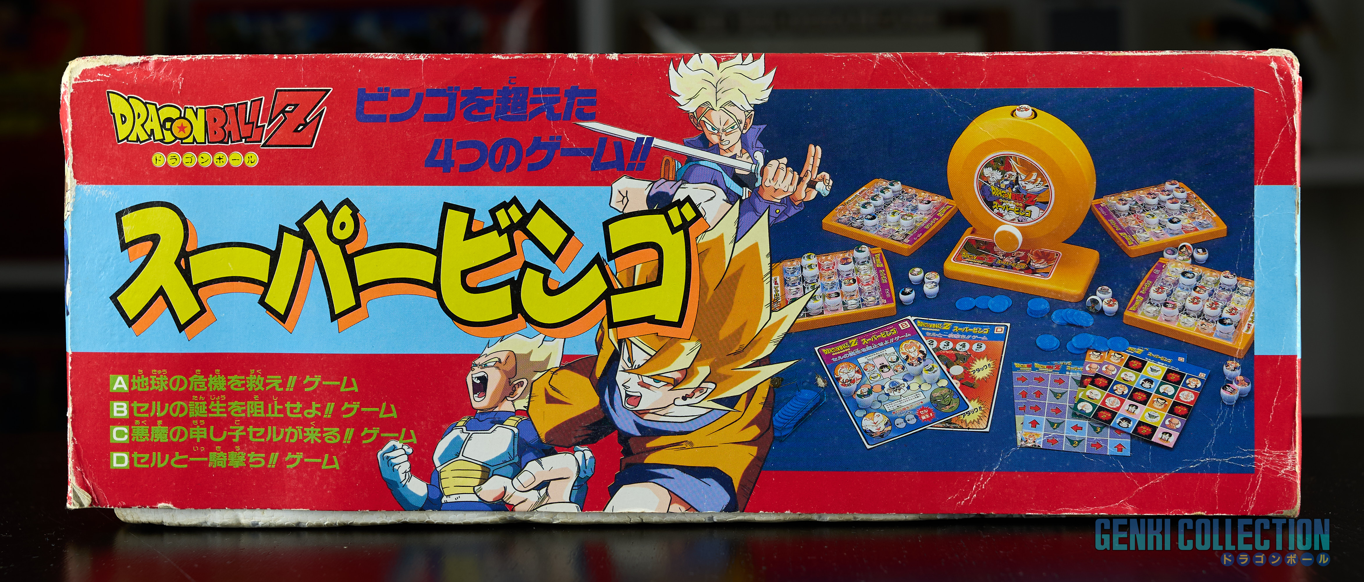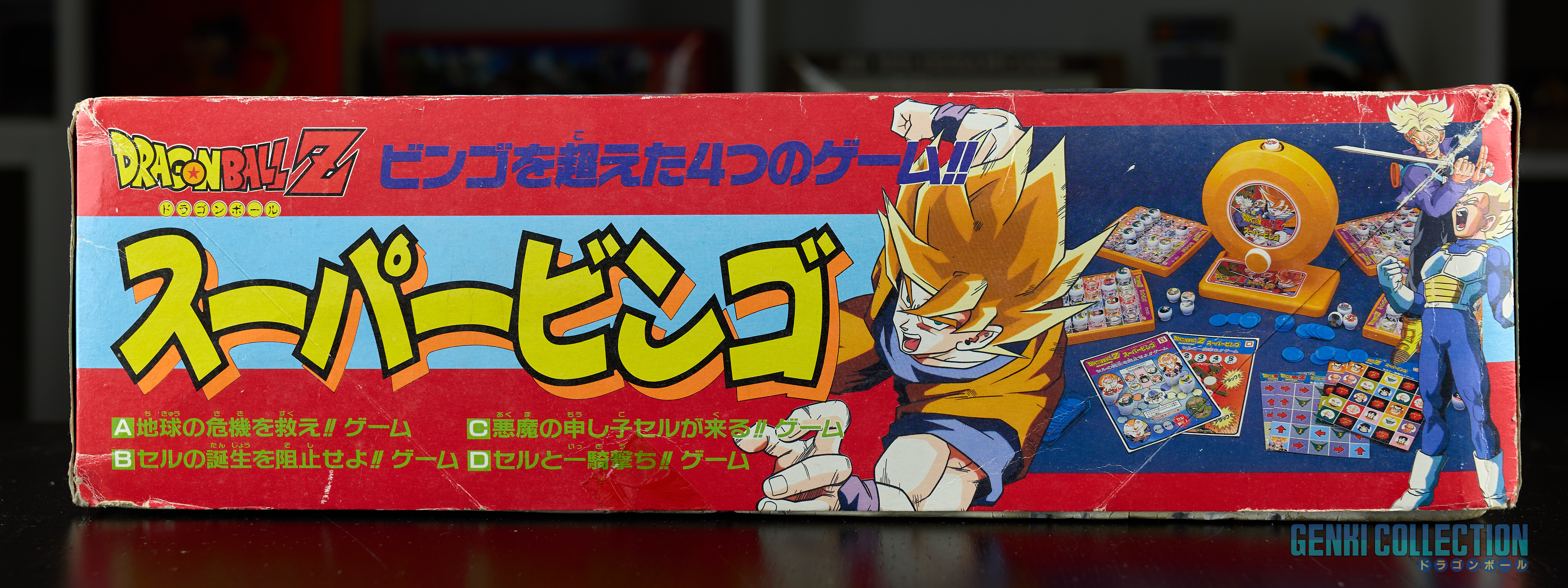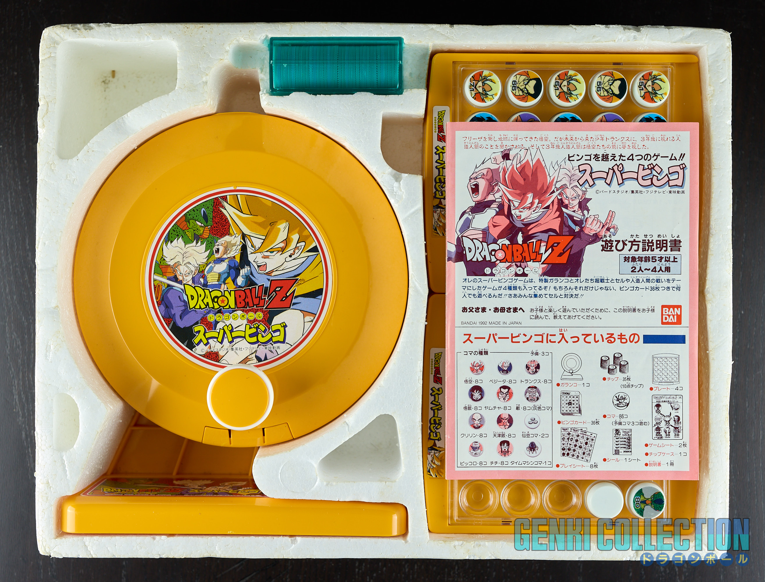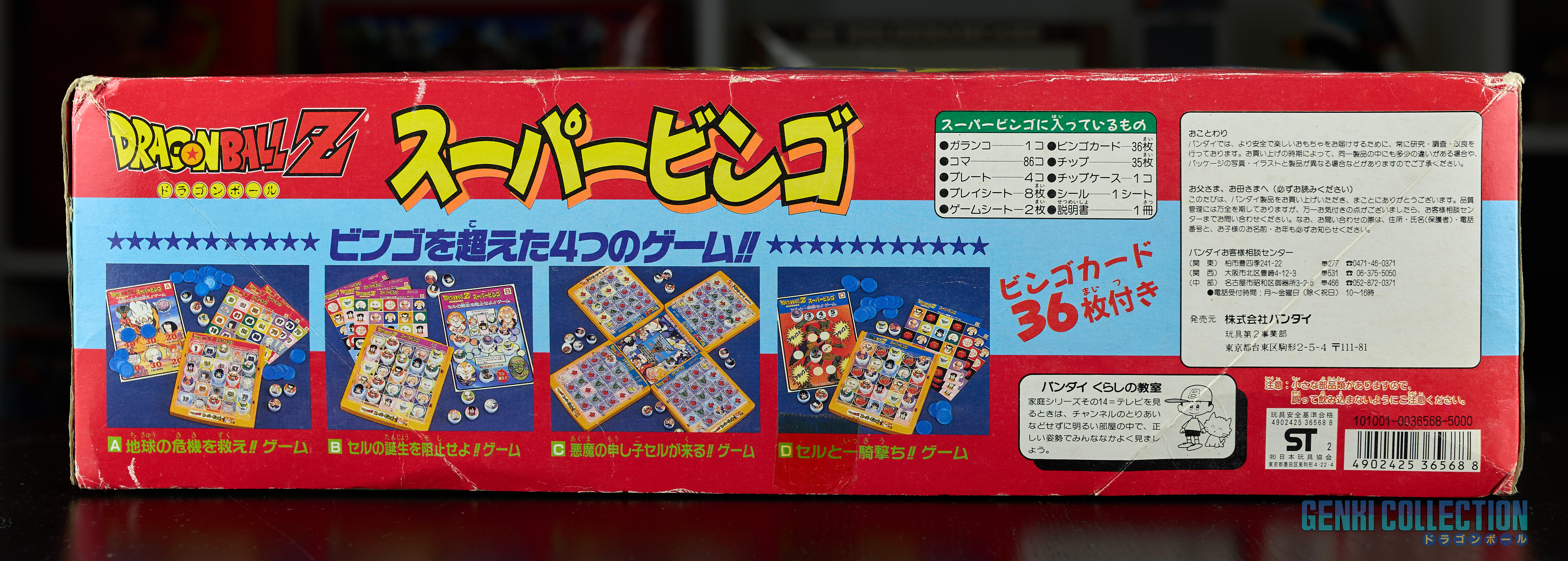 Jeu Super Bingo Dragon Ball Z de 1992 édité par Bandai. La boîte accuse un peu son âge avec de l'usure marquée sur les coins et arrêtes, ainsi que quelques plis, mais reste en état correct. Le polystyrène est en bon état et contient les éléments du jeu. La roulette est en parfait état, tourne de manière fluide et s'ouvre pour recevoir les pions-numéros. Il manque par ailleurs un pion, le numéro 25, remplaçable par un pion blanc (qui sont au nombre de 3). Il manque également des planches à Bingo, il y en a 12 sur 36. Pour le reste, les 4 plateaux de jeu sont présents, prêts à recevoir les pions ou à être personnalisées avec un set de 8 planches recto-verso, il y également 2 autres grandes planches recto-verso, ainsi que la notice et la registered card. Malgré les quelques éléments manquant, le jeu est tout à fait jouable.