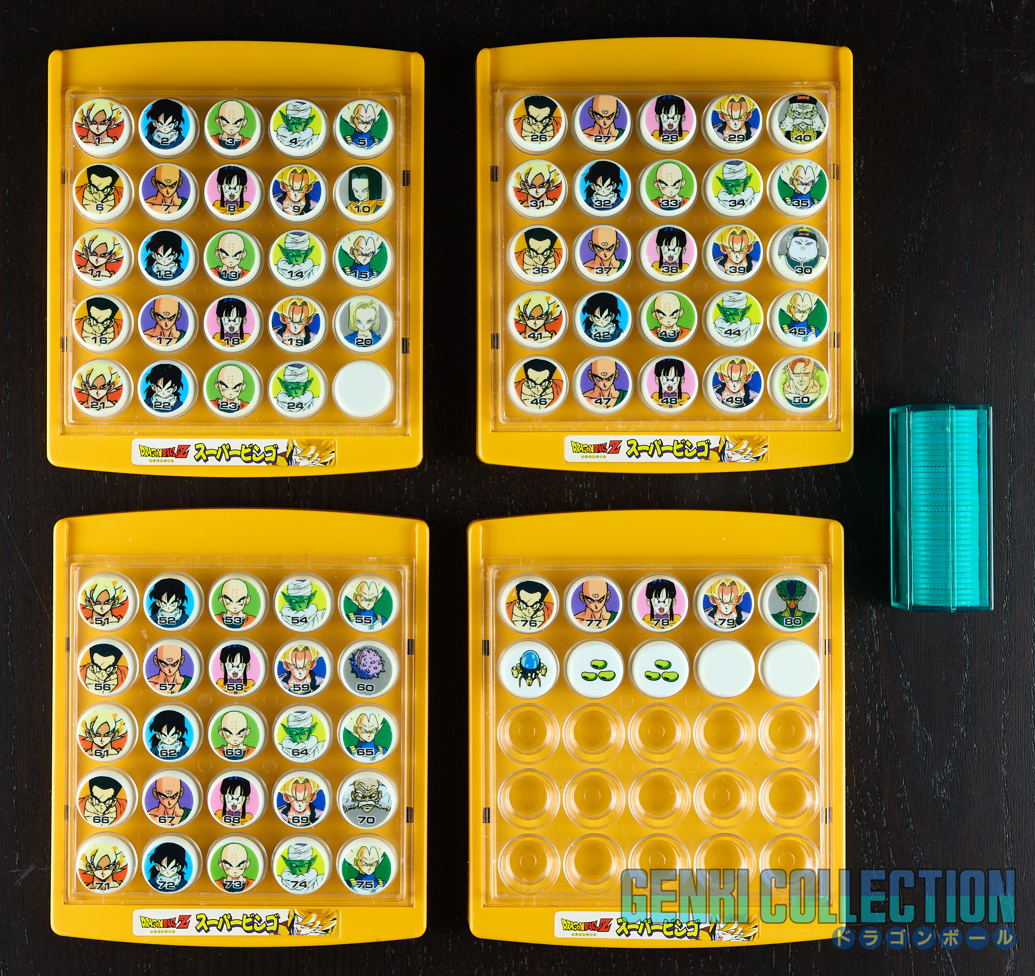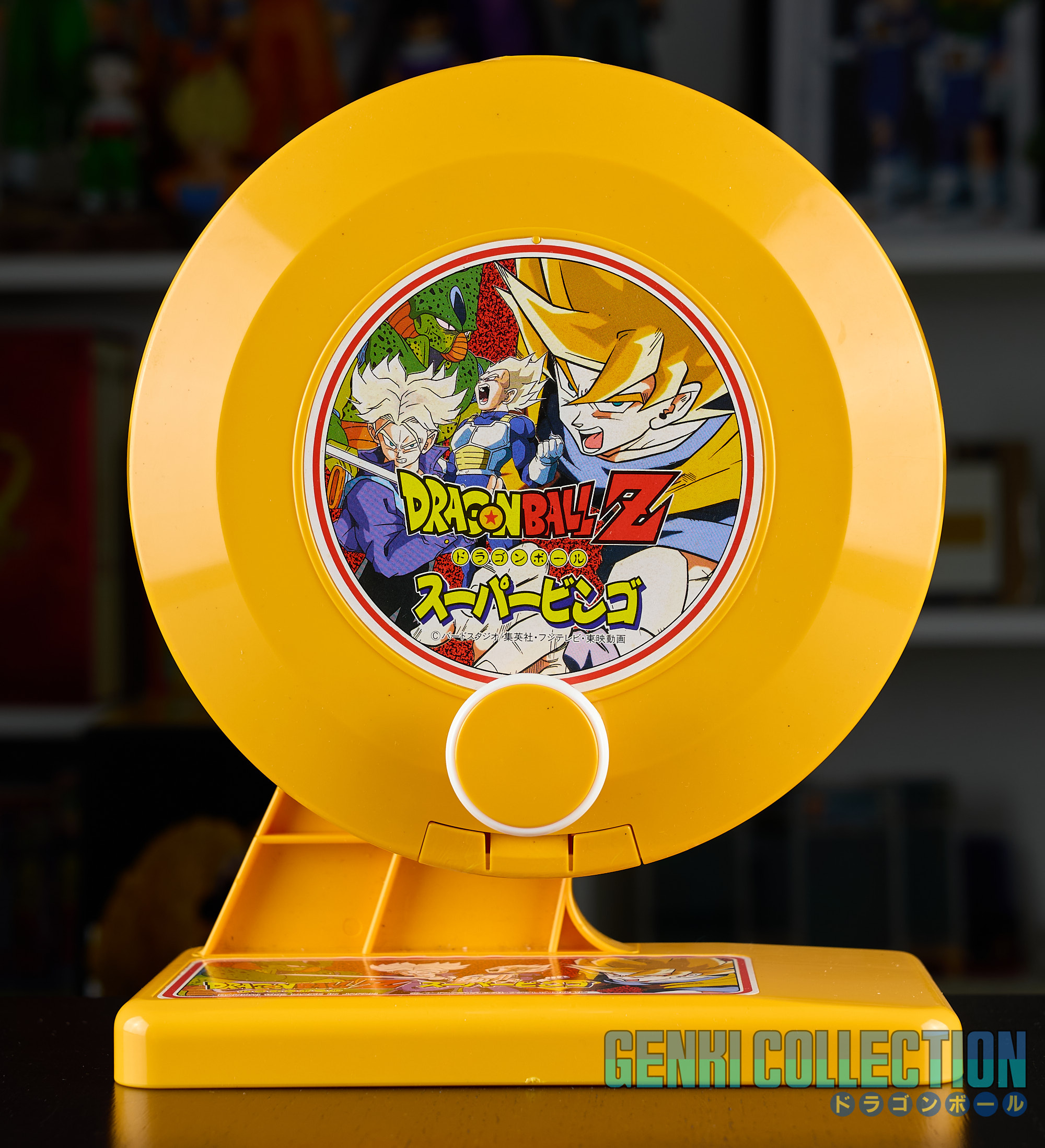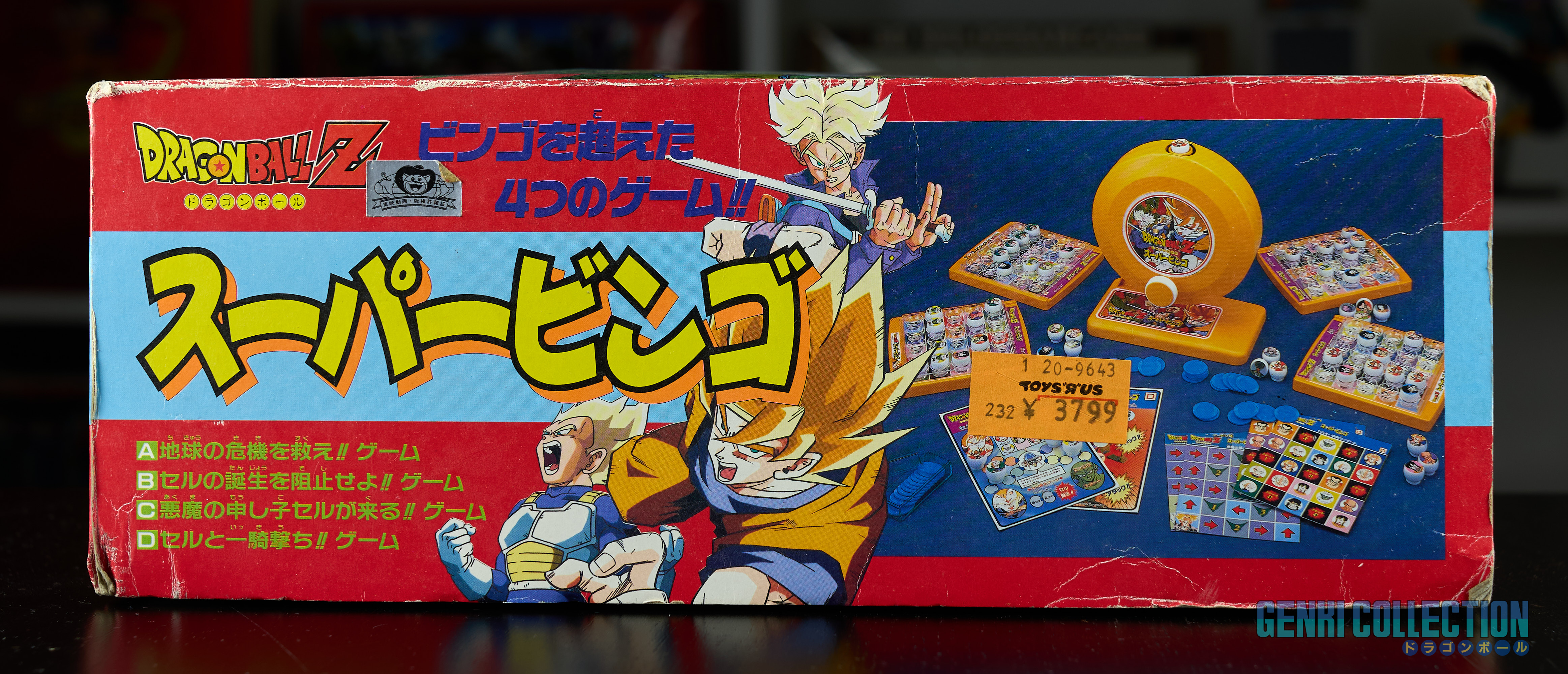 Jeu Super Bingo Dragon Ball Z de 1992 édité par Bandai. La boîte accuse un peu son âge avec de l'usure marquée sur les coins et arrêtes, ainsi que quelques plis, mais reste en état correct. Le polystyrène est en bon état et contient les éléments du jeu. La roulette est en parfait état, tourne de manière fluide et s'ouvre pour recevoir les pions-numéros. Il manque par ailleurs un pion, le numéro 25, remplaçable par un pion blanc (qui sont au nombre de 3). Il manque également des planches à Bingo, il y en a 12 sur 36. Pour le reste, les 4 plateaux de jeu sont présents, prêts à recevoir les pions ou à être personnalisées avec un set de 8 planches recto-verso, il y également 2 autres grandes planches recto-verso, ainsi que la notice et la registered card. Malgré les quelques éléments manquant, le jeu est tout à fait jouable.