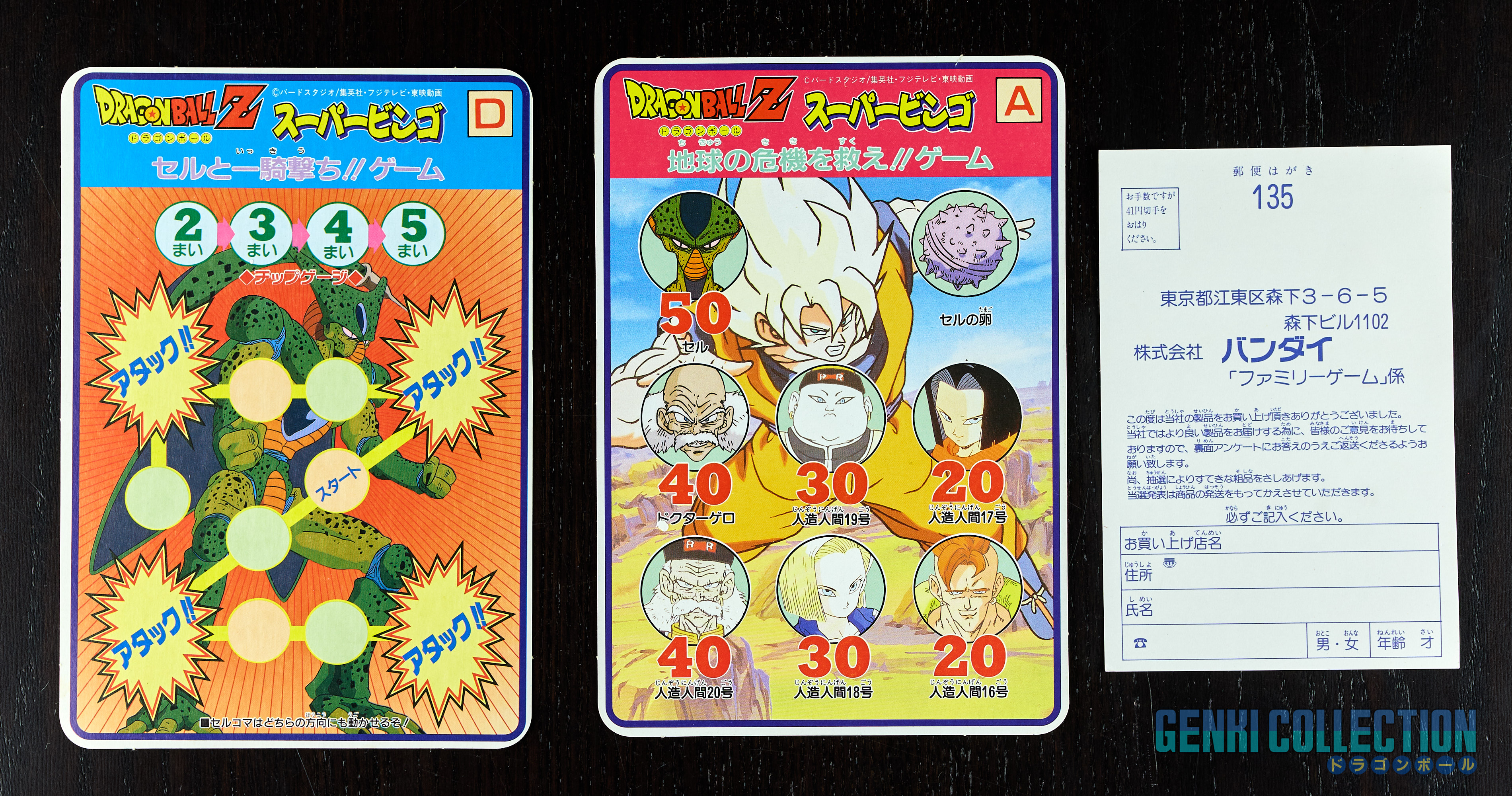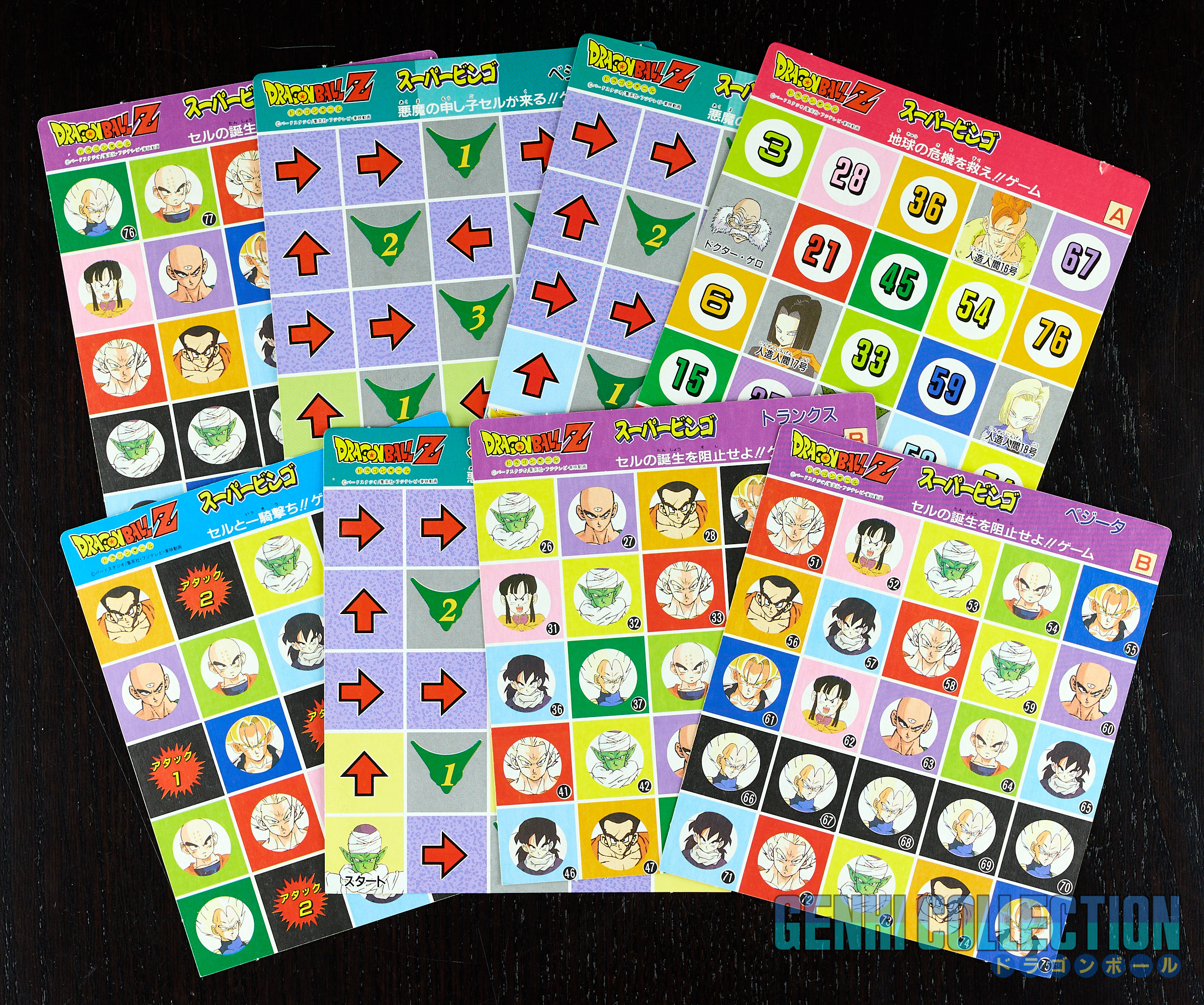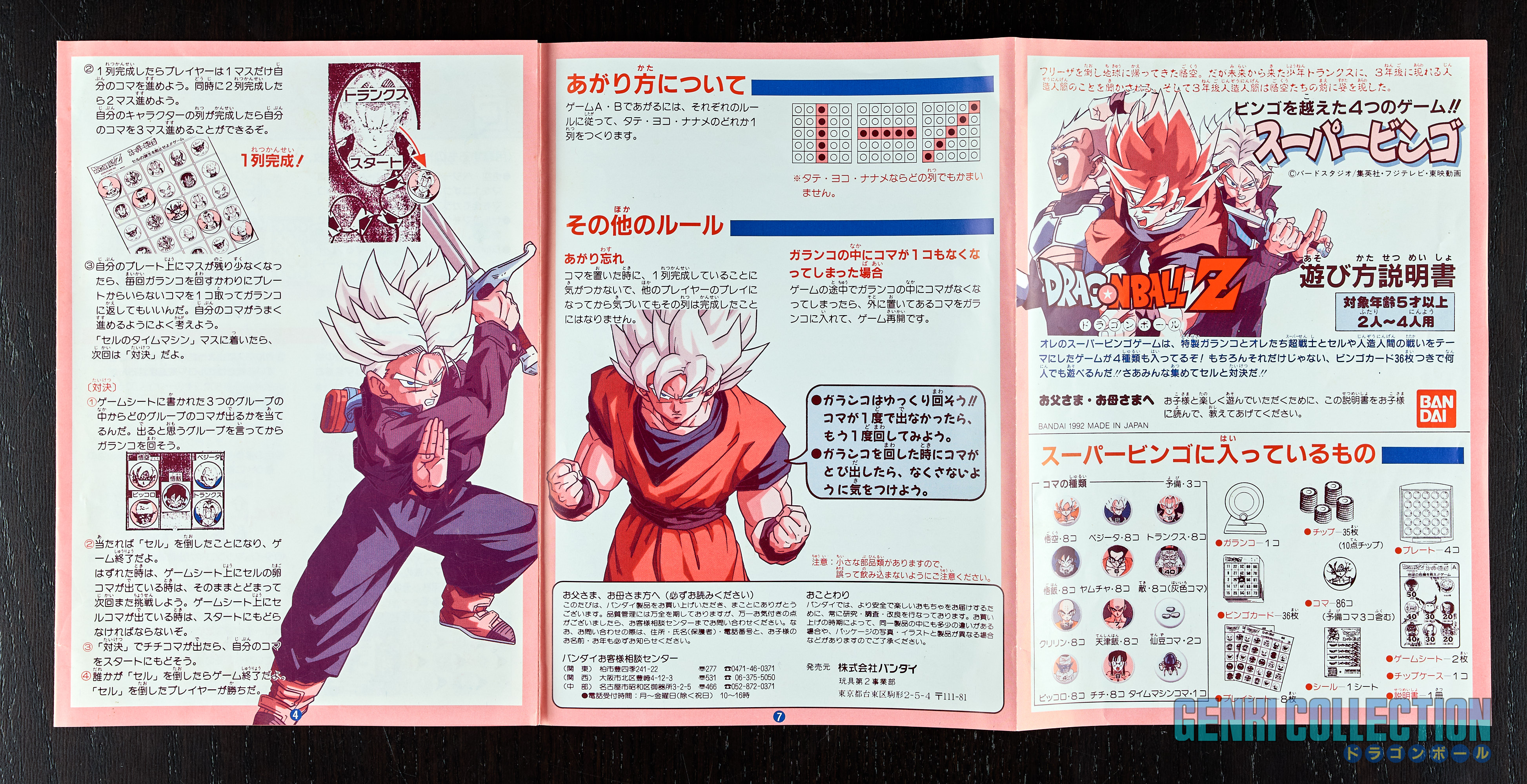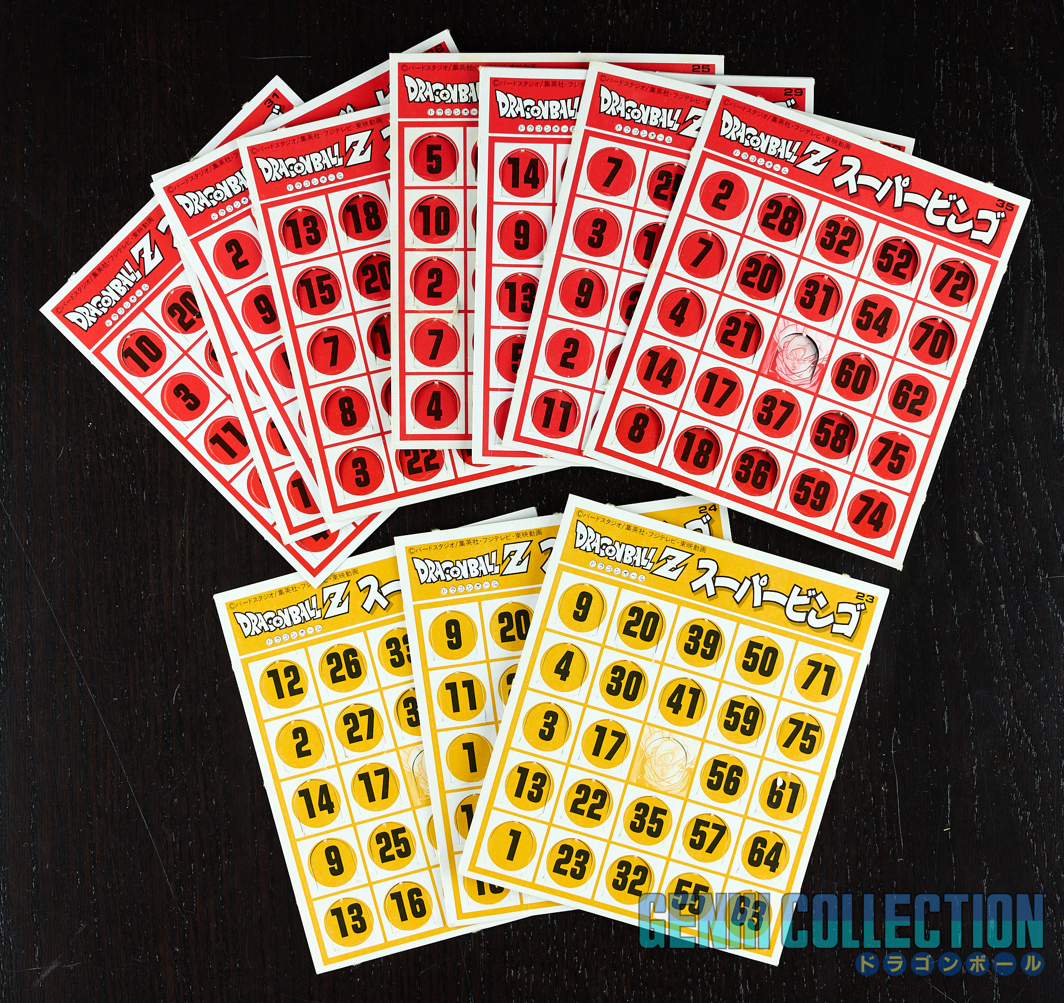Jeu Super Bingo Dragon Ball Z de 1992 édité par Bandai. La boîte accuse un peu son âge avec de l'usure marquée sur les coins et arrêtes, ainsi que quelques plis, mais reste en état correct. Le polystyrène est en bon état et contient les éléments du jeu. La roulette est en parfait état, tourne de manière fluide et s'ouvre pour recevoir les pions-numéros. Il manque par ailleurs un pion, le numéro 25, remplaçable par un pion blanc (qui sont au nombre de 3). Il manque également des planches à Bingo, il y en a 12 sur 36. Pour le reste, les 4 plateaux de jeu sont présents, prêts à recevoir les pions ou à être personnalisées avec un set de 8 planches recto-verso, il y également 2 autres grandes planches recto-verso, ainsi que la notice et la registered card. Malgré les quelques éléments manquant, le jeu est tout à fait jouable.