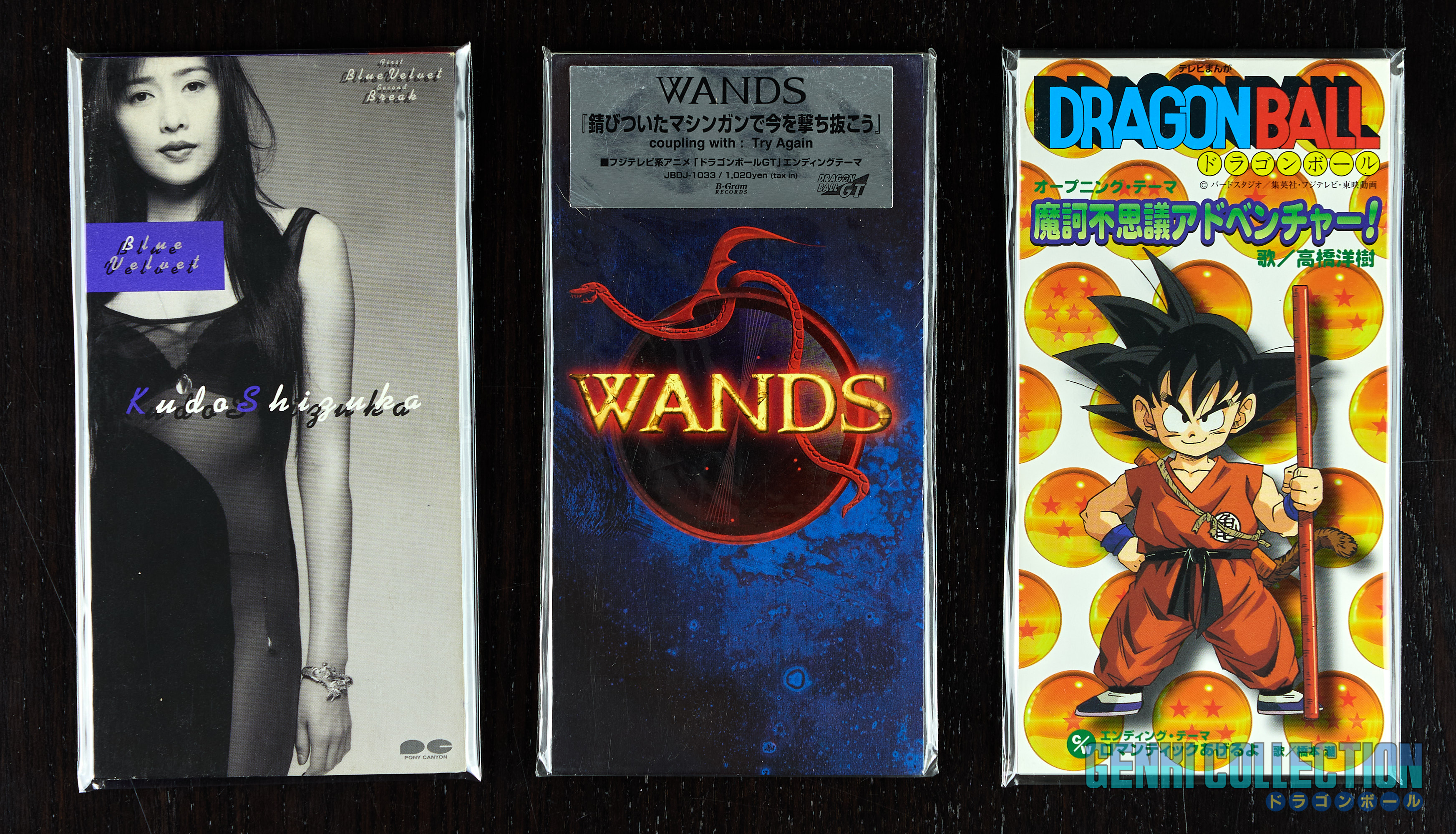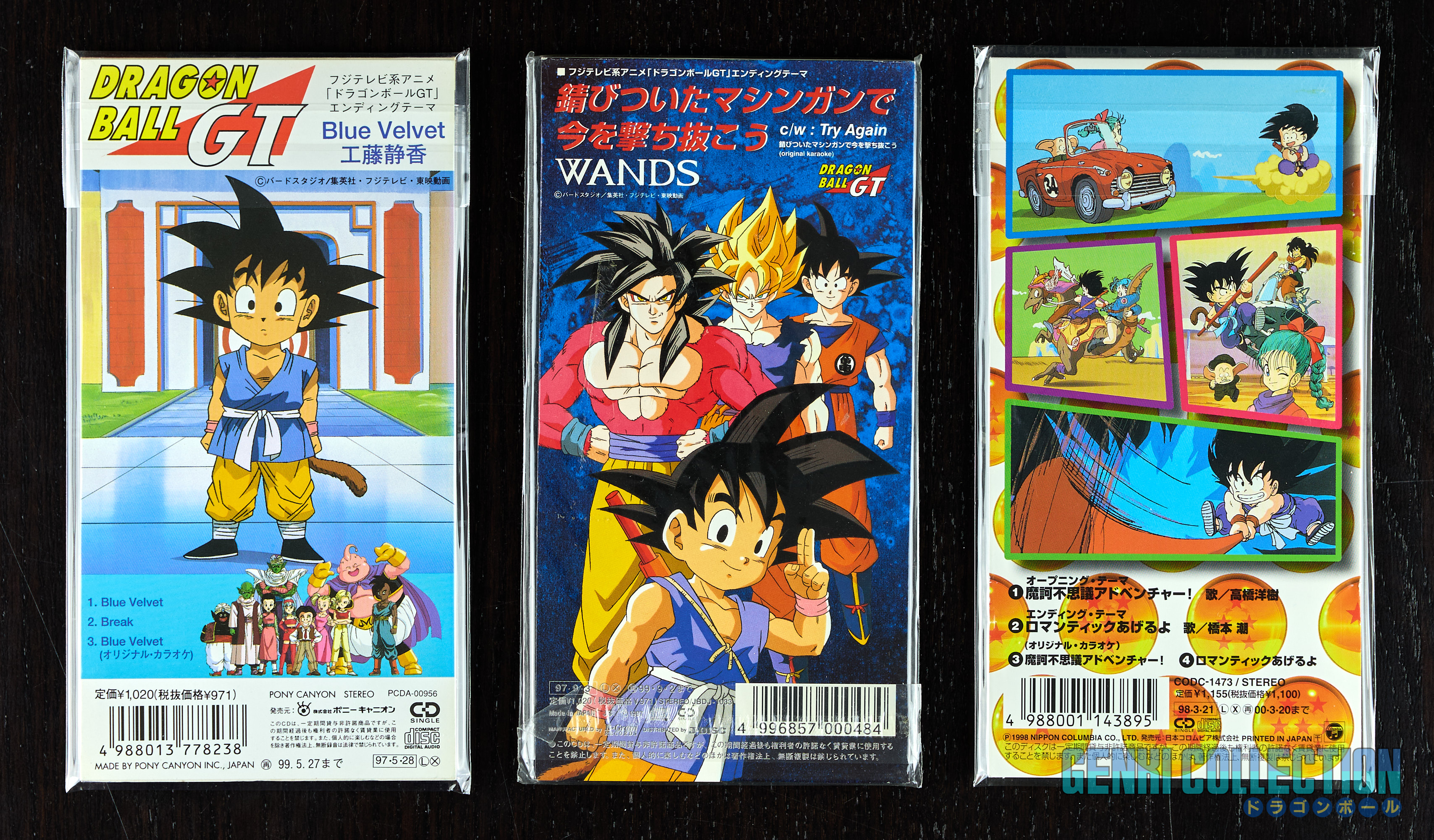 Lot très rare de 12 CD Singles Dragon Ball, Z et GT dans un format rectangulaire atypique contenant un mini CD. Tous sont en excellent état, dont voici le détail :