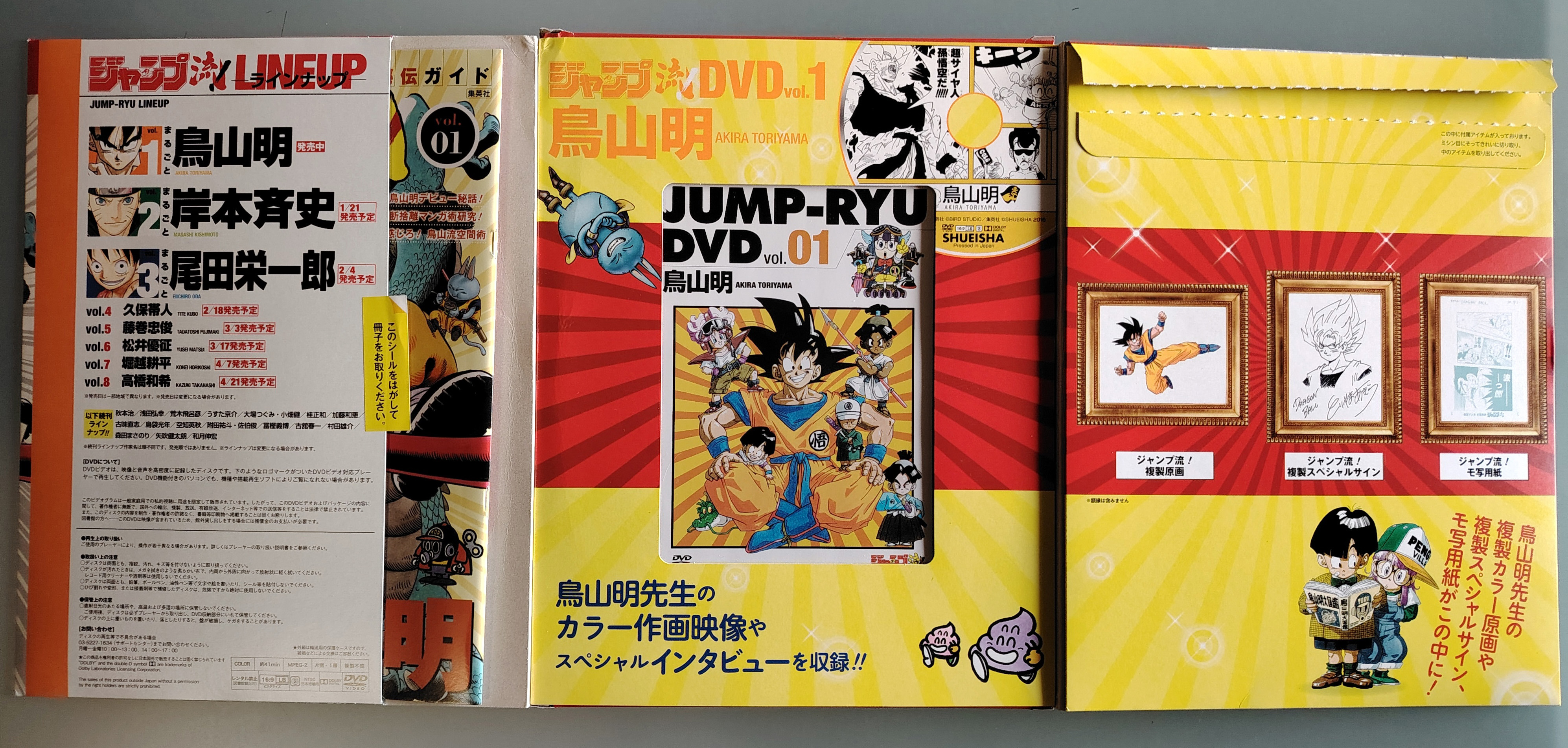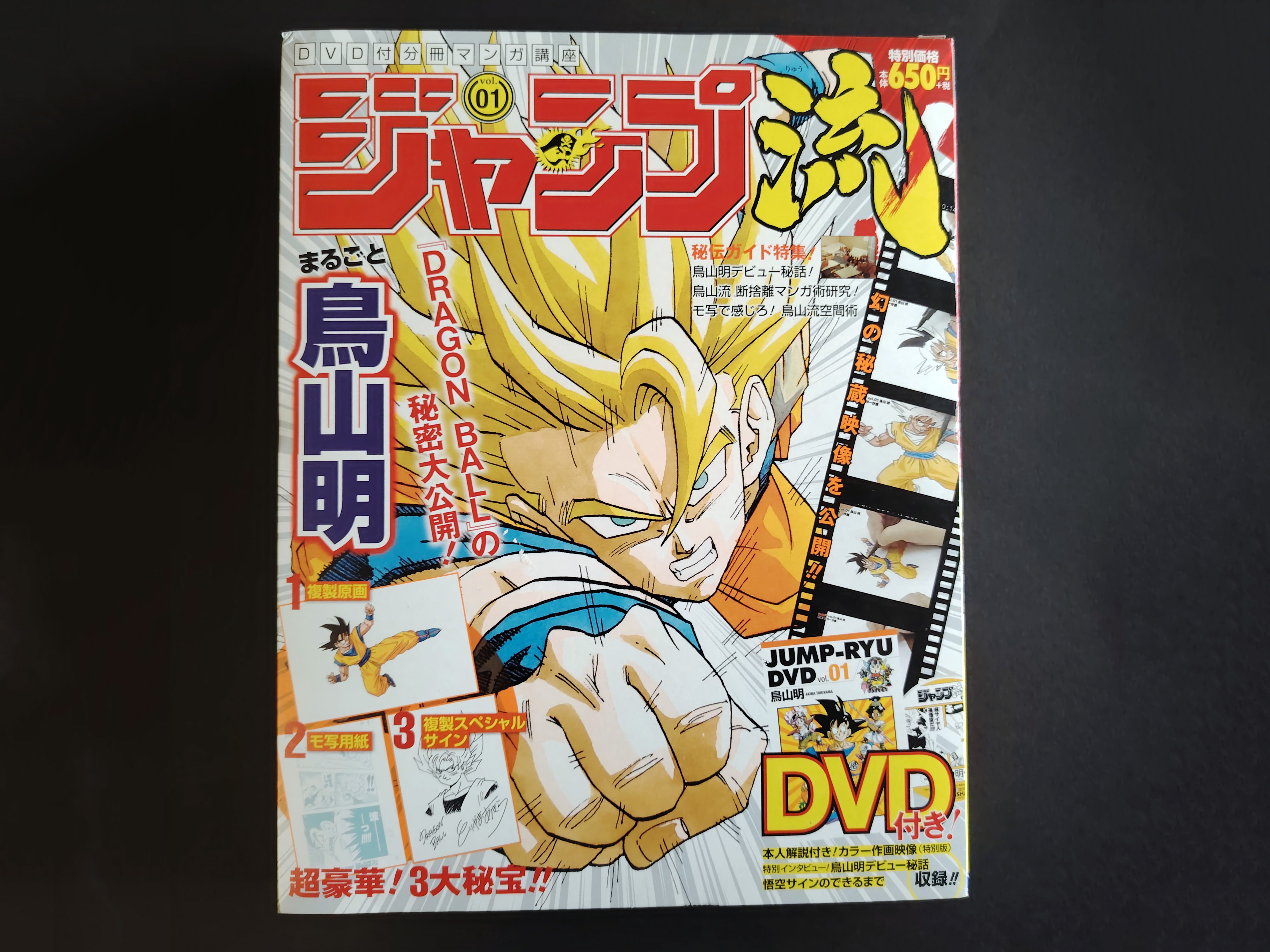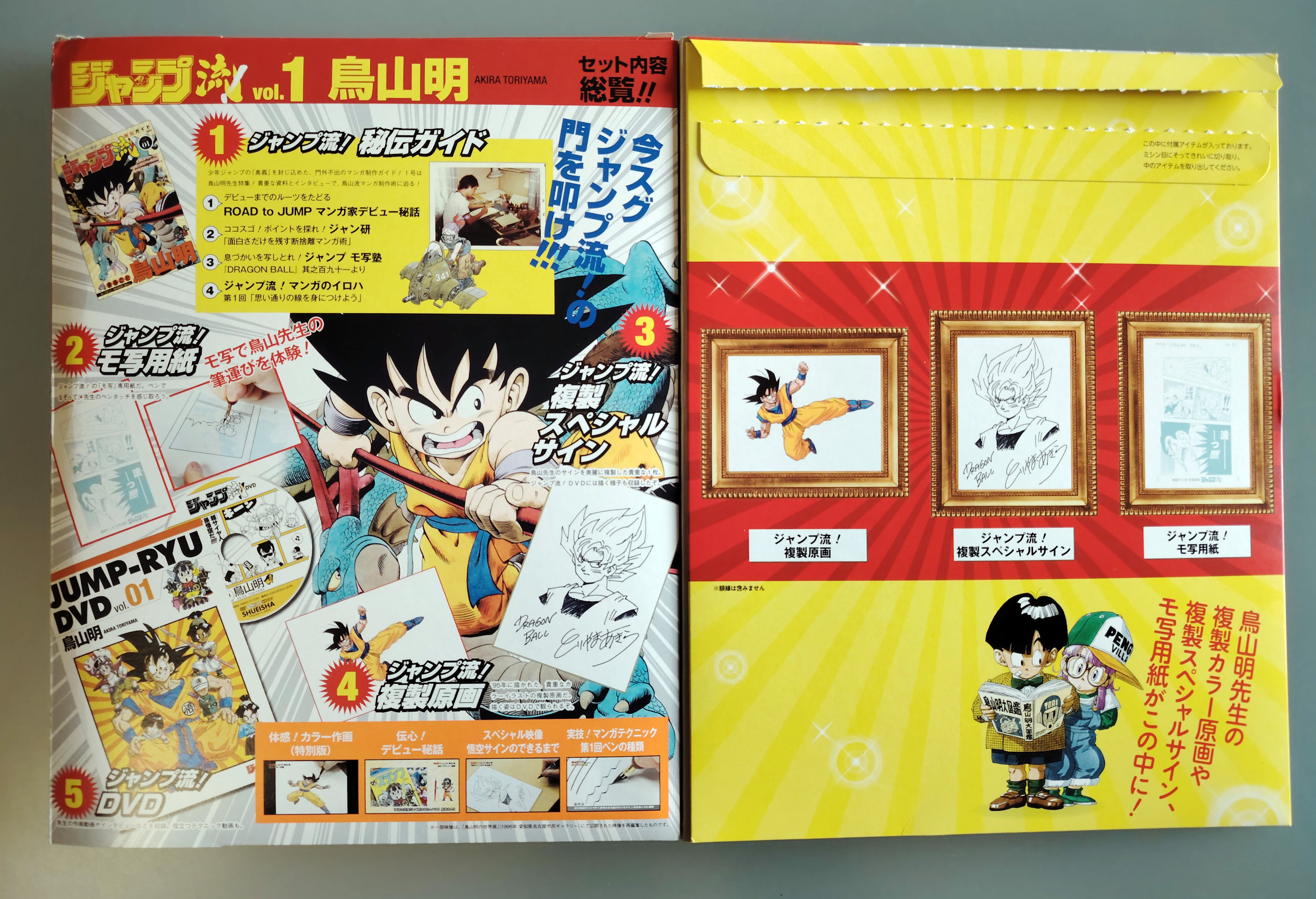 Dragon Ball Akira Toriyama Jump Ryu N° 1. Coffret cartonné contenant un magazine, un DVD, une illustration couleur, un dessin dédicacé et une reproduction de planche originale. Sorti en 2016 par la Shueisha.