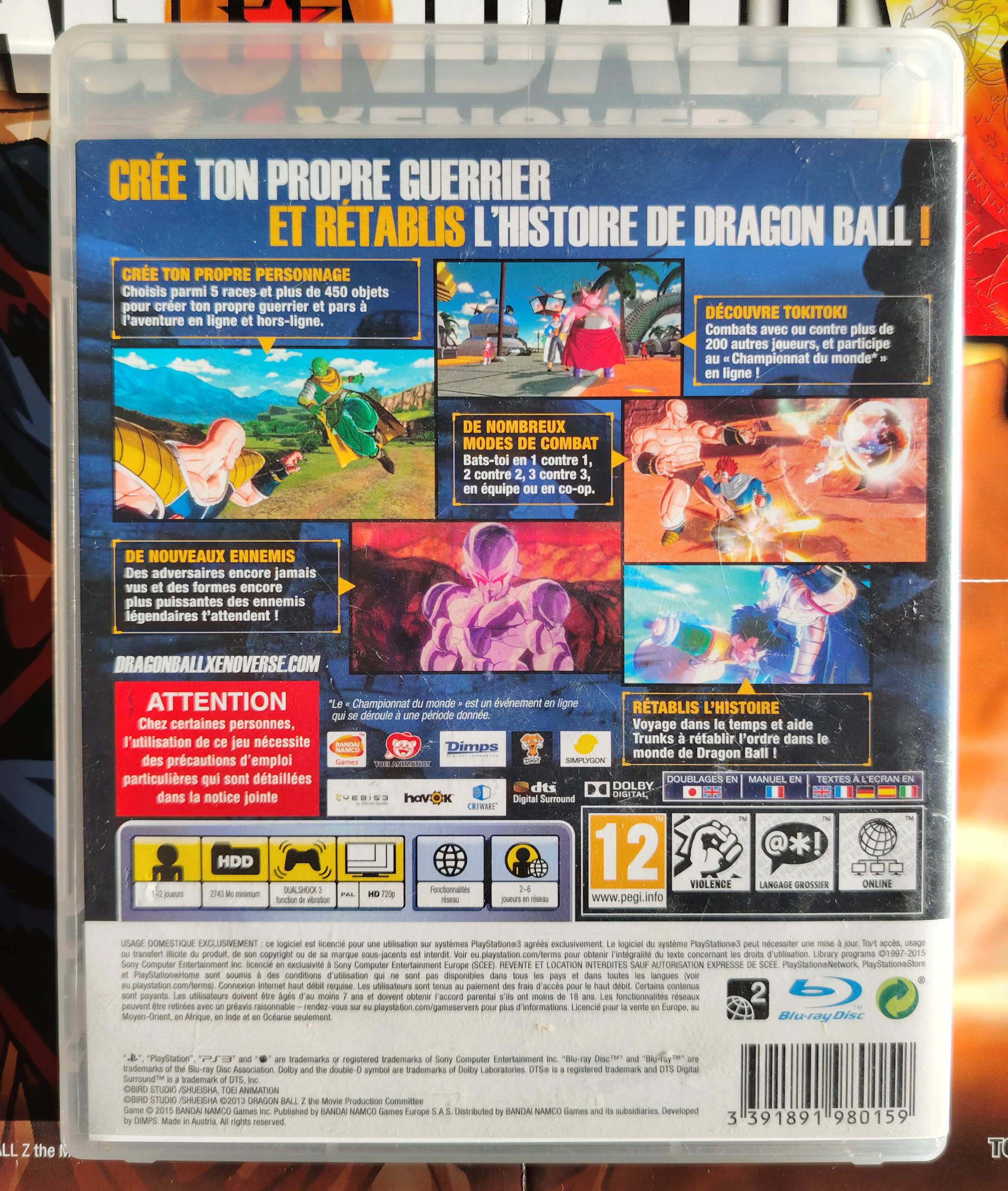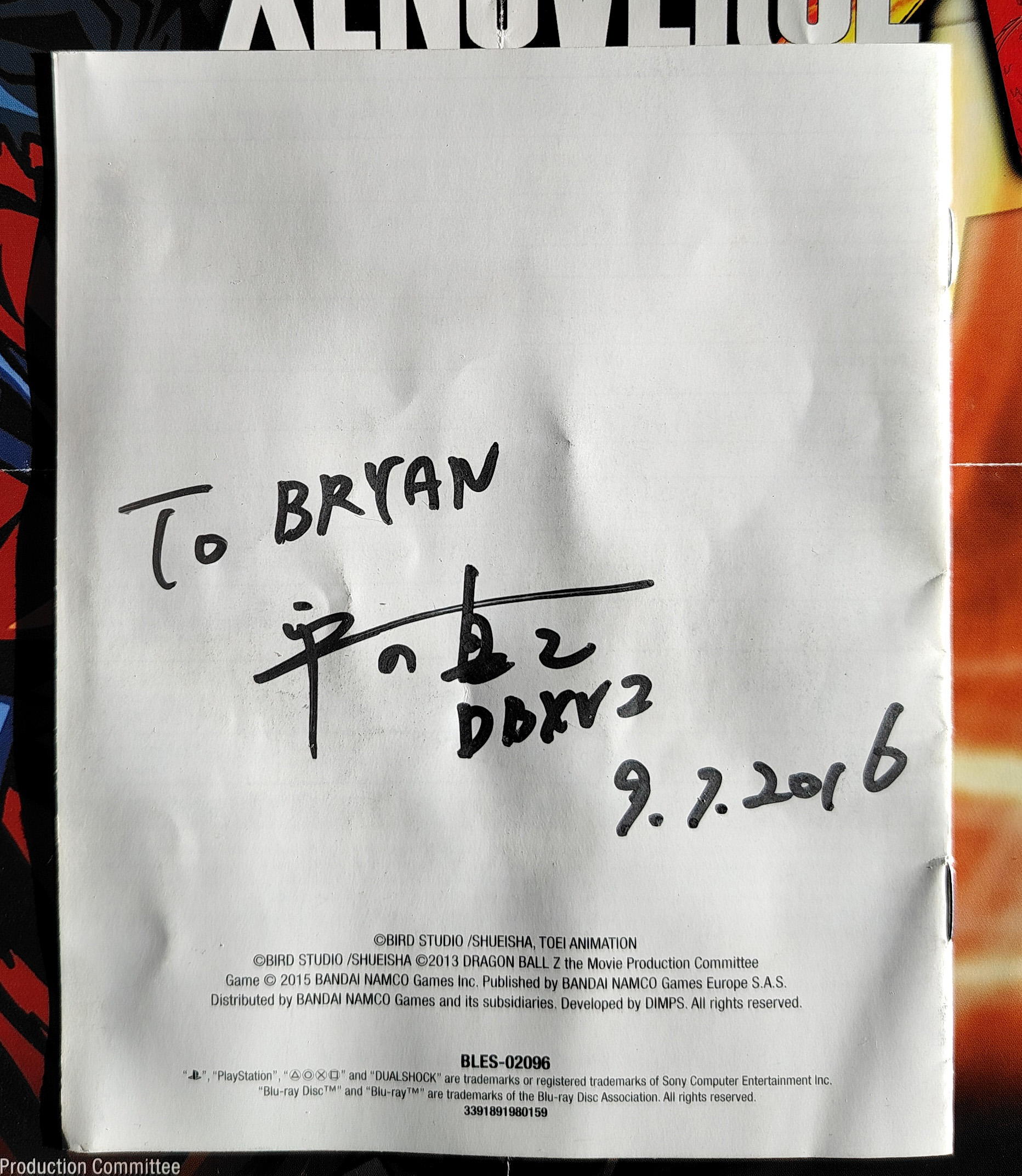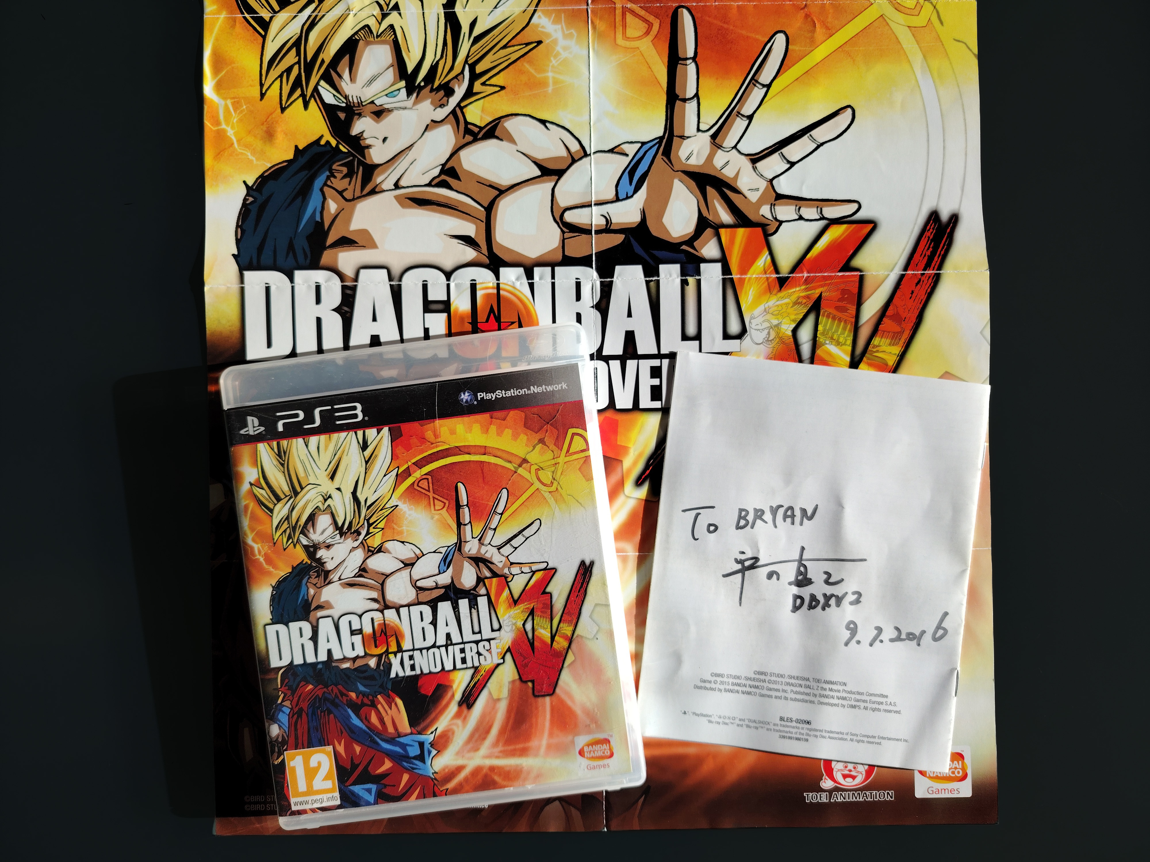 Jeu vidéo Dragon Ball Xenoverse sur PS3 (2015) signé sur la notice par son producteur Hirano Masayuki lors de notre rencontre à la Japan Expo le 9 juillet 2016. Le lot comprend également le steelbook du jeu (abîmé avec des zones enfoncées) + le poster du jeu.