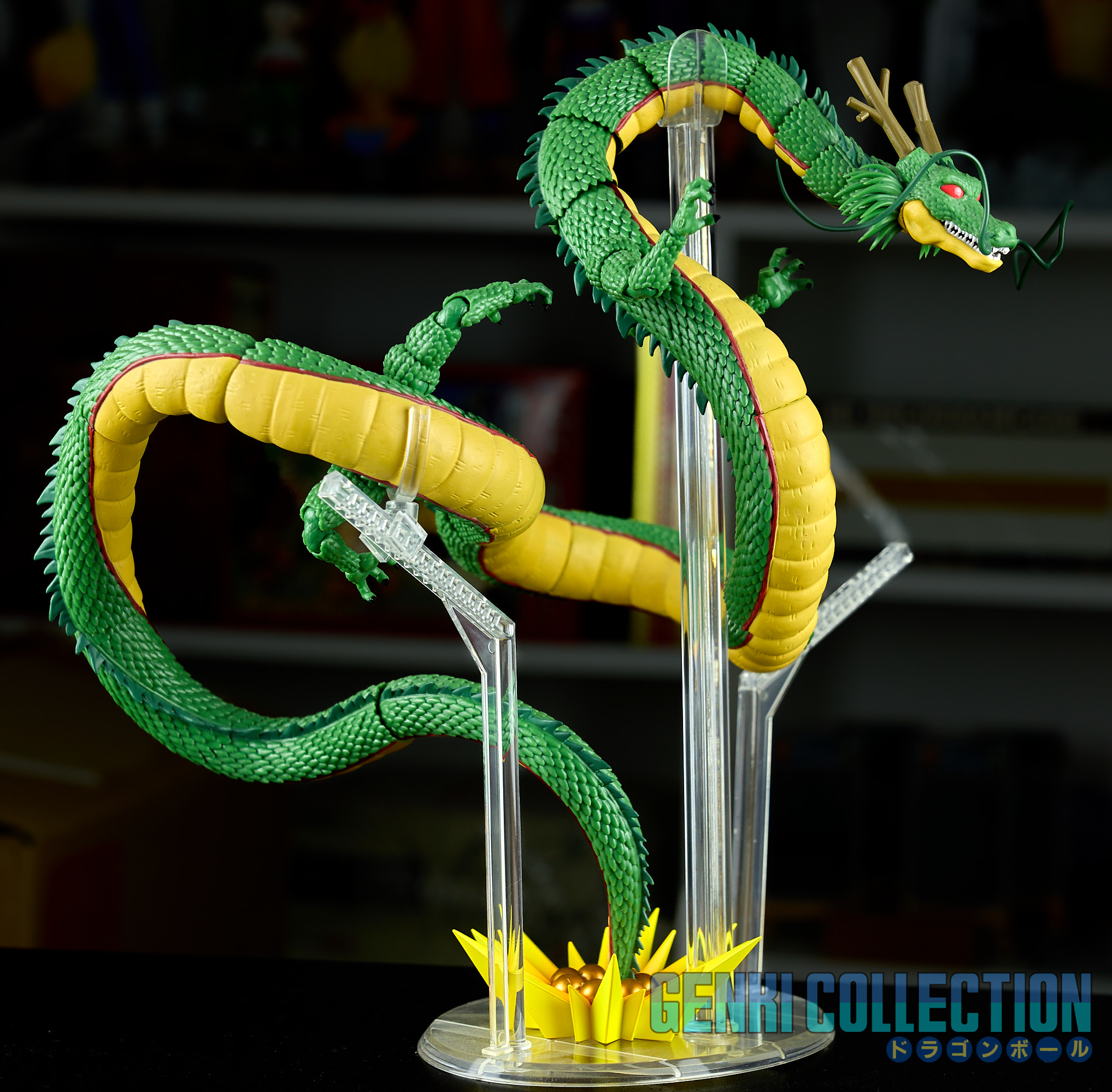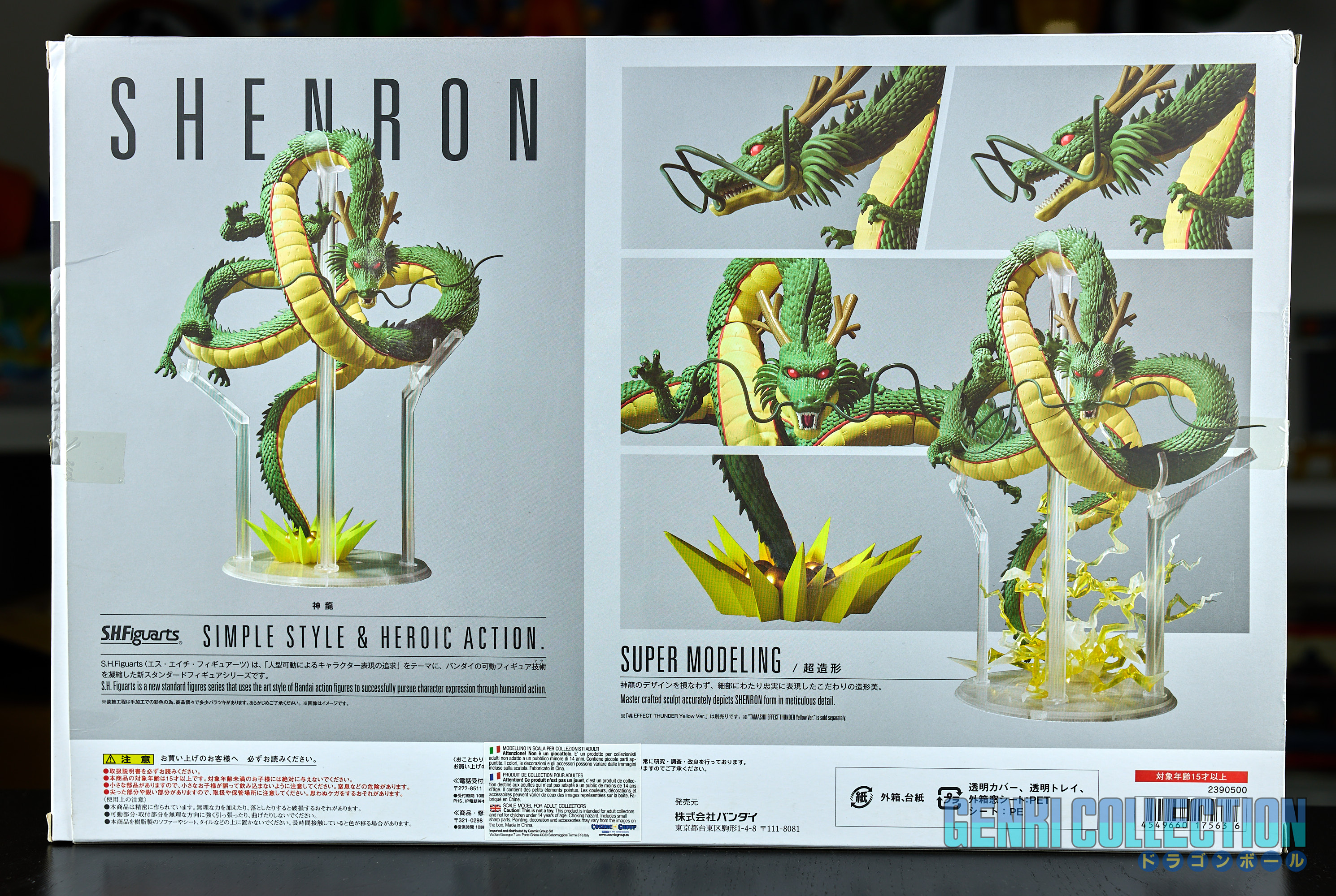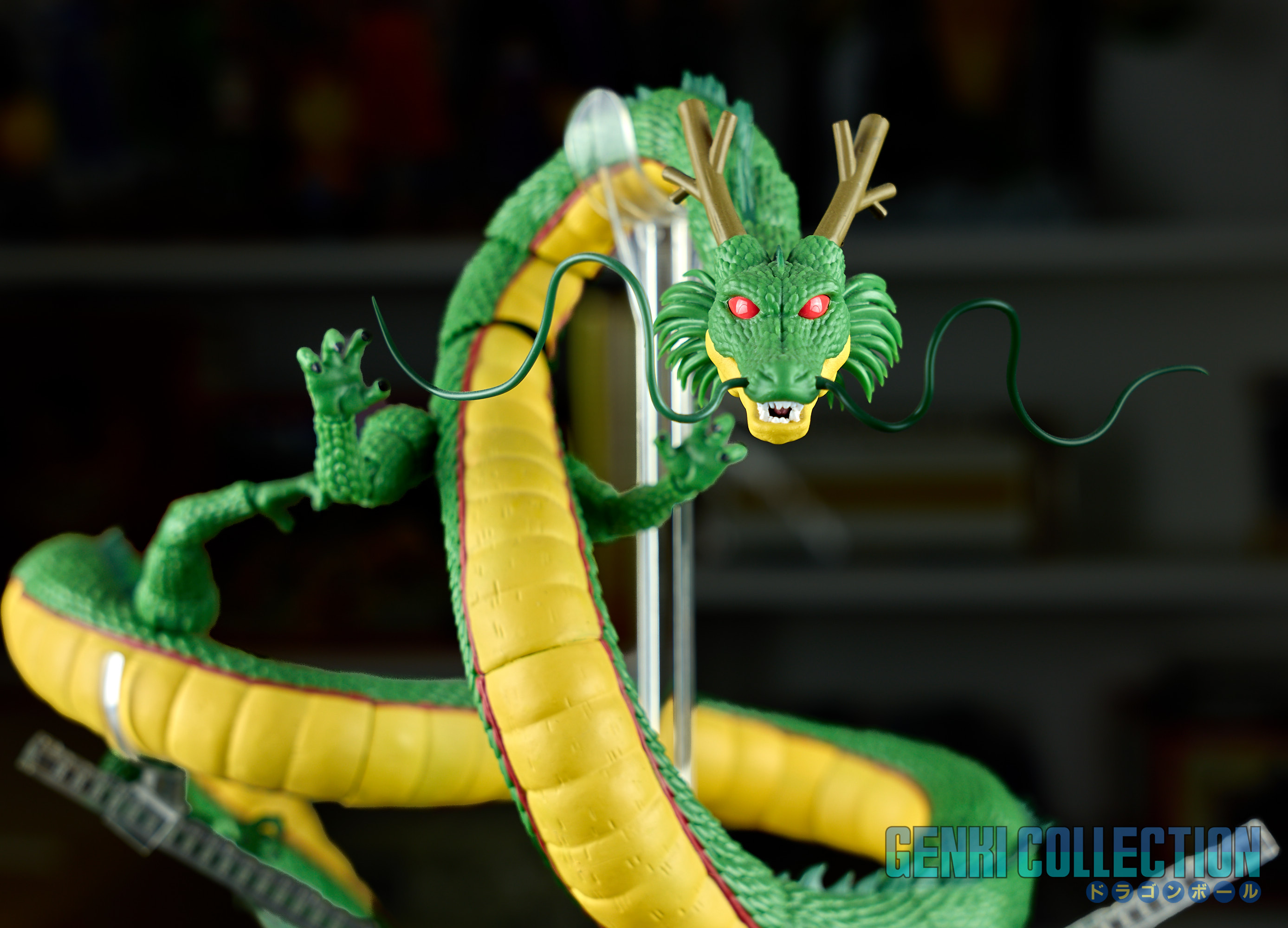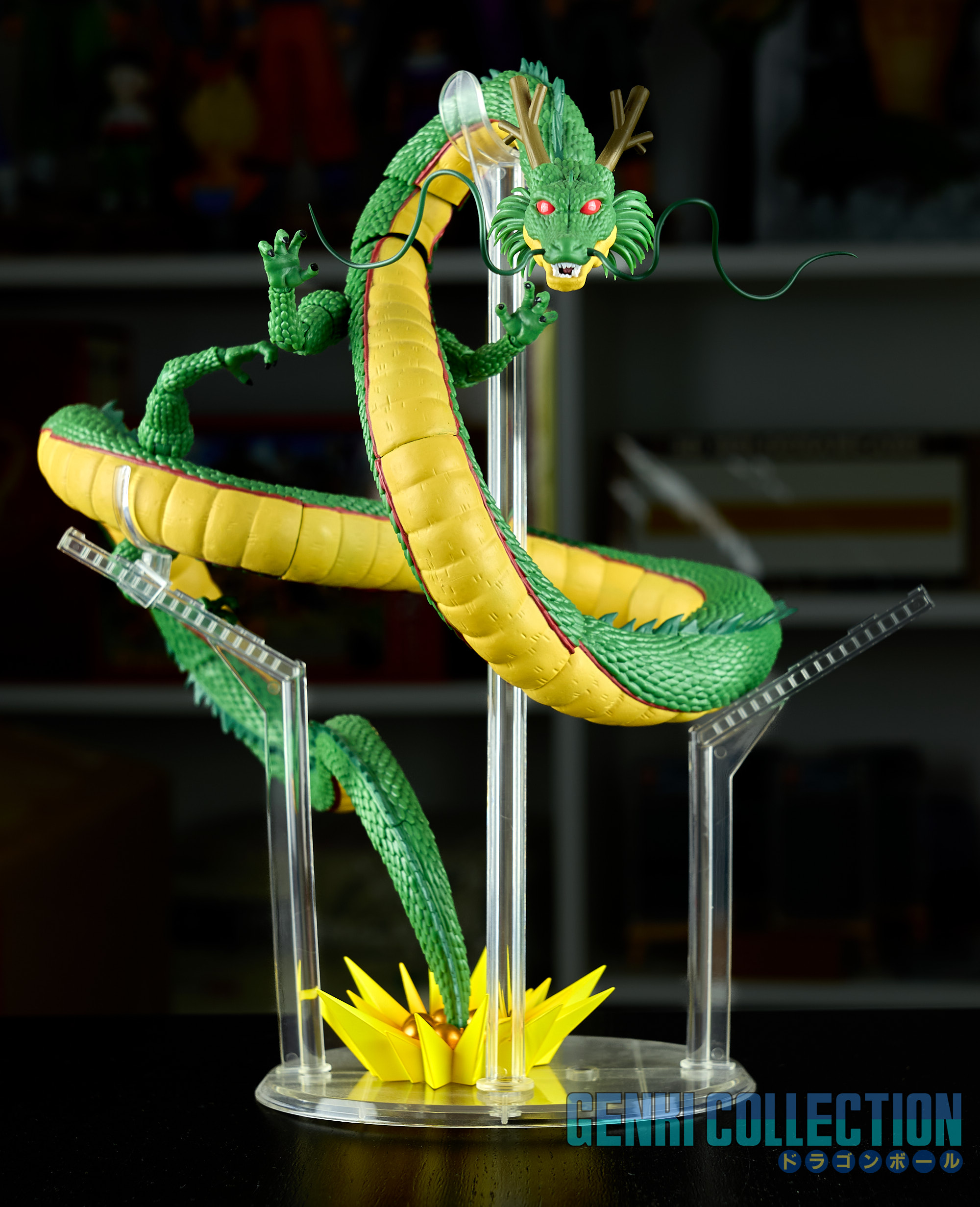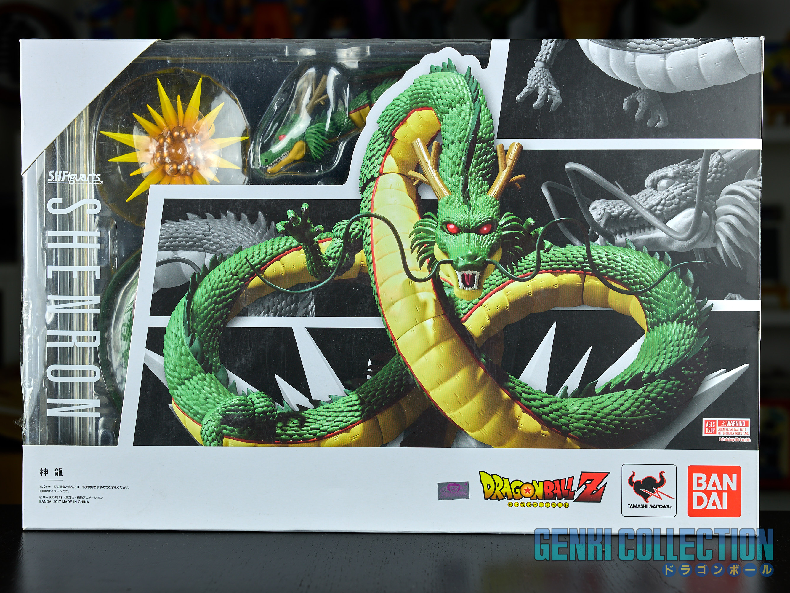Figurine articulée en boîte S.H. Figuarts de Shenron, sortie en 2017. Un petit élément de support en plastique est cassé, mais cela n'empêche pas Shenron de tenir sans (voir photos). Il devrait être également possible de refaire cette petite pièce en impression 3D. La boîte est légèrement abîmée.