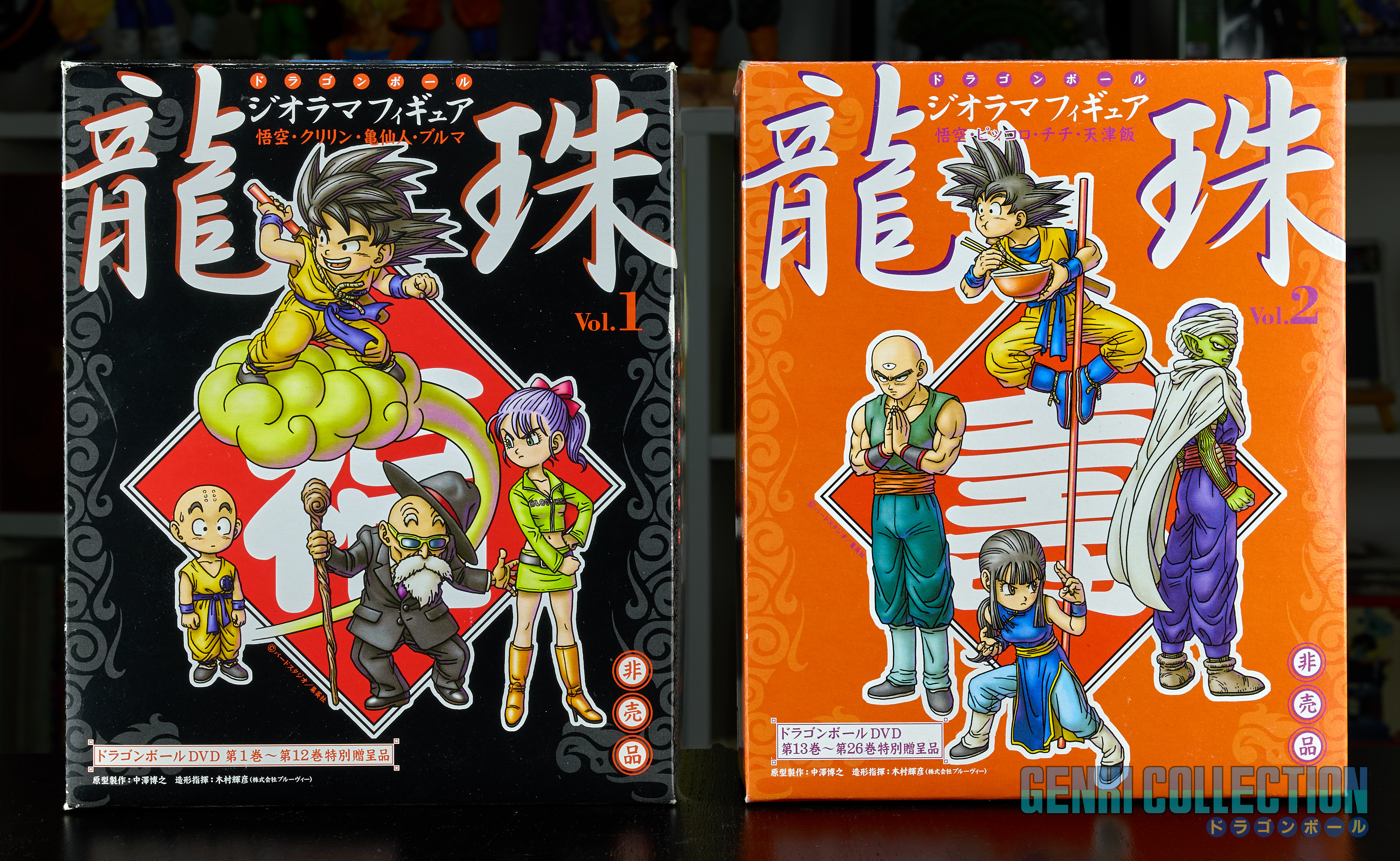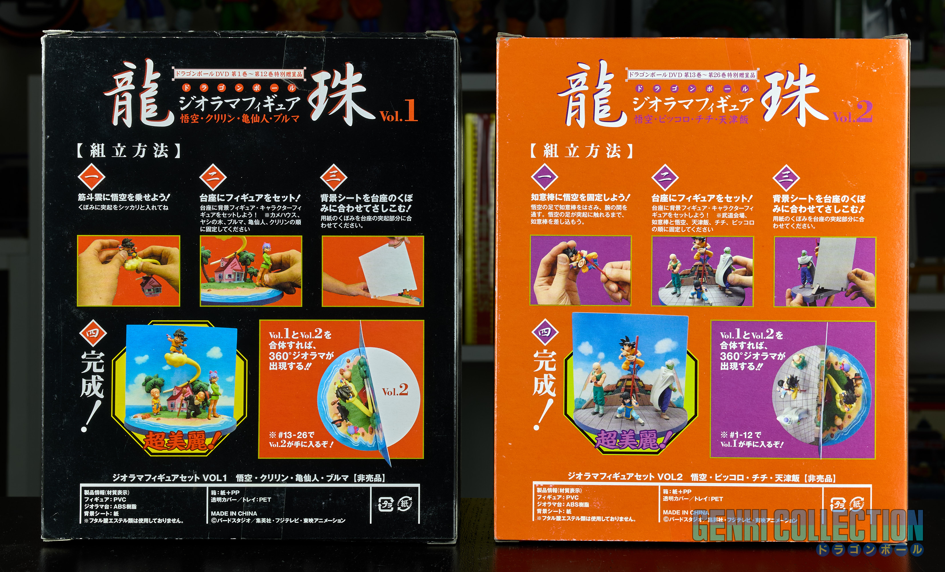 The DBZ dioramas are in excellent condition with their boxes, the DB dioramas are in good condition (note that Kinto-un's tail is broken - see photos and videos - it remains barely visible but it was received this way). Both boxes show slight wear on the edges. The DBGT diorama is in good condition, as is the movies one; only the boxes show slight wear on the edges, similar to the Dragon Ball ones.