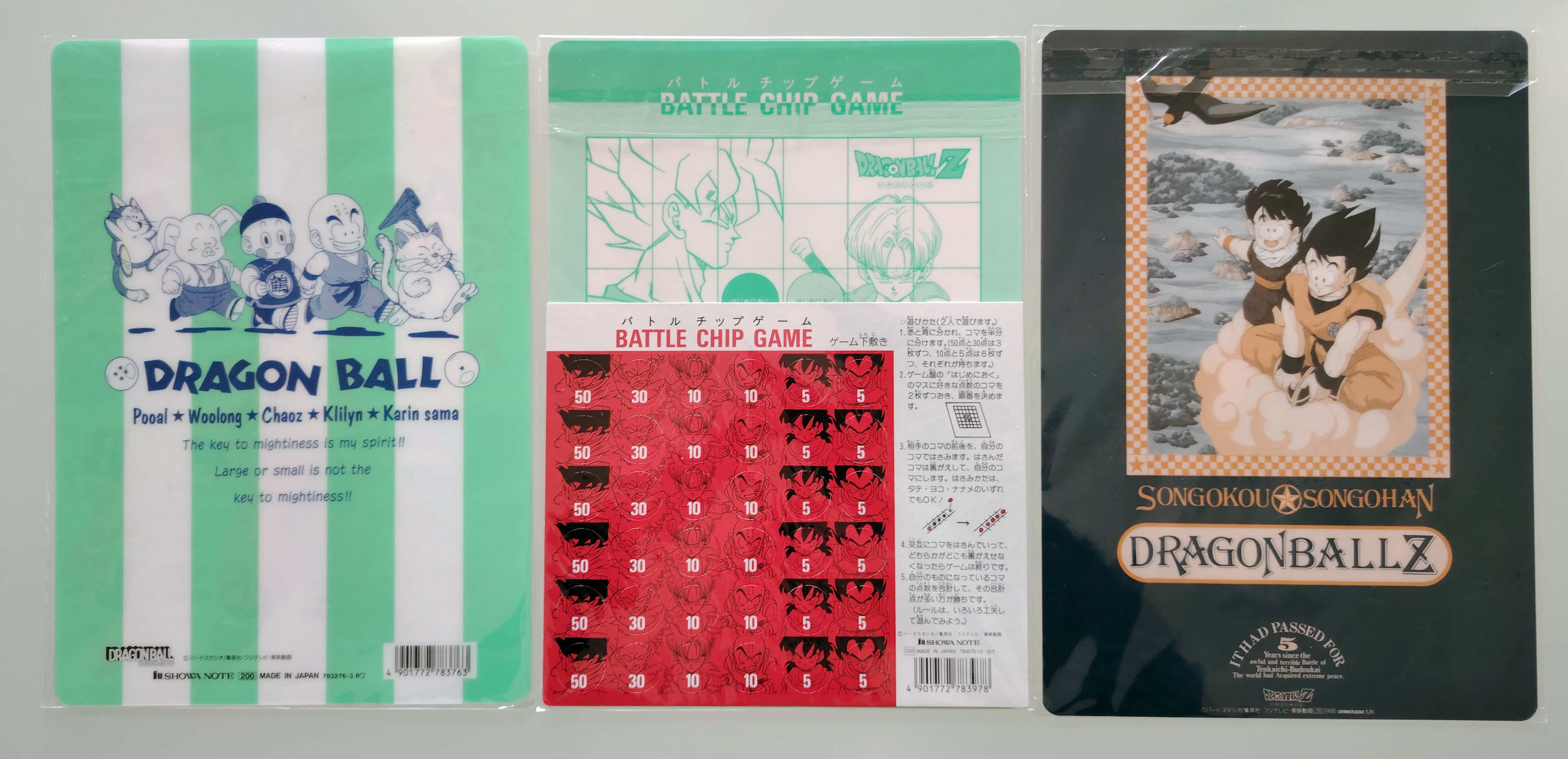 Lot de 3 Shitajiki Dragon Ball : Showa Note part 3 N°783276-3 sous blister ouvert / Dragon Ball Z Showa Note part 5 N° 12 ~ 783075-12 sous blister et Animetopia N°0490 sous blister scellé.