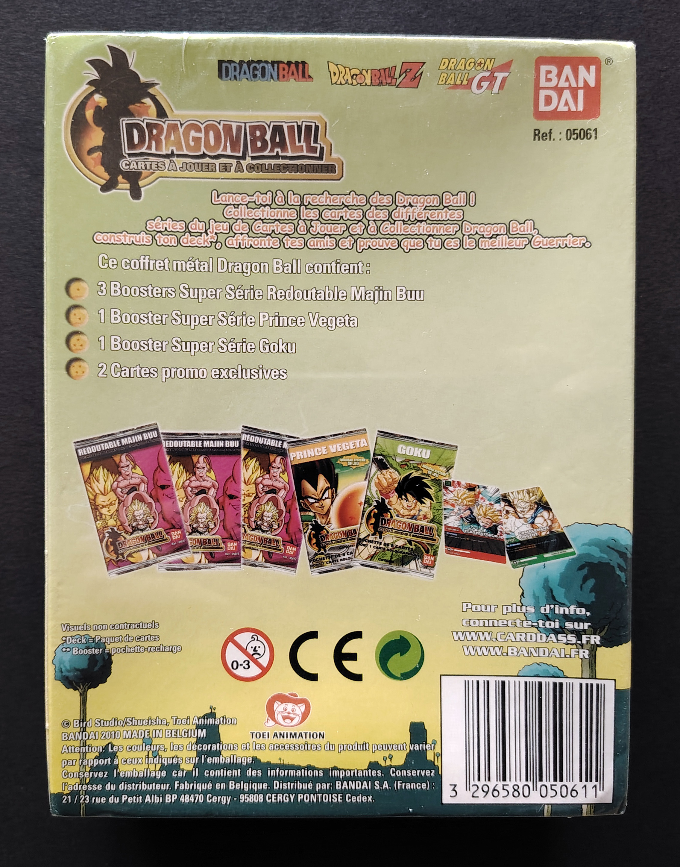 Coffret Metal scellé Dragon Ball Carddass "Cartes à jouer et à collectionner". Ce coffret contient : 3 boosters Super Série Redoutable Majin Buu, 1 Booster Super Série Prince Vegeta, 1 Booster Super Série Goku et 2 Cartes promo exclusives. Sorti en 2010.