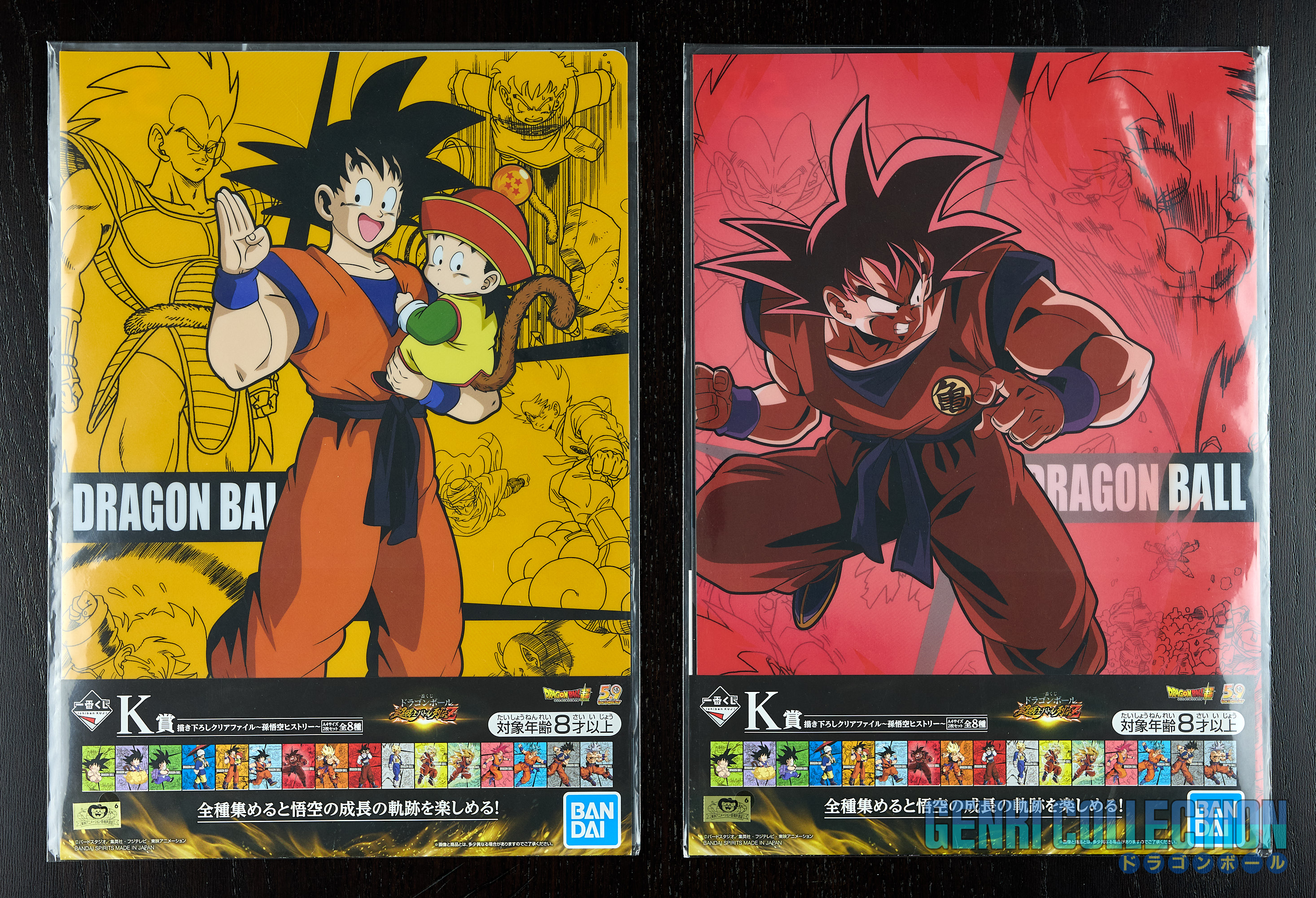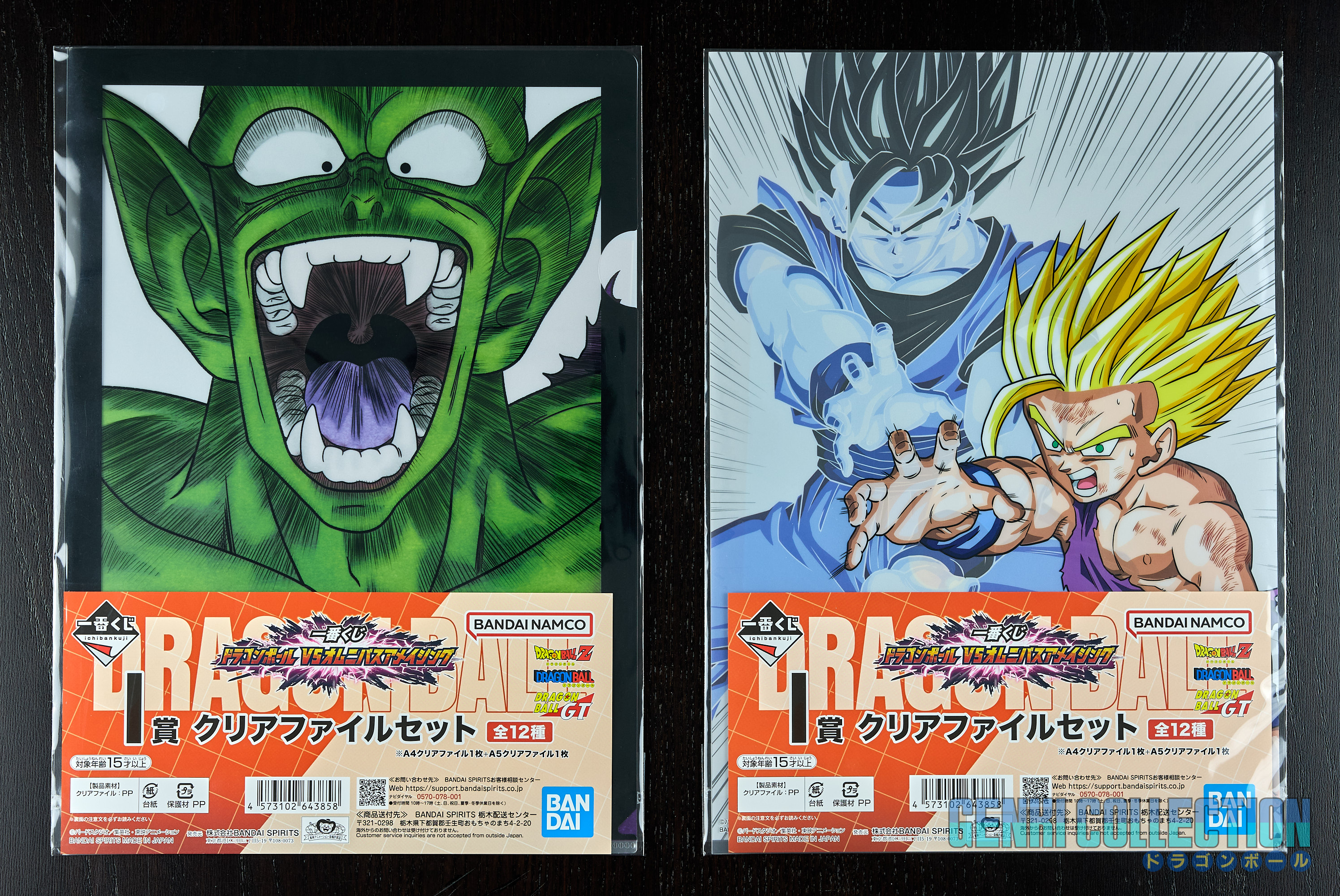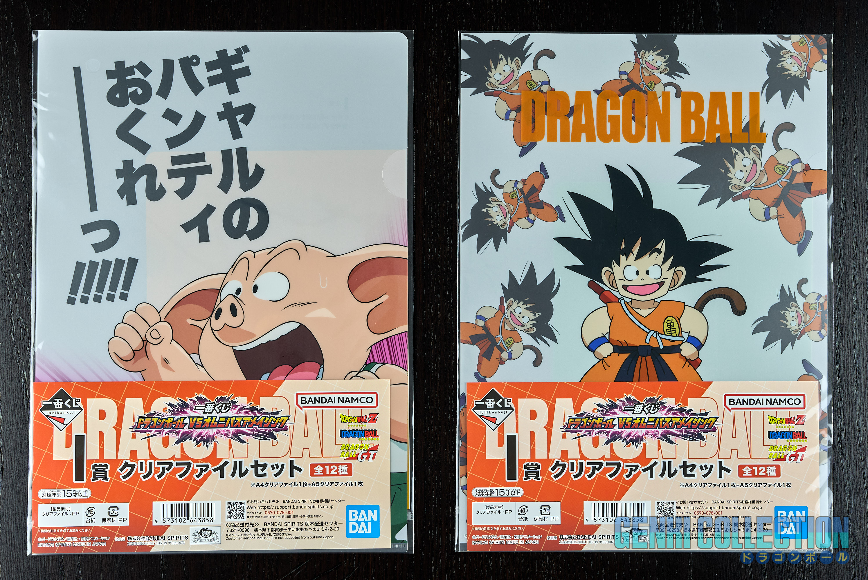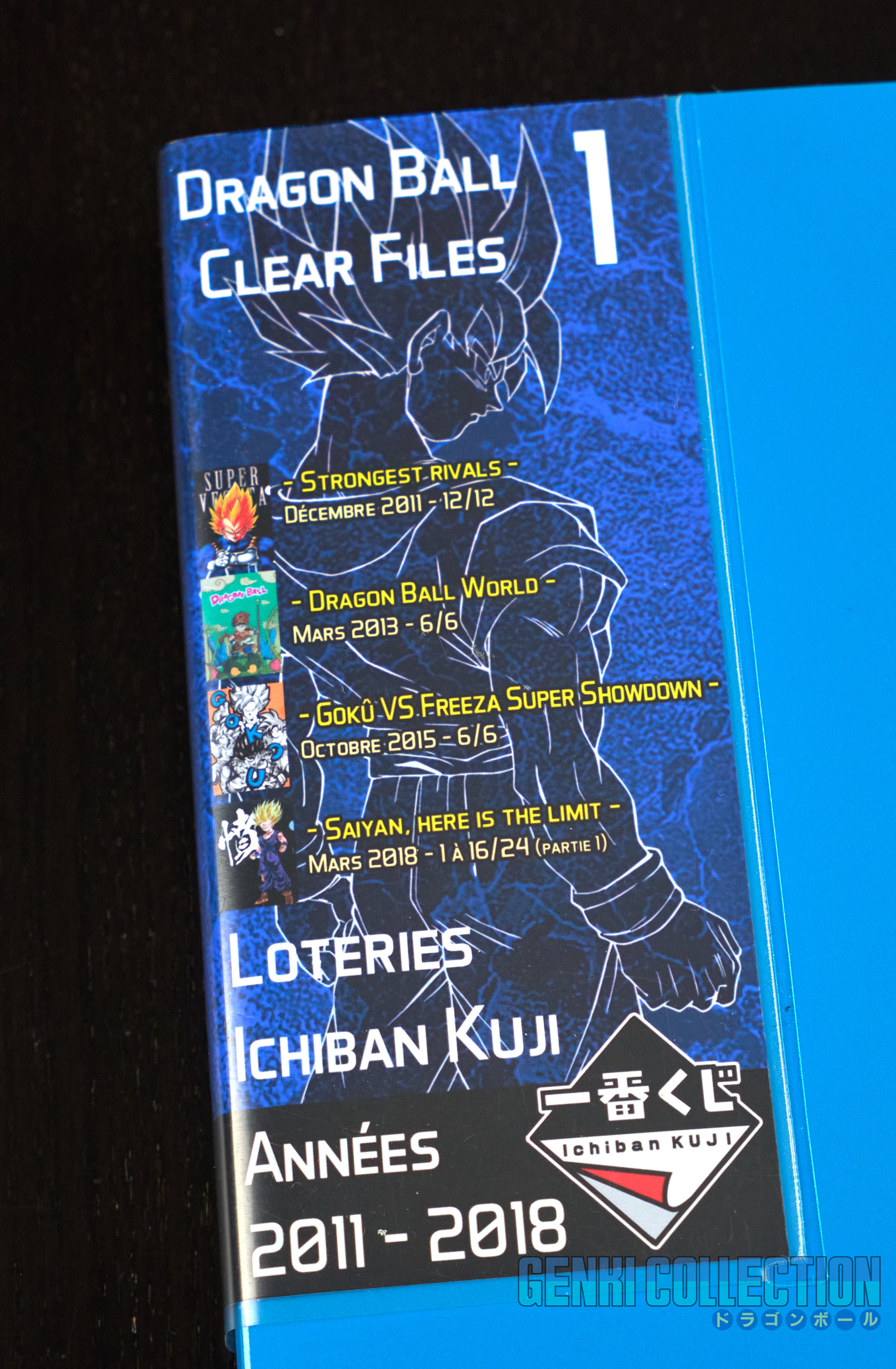 Ensemble de 346 clear files (chemises plastifiées au format A4 ou A5 pour certaines) Dragon Ball composés de 325 clears file répartis sur 20 full sets loteries Ichiban Kuji (2011 à 2024) et 21 clear files indépendants (à l'unité ou "Not for sale"), tous en excellent état dans leurs blisters d'origines (exceptés pour 2 ou 3 d'entre eux). Voici le détail des sets :