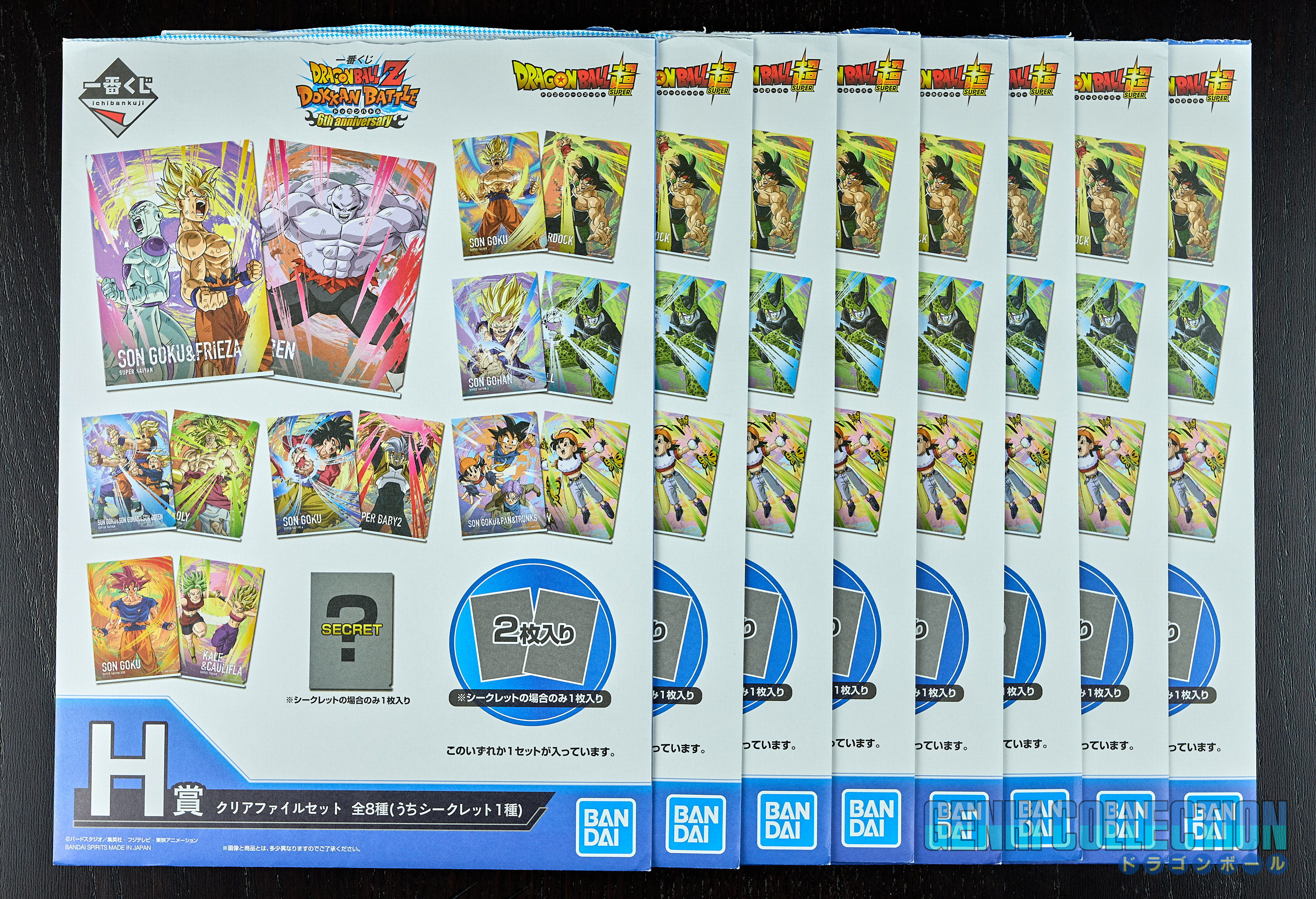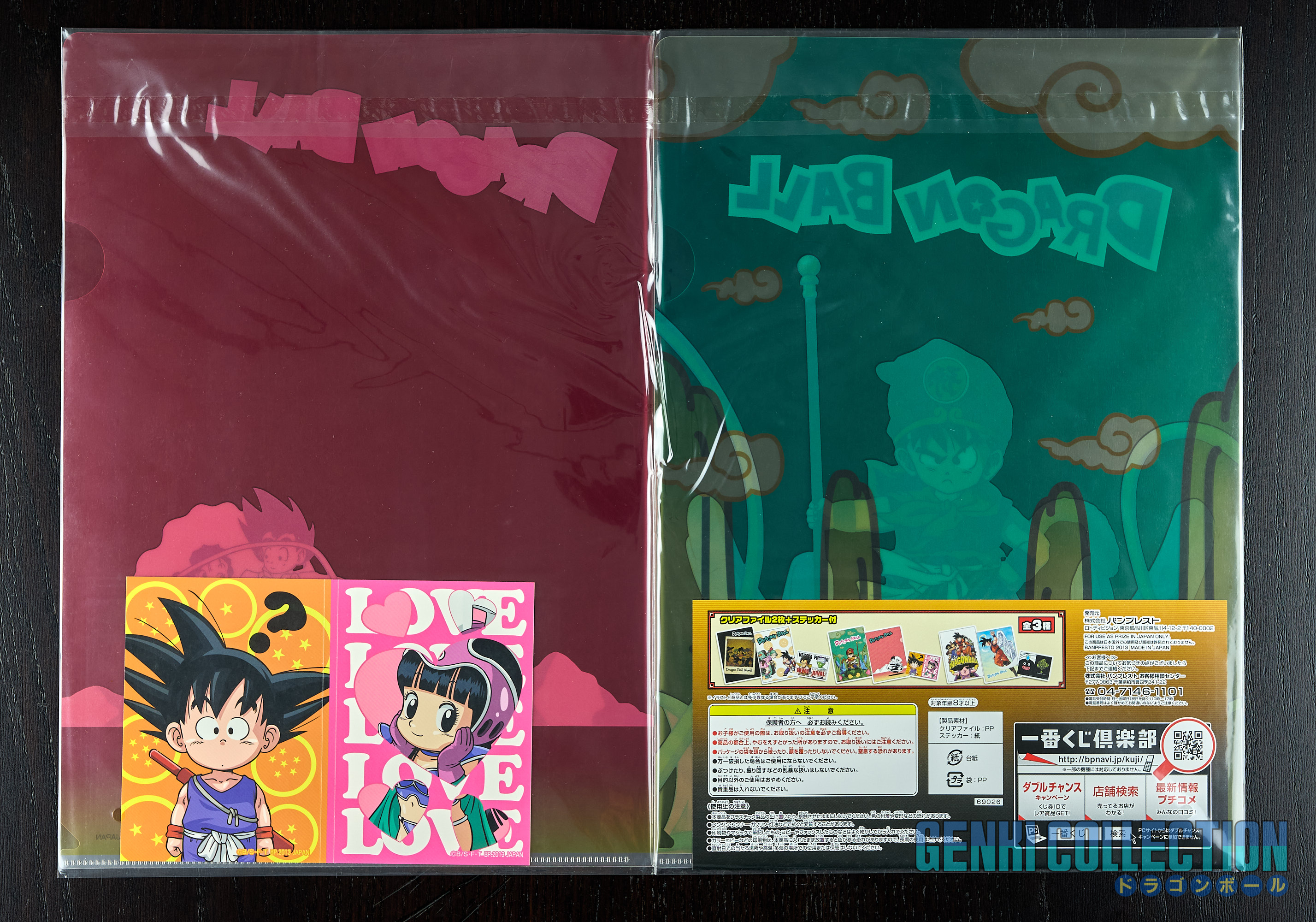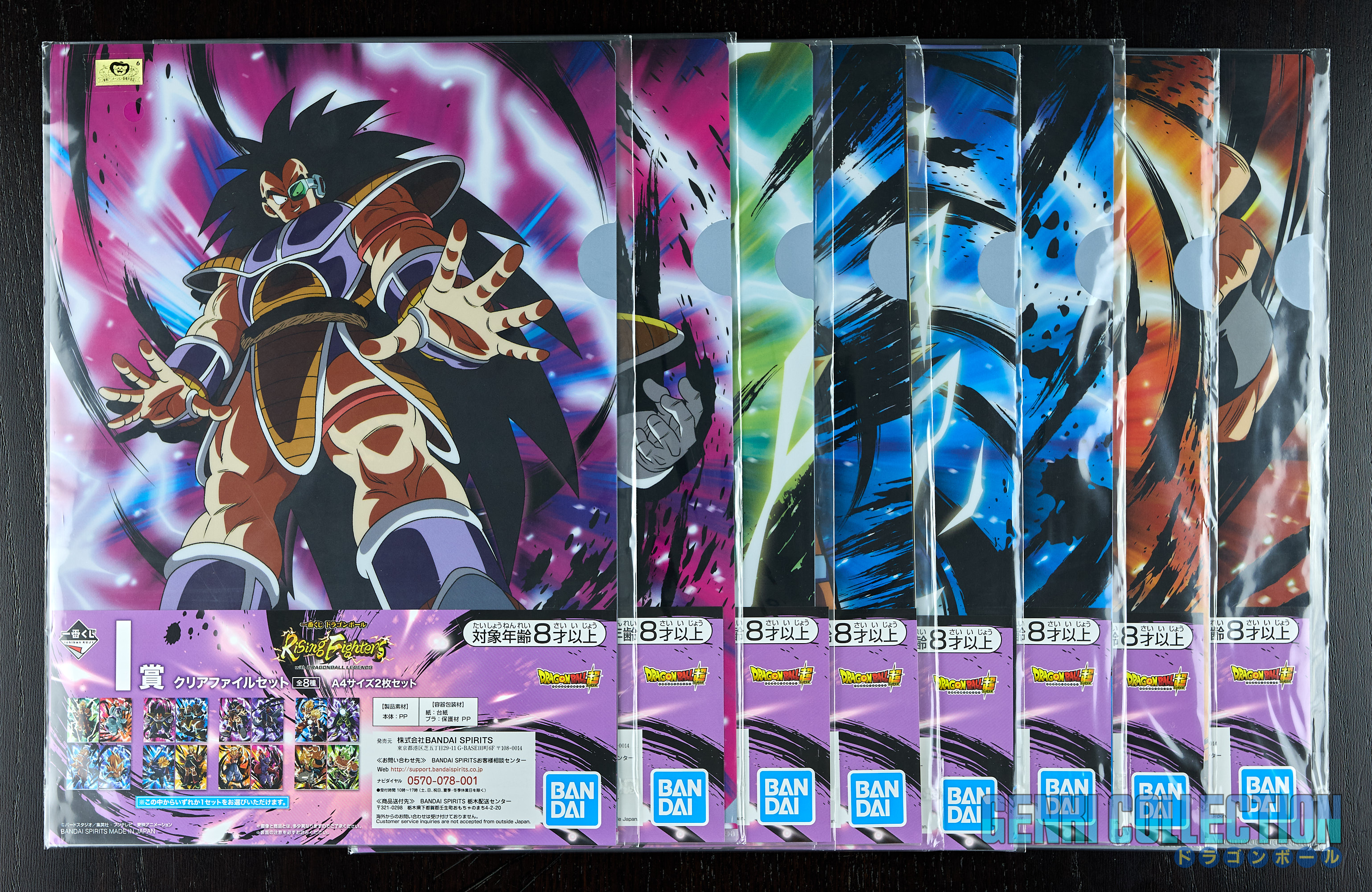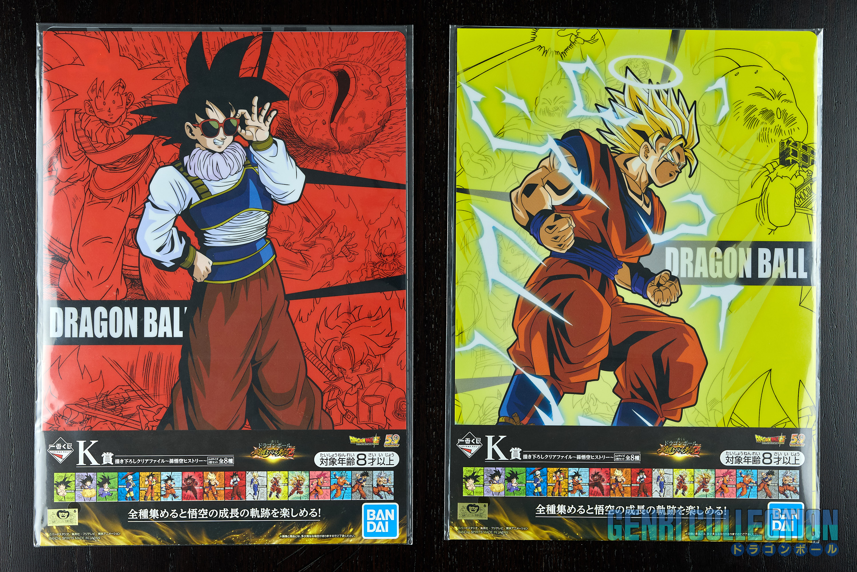 Ensemble de 346 clear files (chemises plastifiées au format A4 ou A5 pour certaines) Dragon Ball composés de 325 clears file répartis sur 20 full sets loteries Ichiban Kuji (2011 à 2024) et 21 clear files indépendants (à l'unité ou "Not for sale"), tous en excellent état dans leurs blisters d'origines (exceptés pour 2 ou 3 d'entre eux). Voici le détail des sets :