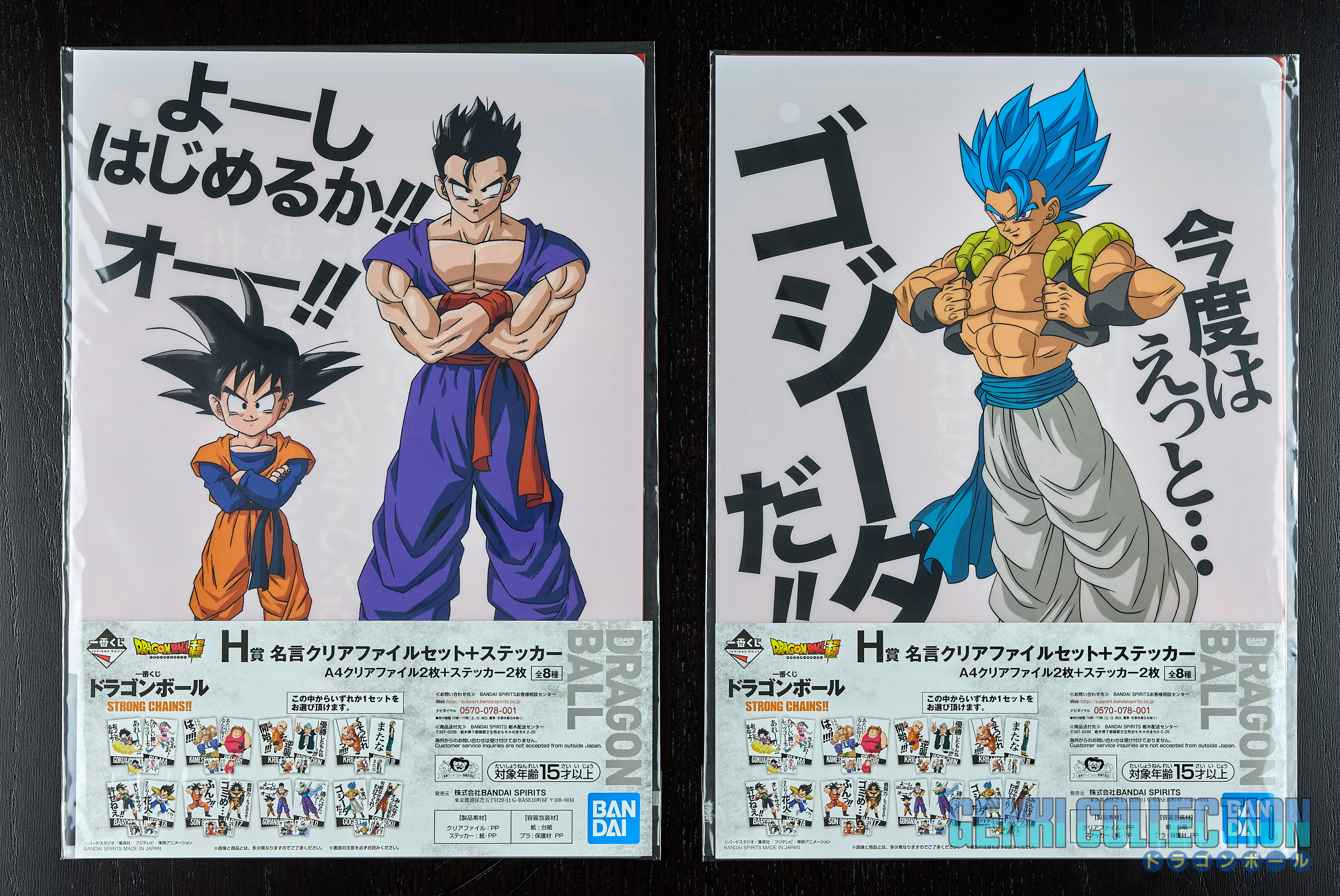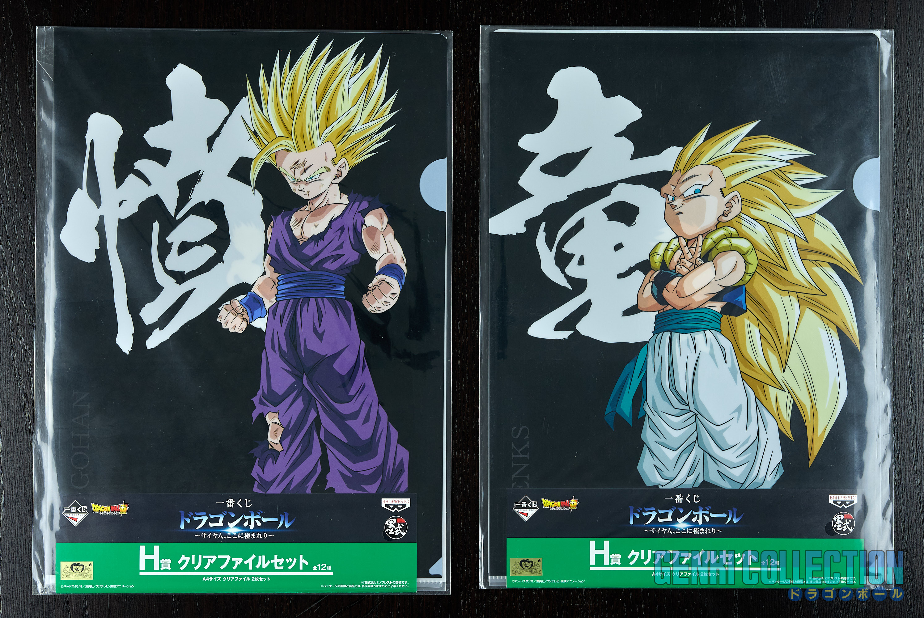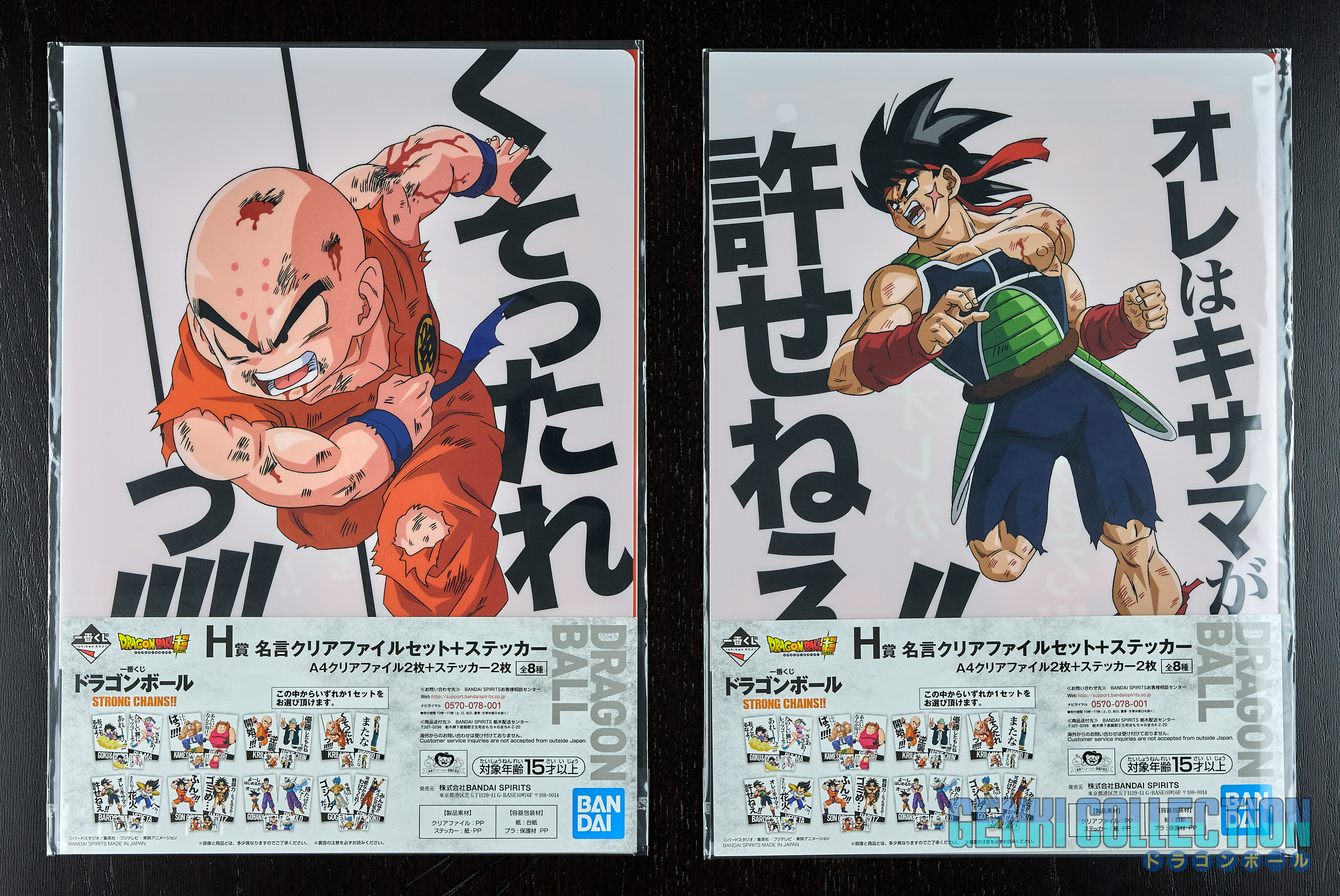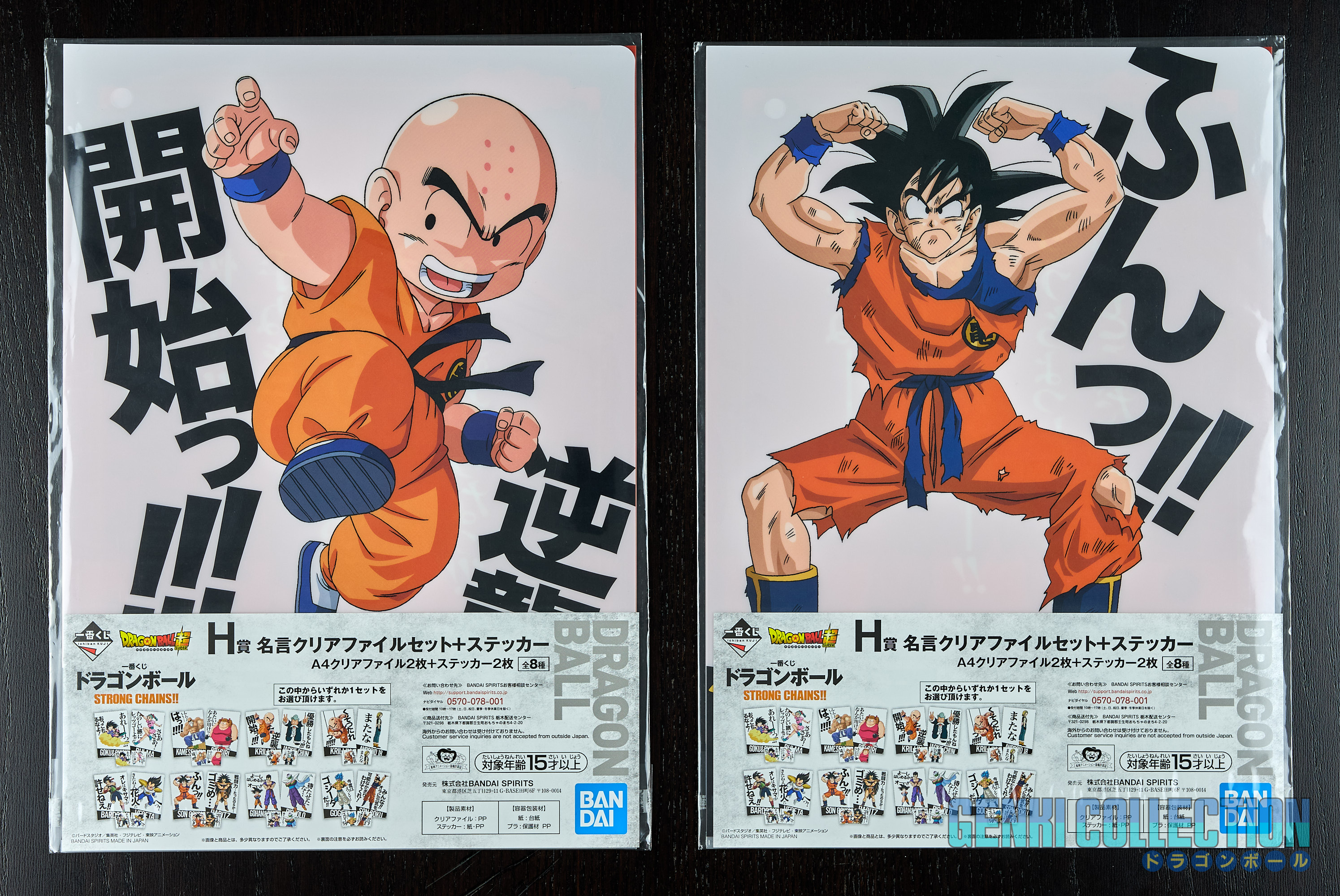 Ensemble de 346 clear files (chemises plastifiées au format A4 ou A5 pour certaines) Dragon Ball composés de 325 clears file répartis sur 20 full sets loteries Ichiban Kuji (2011 à 2024) et 21 clear files indépendants (à l'unité ou "Not for sale"), tous en excellent état dans leurs blisters d'origines (exceptés pour 2 ou 3 d'entre eux). Voici le détail des sets :