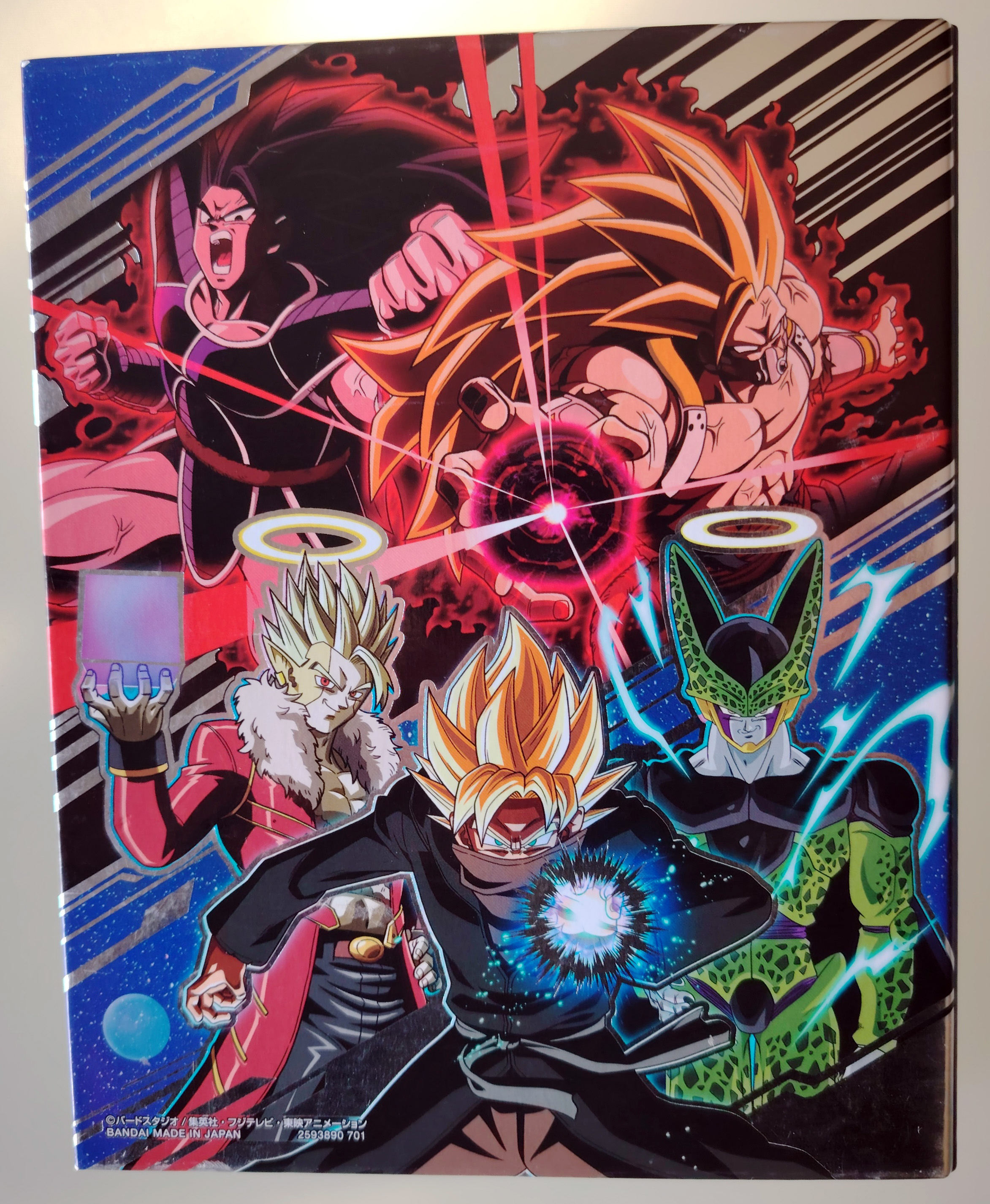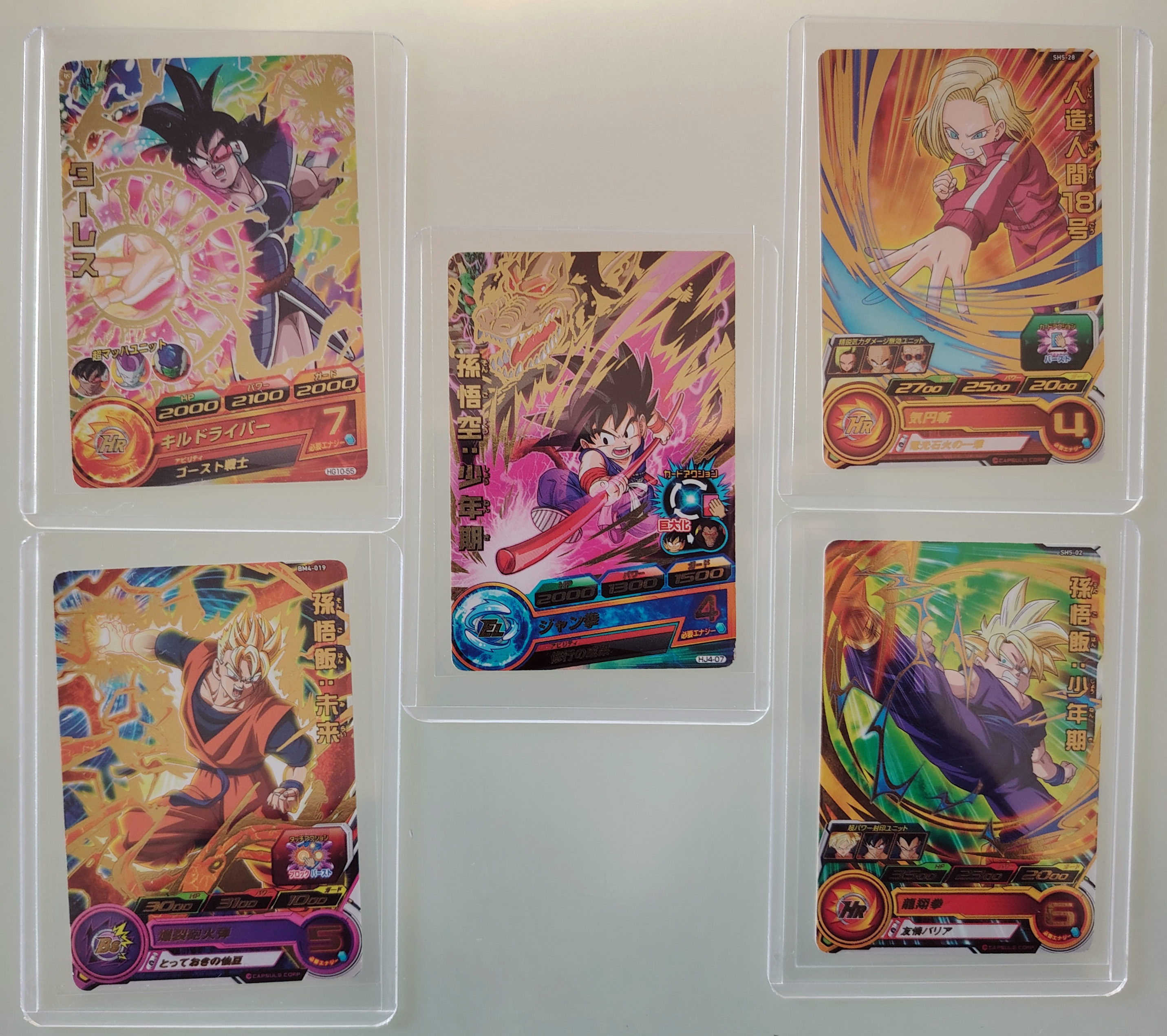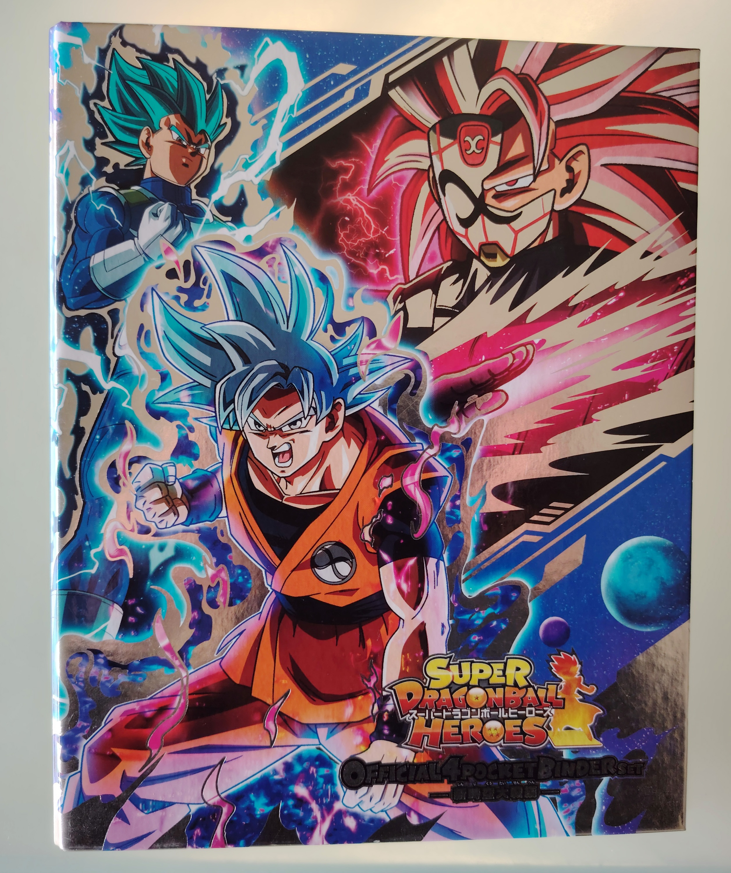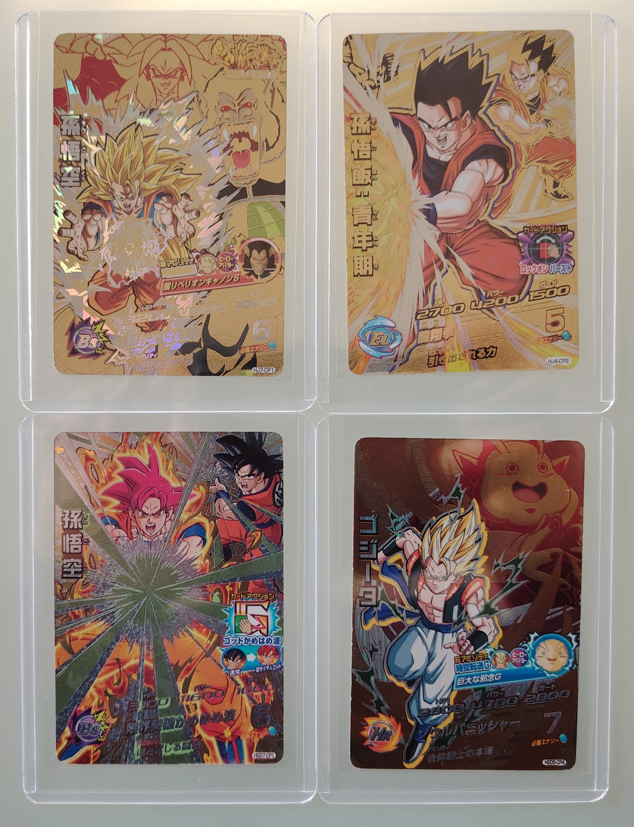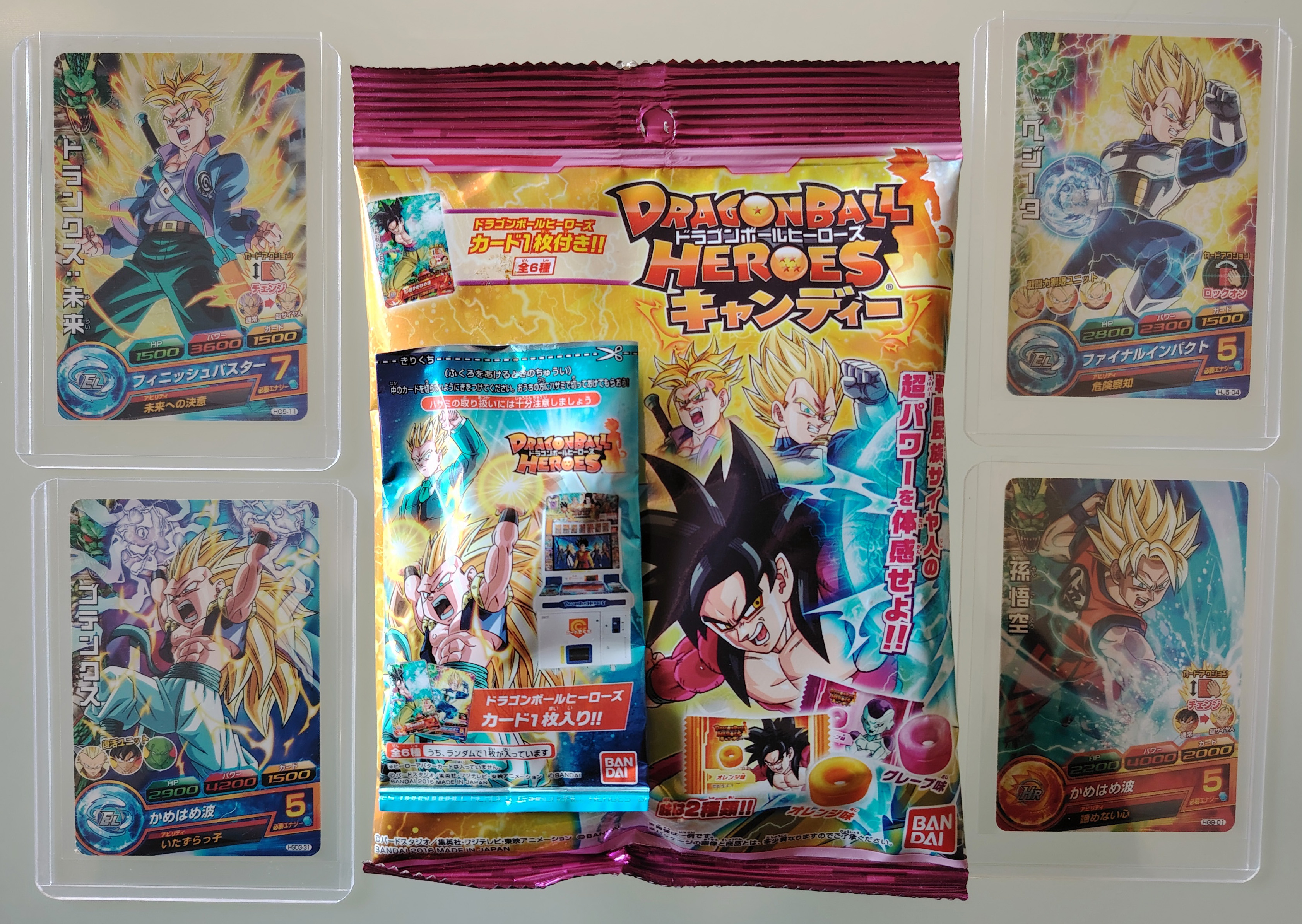 Lot de 53 cartes Dragon Ball Heroes et Super Dragon Ball Heroes dont 16 prisms, 3 cartes V Jump avec leur pochettes respectives, 4 cartes avec leur paquet de bonbon + 1 mini classeur avec feuillets neufs + 1 paquet de Bonbons (scellé) avec Booster (ouvert).