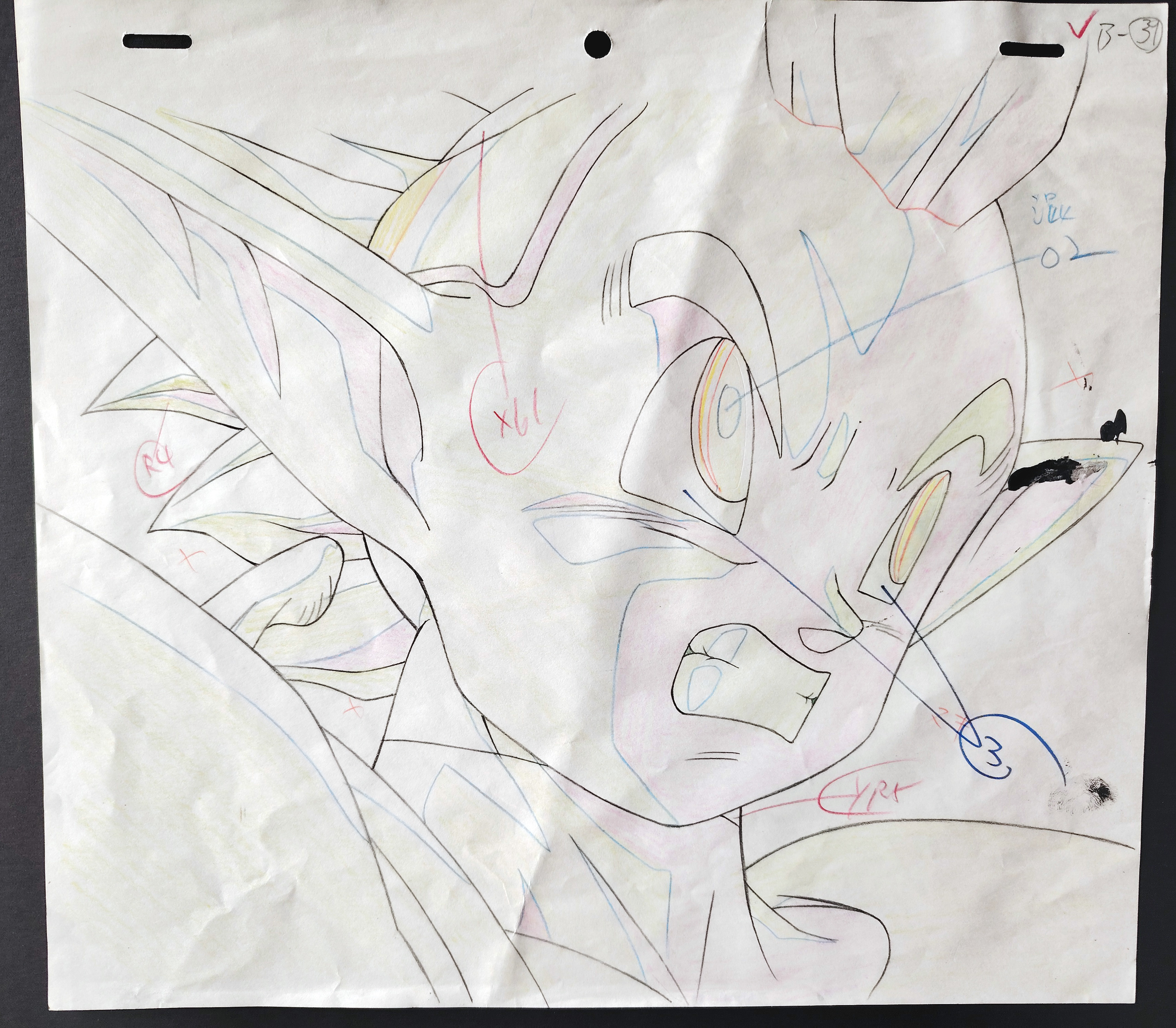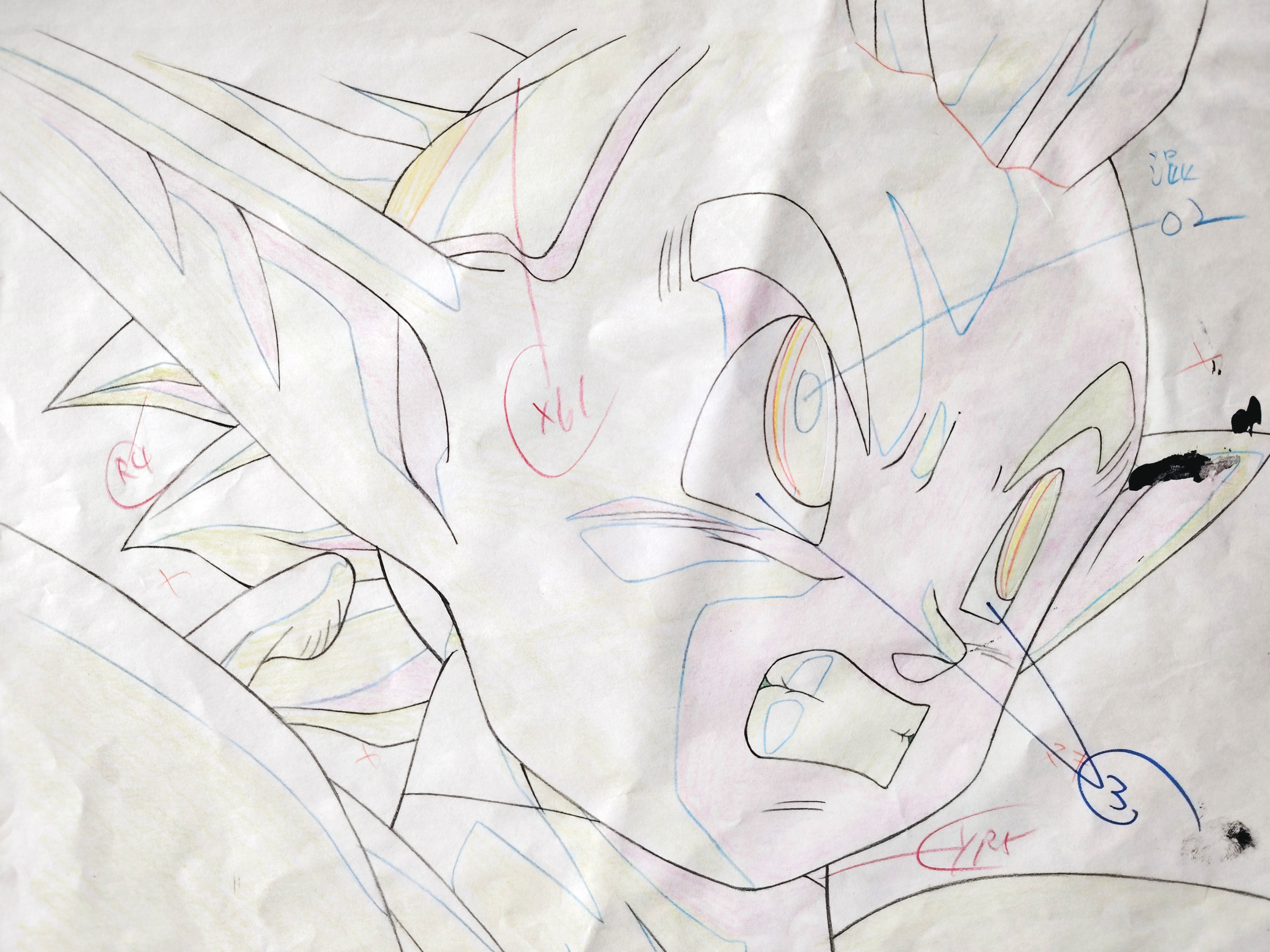 Douga original DRAGON BALL Z à la mine de plomb et au crayon de couleur représentant Minoshia, le petit frère de Tapion, tiré du film 13 "L'attaque du Dragon", "L’Explosion du poing du dragon !! Si Goku n’y arrive pas, qui le pourra ?", "ドラゴンボールZ 龍拳爆発!!悟空がやらねば誰がやる", sorti en 1995 par la Toei animation.