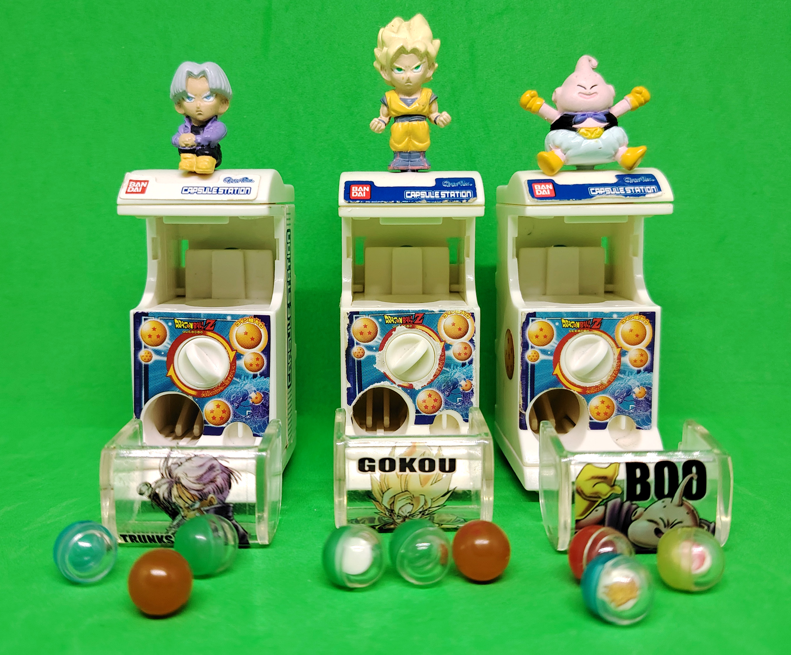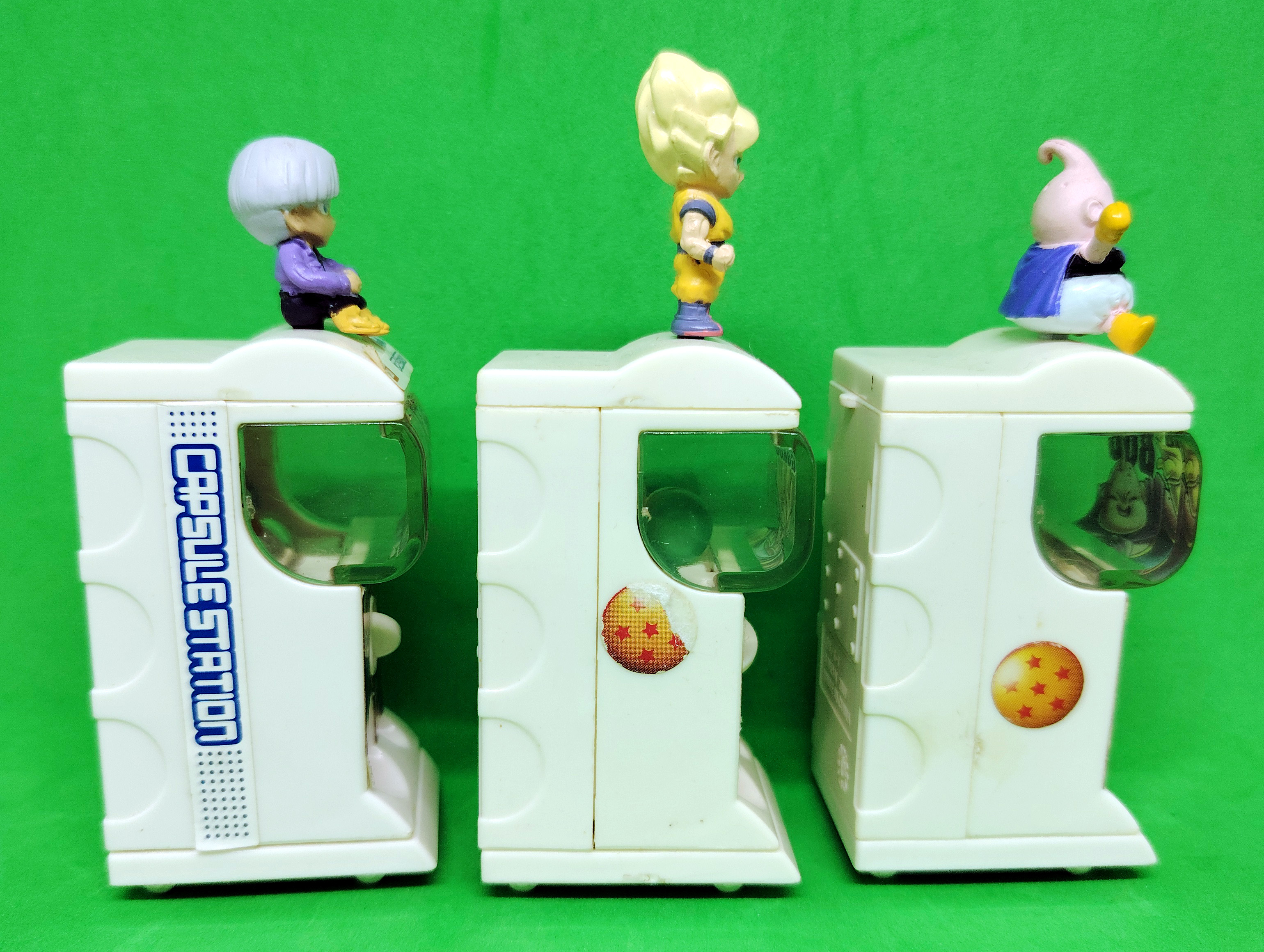 Lot de 3 gashapons Dragon Ball Z Capsule Station représentant Buu, Goku super Saiyan et Trunks. Chacune dispose de petites boules, tirettes fonctionnelles, sortie en 2007 par Bandai.