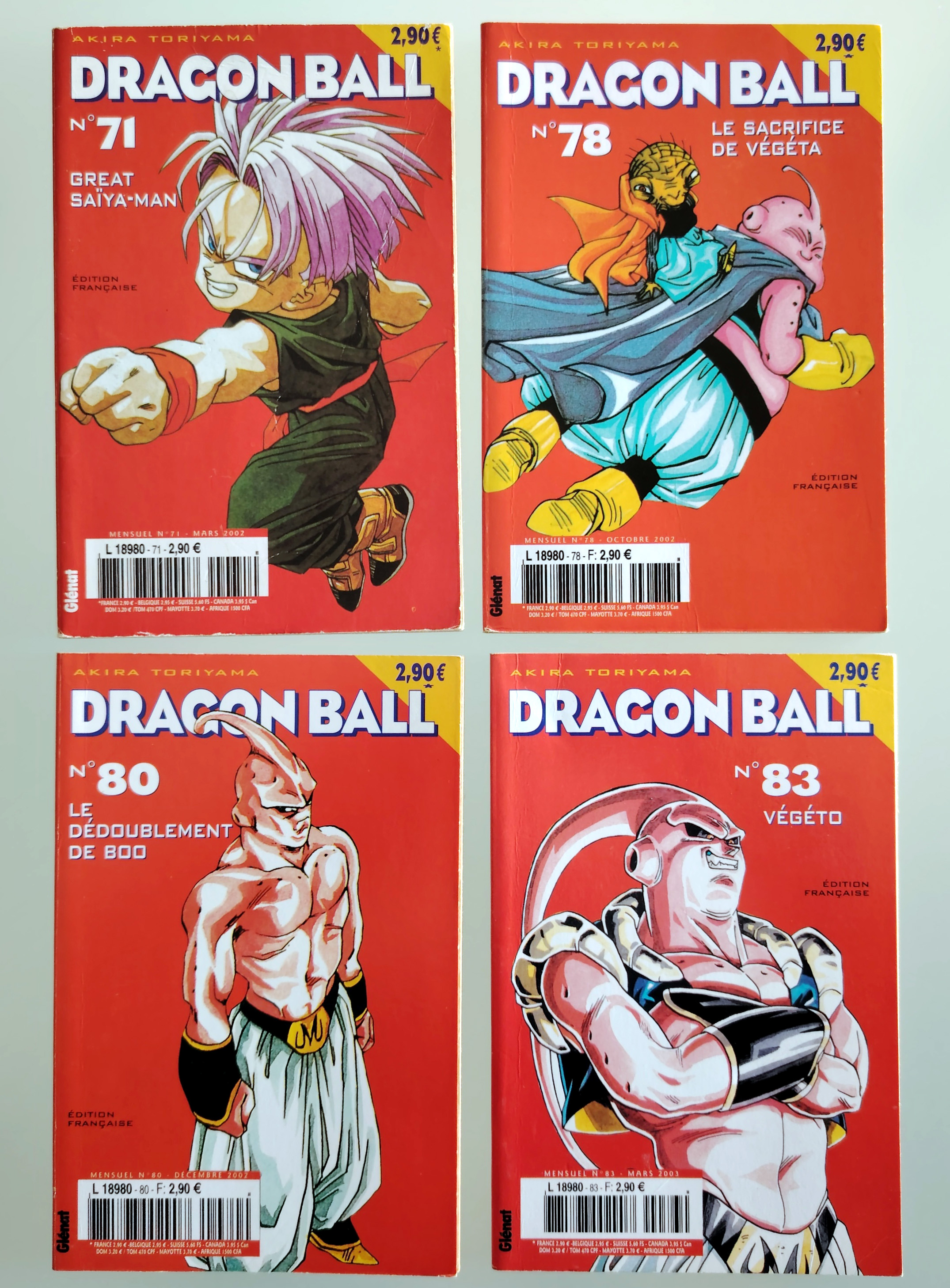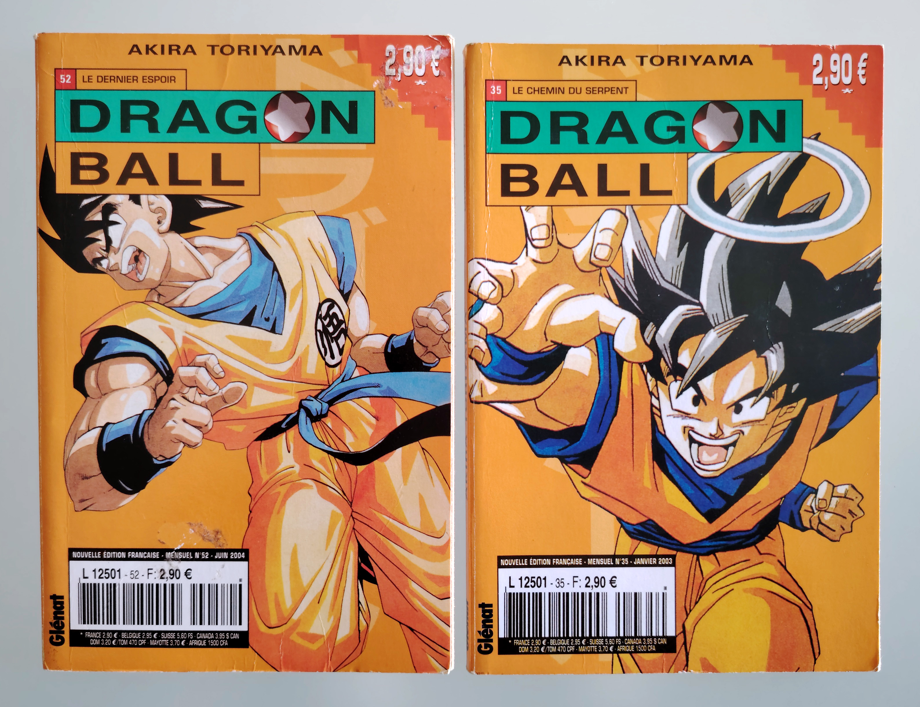 Lot de 11 mangas Dragon Ball éditions mensuelles en kiosque, dont le tome 11 (1993) est encore sous blister avec support cartonné (quelques zones ouvertes à signaler sur l'emballage, mais jamais déballé).