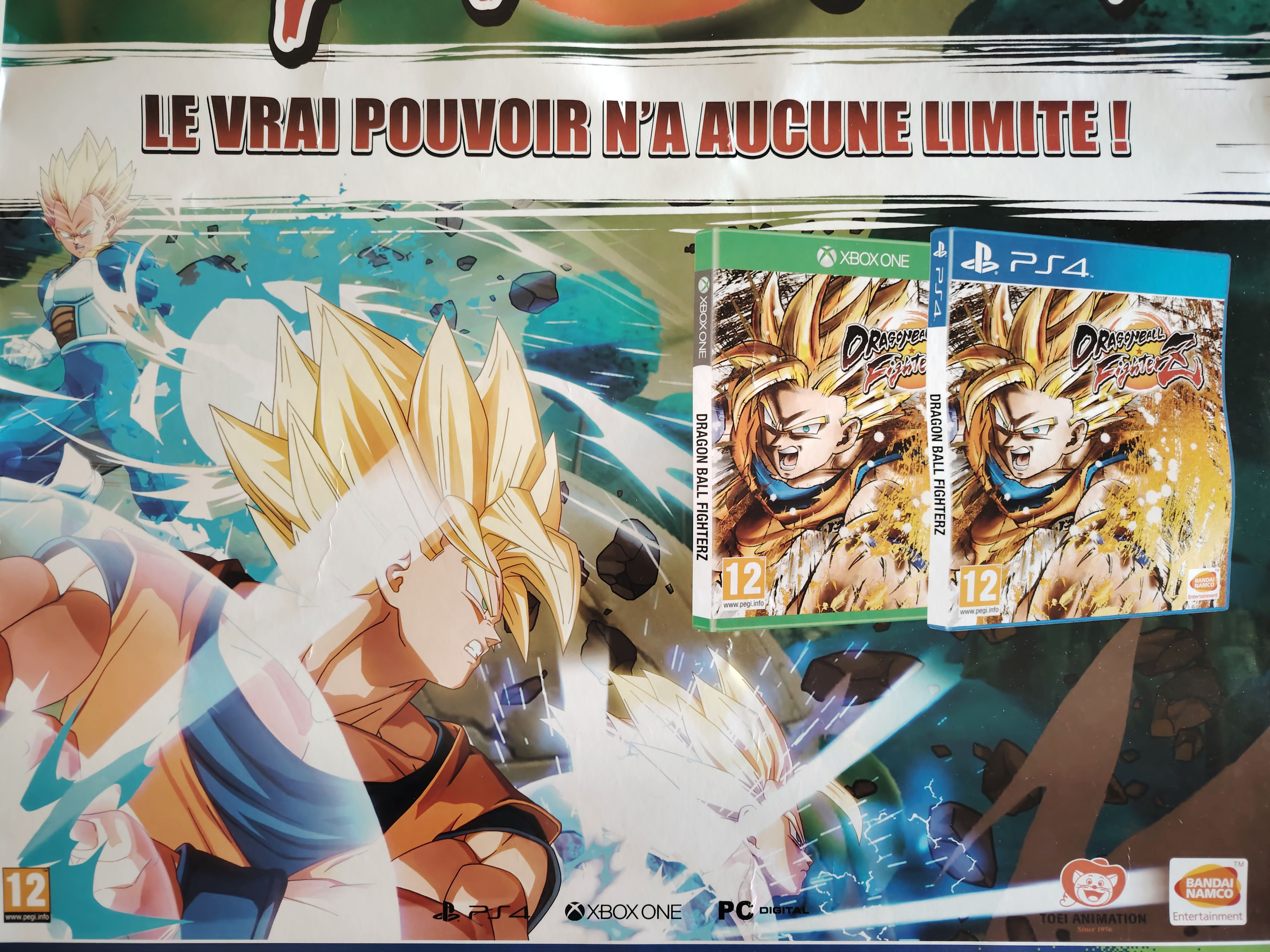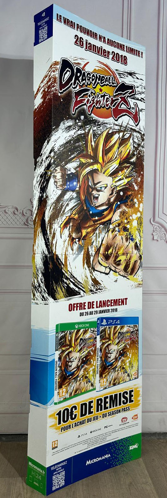 Ensemble comprenant un standing (PLV) promotionnel de Dragon Ball FighterZ de dimension 170cm x 45cm et un poster de dimension 60cm x 80cm, sortis pour la promotion du jeu Dragon Ball FighterZ en 2018 chez l'enseigne Micromania. À noter quelques plis et défauts sur le poster.