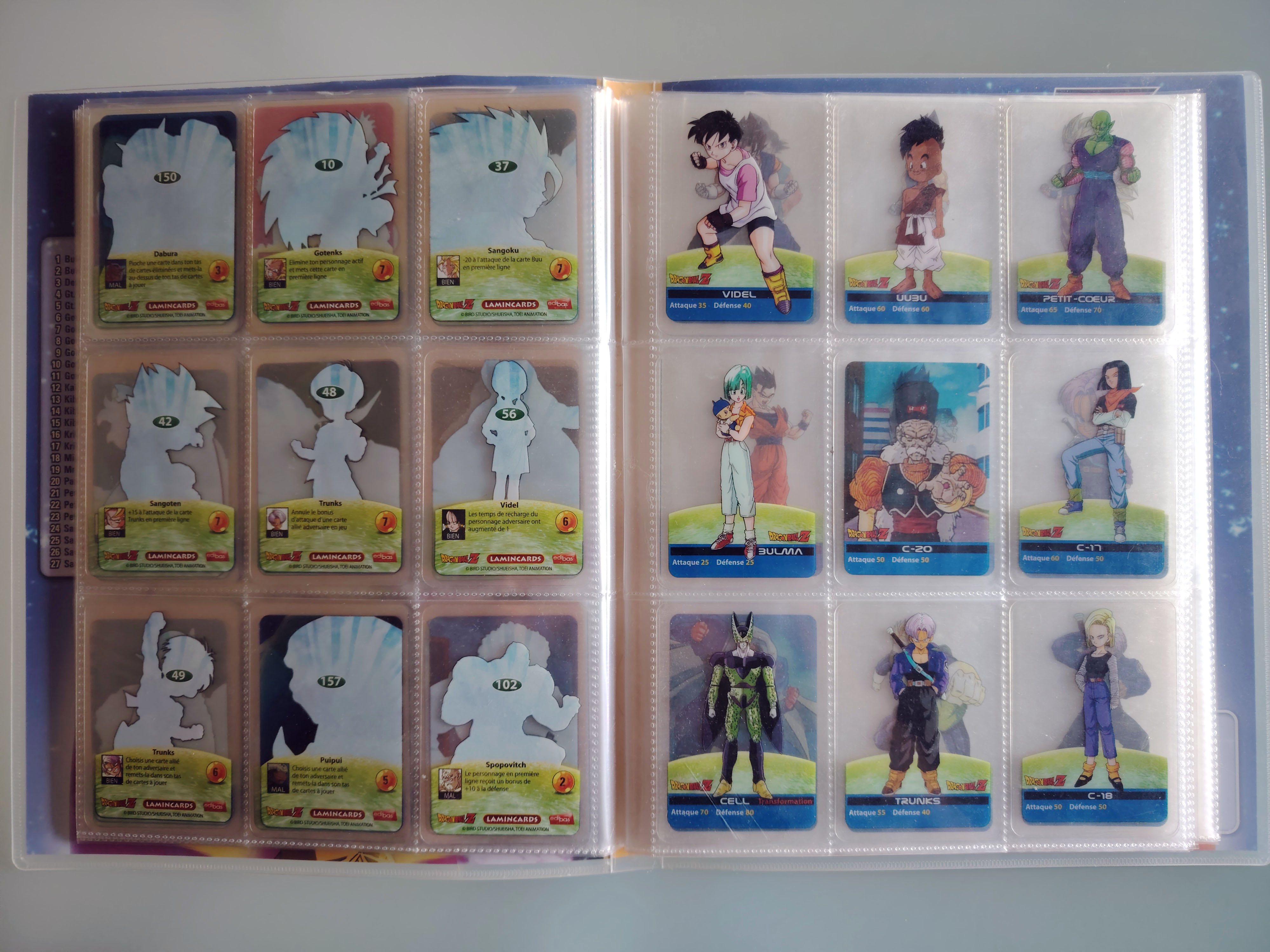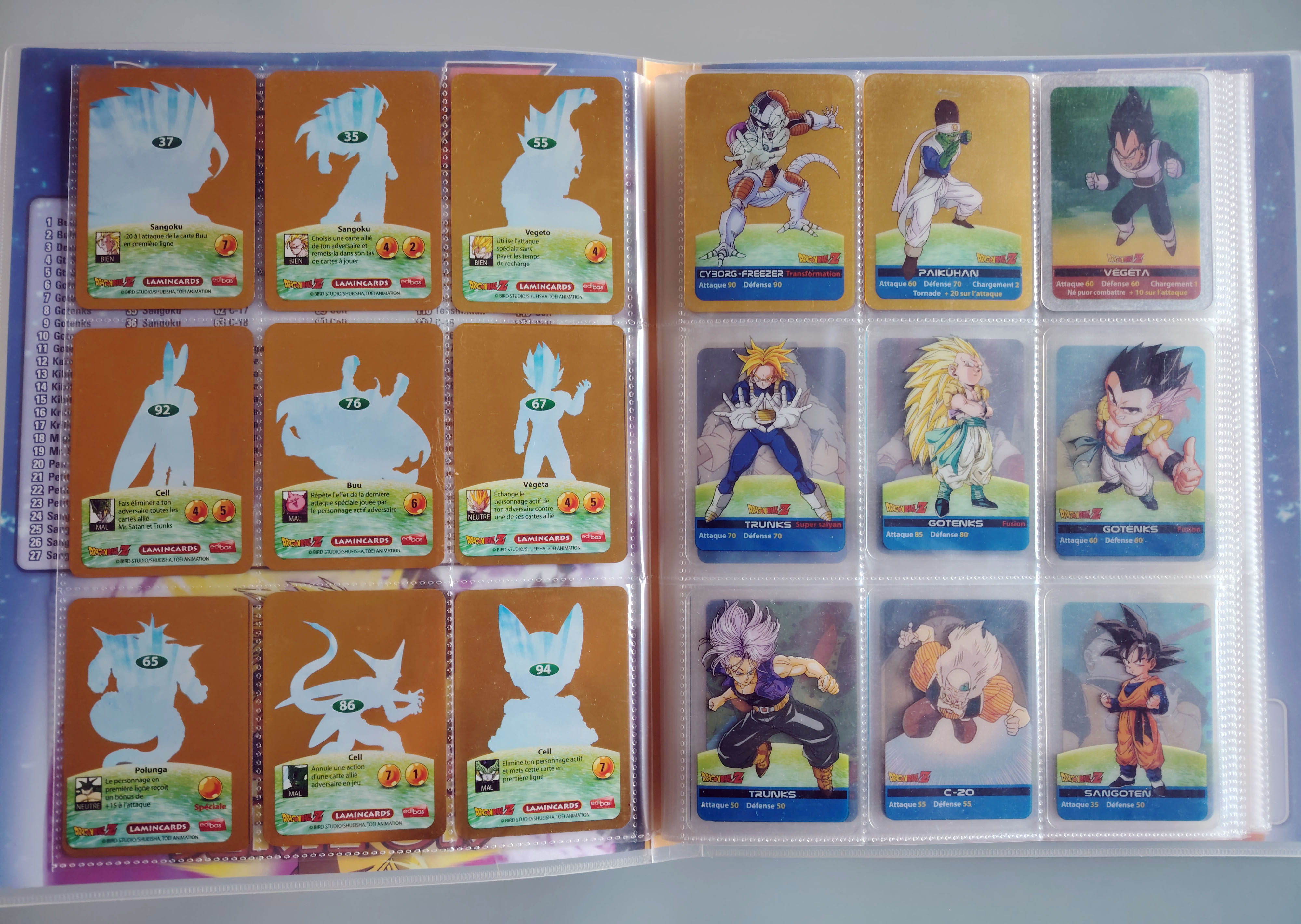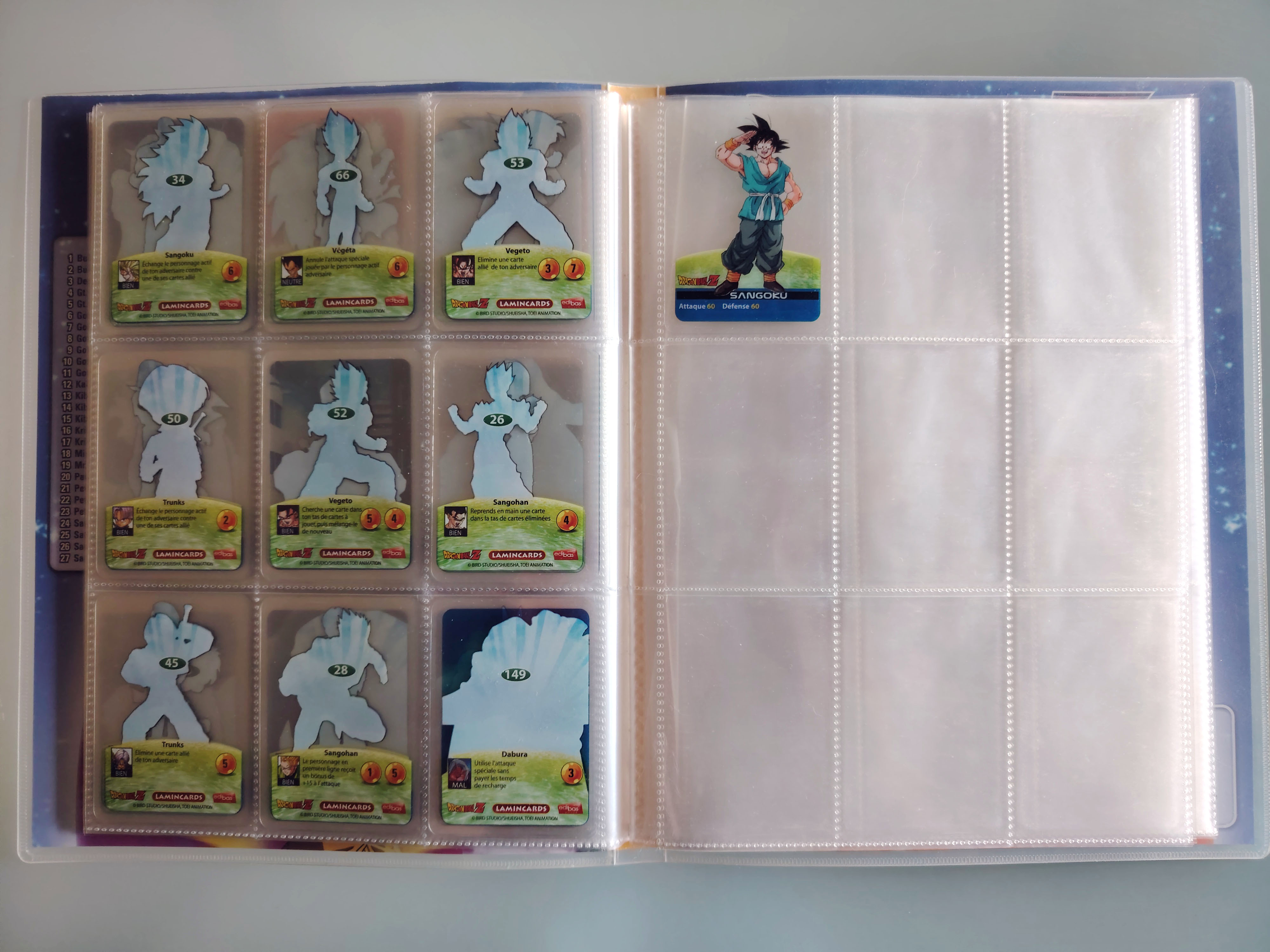 Lot de 62 cartes Dragon Ball Z Lamincards et le classeur. 10 carte dorées, 1 carte argentée et 51 cartes transparentes. À noter certaines cartes peuvent avoir des micro rayures ou des traces. Le classeur présente également des traces et micro rayures. Sorties en 2008 et 2009 par Edibas.