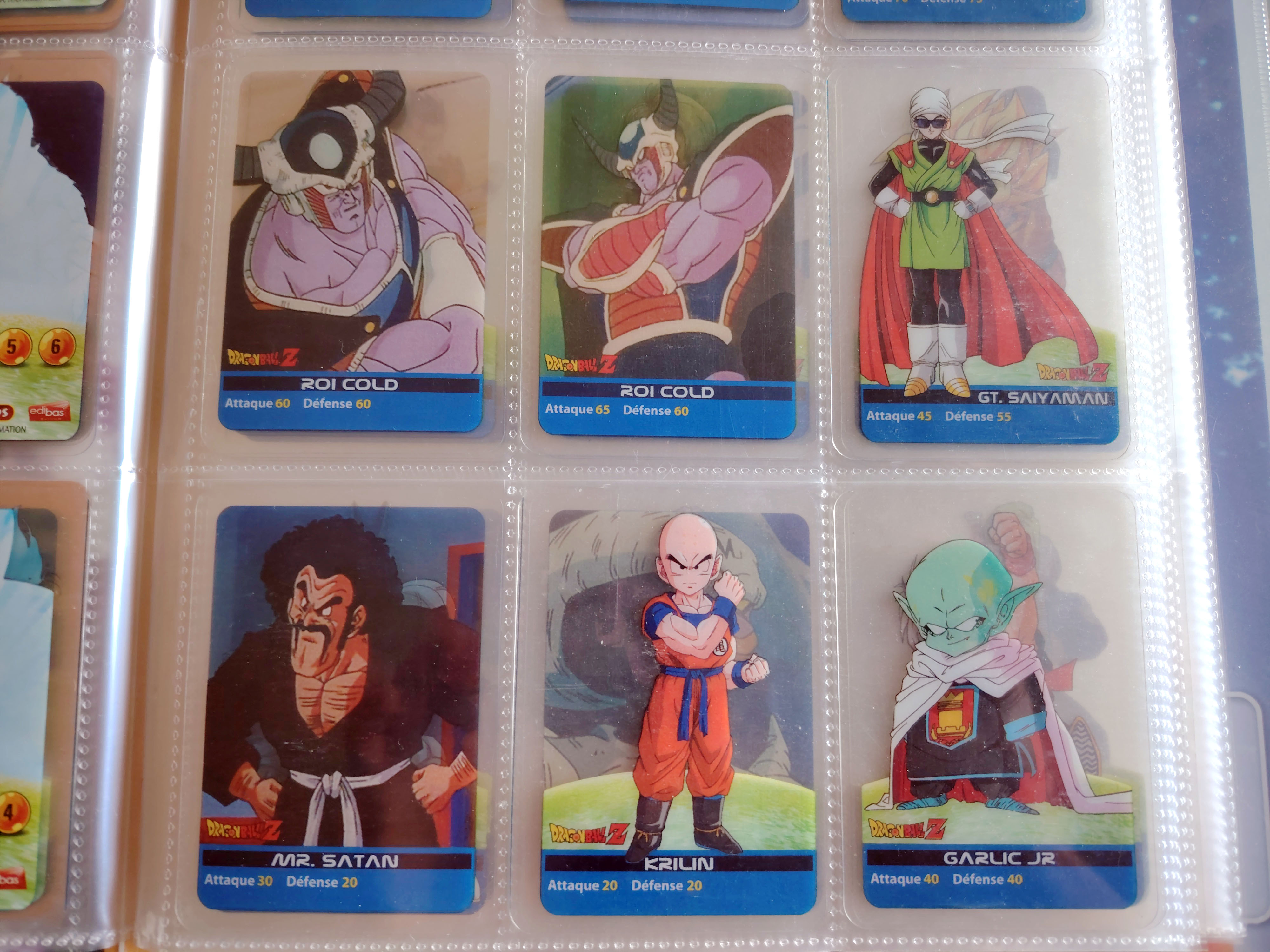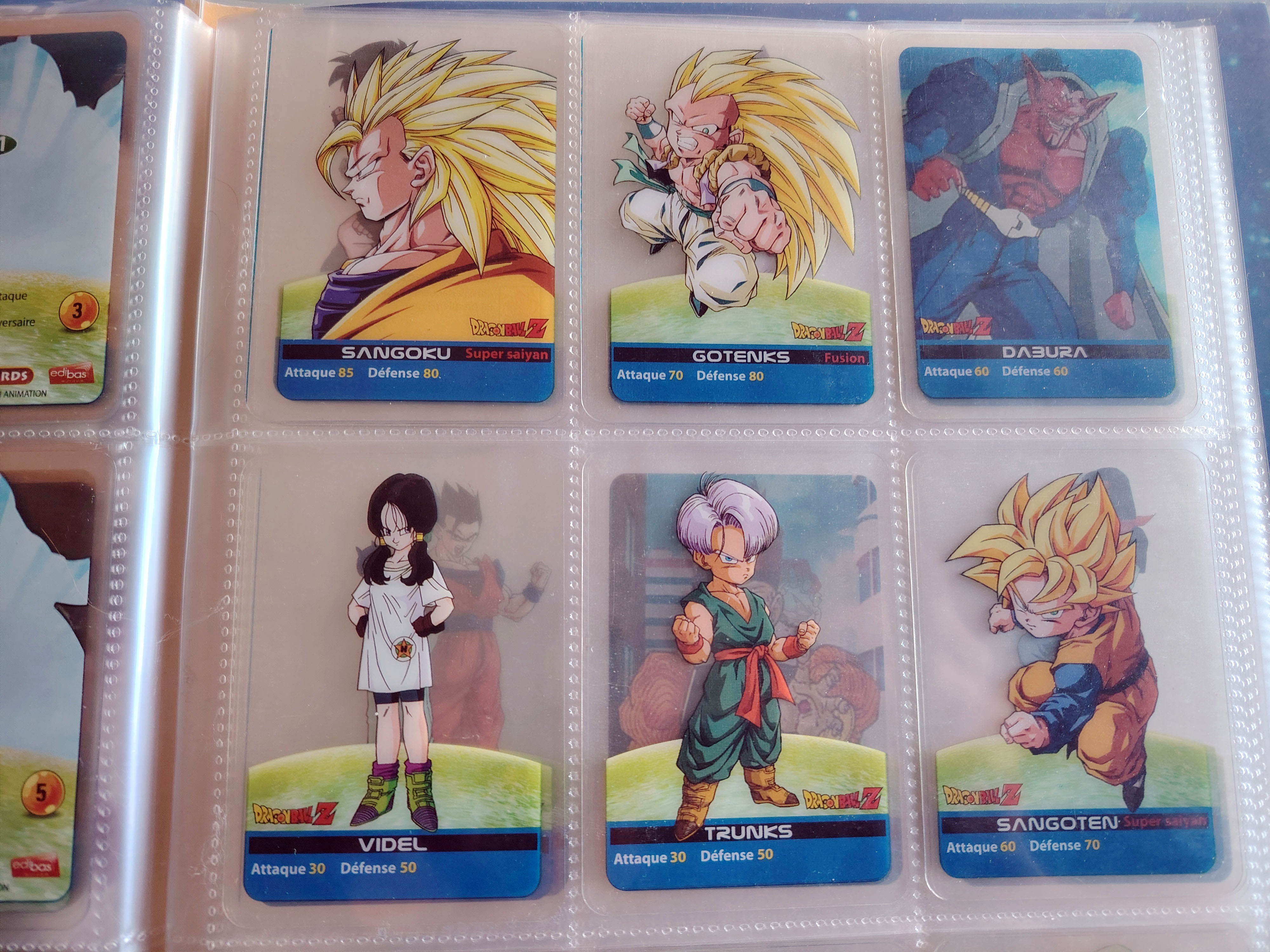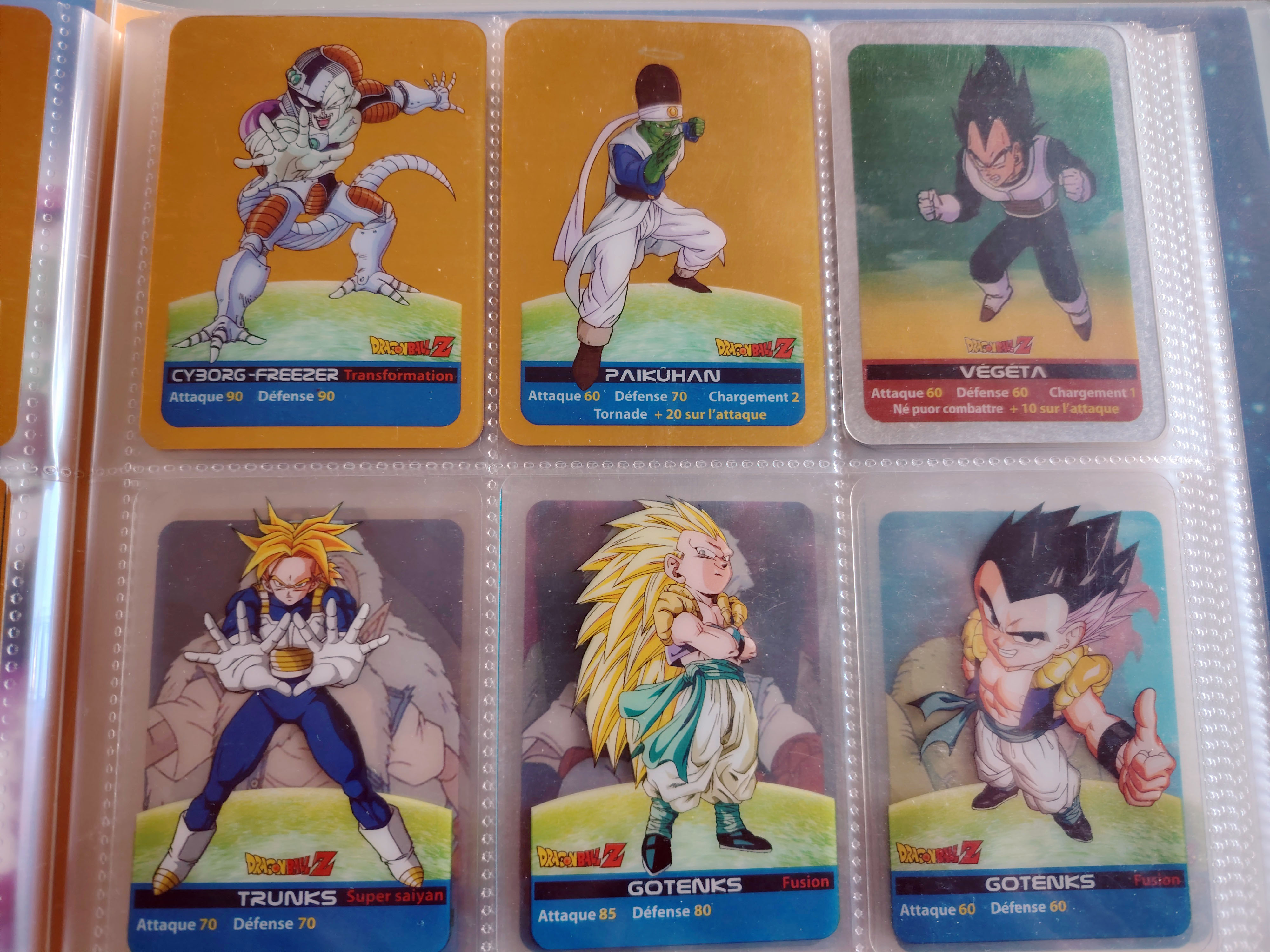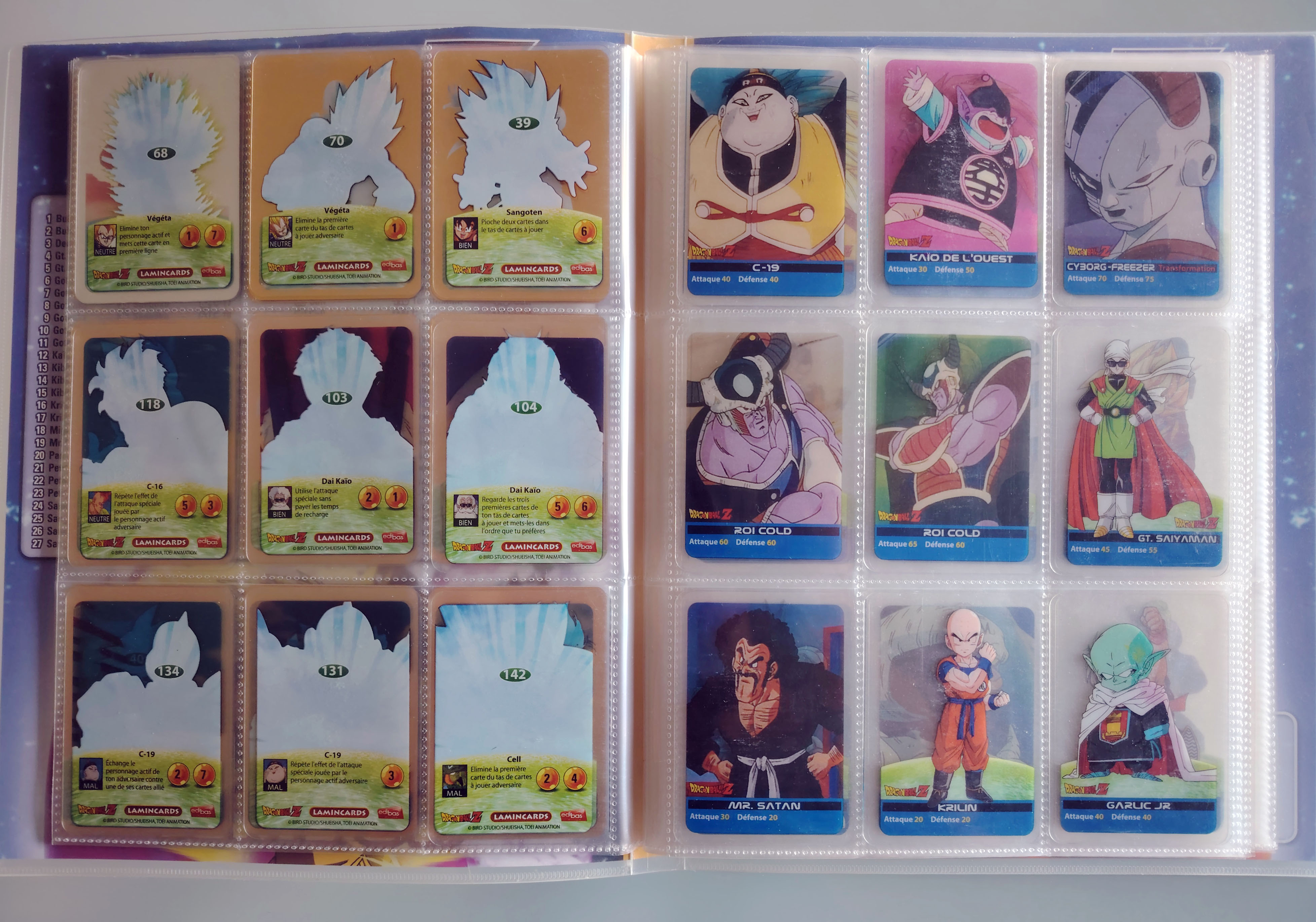 Lot de 62 cartes Dragon Ball Z Lamincards et le classeur. 10 carte dorées, 1 carte argentée et 51 cartes transparentes. À noter certaines cartes peuvent avoir des micro rayures ou des traces. Le classeur présente également des traces et micro rayures. Sorties en 2008 et 2009 par Edibas.