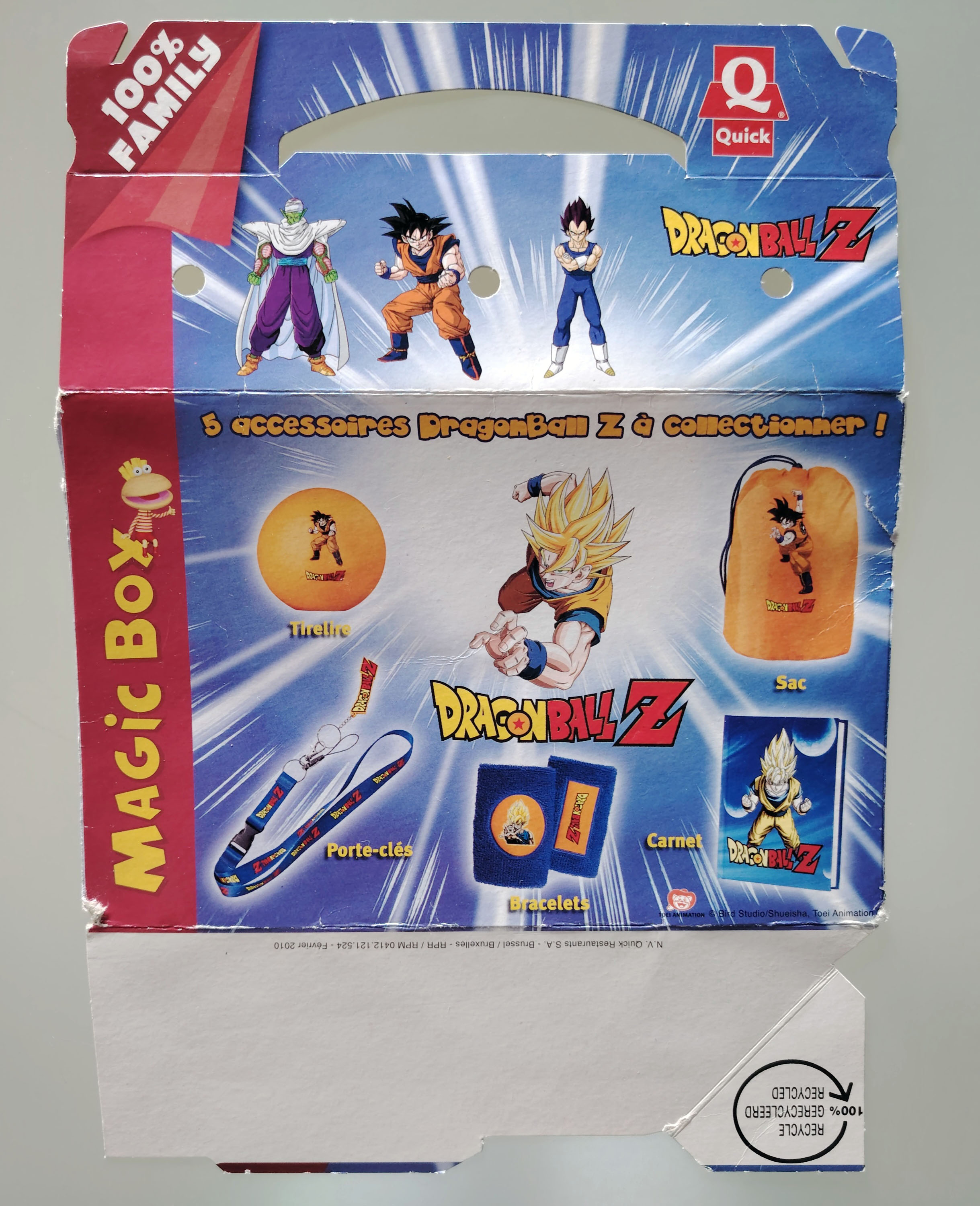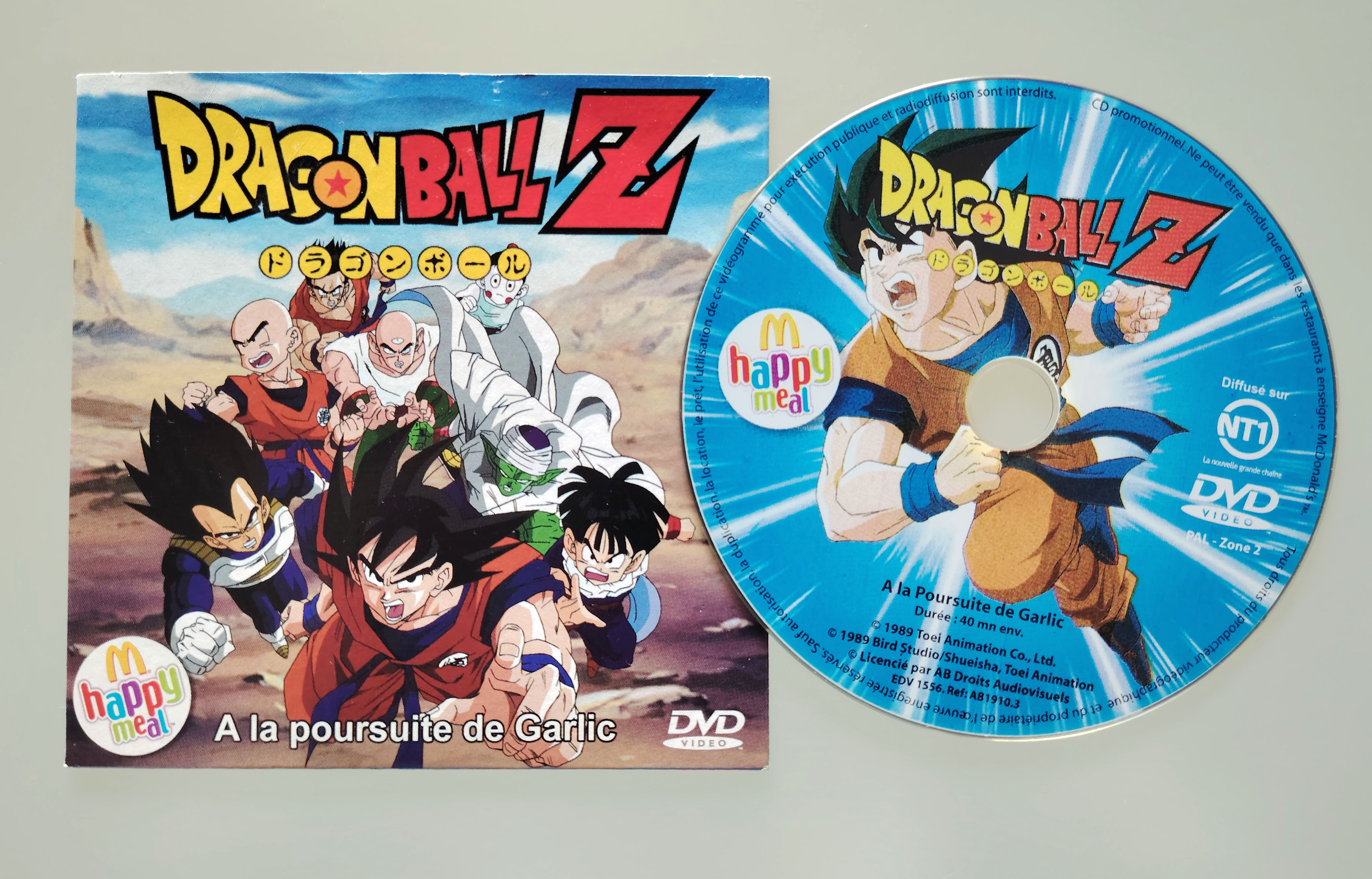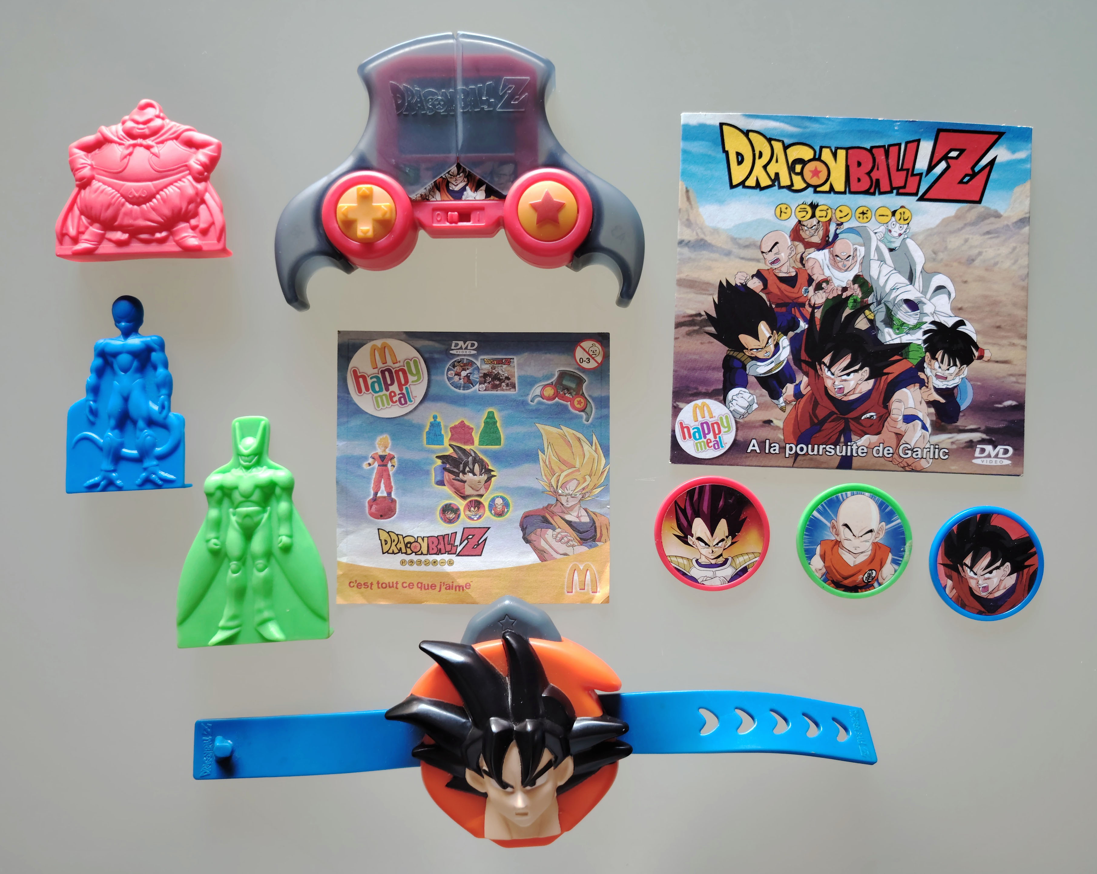 Ensemble de 3 jouets Happy Meal McDonald's incluant un DVD du premier film Dragon Ball Z (fonctionnel), un bracelet lanceur à l'effigie de Goku avec 3 jetons et 3 cibles, un jeu électronique (fonctionnel, piles à éventuellement changer) et un flyer, sorti en 2006. Ensemble Quick avec 2 bracelets, un Goku et un Dragon Ball Z, un flyer et une boîte de menu (seule la face est présente), sorti en 2010.
