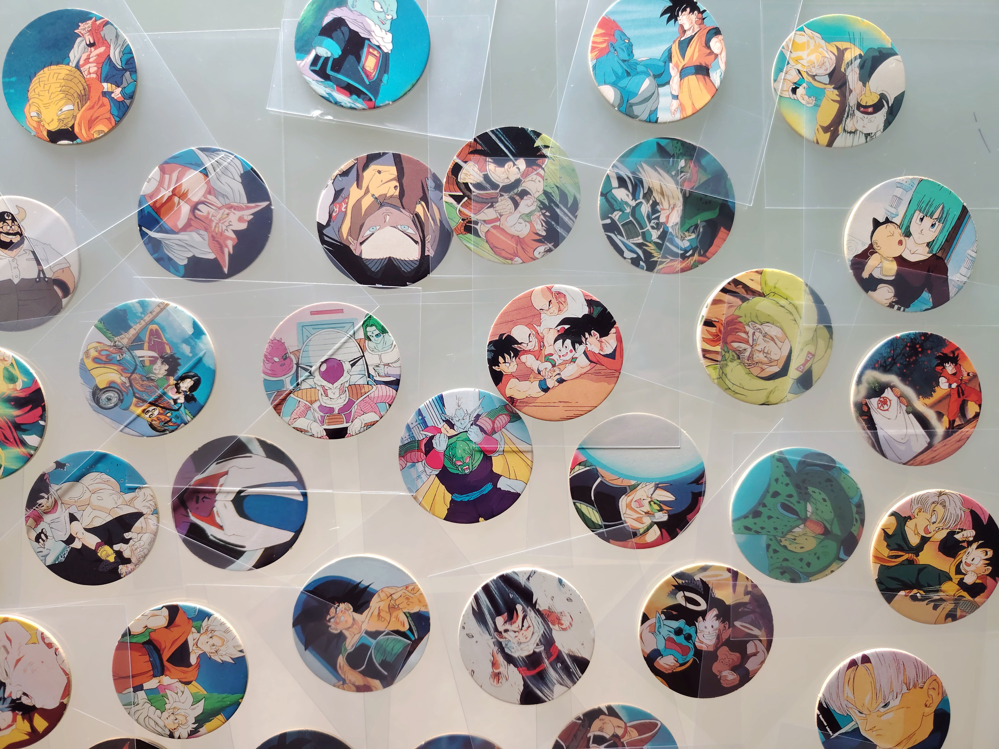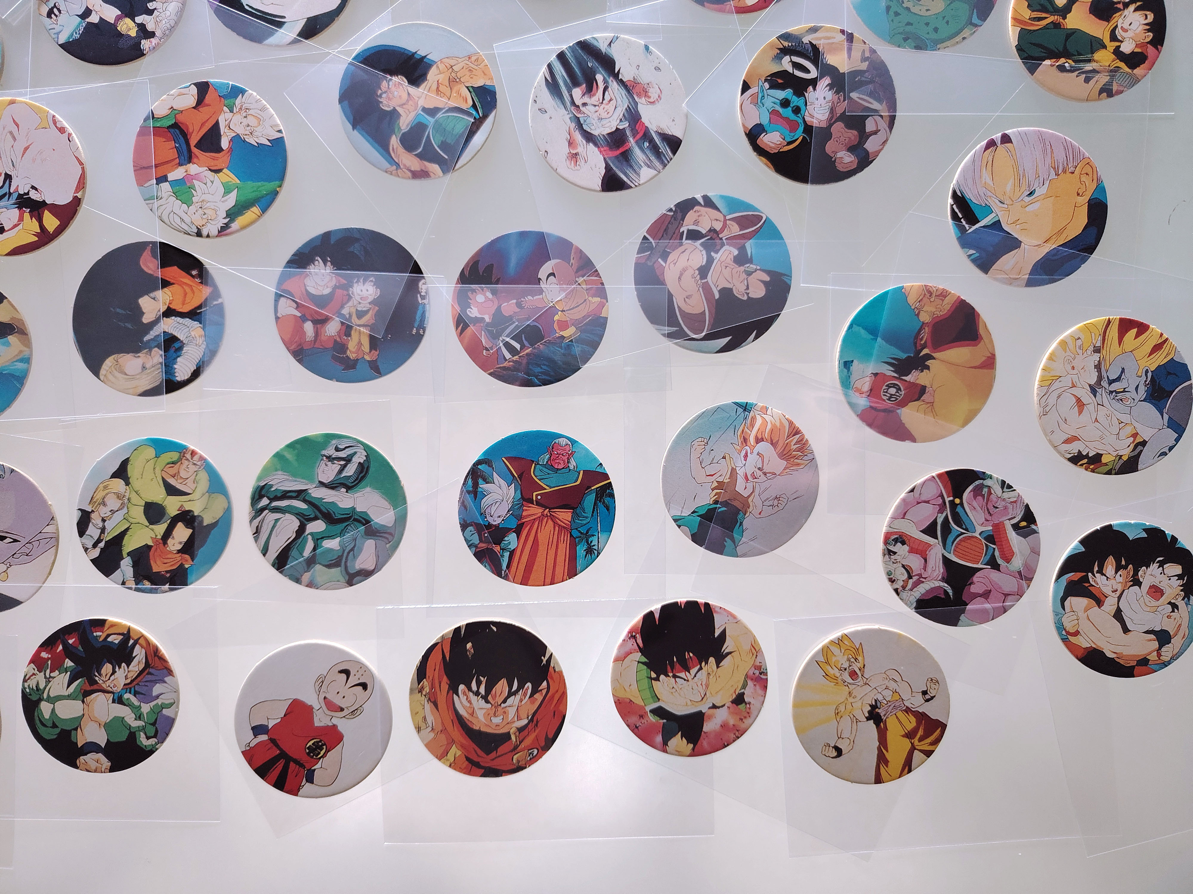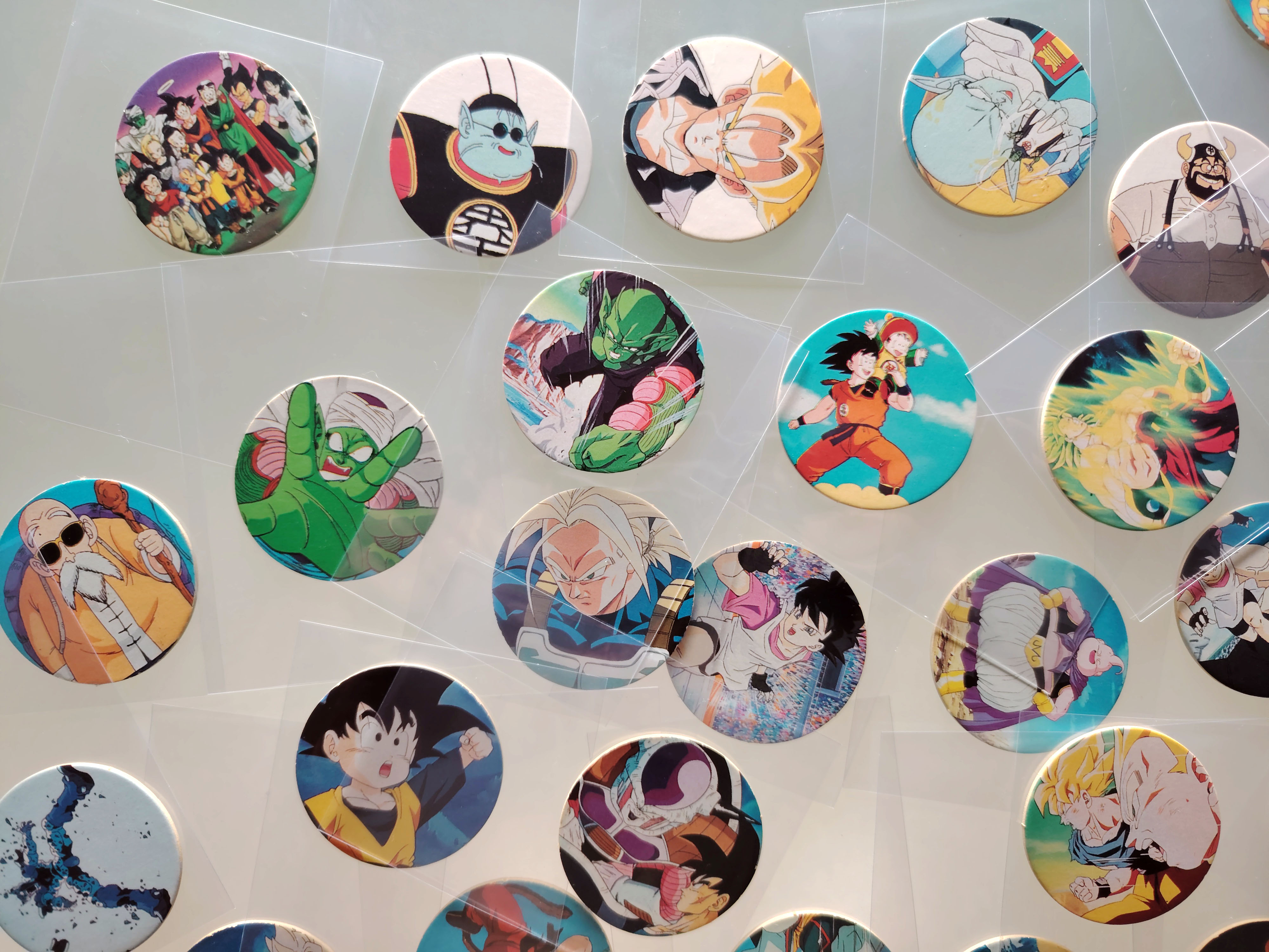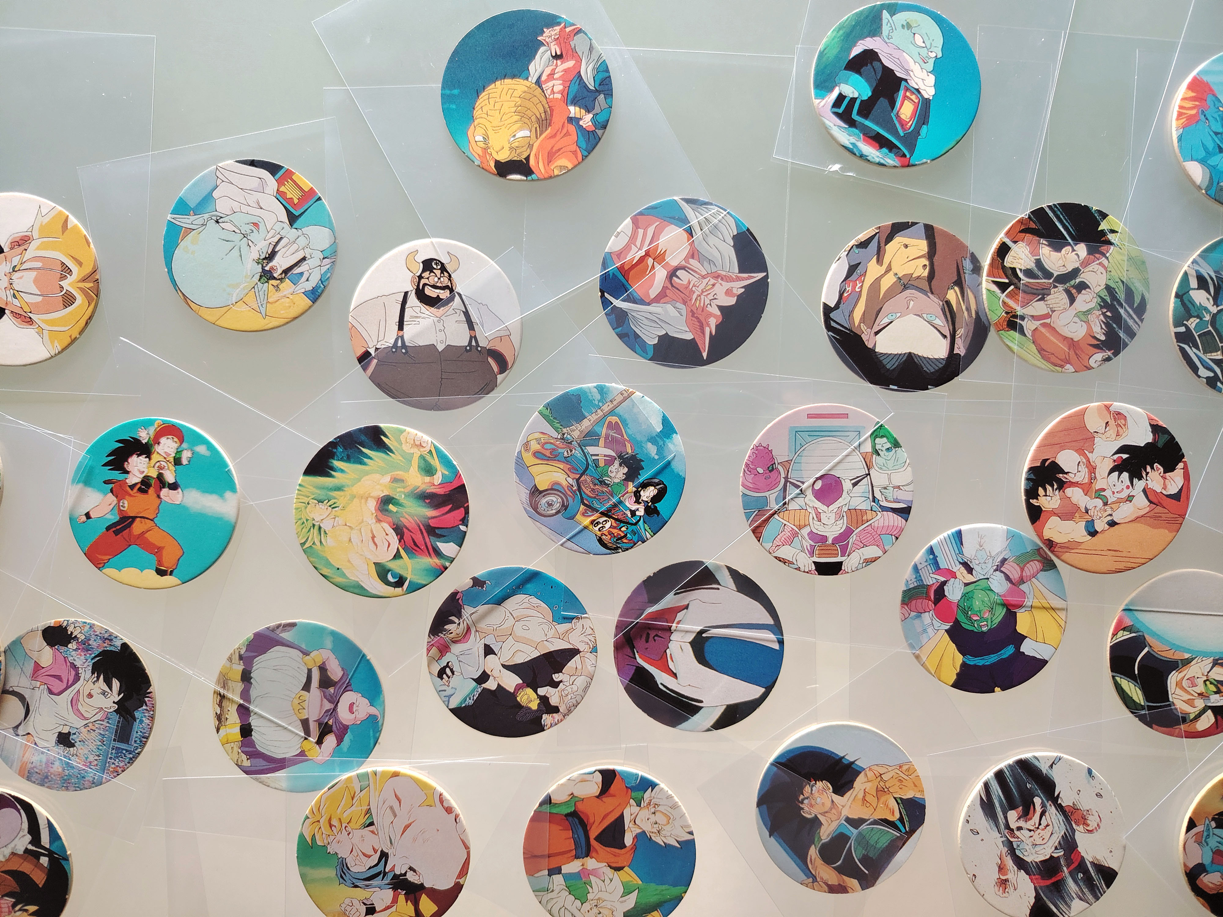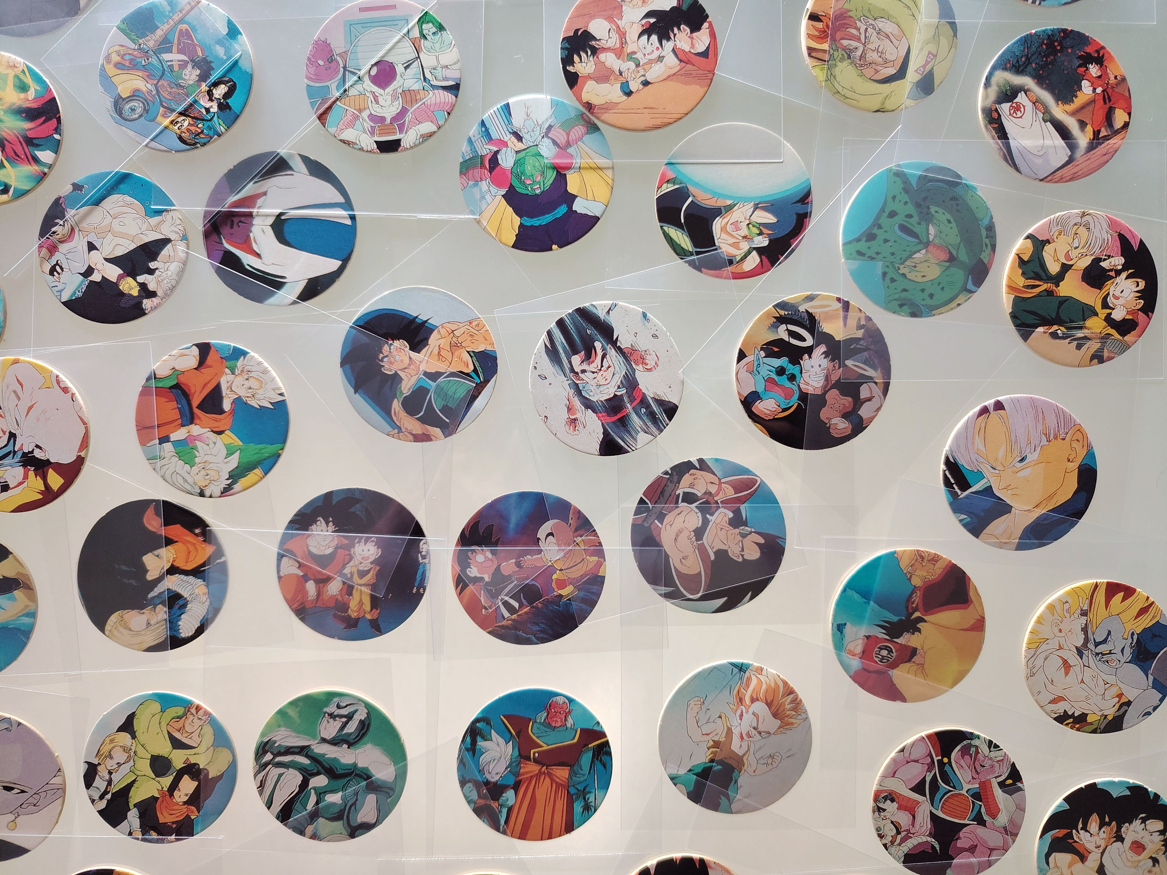 Lot de 91 pogs Dragon Ball Z dont 77 normaux (complets), 13 Kinis et 1 kini en or. États variables de bons a moyens, protégés sous sleeve. Sortis en 1995.