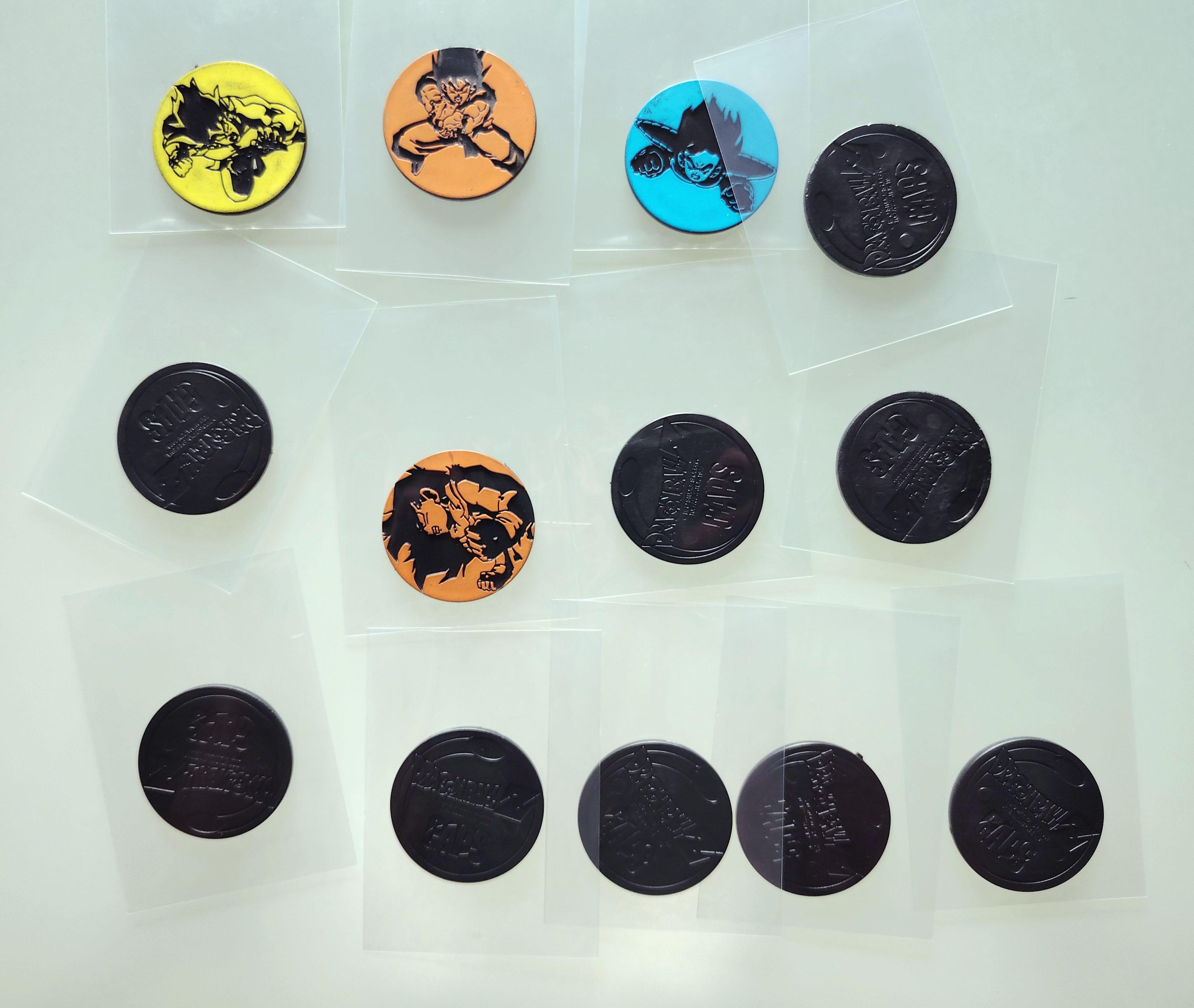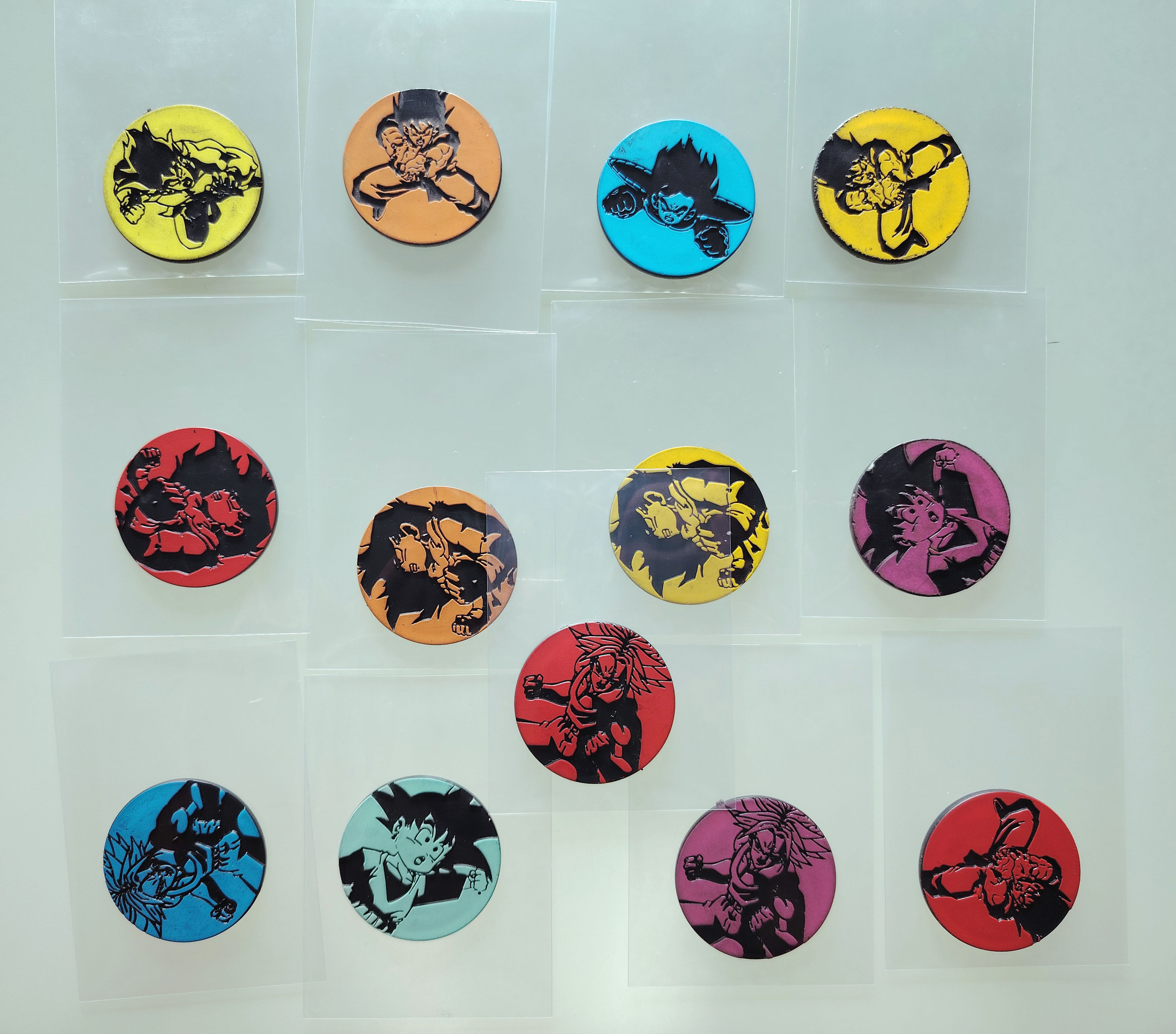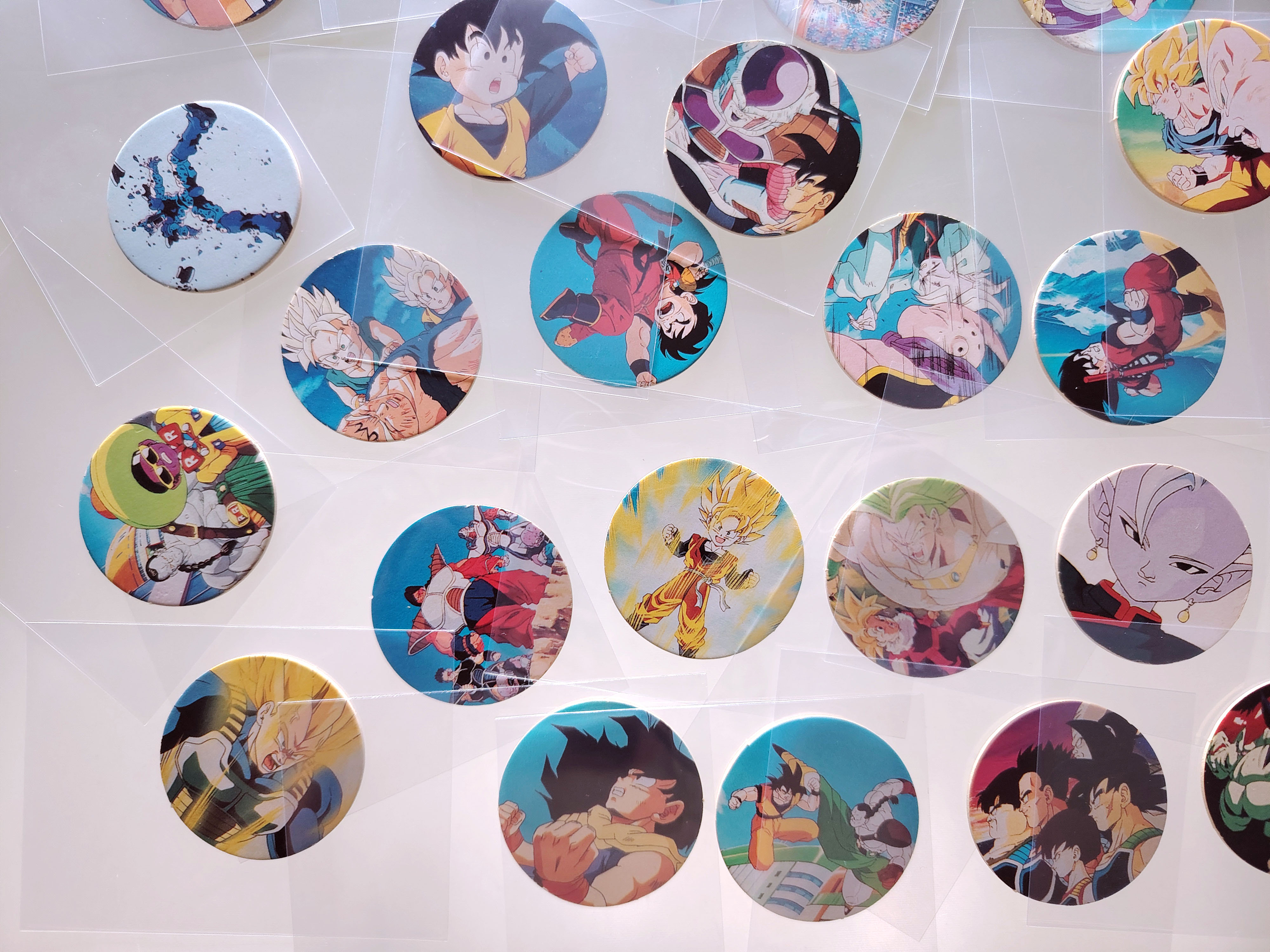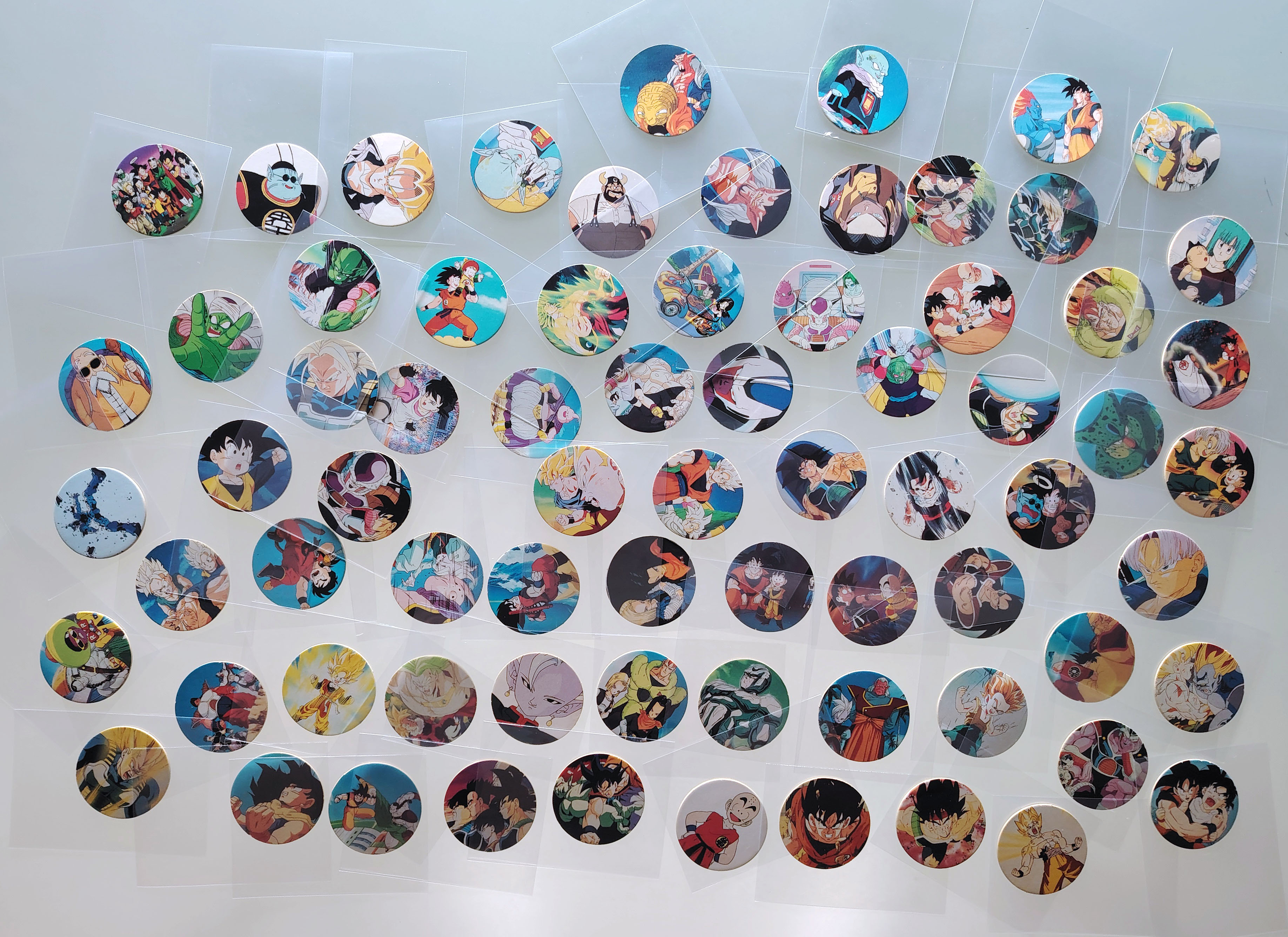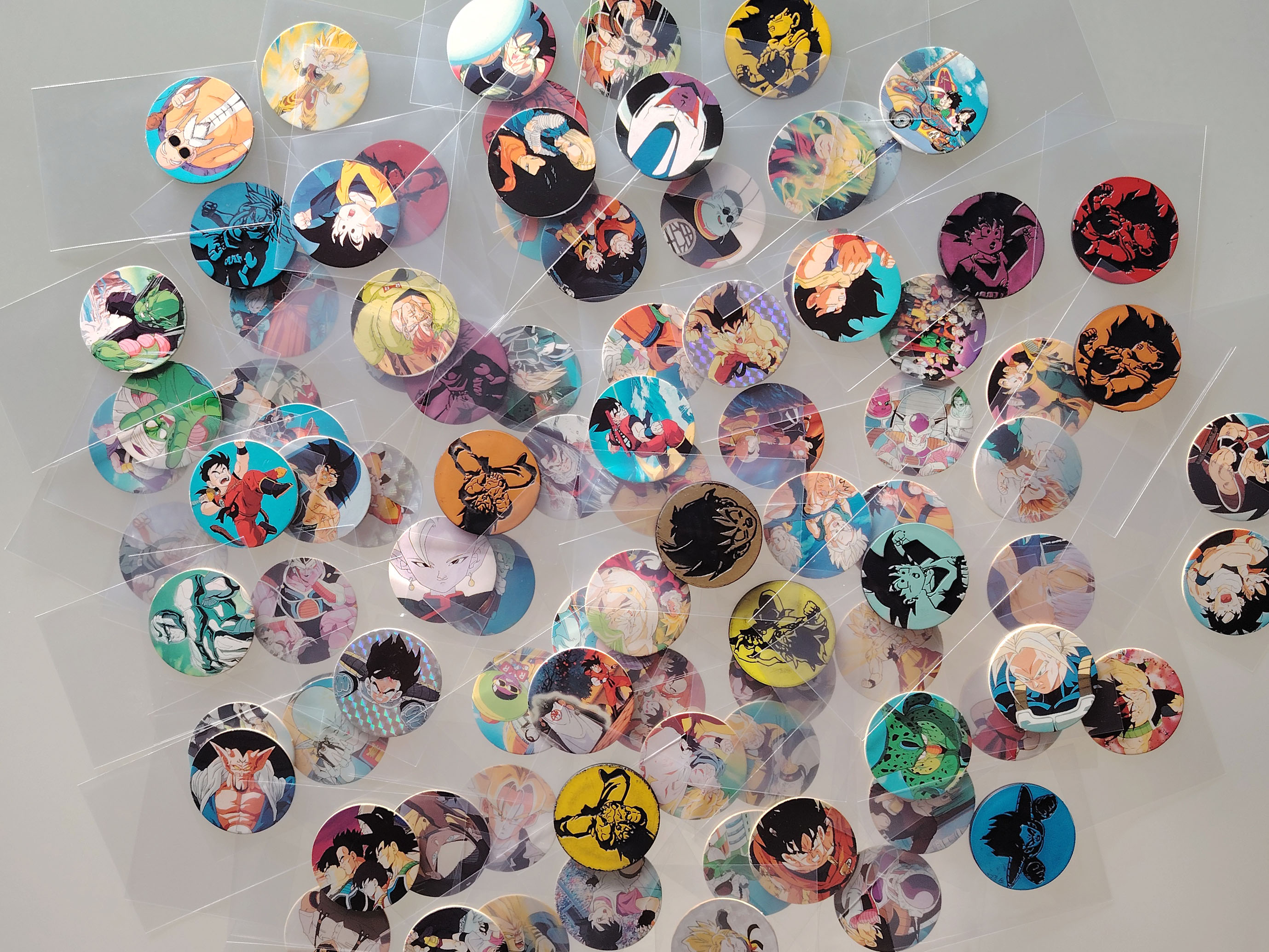 Lot de 91 pogs Dragon Ball Z dont 77 normaux (complets), 13 Kinis et 1 kini en or. États variables de bons a moyens, protégés sous sleeve. Sortis en 1995.