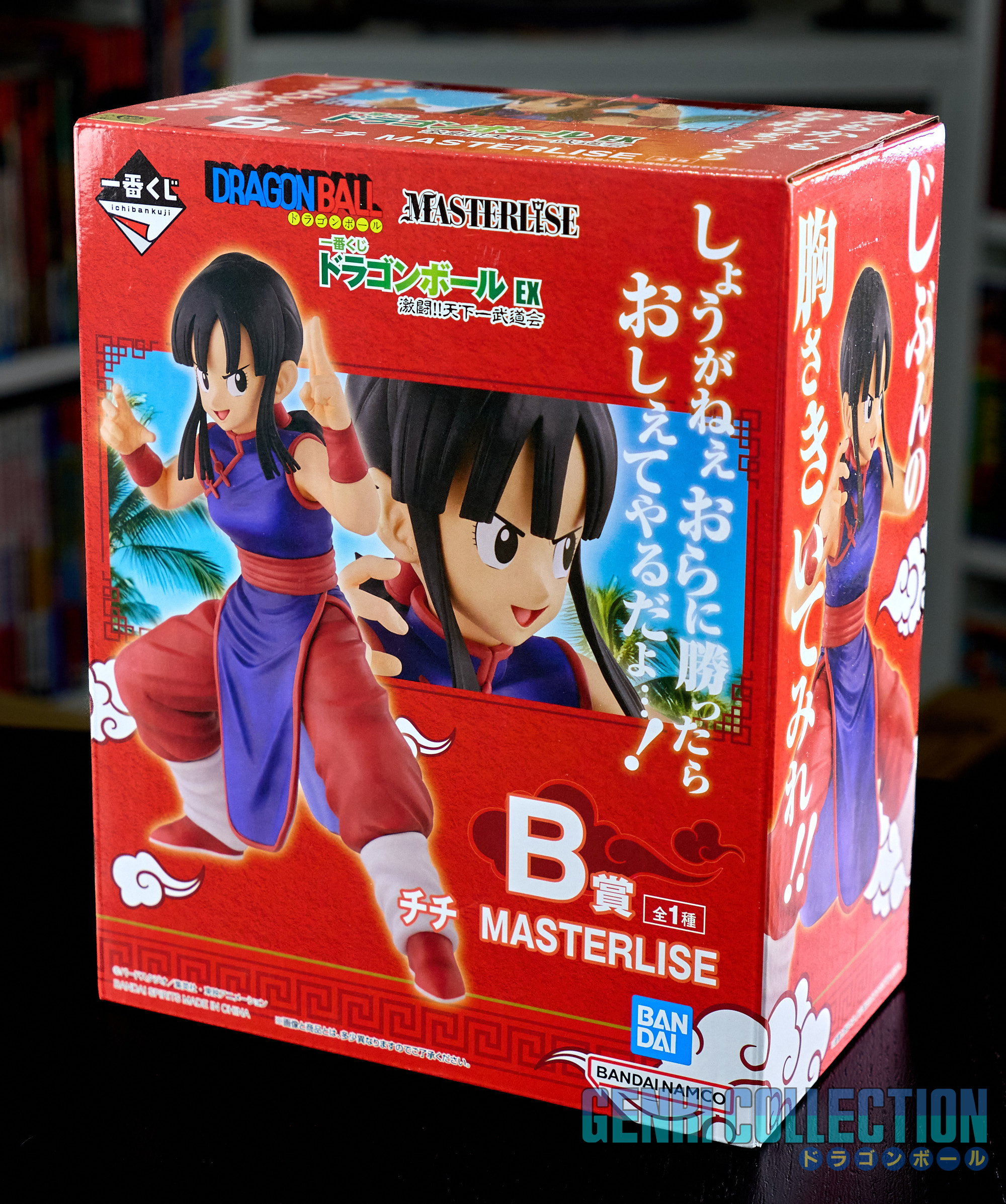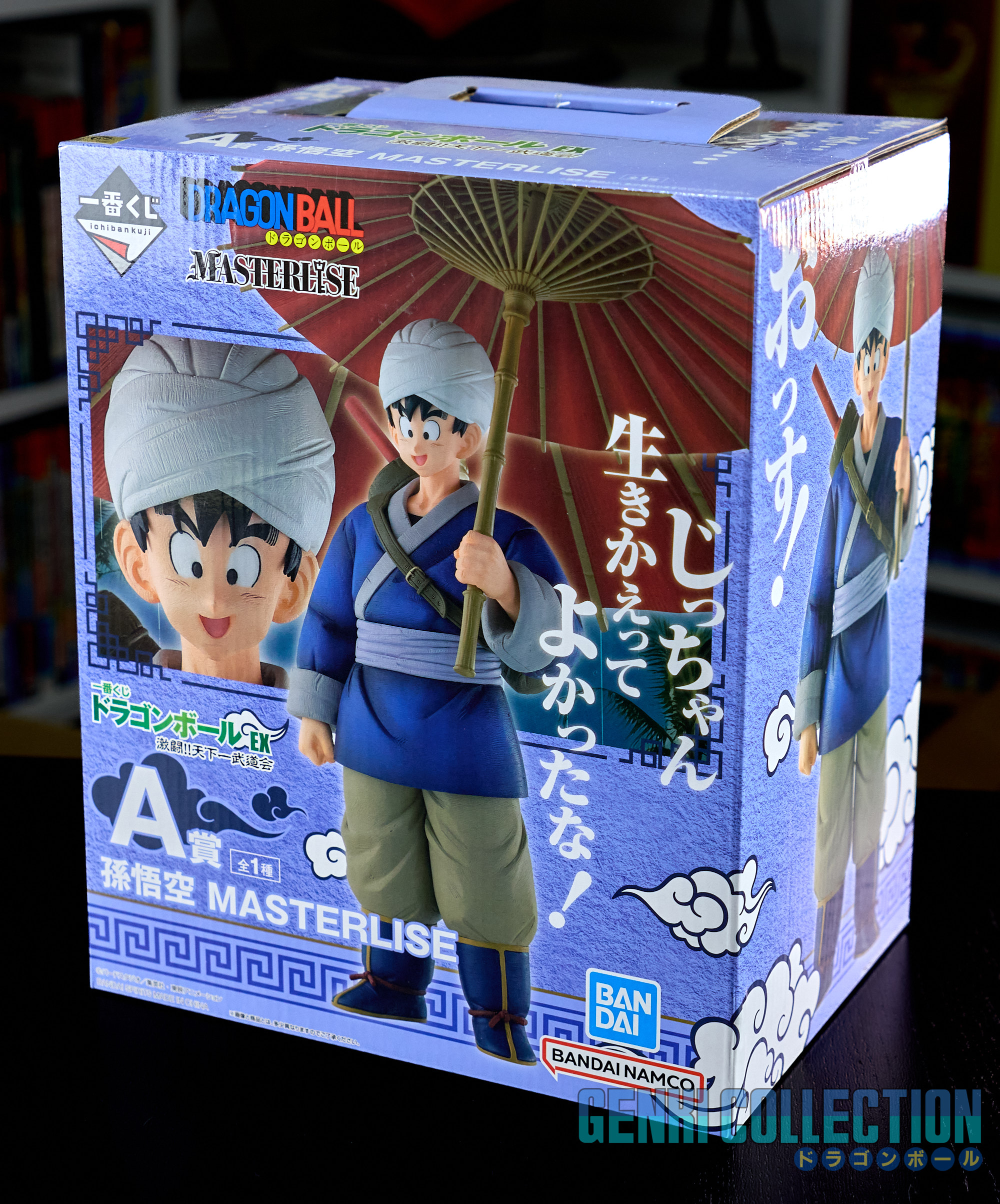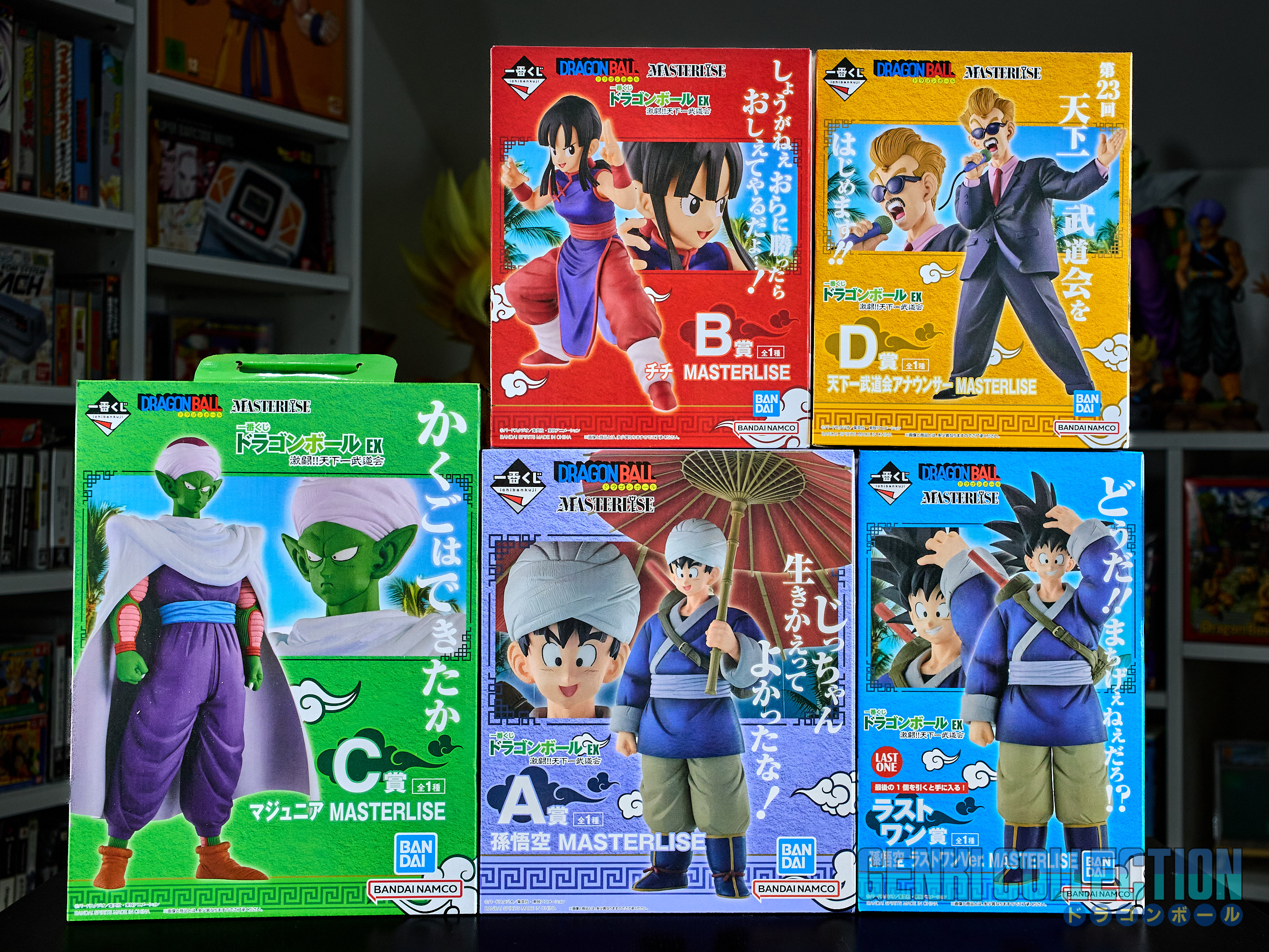Lot de 5 figurines en boîtes Ichiban Kuji de la série Dragon Ball EX "Tenkaichi Budokai" sortie en 2024. Le lot inclus : Gokû portant son ombrelle (Lot A), Chichi (Lot B), Ma Junior - Piccolo Daimaô (Lot C), Le présentateur (Lot D) et Gokû sans turban (Last One).