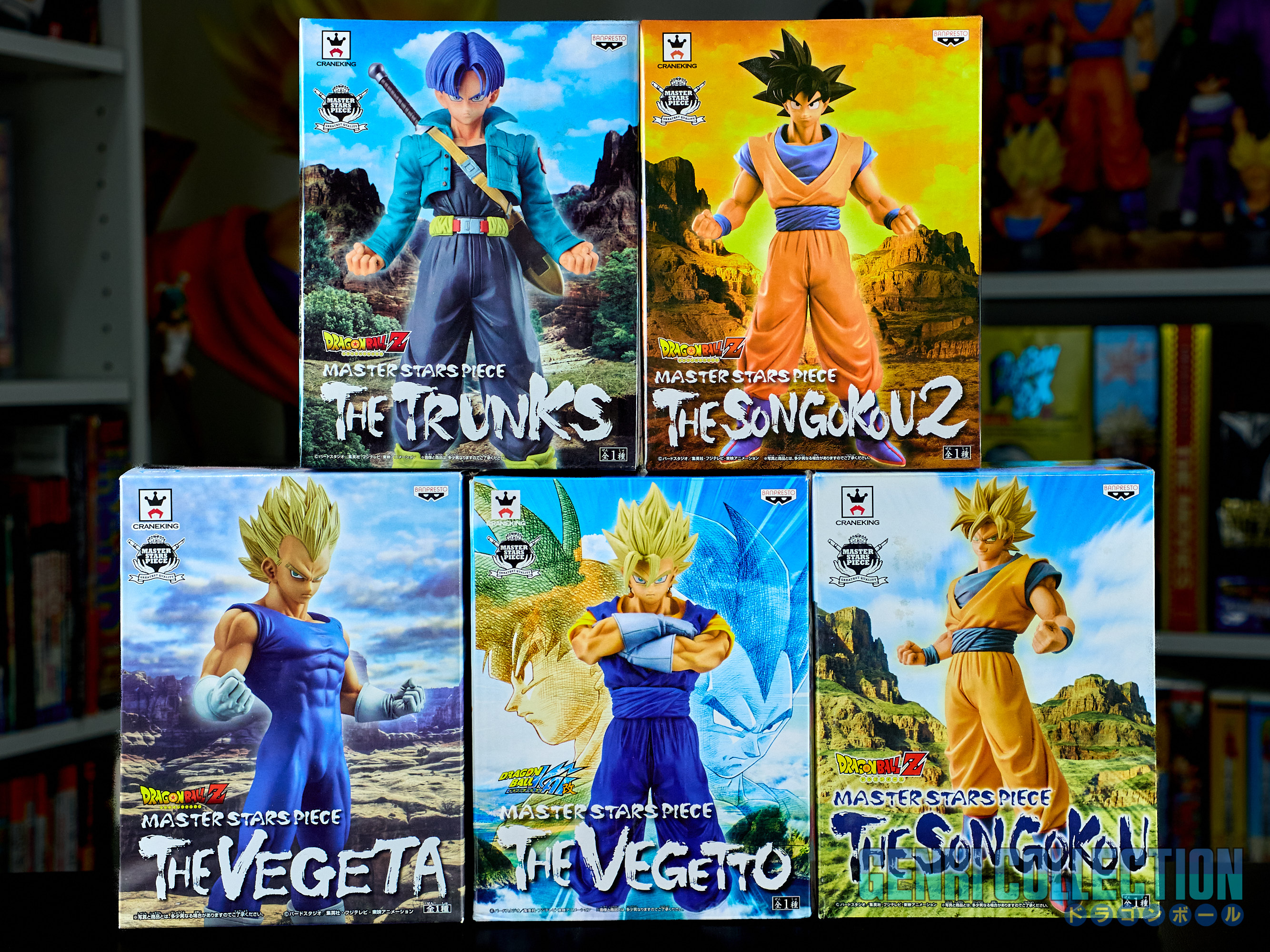 Lot de 5 figurines Dragon Ball Z et Kai Master Stars Piece en boîte. Le lot inclus : The Son Gokou (2013), The Vegeta, (2014), The Trunks (2014), The Son Gokou 2 (2014) et The Vegetto (2015) dont il manque le support, patafix nécessaire pour qu'il tienne, mais invisible.