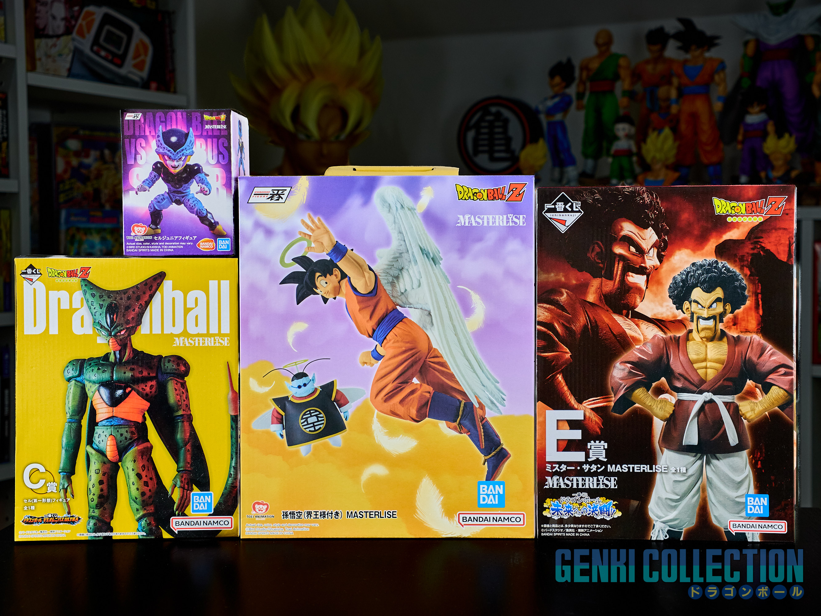 Lot de 4 figurines Ichiban Kuji et Ichibansho de loteries diverses. Le lot inclus : Cell Jr. en boîte Ichibansho (Dragon Ball "VS Omnibus Super" - 2021), Cell imparfait en boîte Ichiban Kuji (Lot C - Dragon Ball "VS Omnibus Ultra" - 2022), Mr. Satan en boîte Ichiban Kuji (Lot E - Duel to the Future!! - 2024), Gokû & Kaiô en boîte Ichibansho (Duel to the Future!! - 2024).