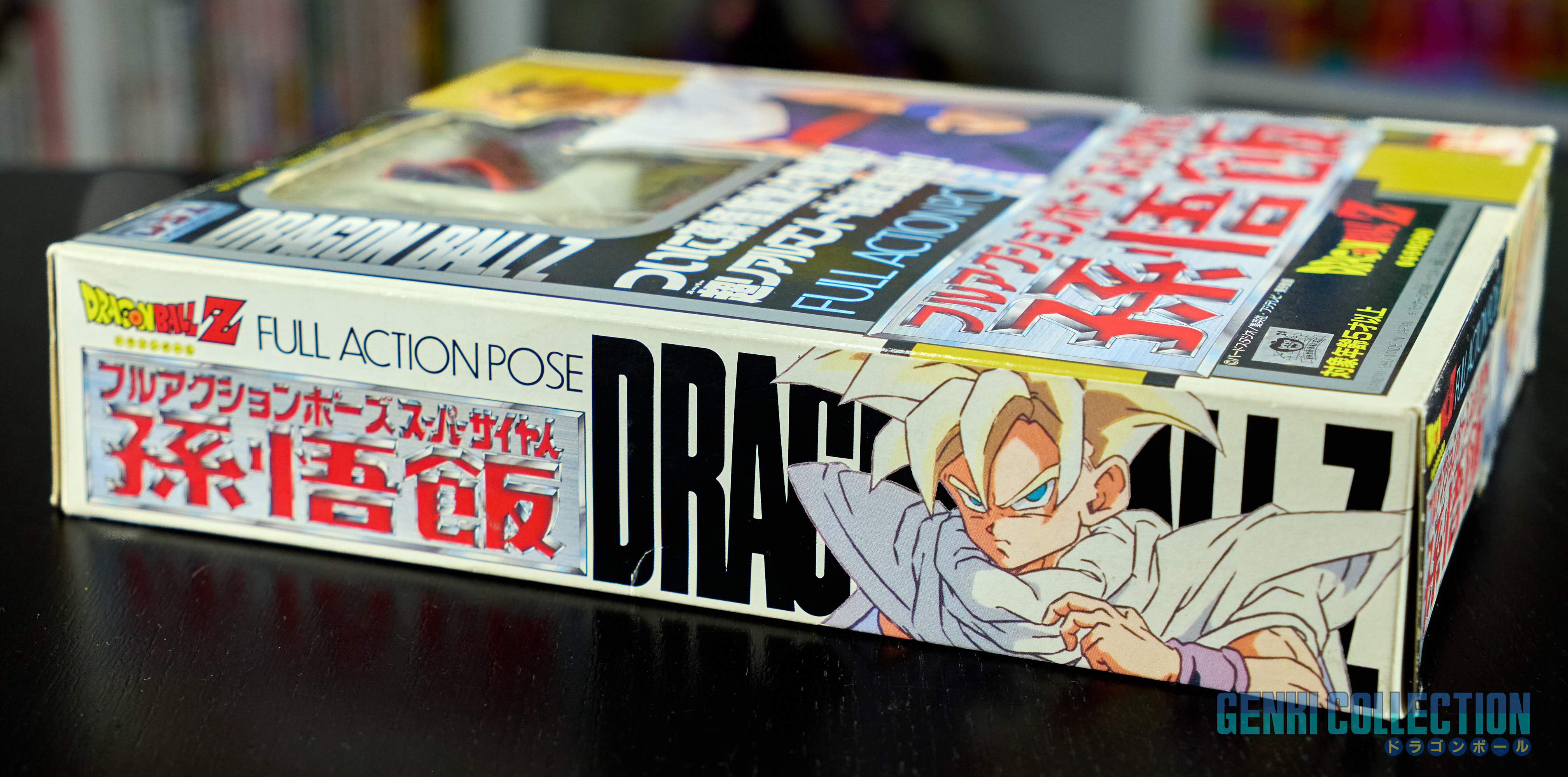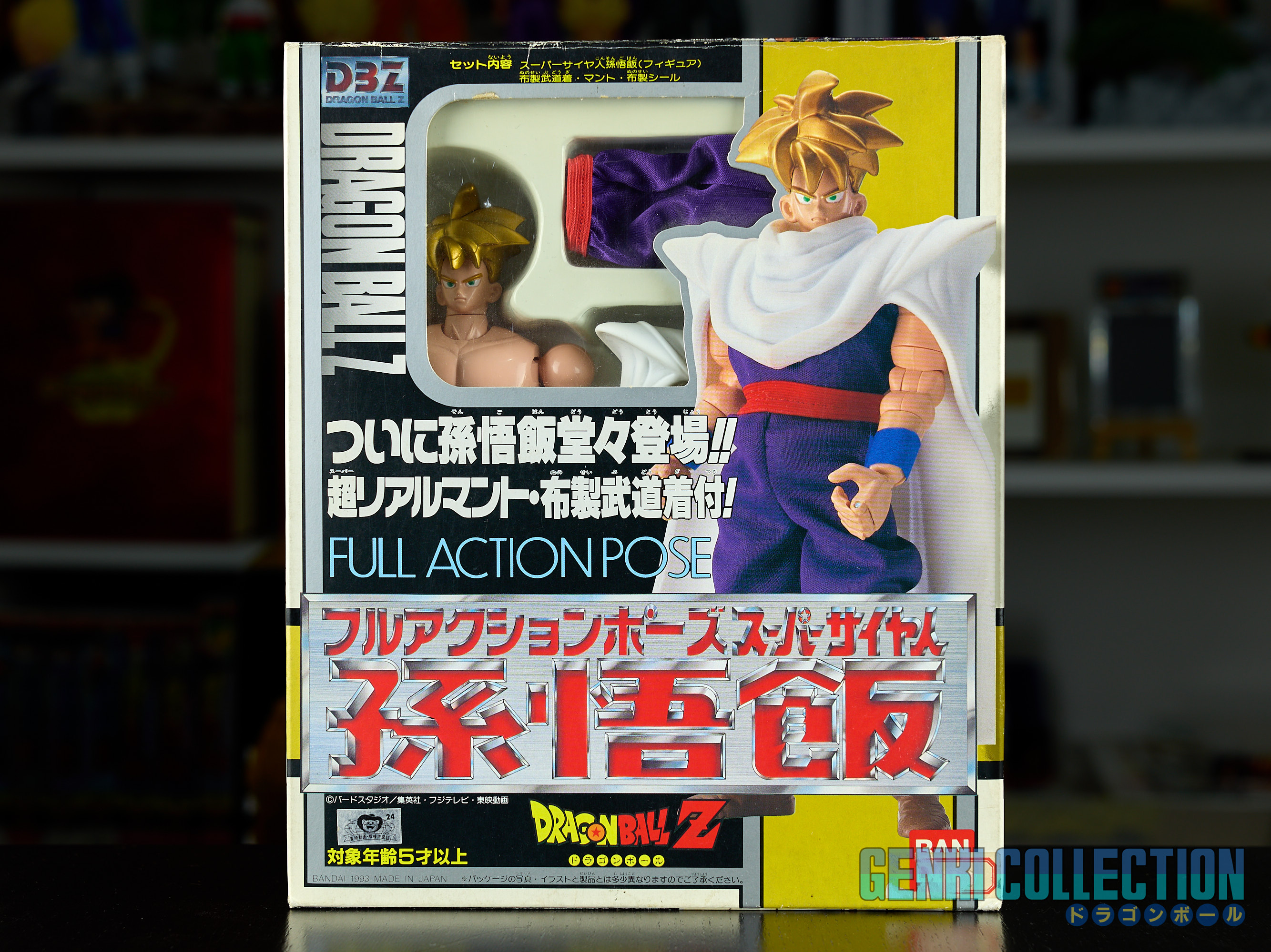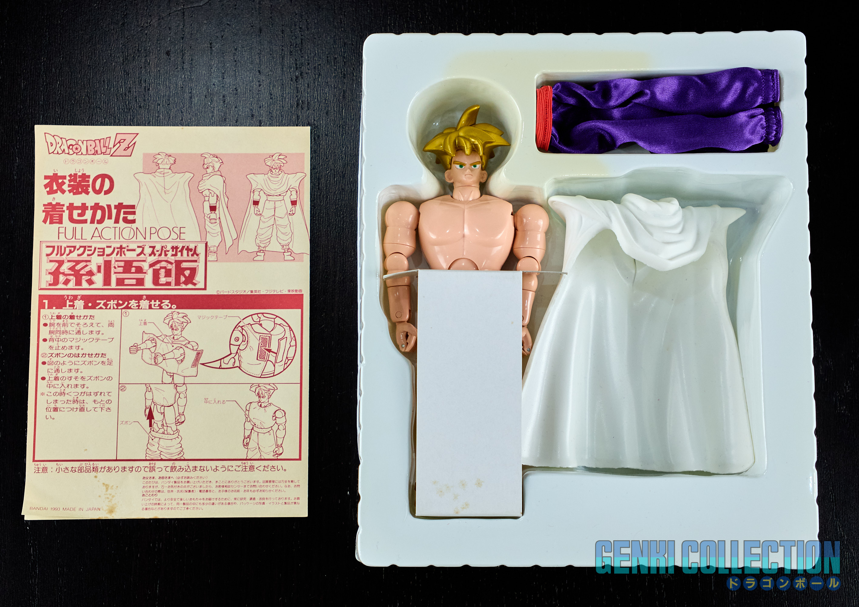 Figurine rare de Son Gohan, série Full Action Pose éditée par Bandai en 1993. Boîte un peu abîmée, mais intérieur en excellent état. Les protèges poignets n'ont jamais été collés et les vêtements en tissus sont éclatants et ne présentent aucune usure (comme neufs).La figurine est parfaitement rigide, ce qui est rare, généralement ces modèles sont facilement "désarticulés". Elle n'a donc jamais été manipulée. La notice est également présente.