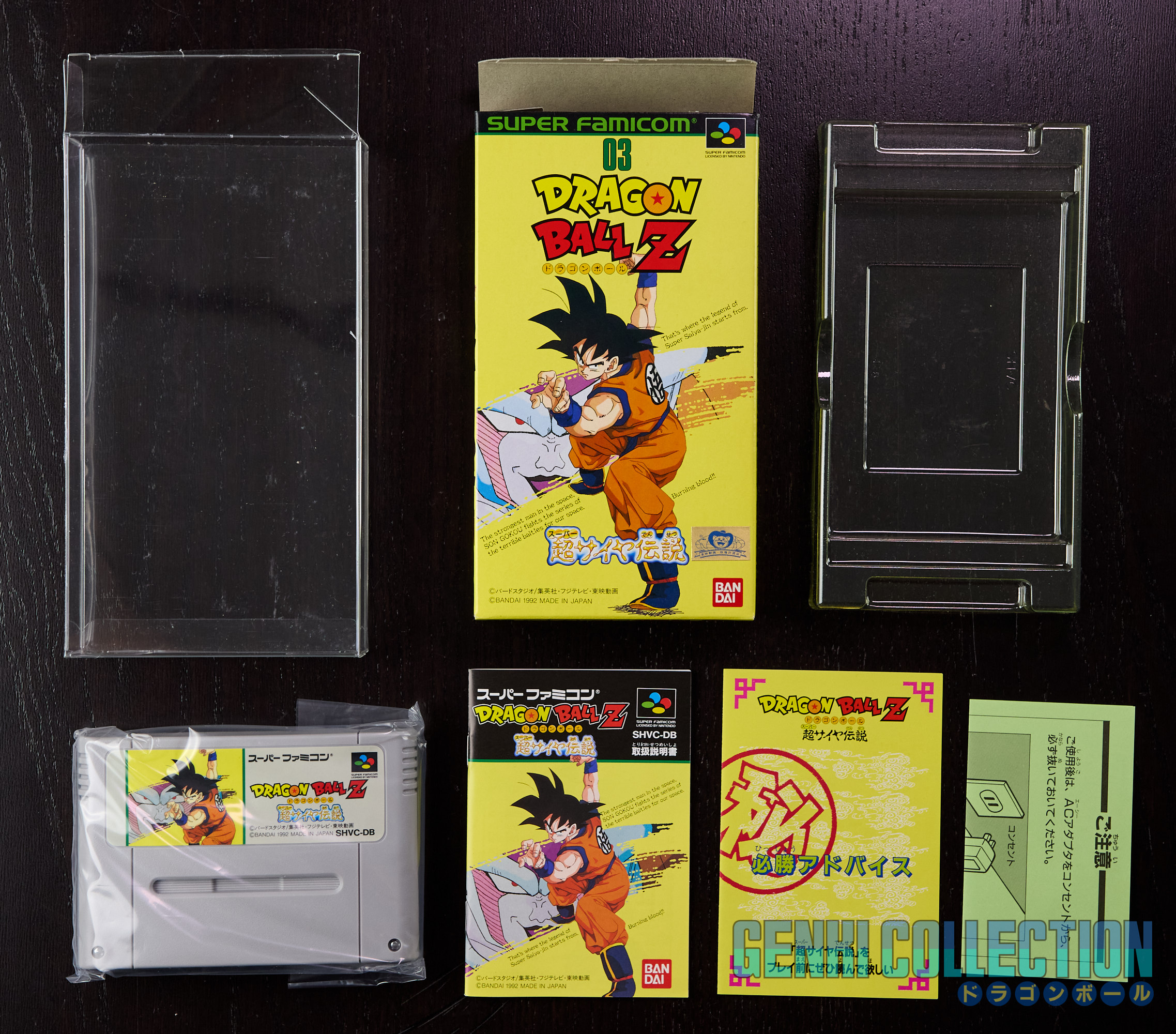 - Dragon Ball Z Super Saiya Densetsu (1992) avec cartouche, boîte, notice et carte dépliante du jeu.