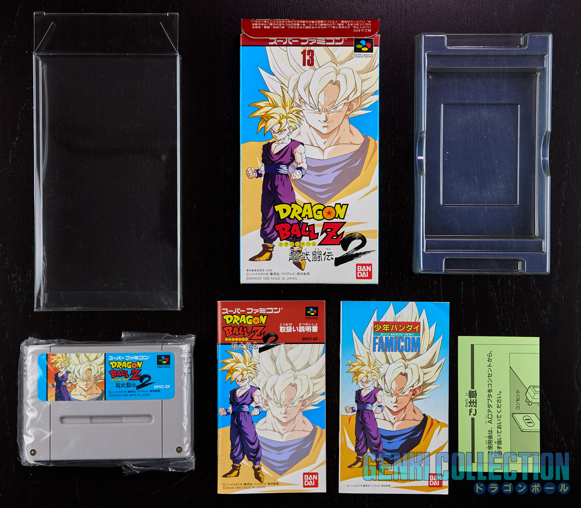 - Dragon Ball Z Super Butoden 2 (1993) with cartridge, box, manual, and Bandai games advertising flyer.