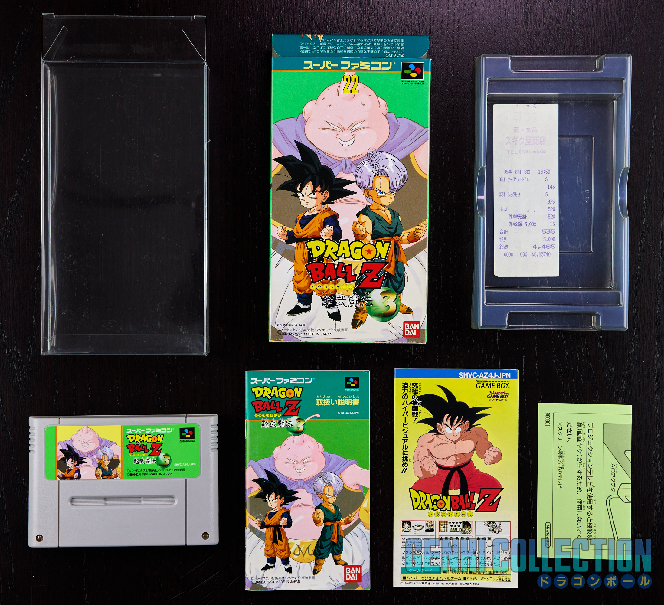 - Dragon Ball Z Super Butoden 3 (1994) with cartridge, box, manual, and Bandai games advertising flyer.