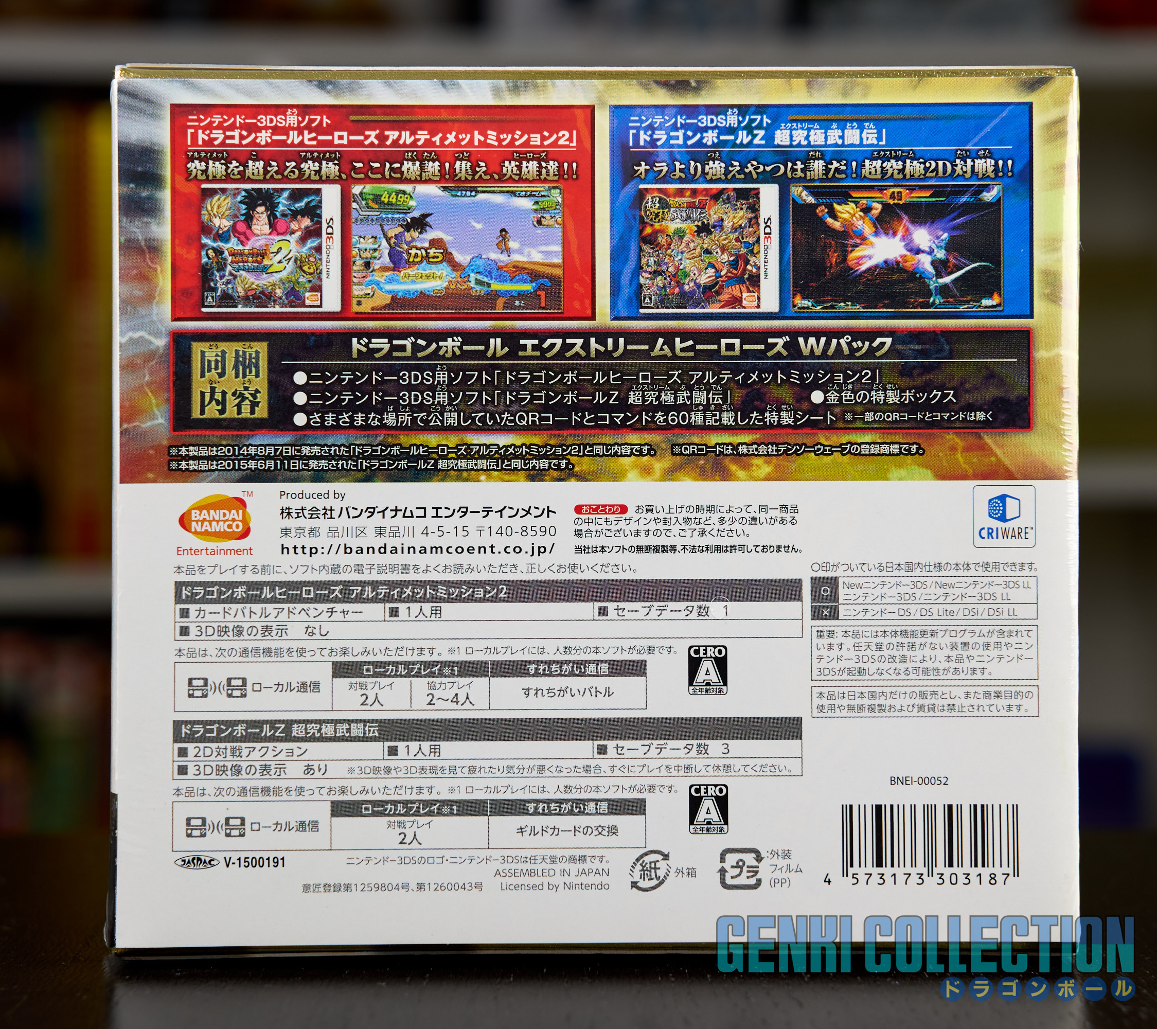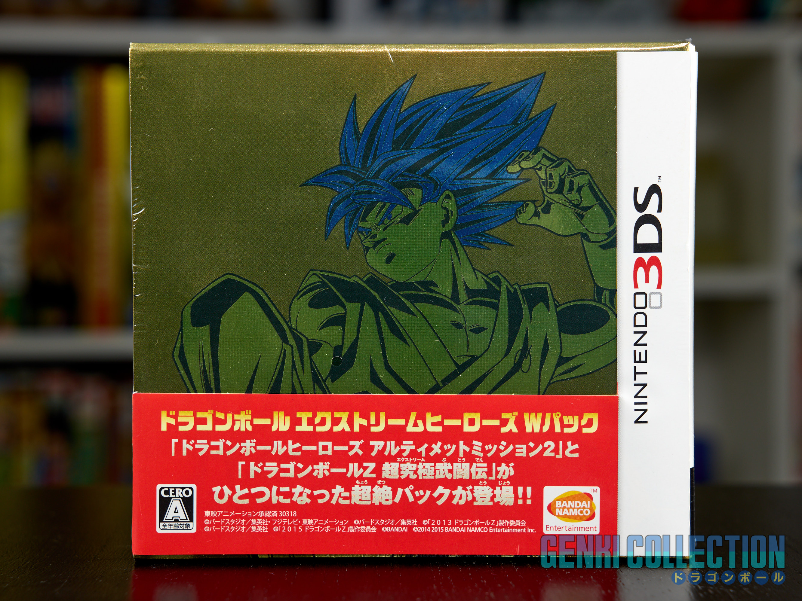 New and sealed Japanese collector's box set Dragon Ball Extreme Heroes W Pack containing 2 Dragon Ball video games for the Nintendo 3DS console: Dragon Ball Z Extreme Butoden and Dragon Ball Heroes Ultimate Mission 2.