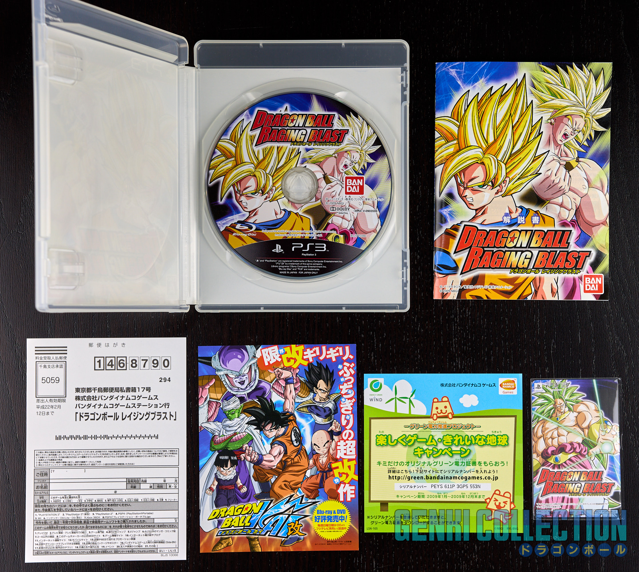- Dragon Ball Raging Blast (2009) with box, manual, CD, advertising flyer, promotional card (unscratched), and registration card.